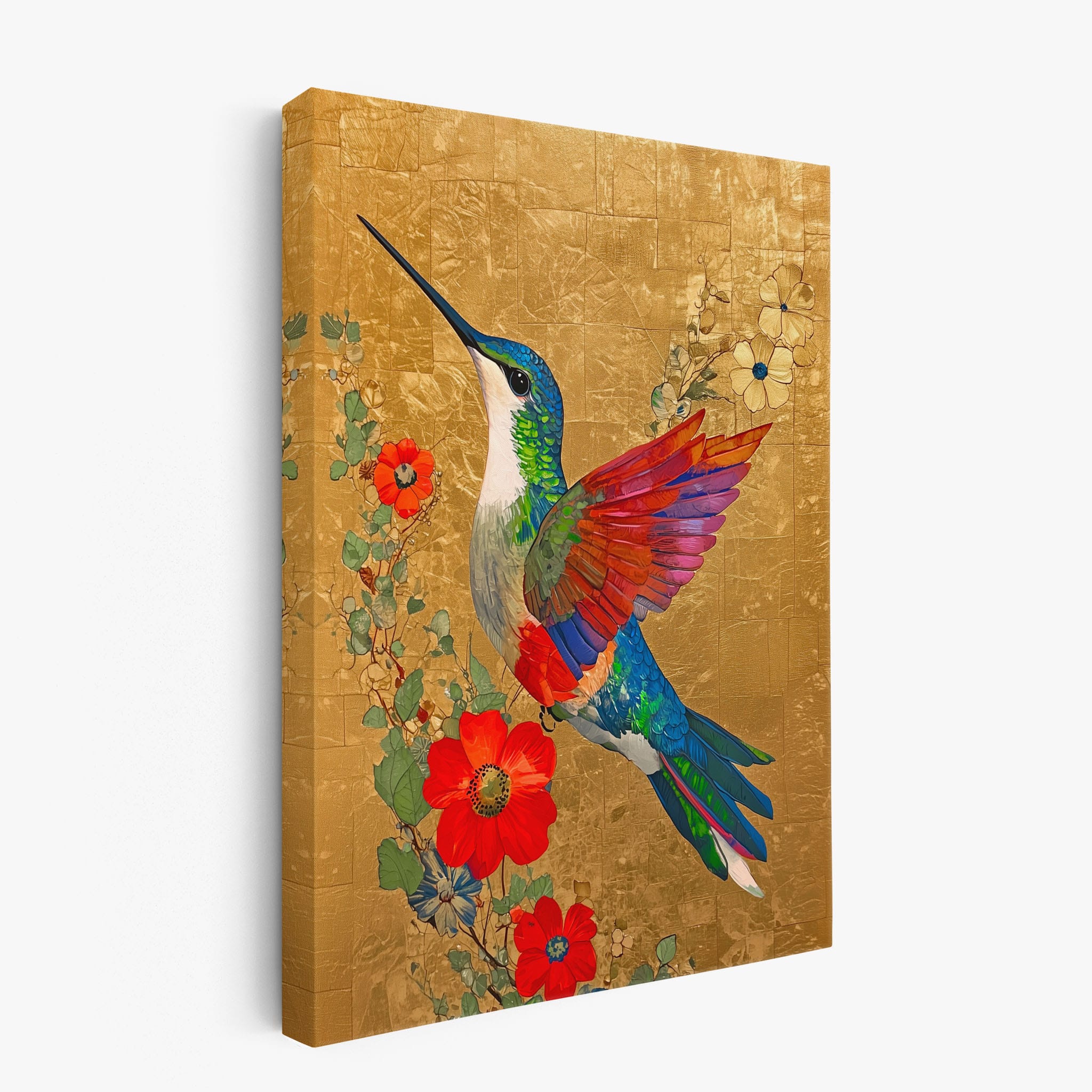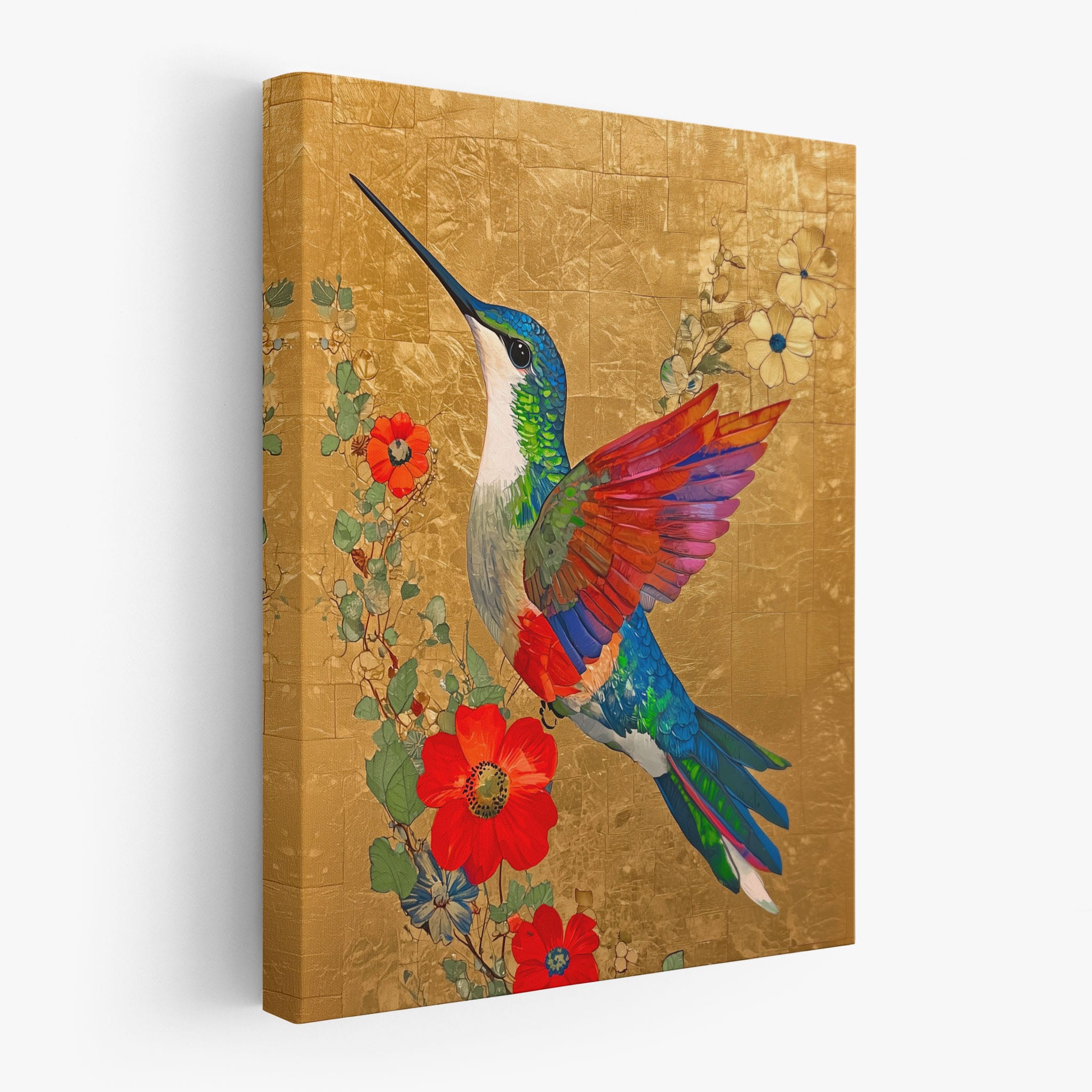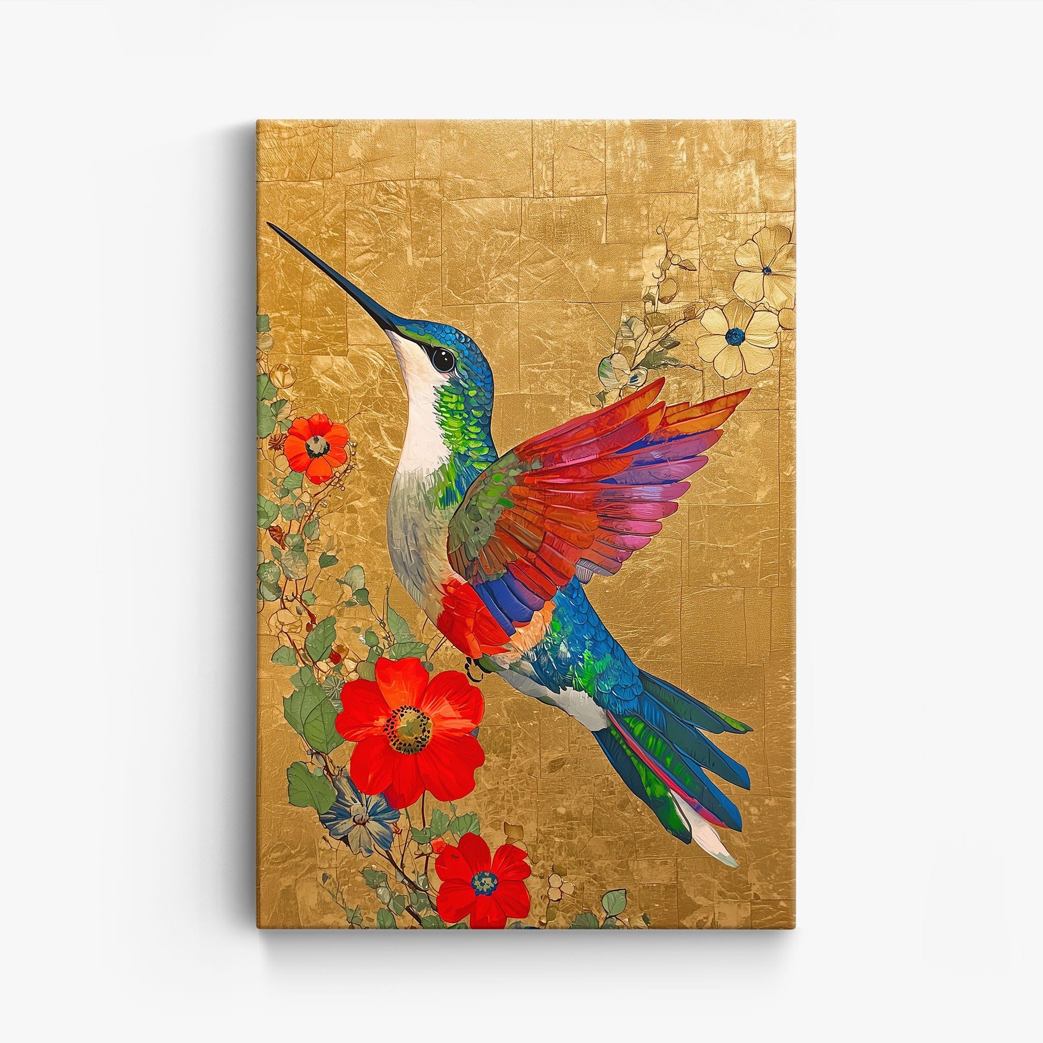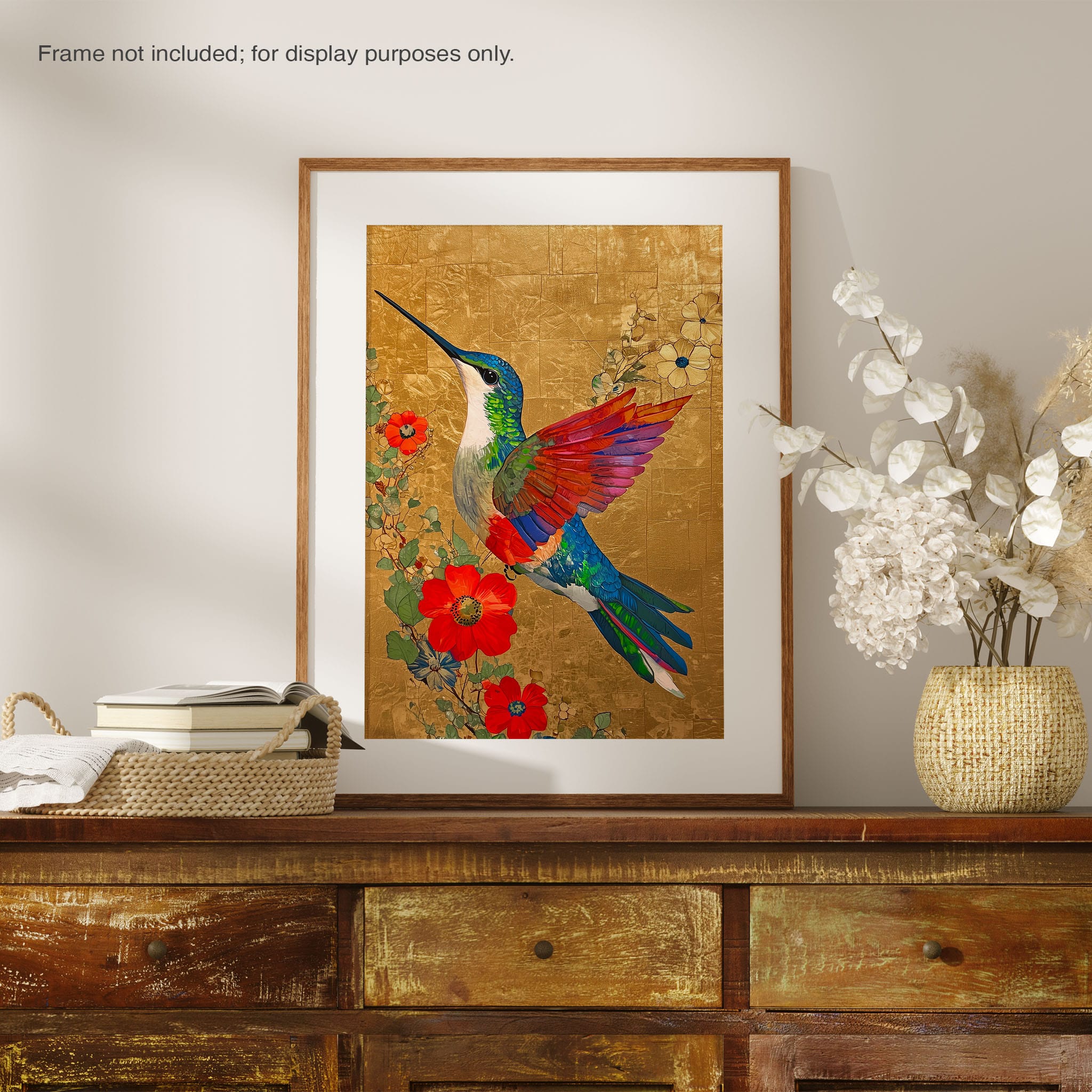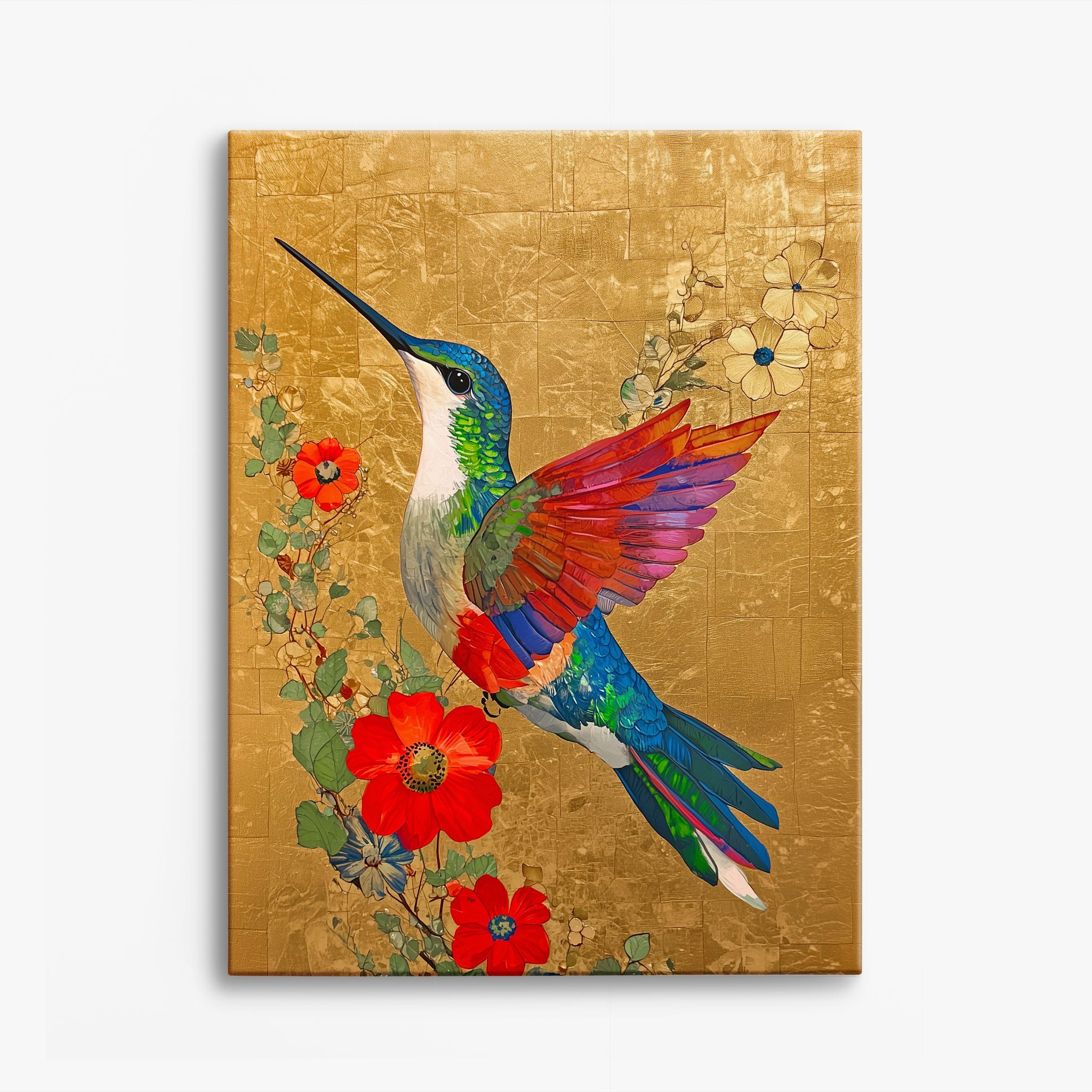 This stunning digital painting captures the essence of a vibrant hummingbird mid-flight, surrounded by a lush tapestry of red and blue flowers against a textured gold background. The detailed brushwork emphasizes the shimmer of the bird's iridescent feathers, making it almost lifelike. The interplay of natural elements and vivid colors presents a striking visual appeal that resonates with nature lovers and art aficionados alike. Adding this piece to your space promises a touch of nature’s dynamism and color. This digital painting is a must-have for anyone looking to add a splash of color and wildlife charm to their home or office.