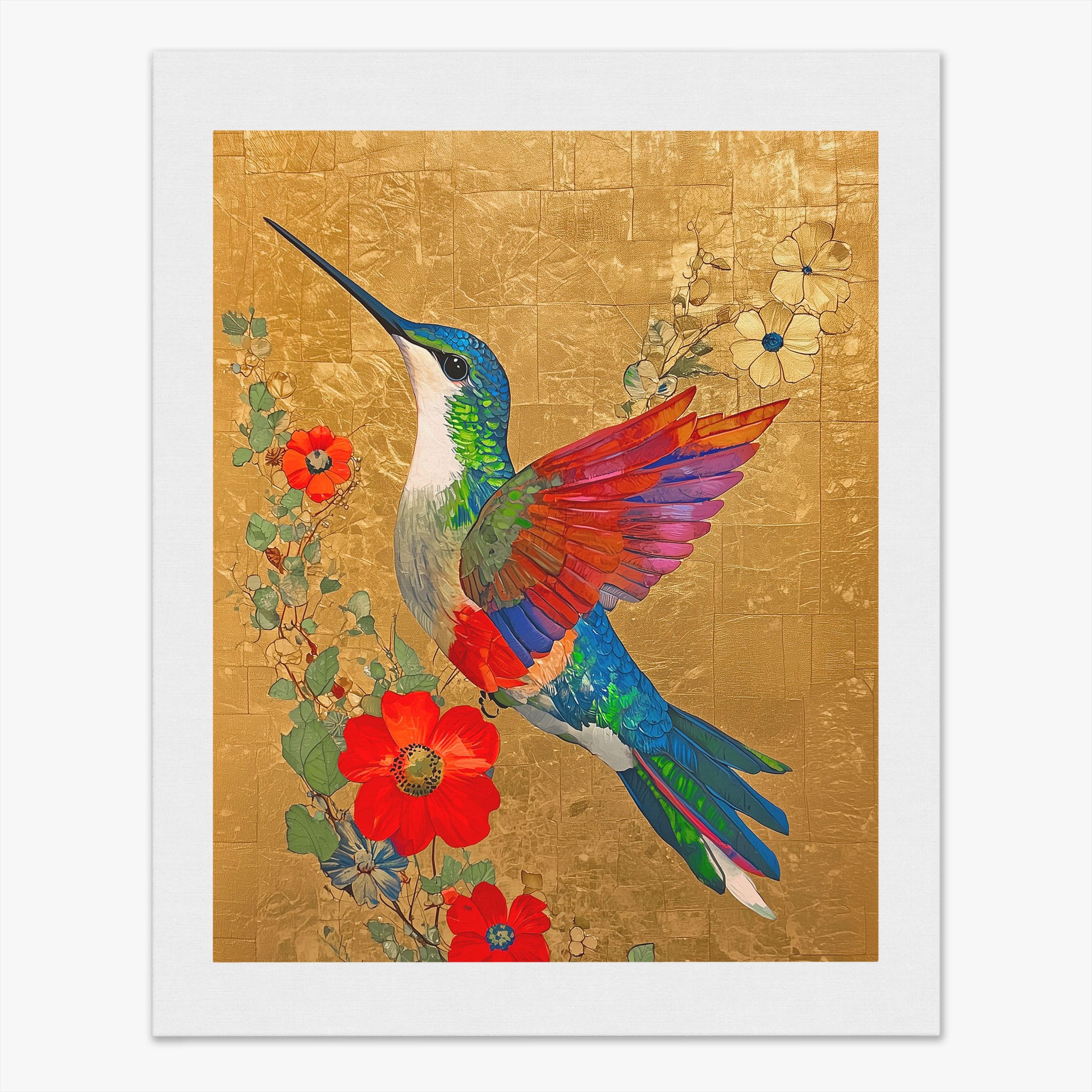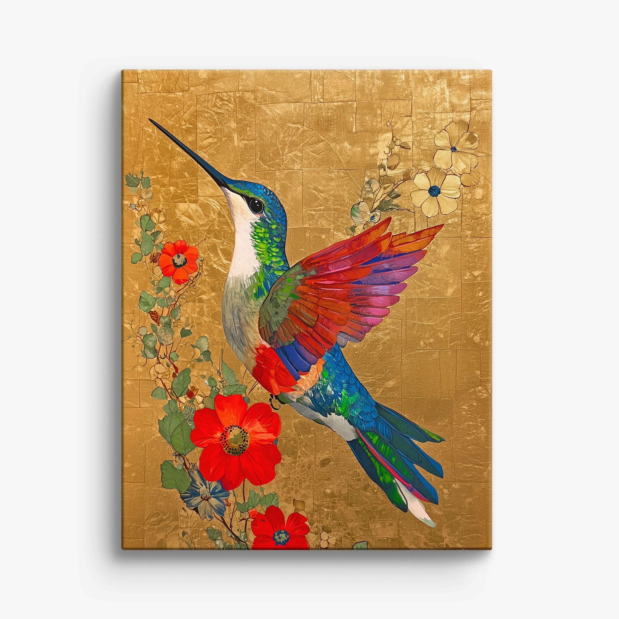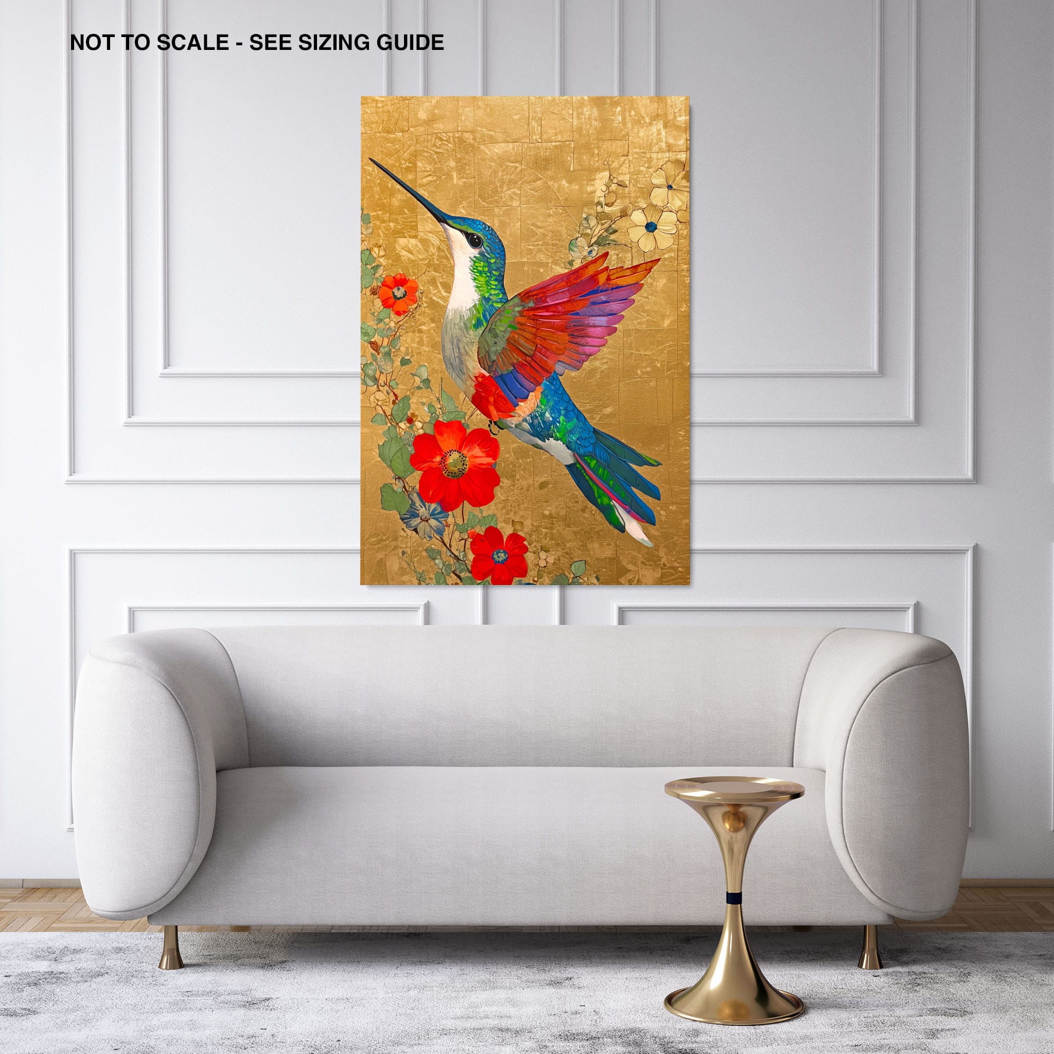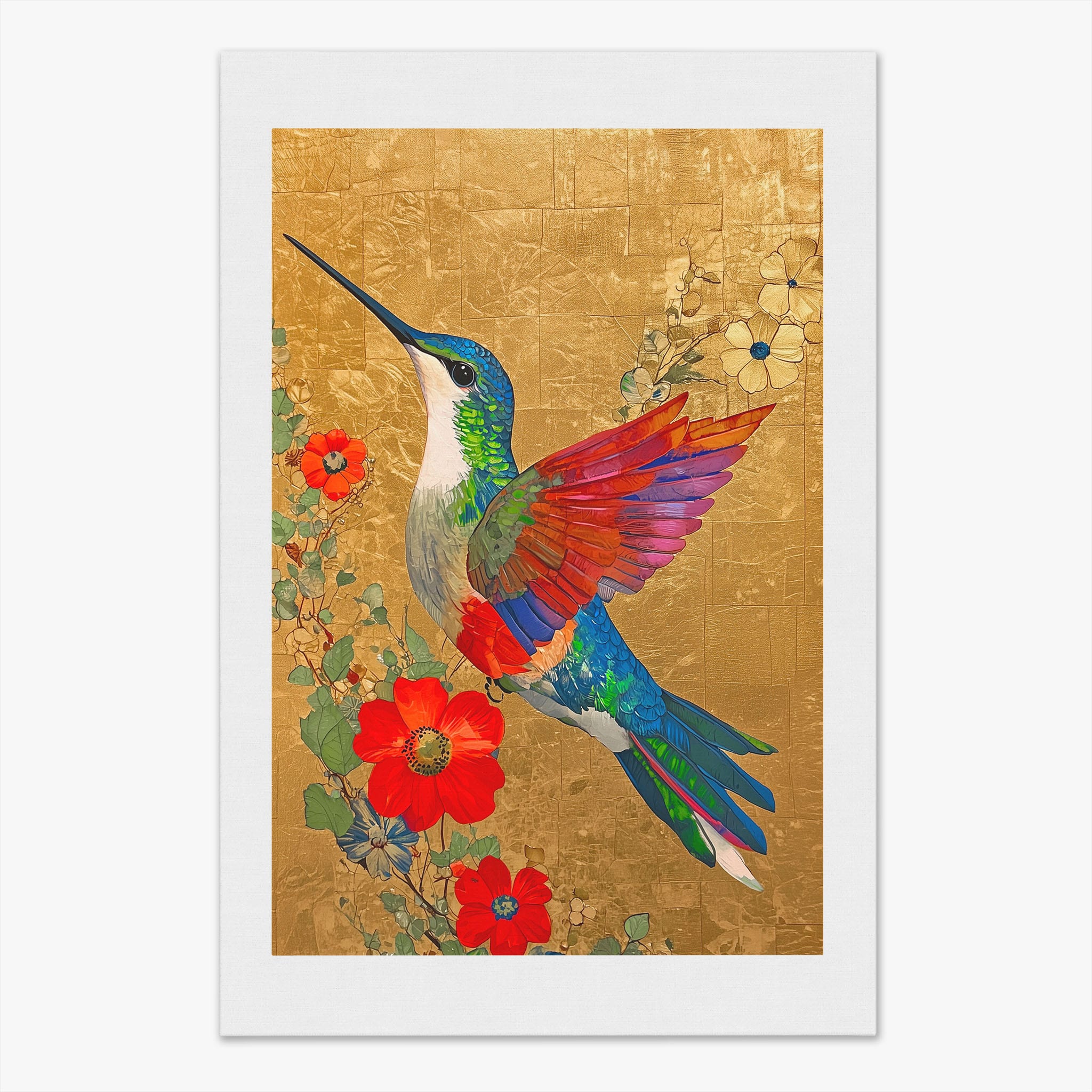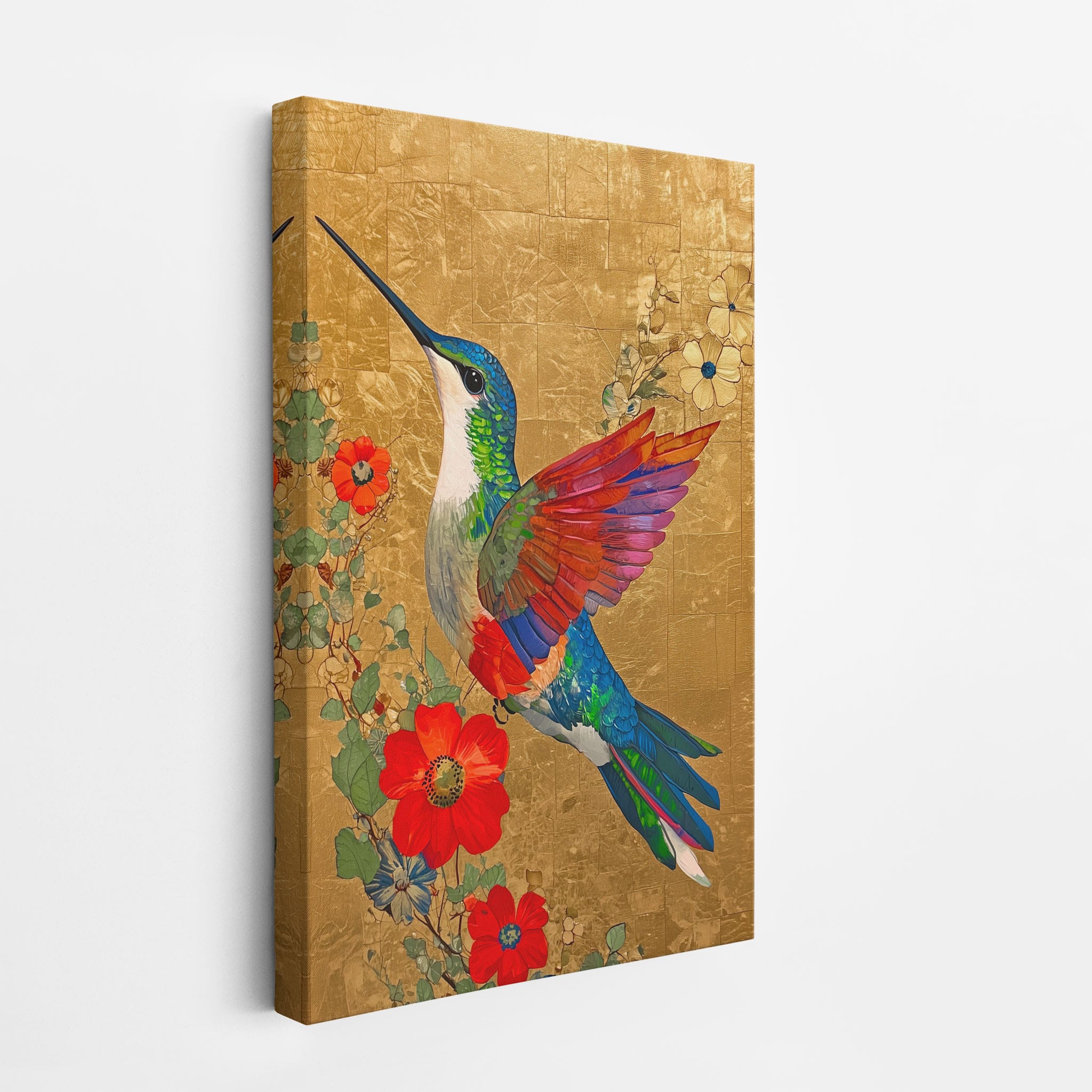This stunning digital painting captures the essence of a vibrant hummingbird mid-flight, surrounded by a lush tapestry of red and blue flowers against a textured gold background. The detailed brushwork emphasizes the shimmer of the bird's iridescent feathers, making it almost lifelike. The interplay of natural elements and vivid colors presents a striking visual appeal that resonates with nature lovers and art aficionados alike. Adding this piece to your space promises a touch of nature’s dynamism and color. This digital painting is a must-have for anyone looking to add a splash of color and wildlife charm to their home or office.