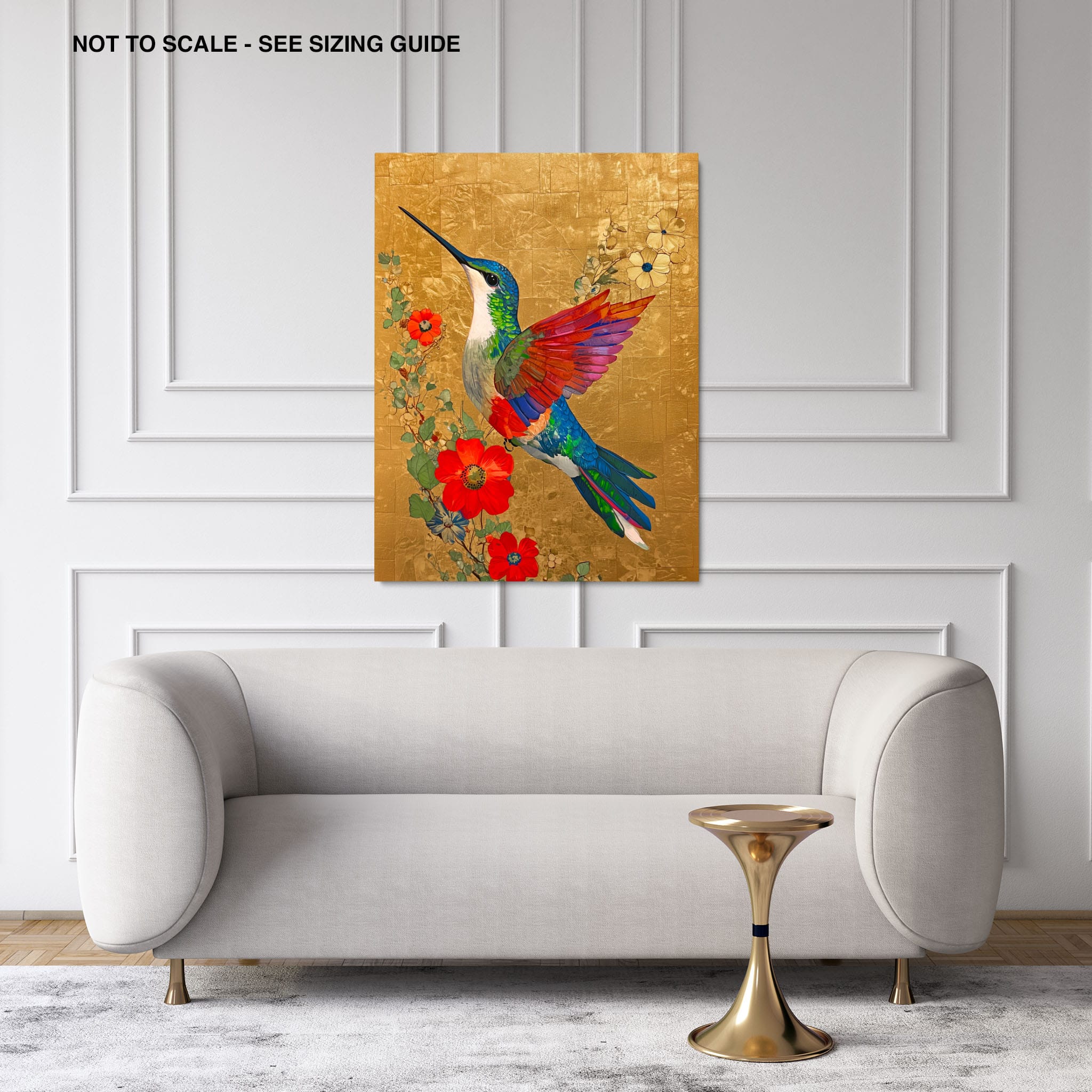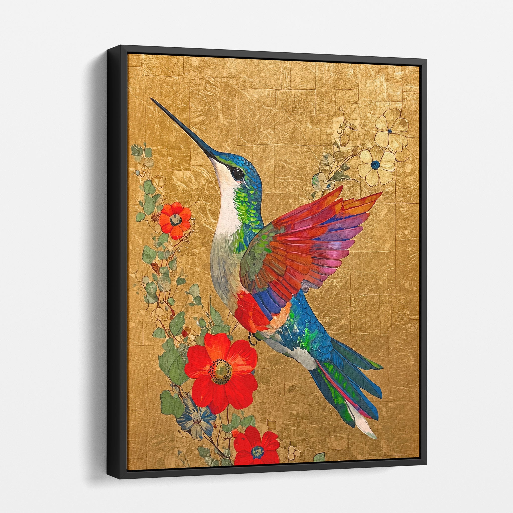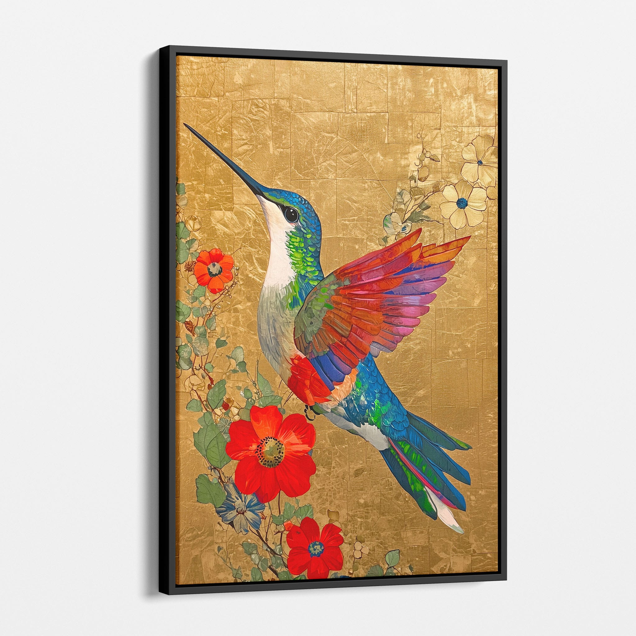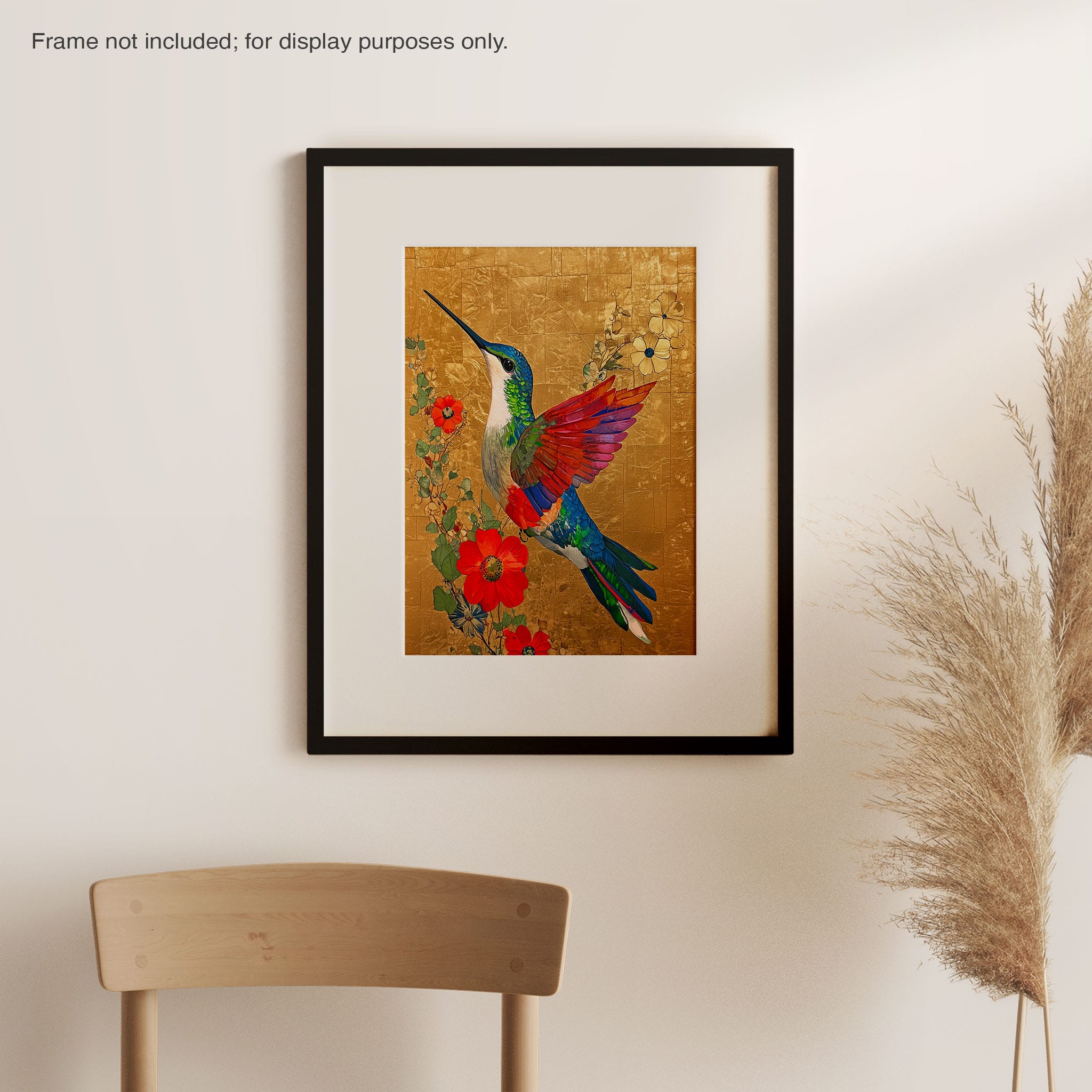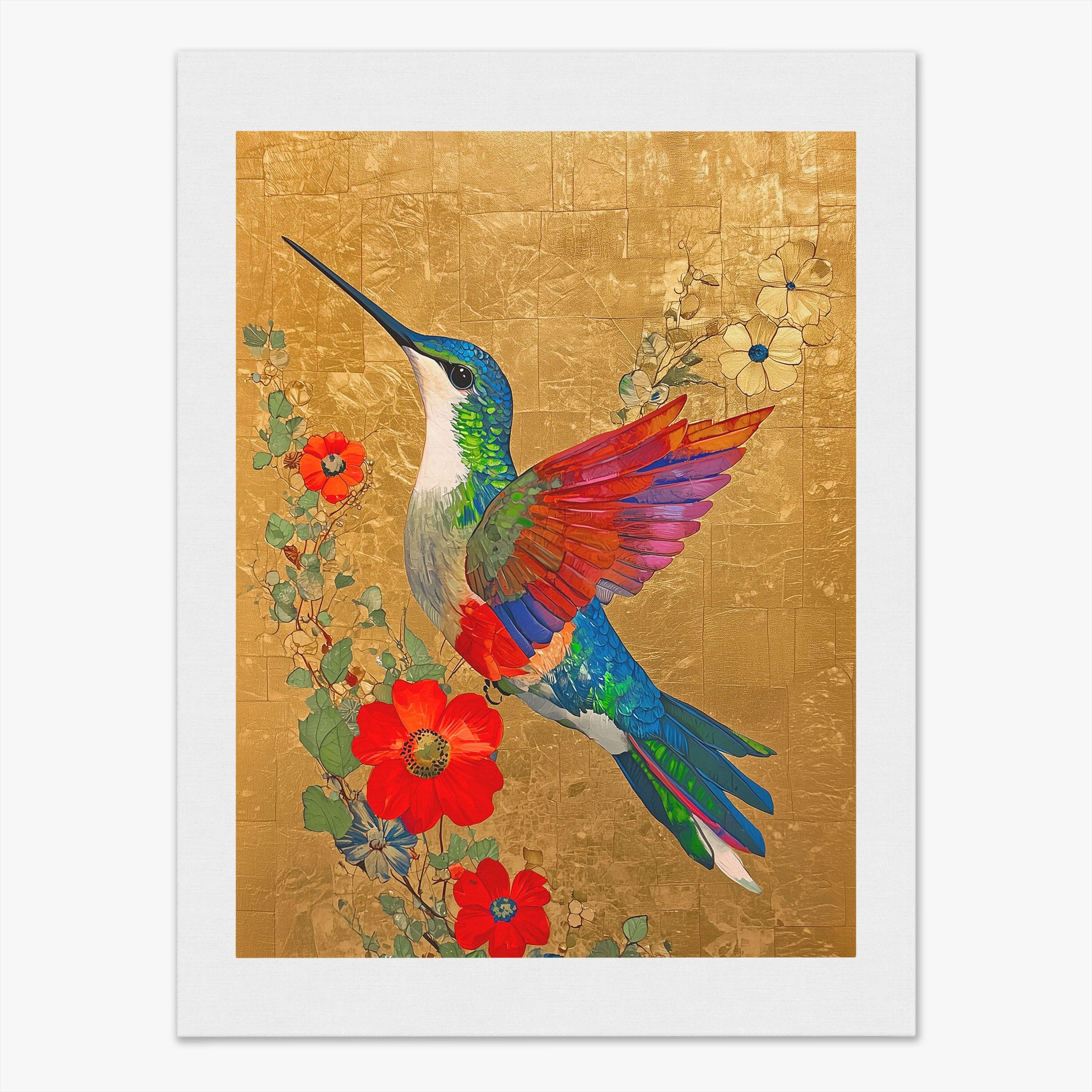 This stunning digital painting captures the essence of a vibrant hummingbird mid-flight, surrounded by a lush tapestry of red and blue flowers against a textured gold background. The detailed brushwork emphasizes the shimmer of the bird's iridescent feathers, making it almost lifelike. The interplay of natural elements and vivid colors presents a striking visual appeal that resonates with nature lovers and art aficionados alike. Adding this piece to your space promises a touch of nature’s dynamism and color. This digital painting is a must-have for anyone looking to add a splash of color and wildlife charm to their home or office.