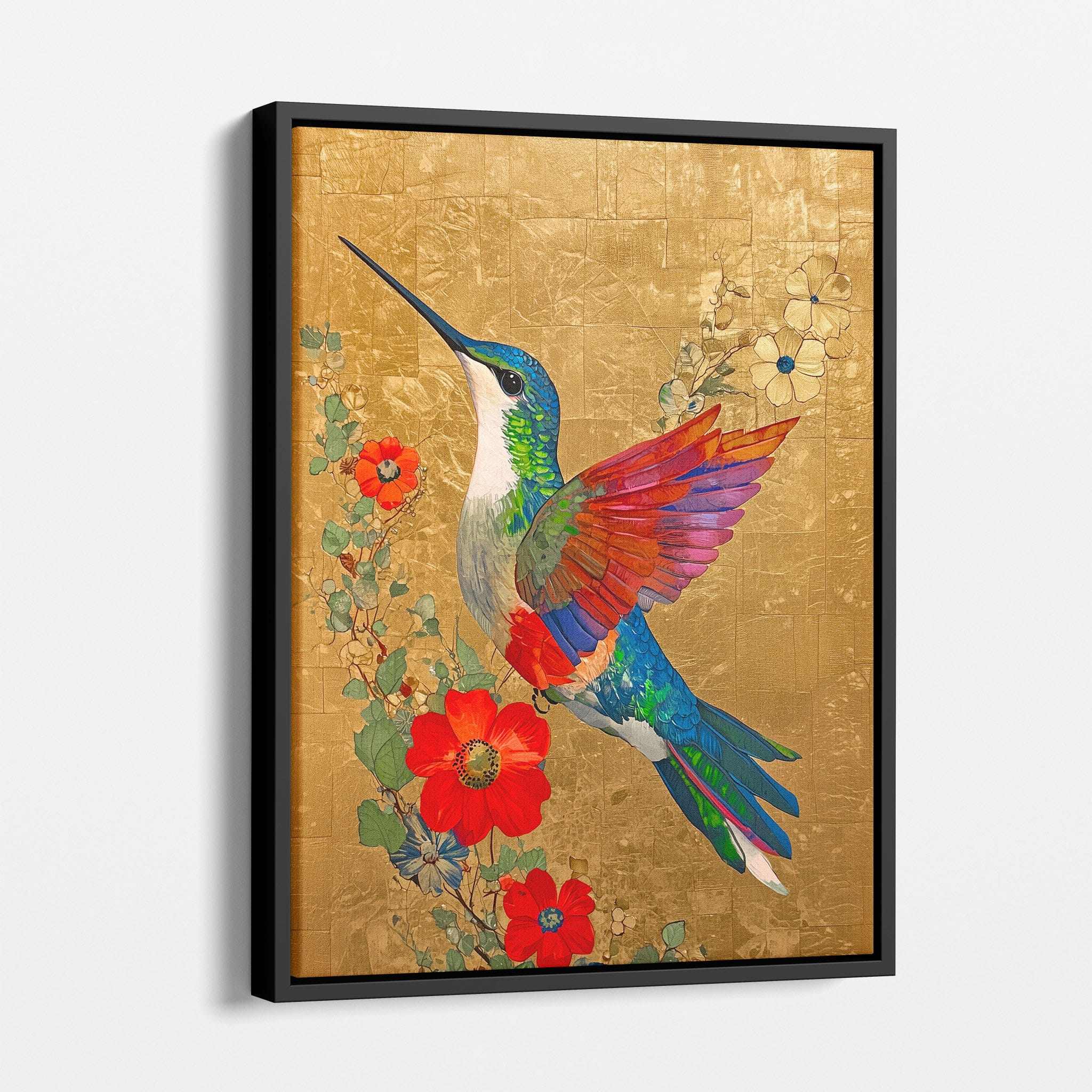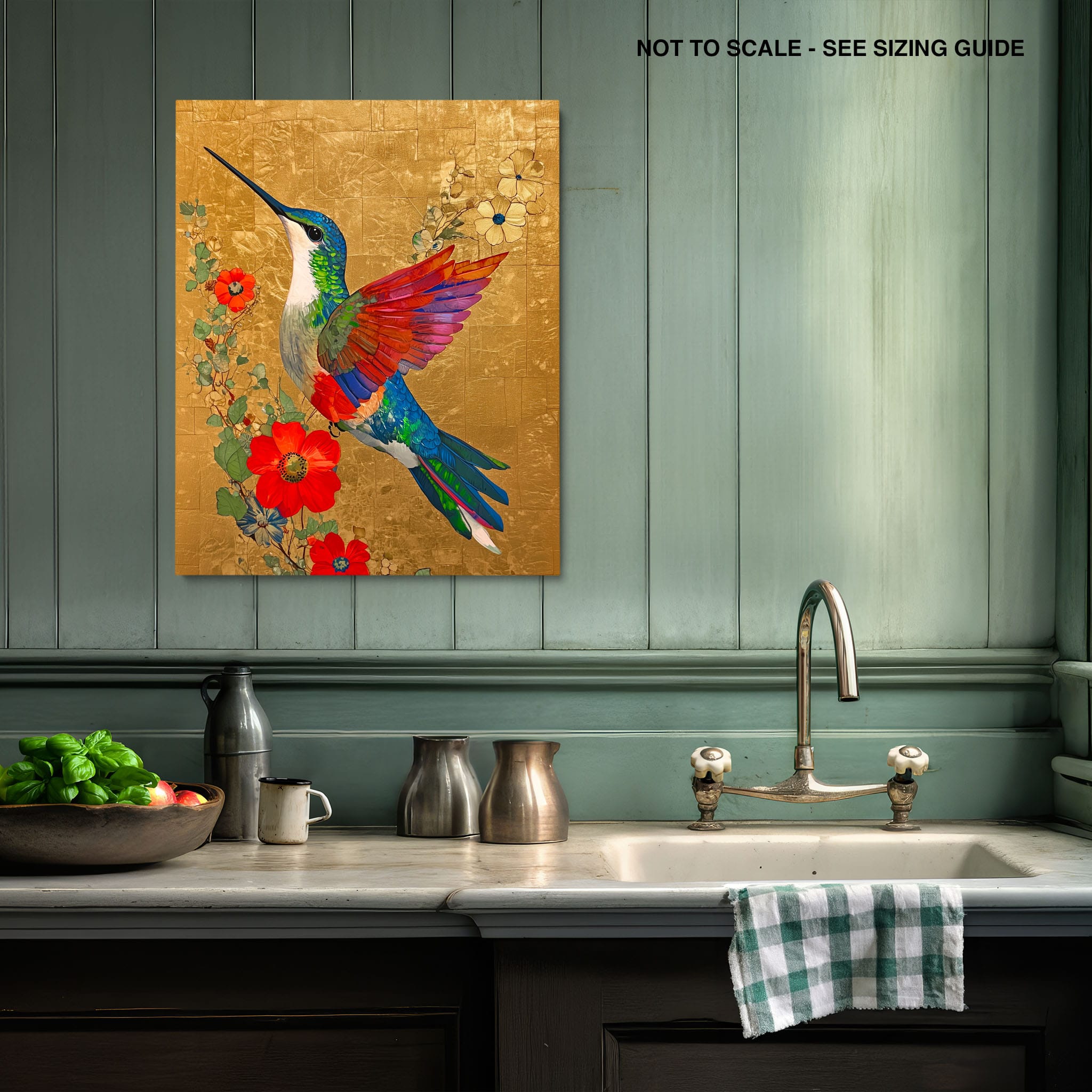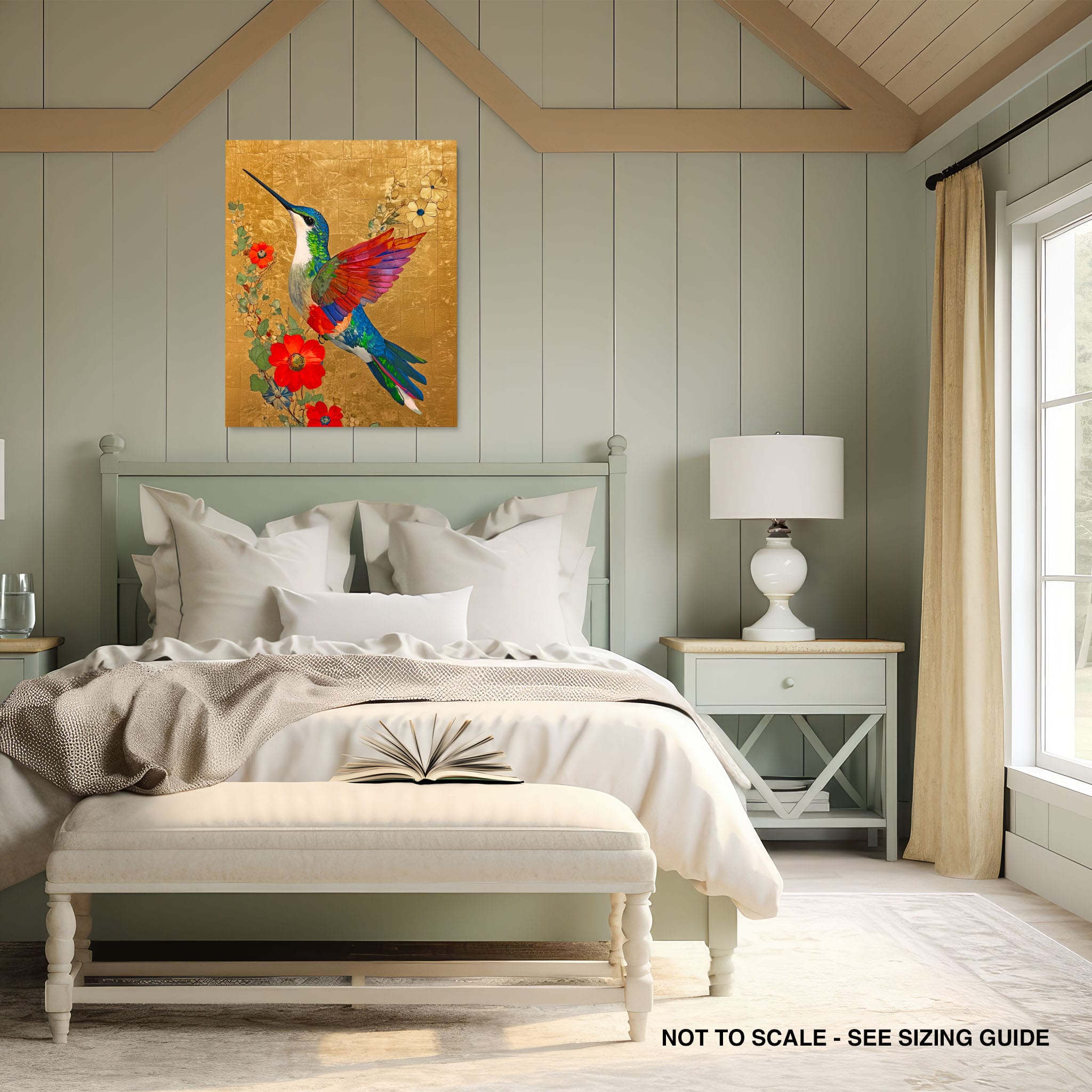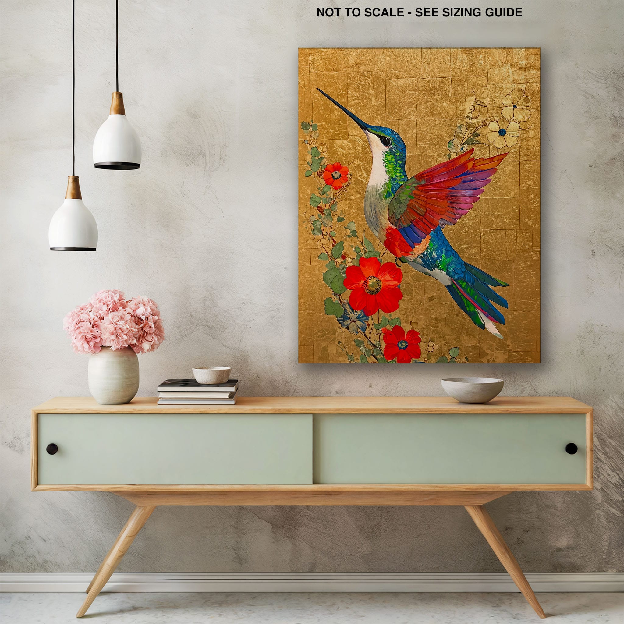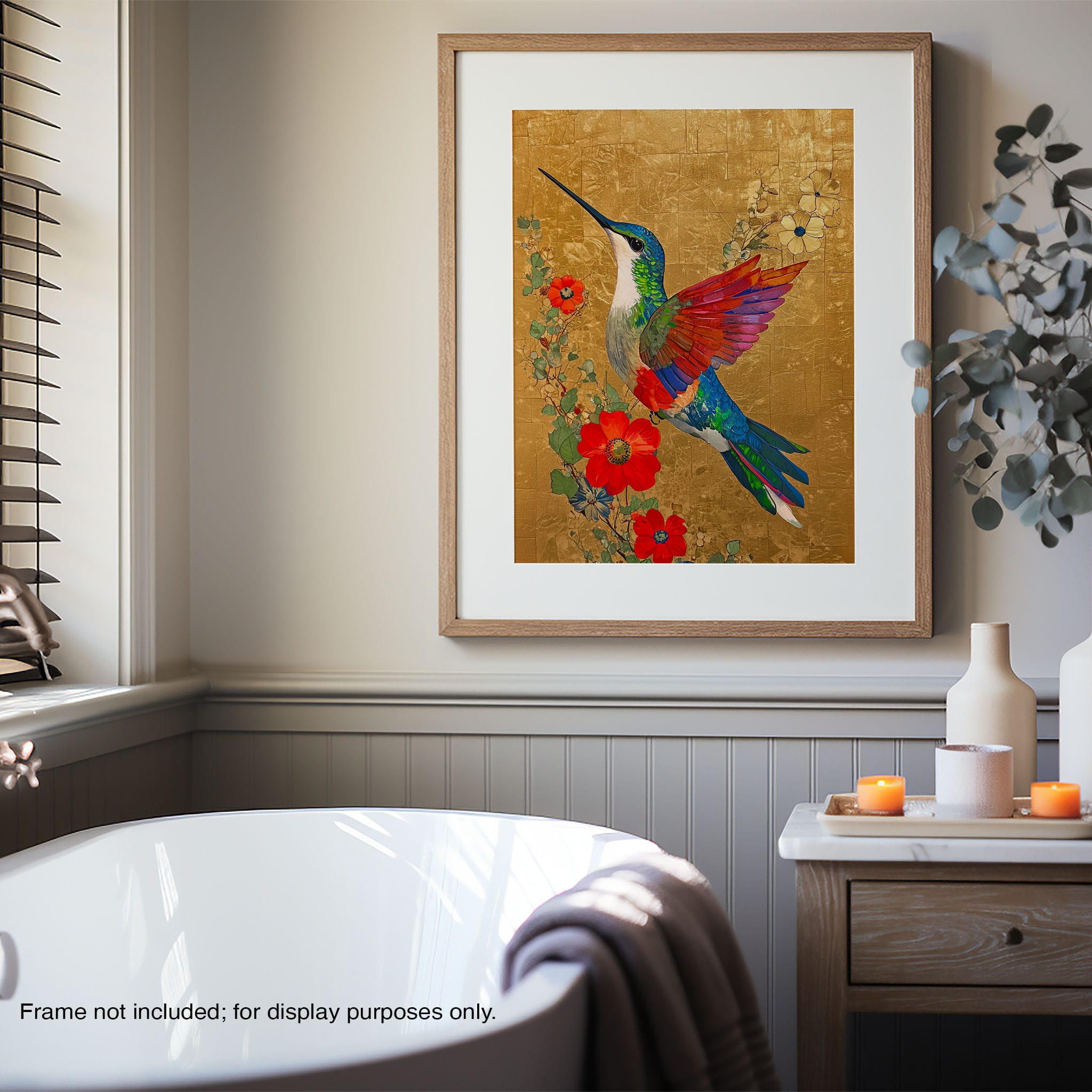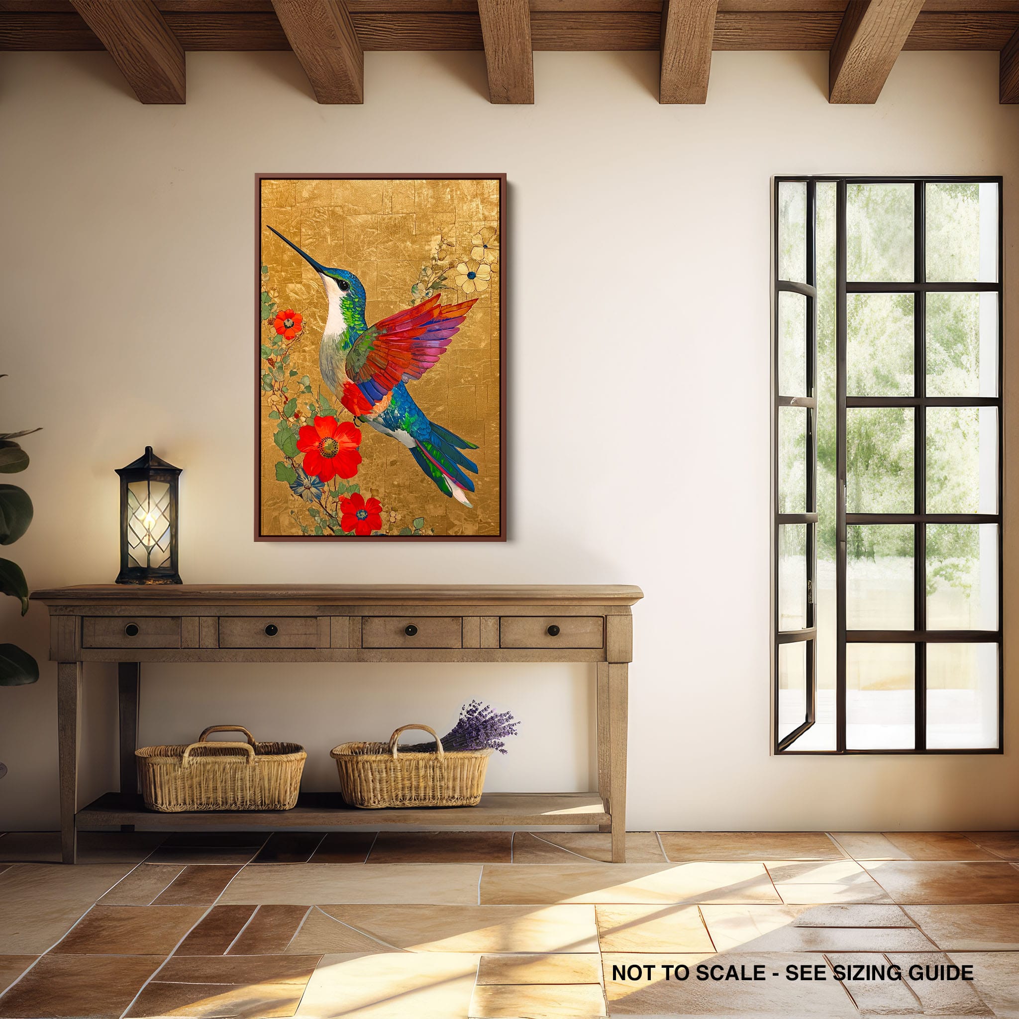 This stunning digital painting captures the essence of a vibrant hummingbird mid-flight, surrounded by a lush tapestry of red and blue flowers against a textured gold background. The detailed brushwork emphasizes the shimmer of the bird's iridescent feathers, making it almost lifelike. The interplay of natural elements and vivid colors presents a striking visual appeal that resonates with nature lovers and art aficionados alike. Adding this piece to your space promises a touch of nature’s dynamism and color. This digital painting is a must-have for anyone looking to add a splash of color and wildlife charm to their home or office.