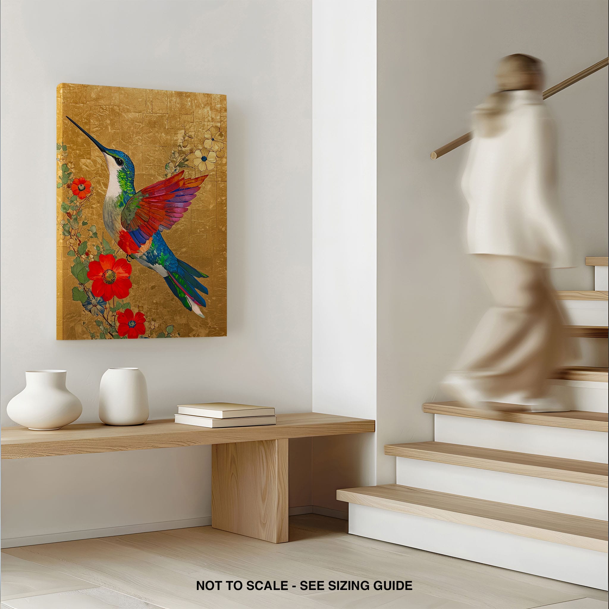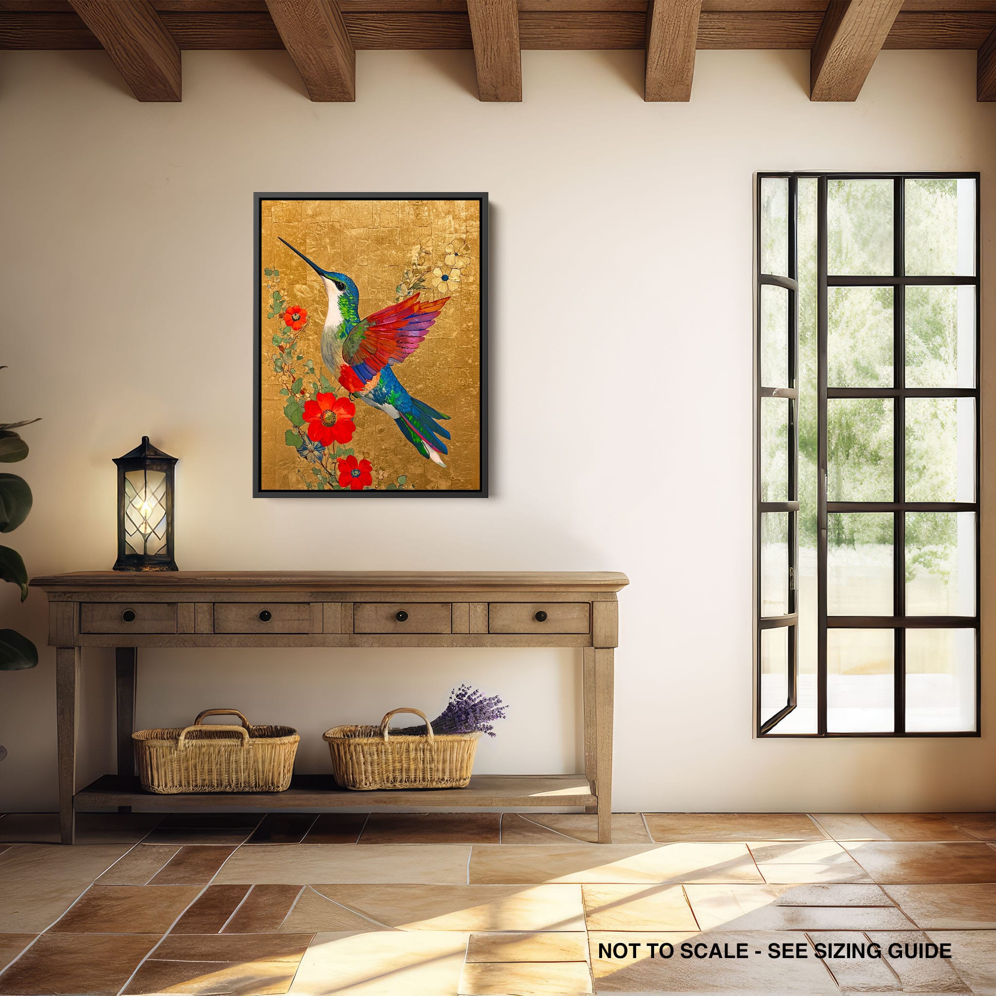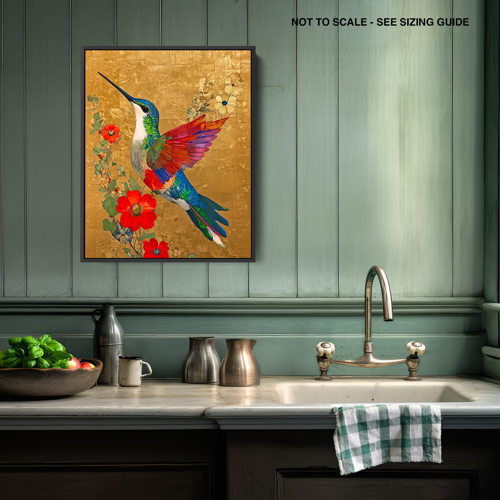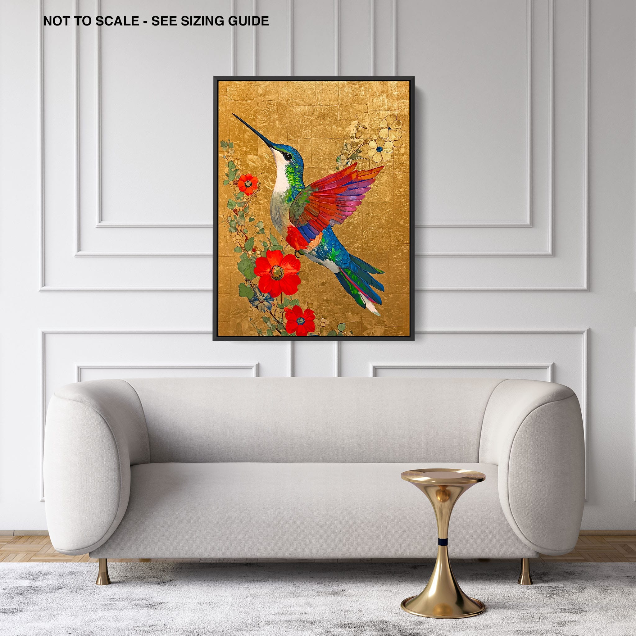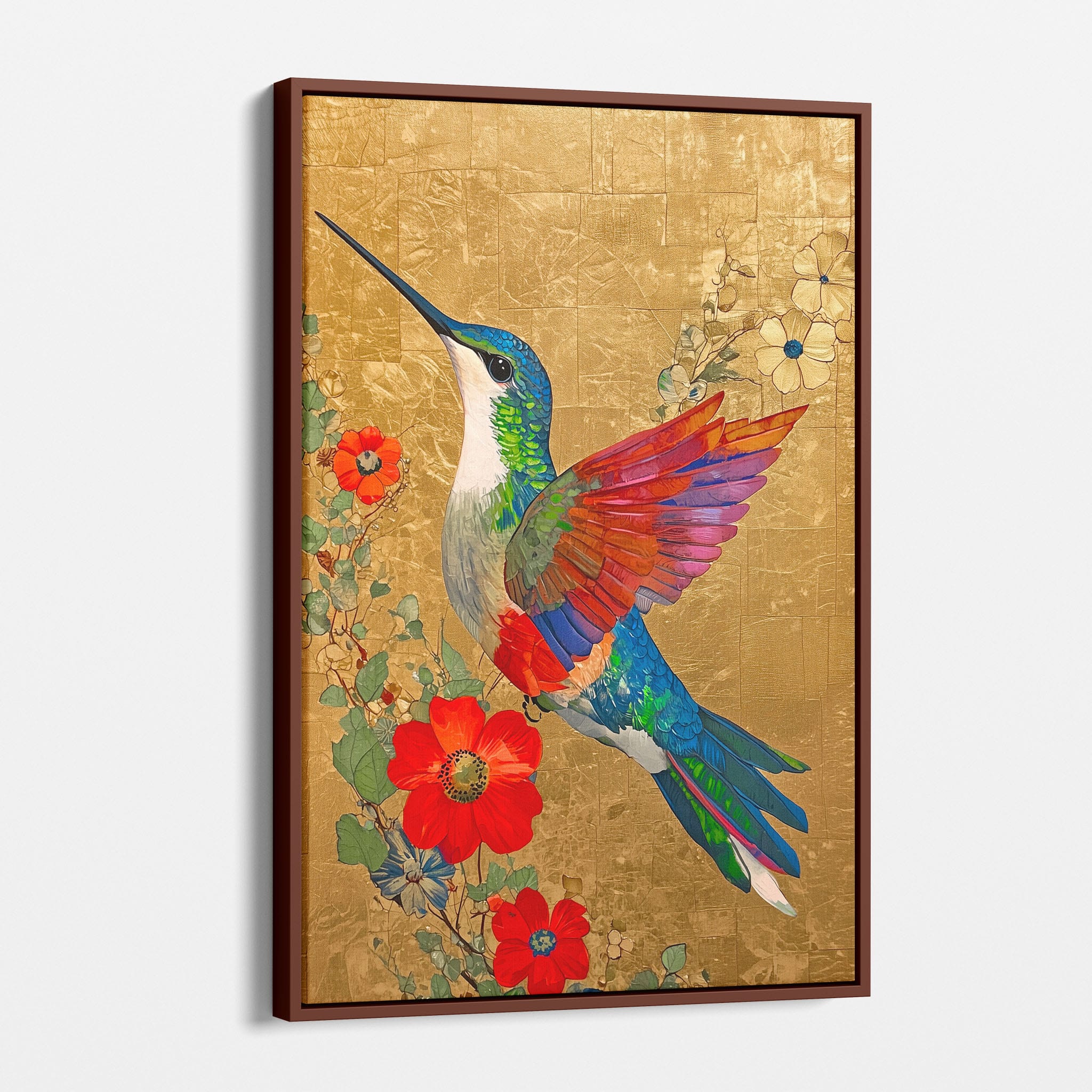 This stunning digital painting captures the essence of a vibrant hummingbird mid-flight, surrounded by a lush tapestry of red and blue flowers against a textured gold background. The detailed brushwork emphasizes the shimmer of the bird's iridescent feathers, making it almost lifelike. The interplay of natural elements and vivid colors presents a striking visual appeal that resonates with nature lovers and art aficionados alike. Adding this piece to your space promises a touch of nature’s dynamism and color. This digital painting is a must-have for anyone looking to add a splash of color and wildlife charm to their home or office.