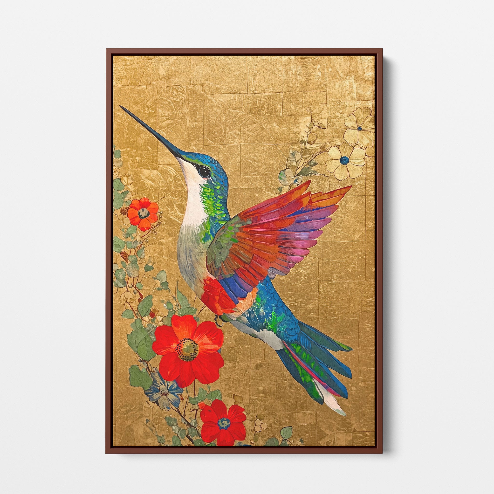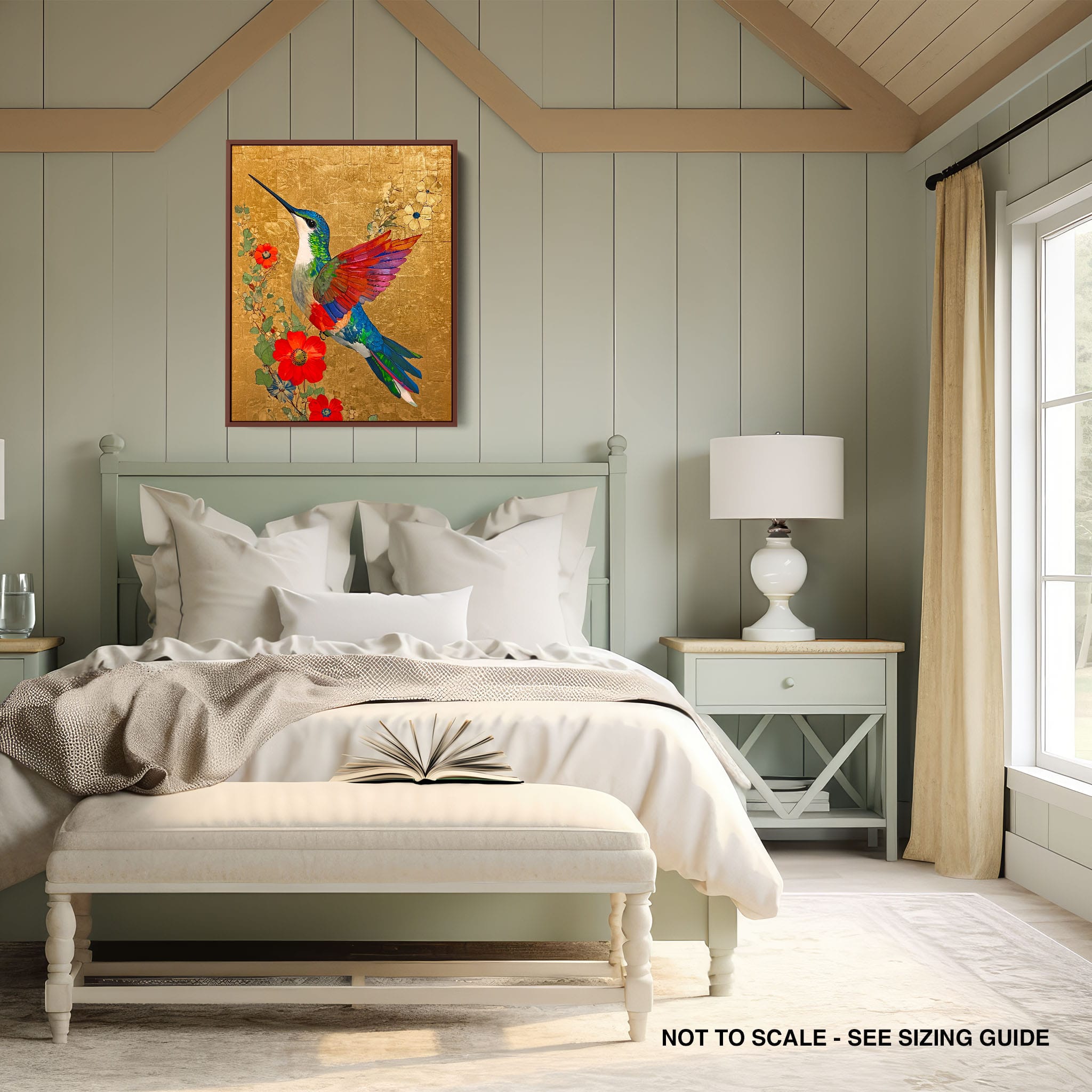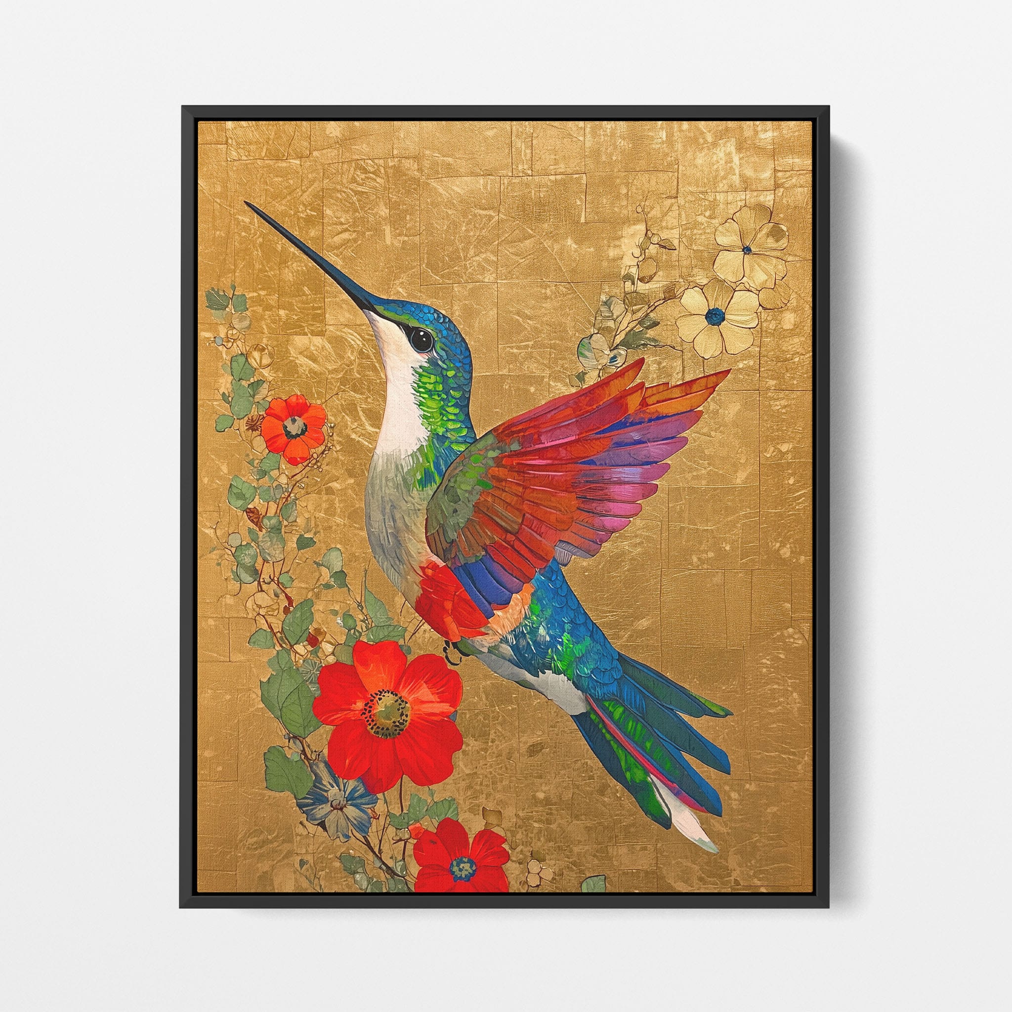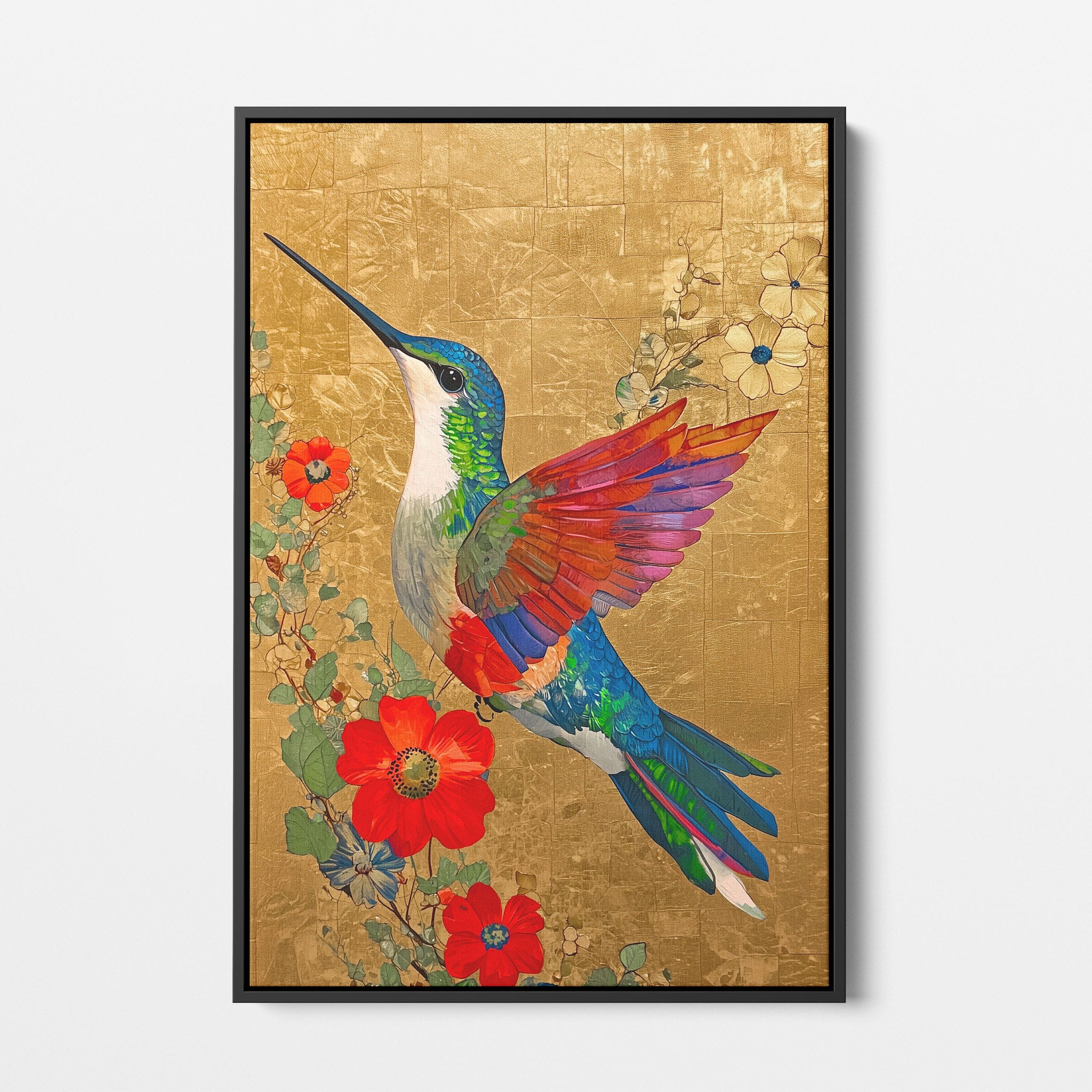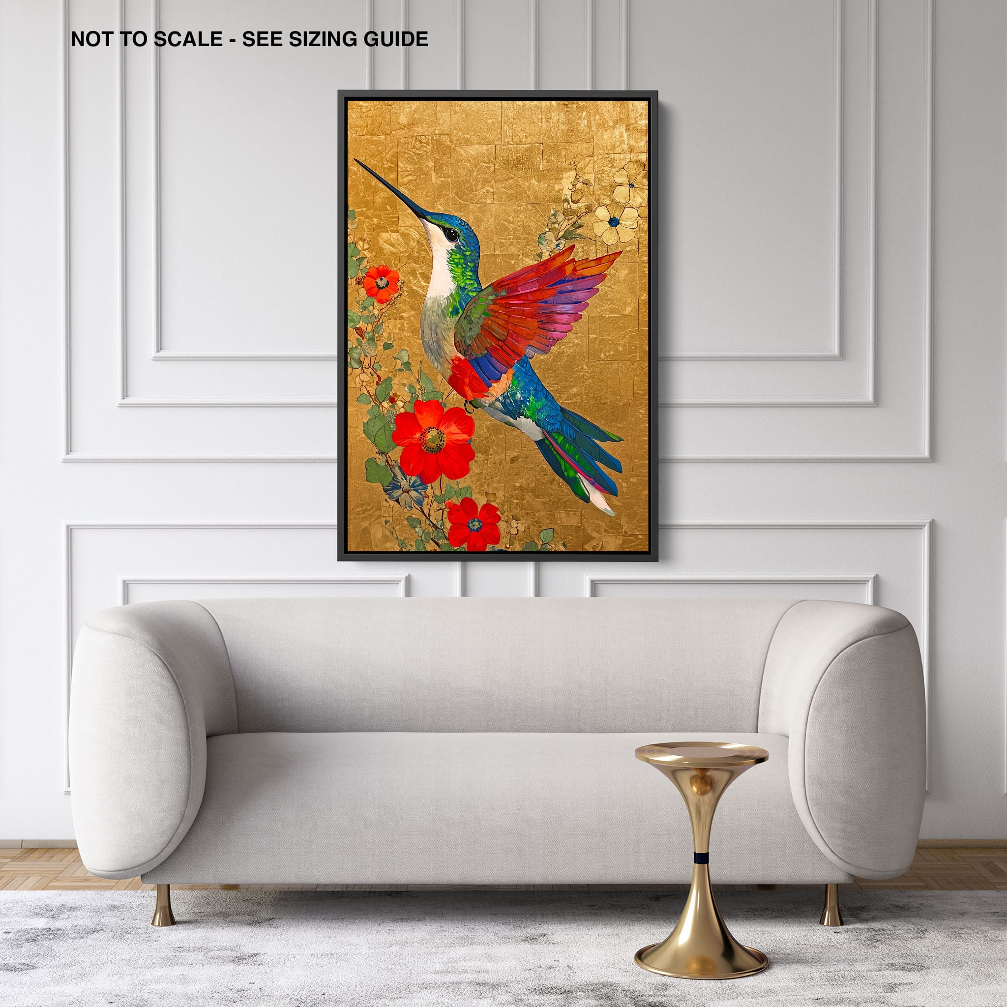 This stunning digital painting captures the essence of a vibrant hummingbird mid-flight, surrounded by a lush tapestry of red and blue flowers against a textured gold background. The detailed brushwork emphasizes the shimmer of the bird's iridescent feathers, making it almost lifelike. The interplay of natural elements and vivid colors presents a striking visual appeal that resonates with nature lovers and art aficionados alike. Adding this piece to your space promises a touch of nature’s dynamism and color. This digital painting is a must-have for anyone looking to add a splash of color and wildlife charm to their home or office.