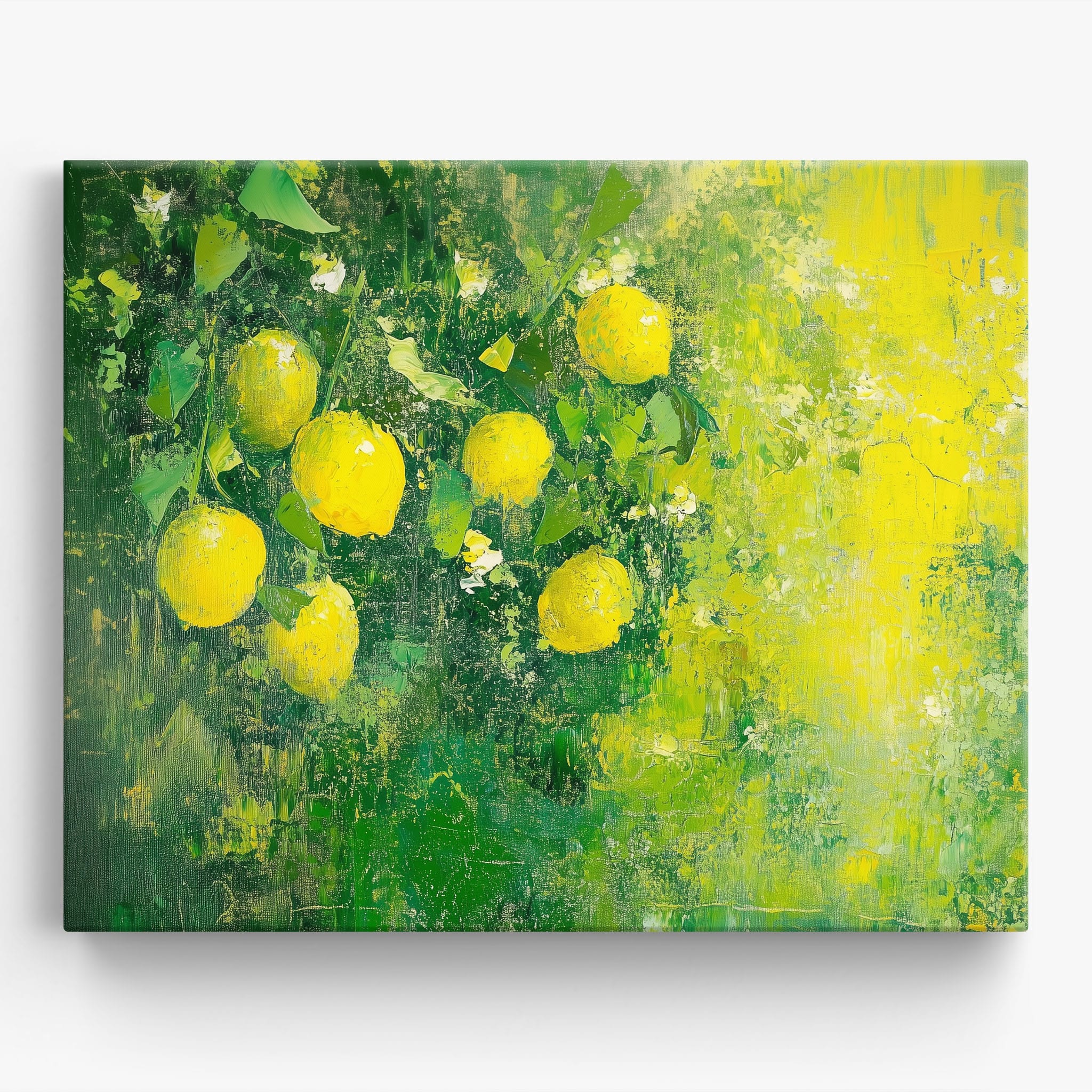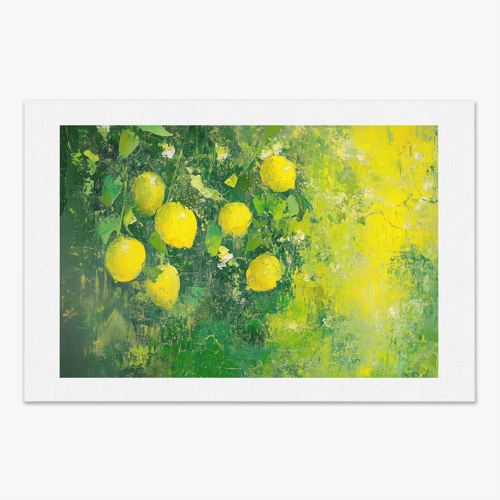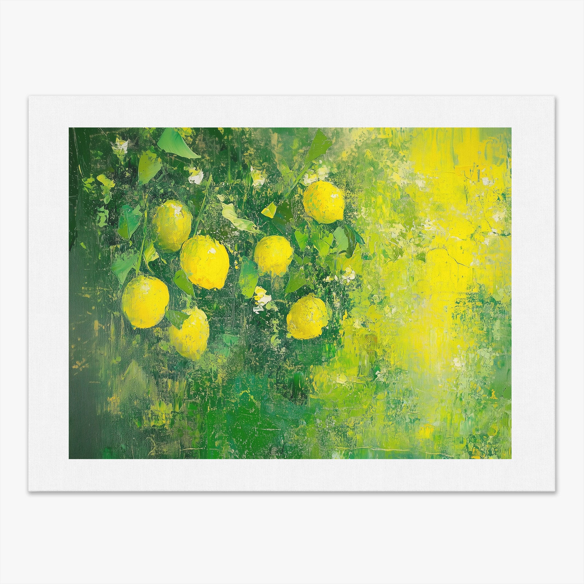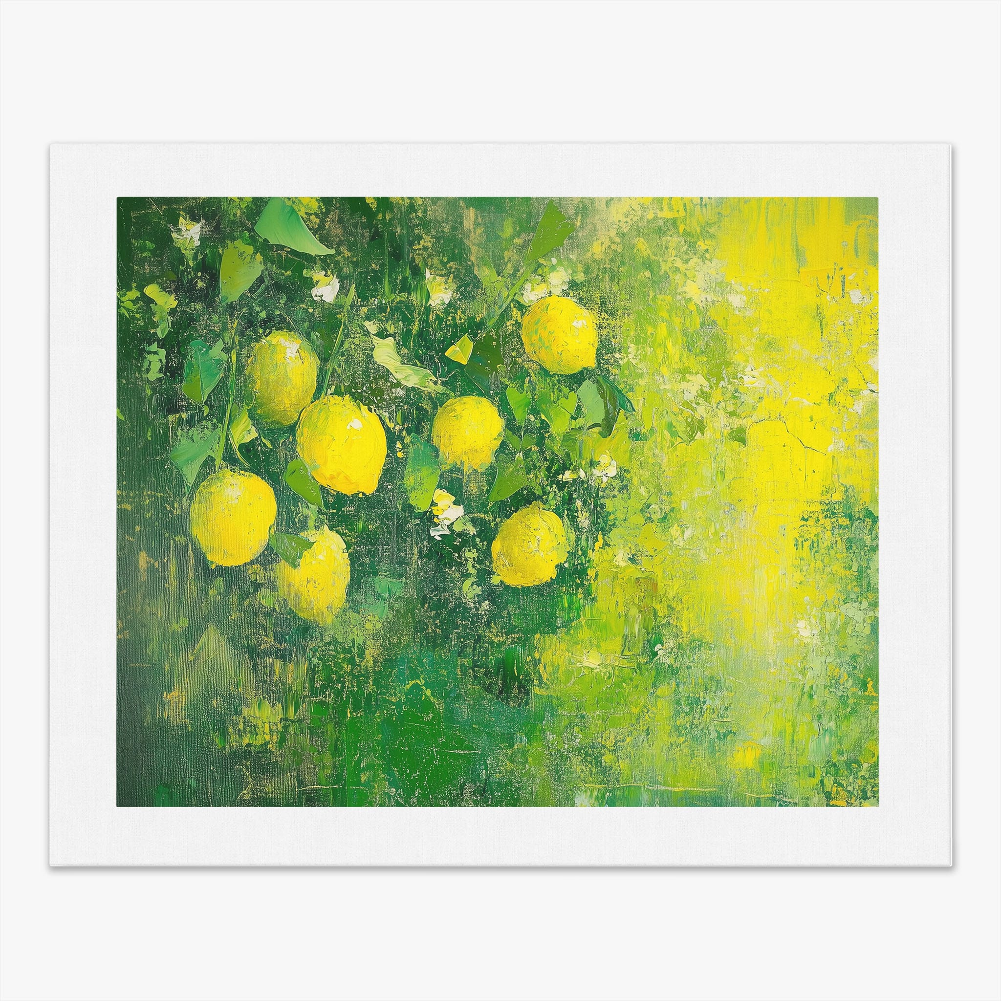 Capturing the lively essence of summer, this vivid painting showcases a cluster of fresh, bright lemons ensconced in rich, verdant greens. Utilizing thick layers of paint, the artist achieves a texture that elevates the ordinary fruit to a captivating focus of art. The joyful yellows against the dynamic green background evoke the zest of nature, appealing to aficionados of Impressionism and Still Life. Ideal for brightening up a kitchen or a dining space, this piece promises to bring a touch of nature's vibrancy into your home.