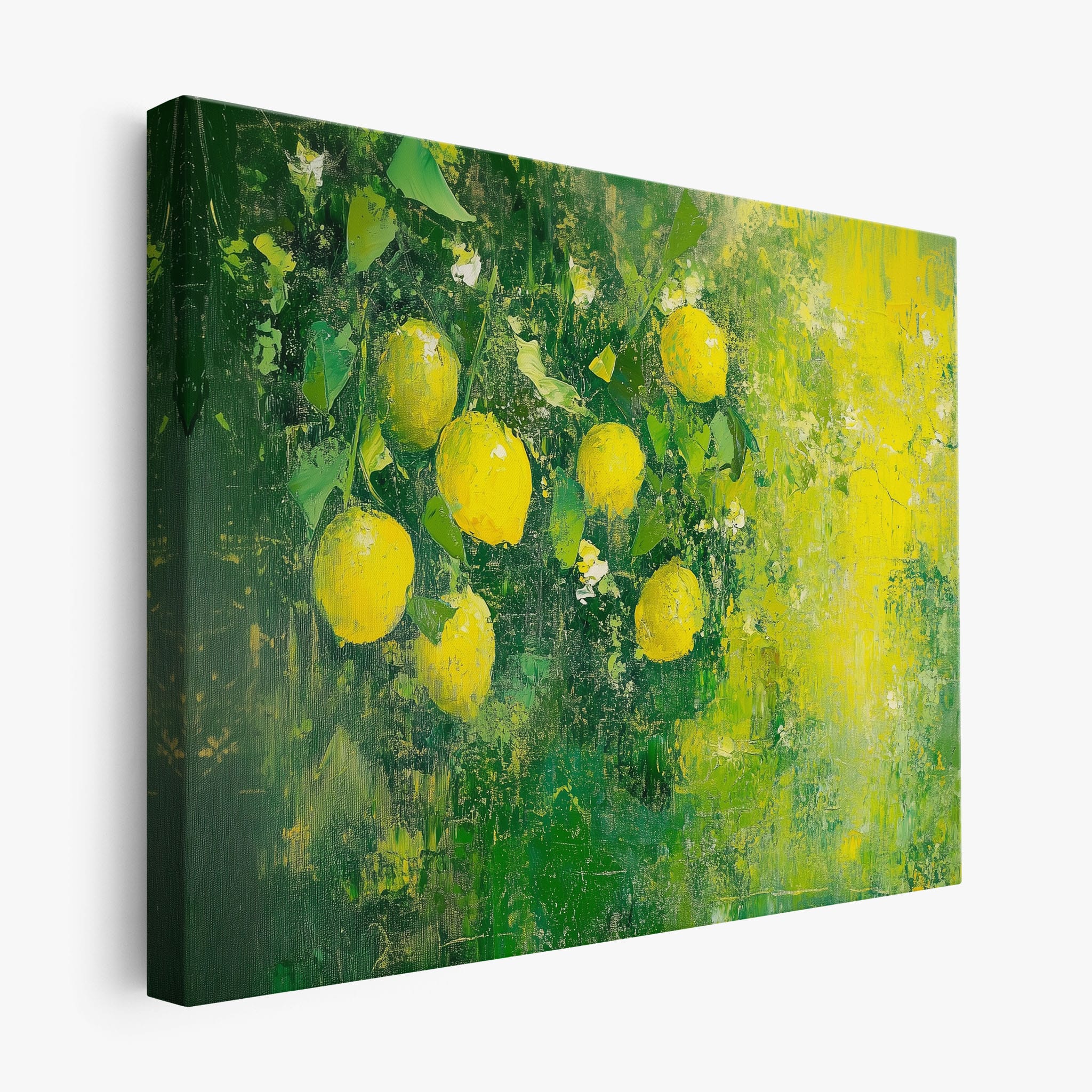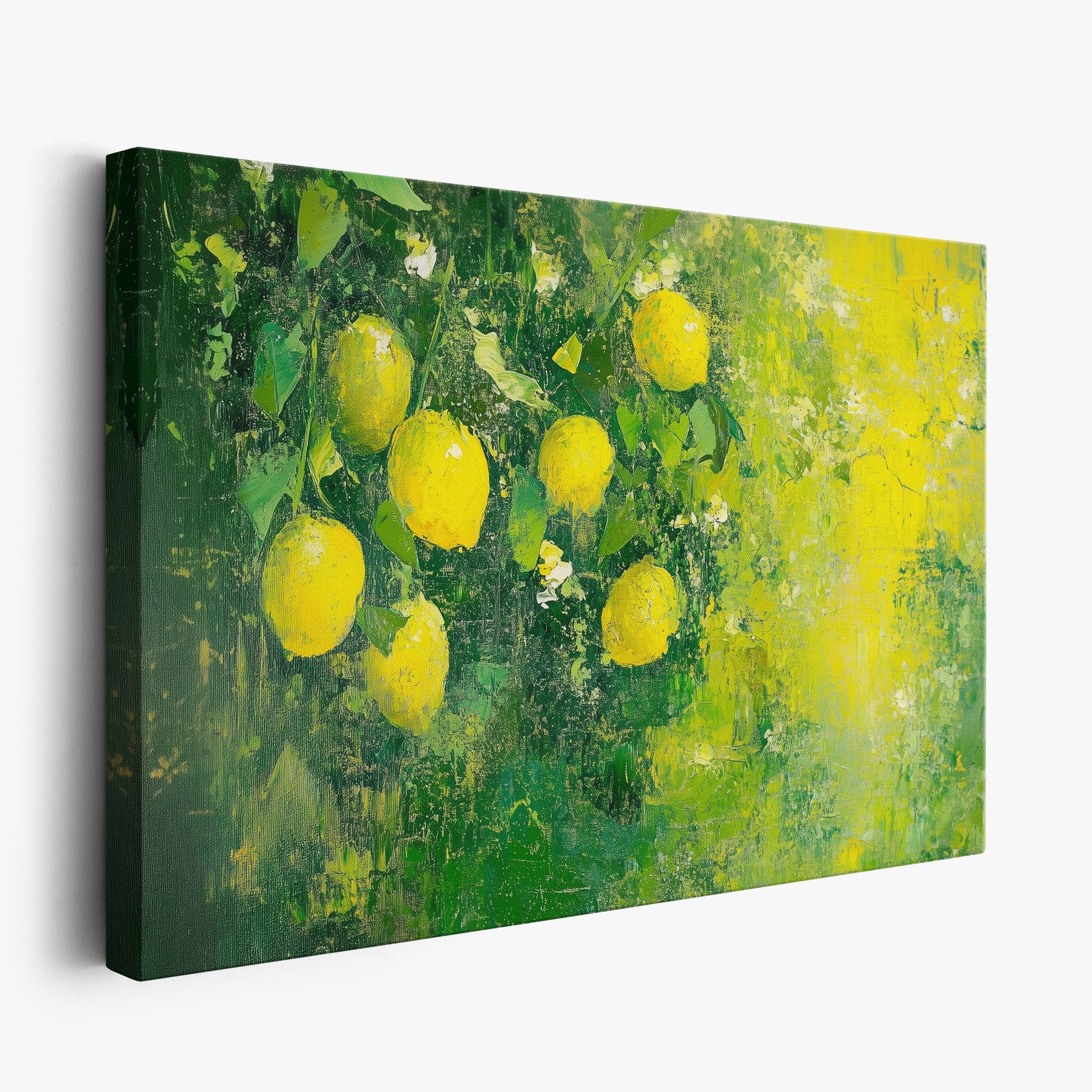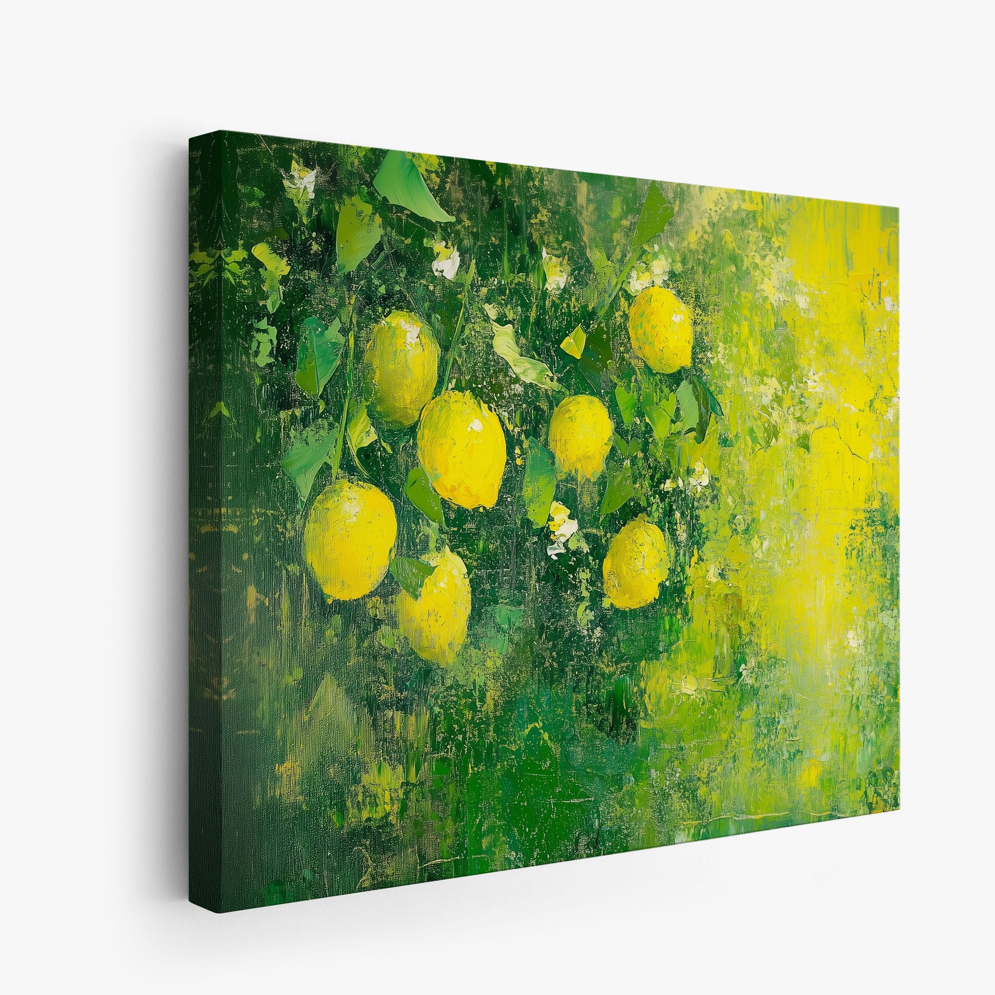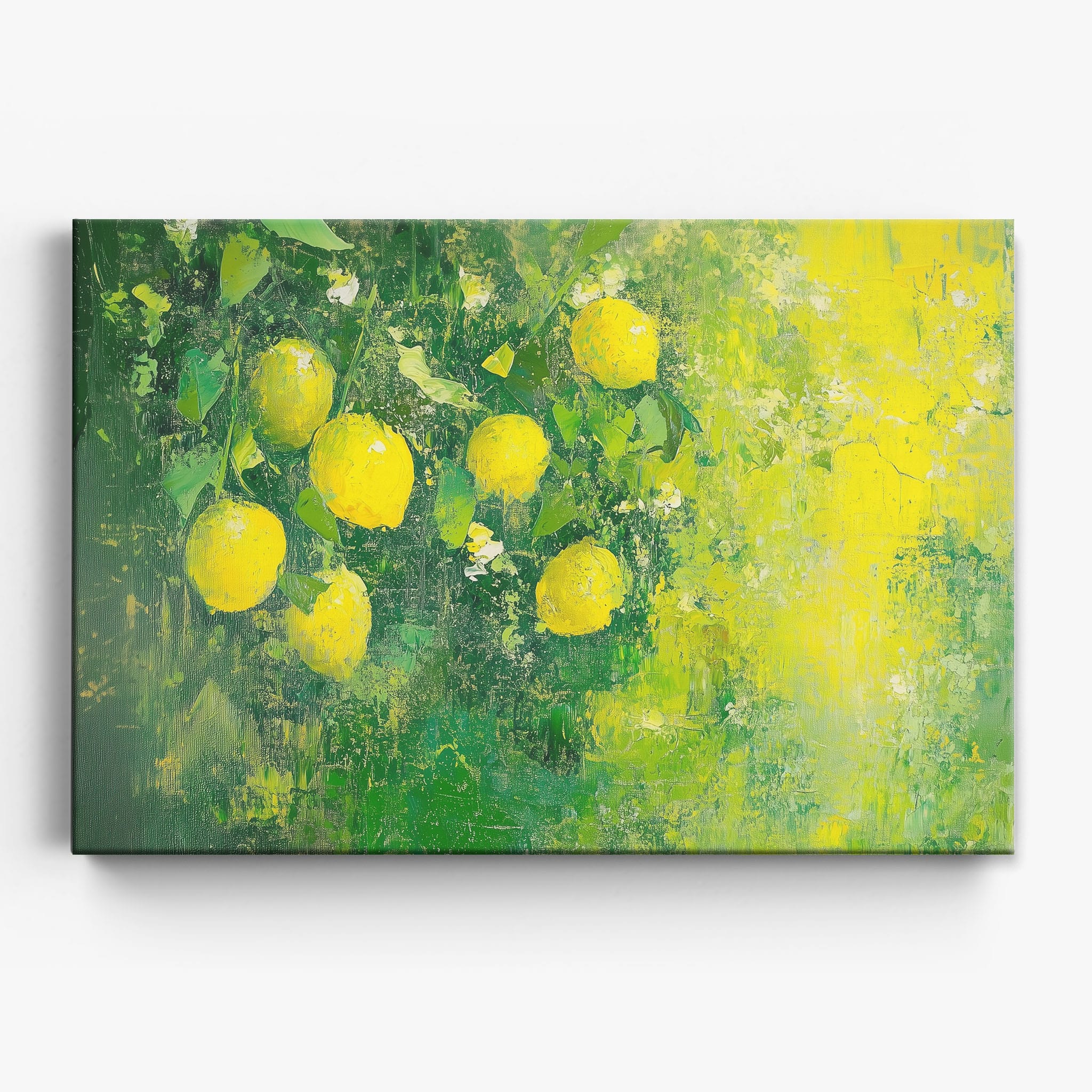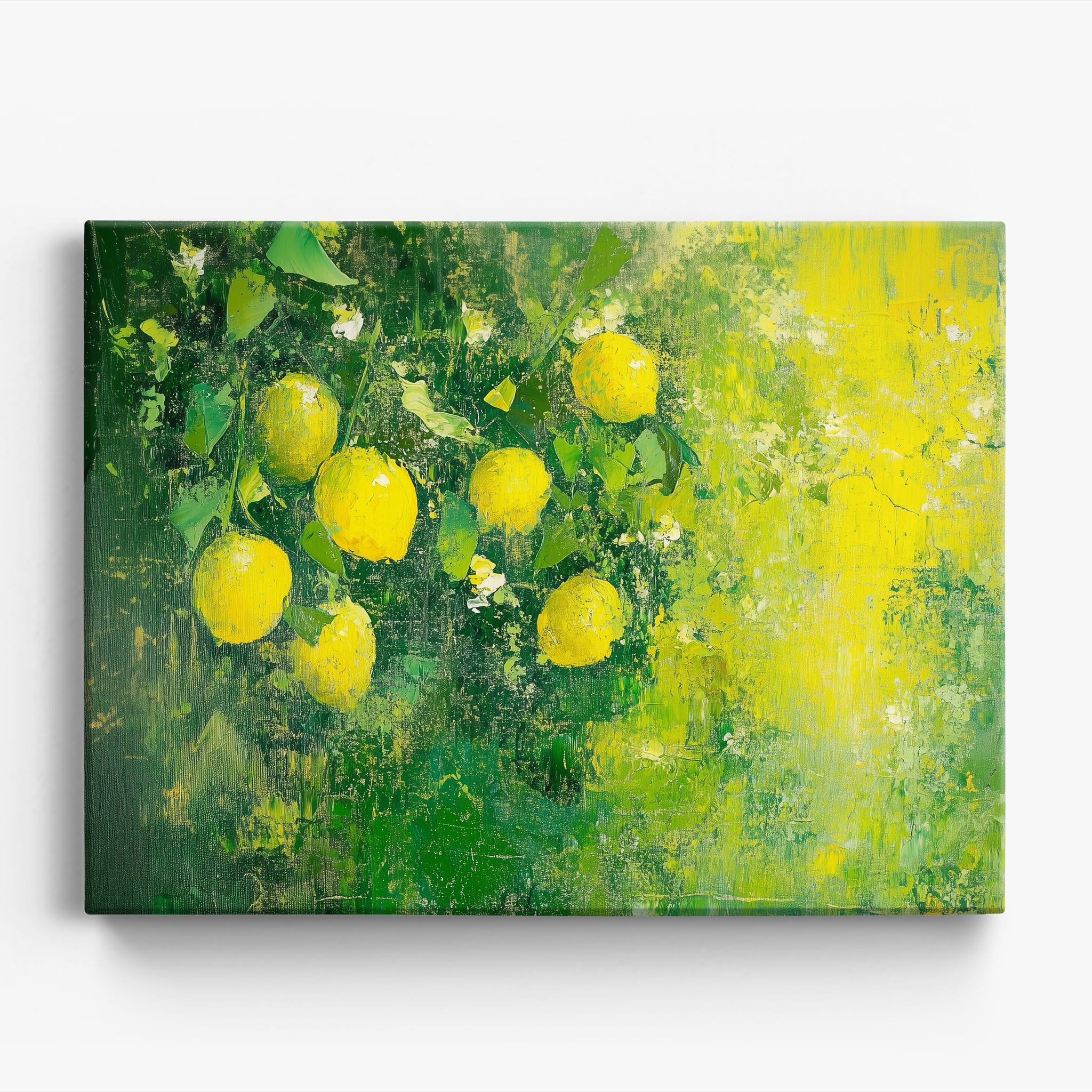 Capturing the lively essence of summer, this vivid painting showcases a cluster of fresh, bright lemons ensconced in rich, verdant greens. Utilizing thick layers of paint, the artist achieves a texture that elevates the ordinary fruit to a captivating focus of art. The joyful yellows against the dynamic green background evoke the zest of nature, appealing to aficionados of Impressionism and Still Life. Ideal for brightening up a kitchen or a dining space, this piece promises to bring a touch of nature's vibrancy into your home.