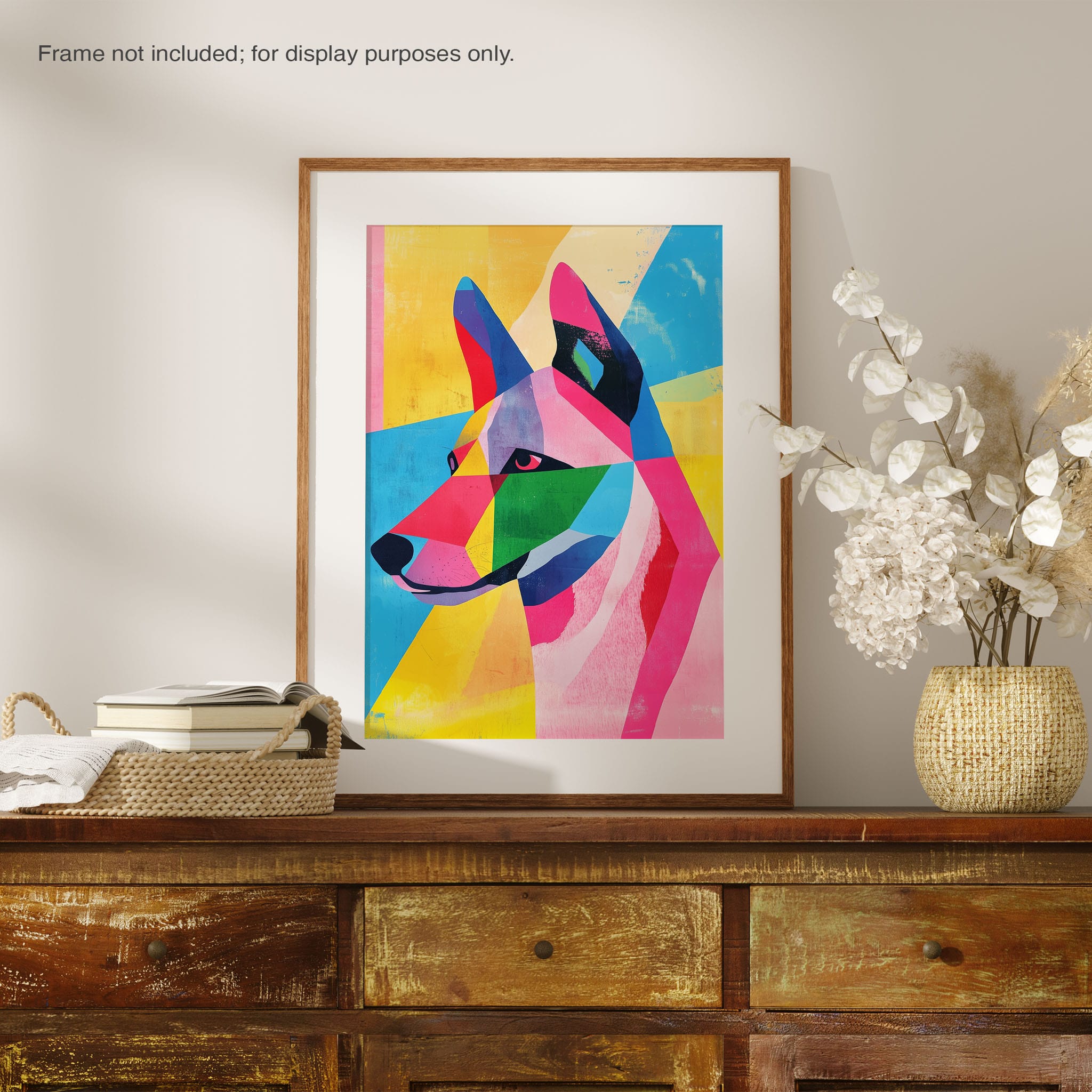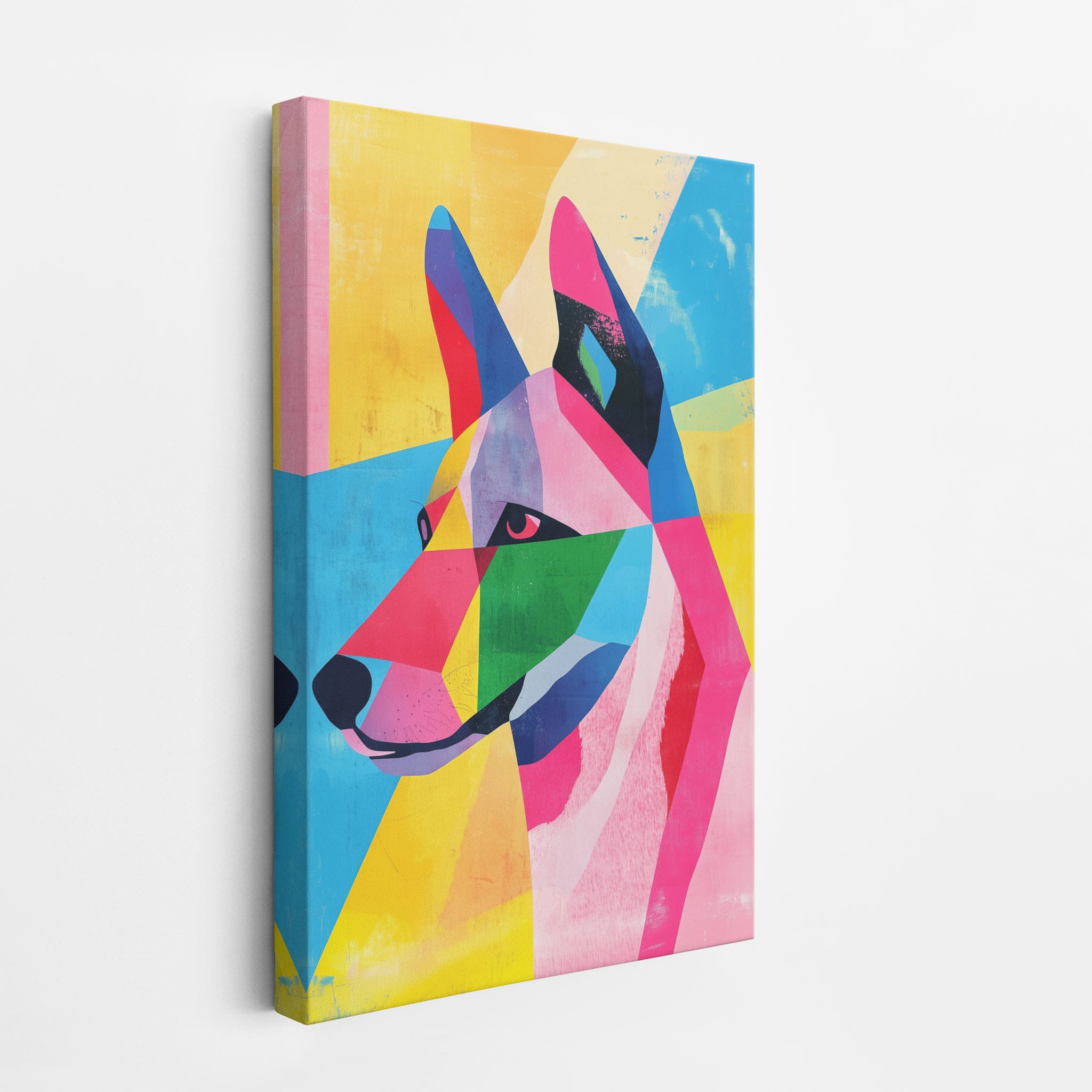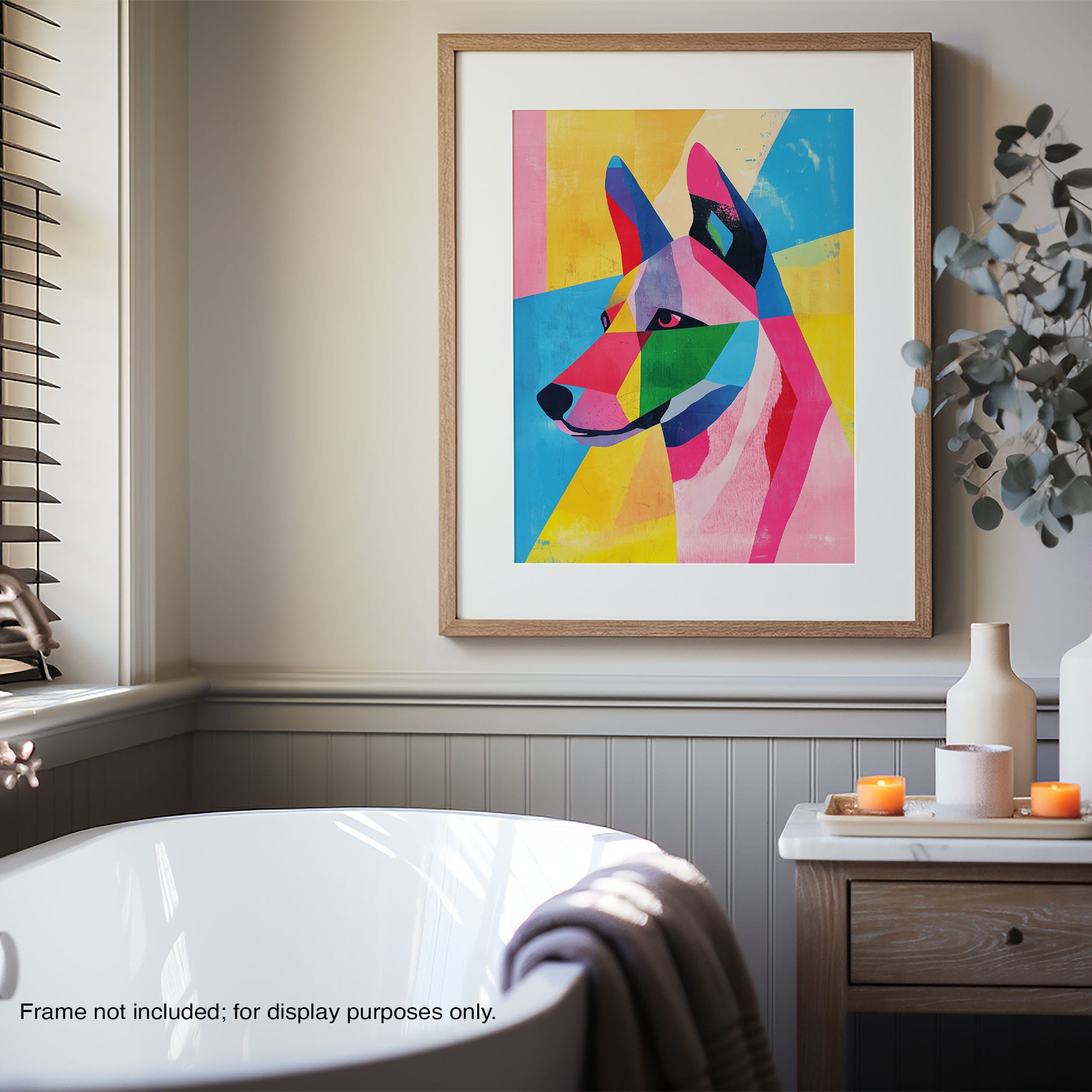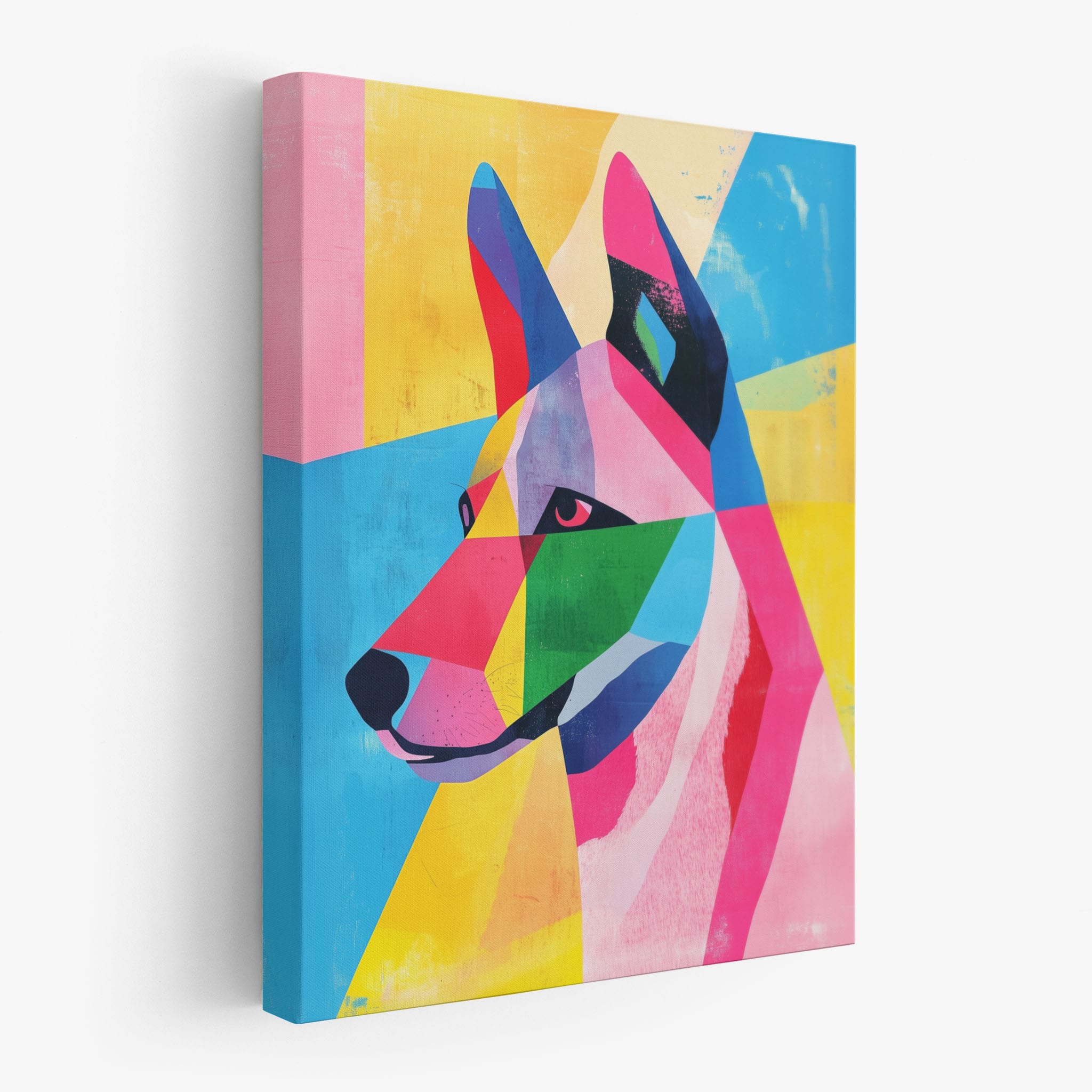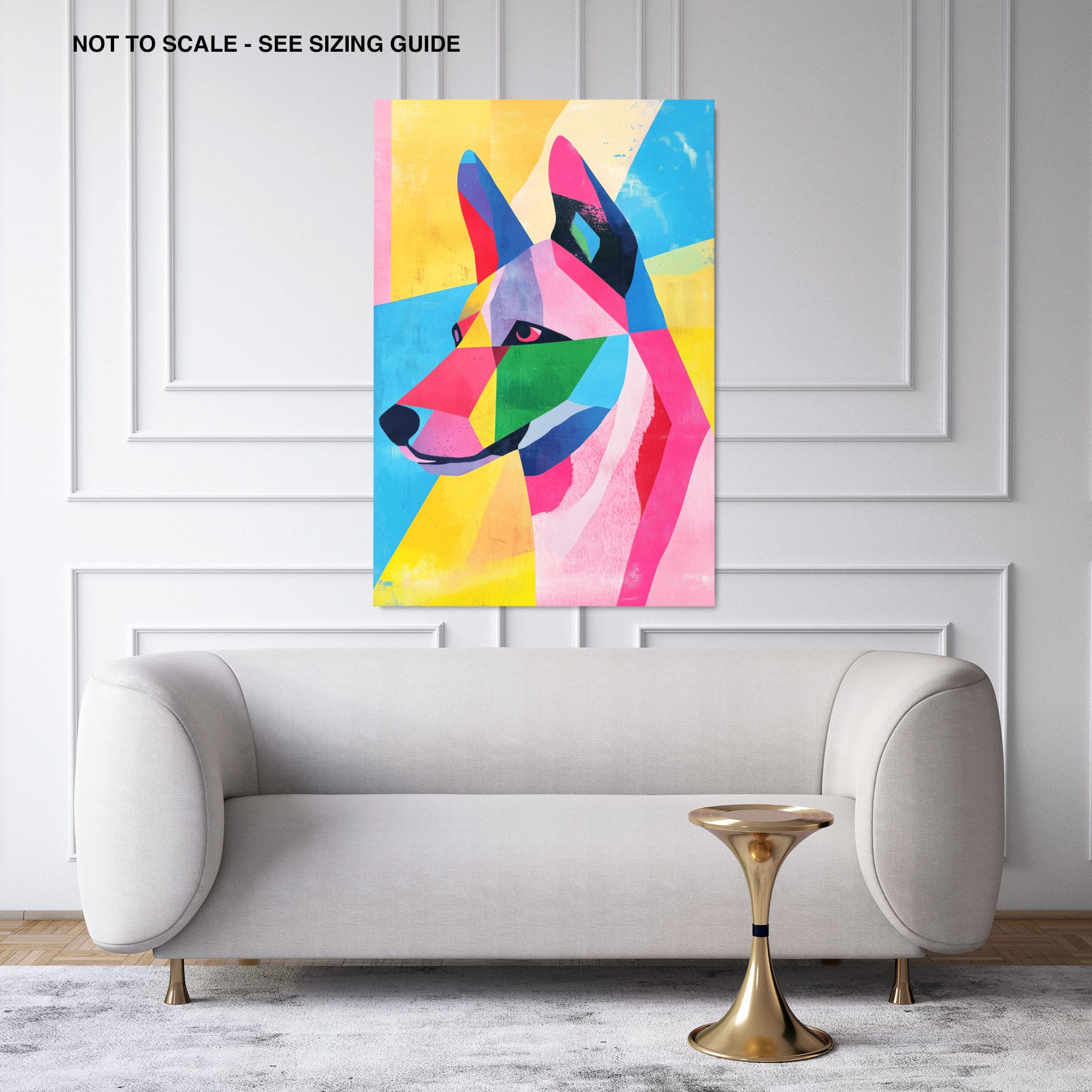 This art piece showcases a digital illustration of a dog, composed through a stunning array of geometric shapes and a vibrant color palette. Striking pink, blue, and yellow hues intersect to create a modern and eye-catching representation of man’s best friend. Its bold lines and sharp angles contrast beautifully, forming a dynamic composition that brings this contemporary canine portrait to life. Perfect for adding a splash of color and modernity to any room, this artwork is sure to appeal to animal lovers and fans of unique, digital artistry.