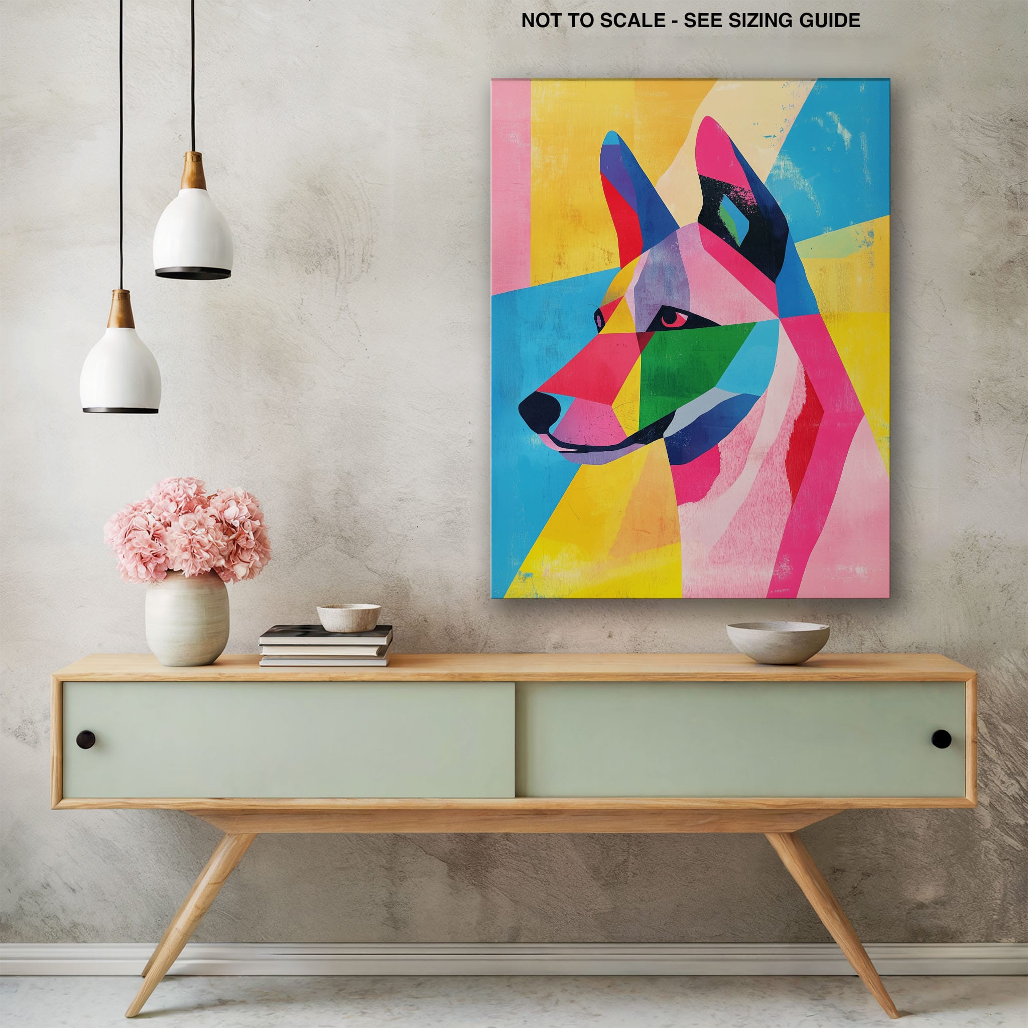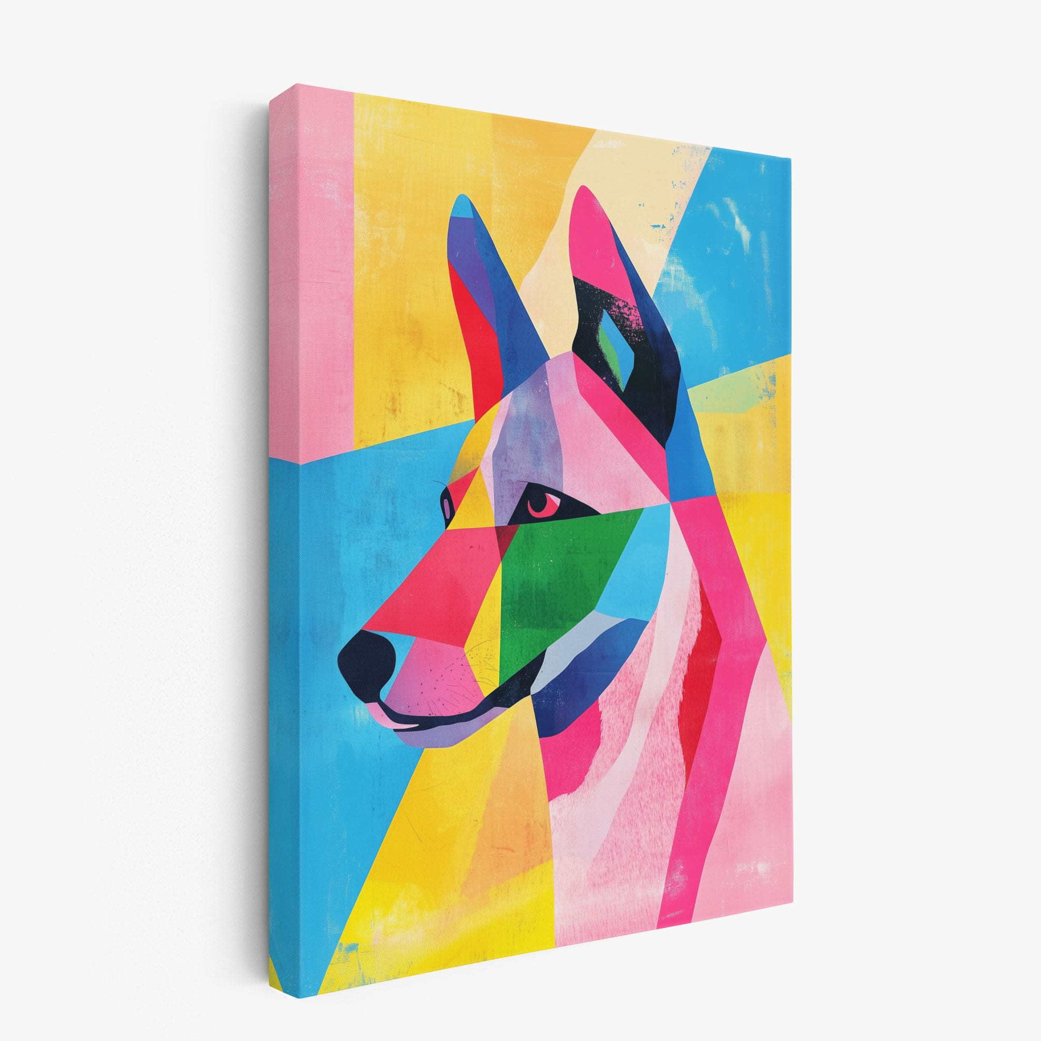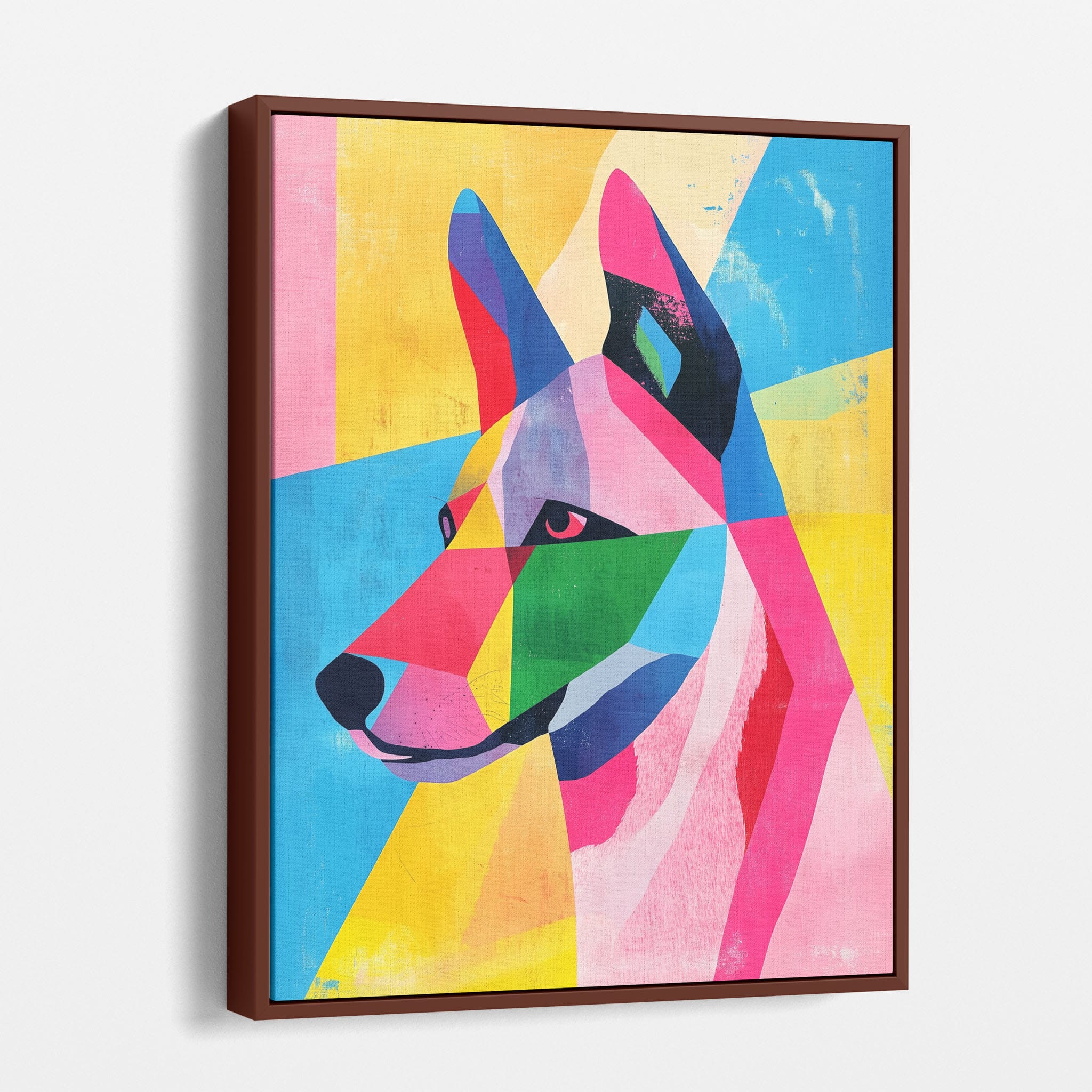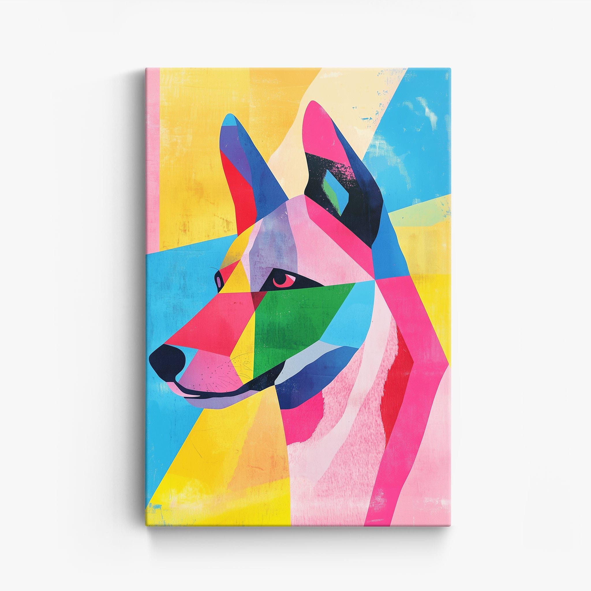 This art piece showcases a digital illustration of a dog, composed through a stunning array of geometric shapes and a vibrant color palette. Striking pink, blue, and yellow hues intersect to create a modern and eye-catching representation of man’s best friend. Its bold lines and sharp angles contrast beautifully, forming a dynamic composition that brings this contemporary canine portrait to life. Perfect for adding a splash of color and modernity to any room, this artwork is sure to appeal to animal lovers and fans of unique, digital artistry.