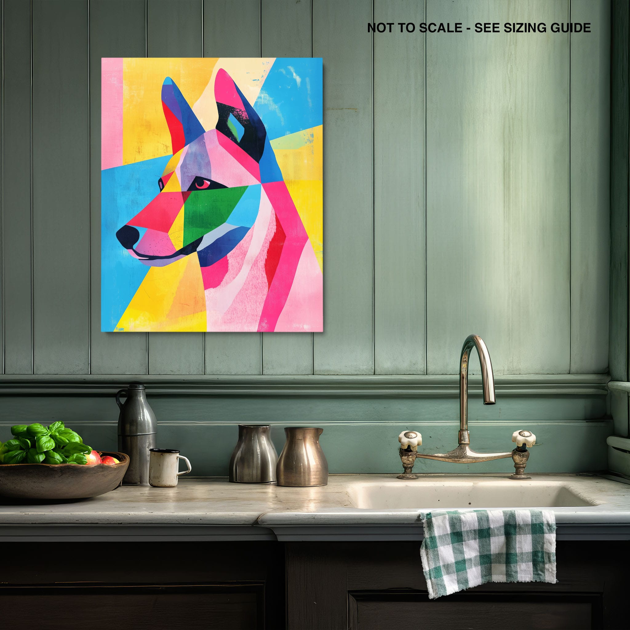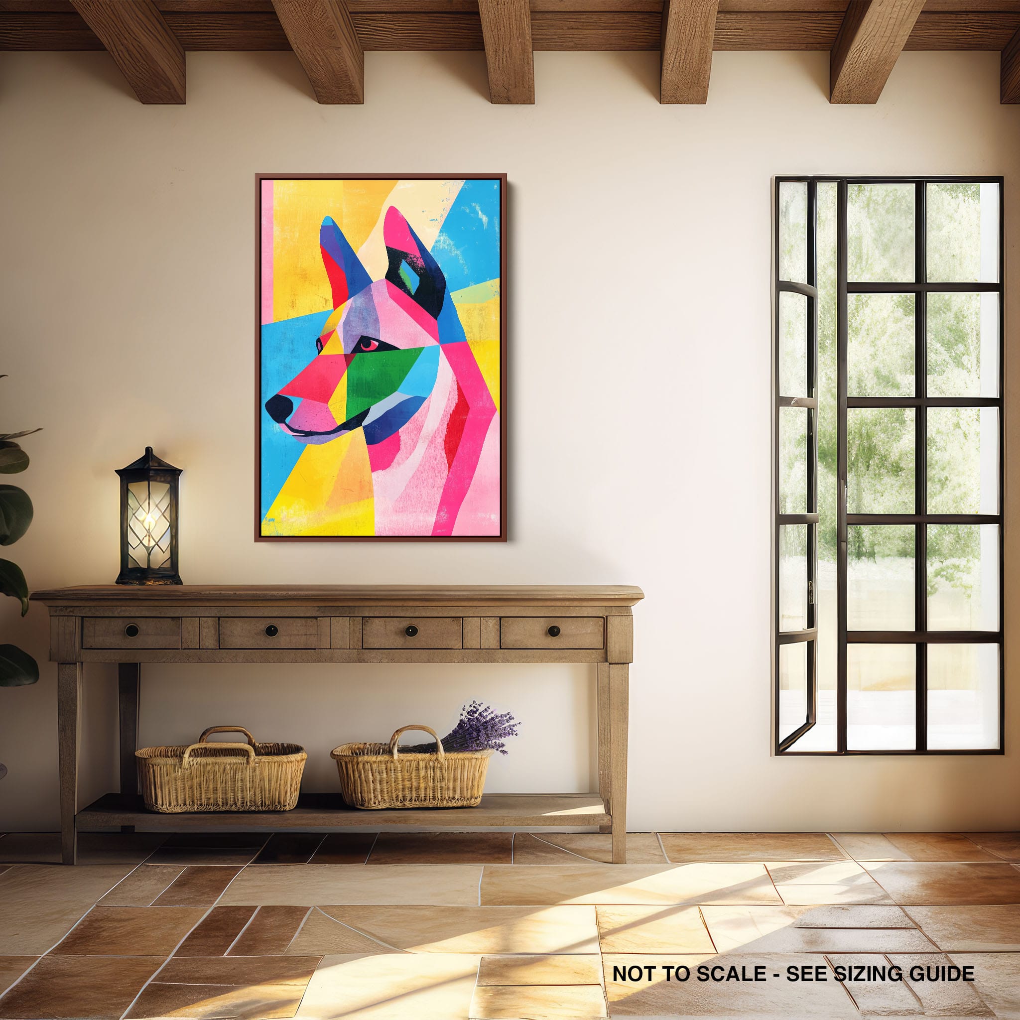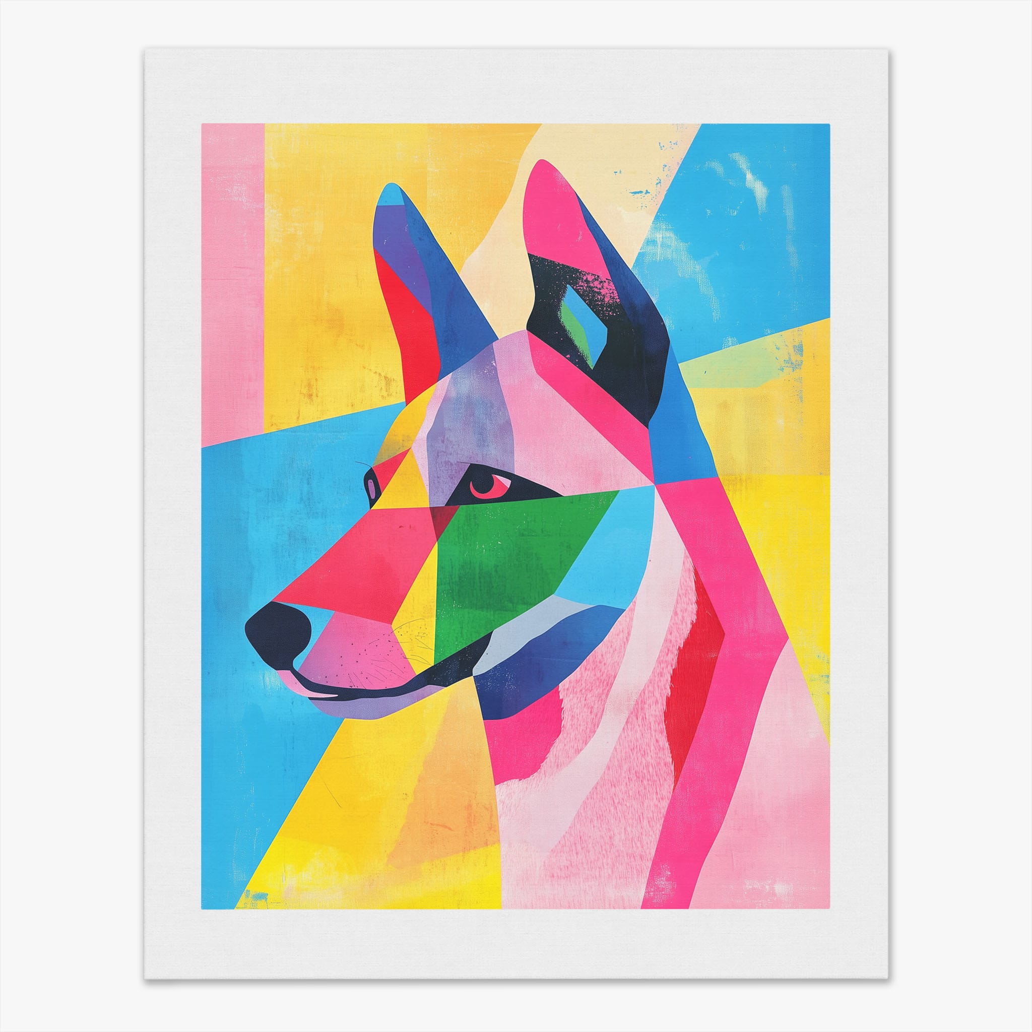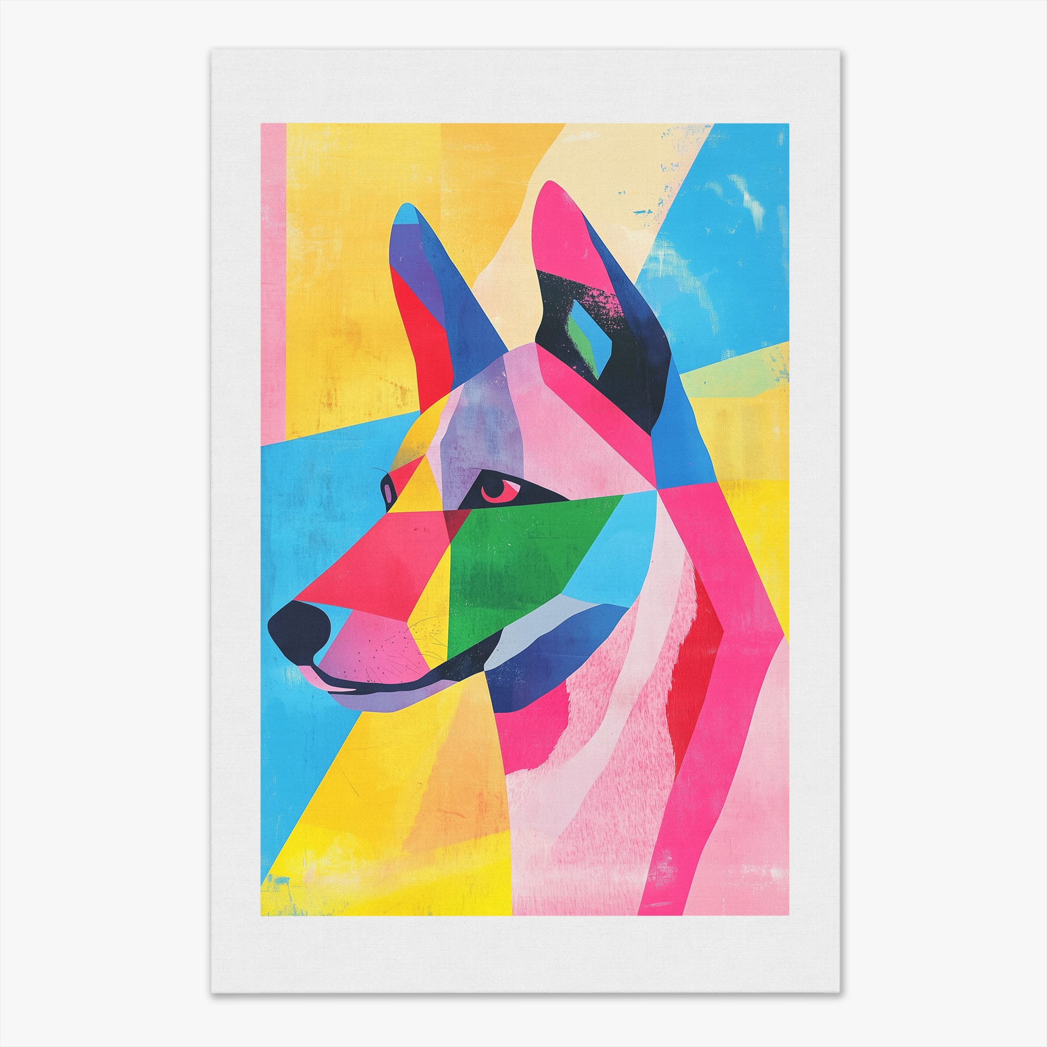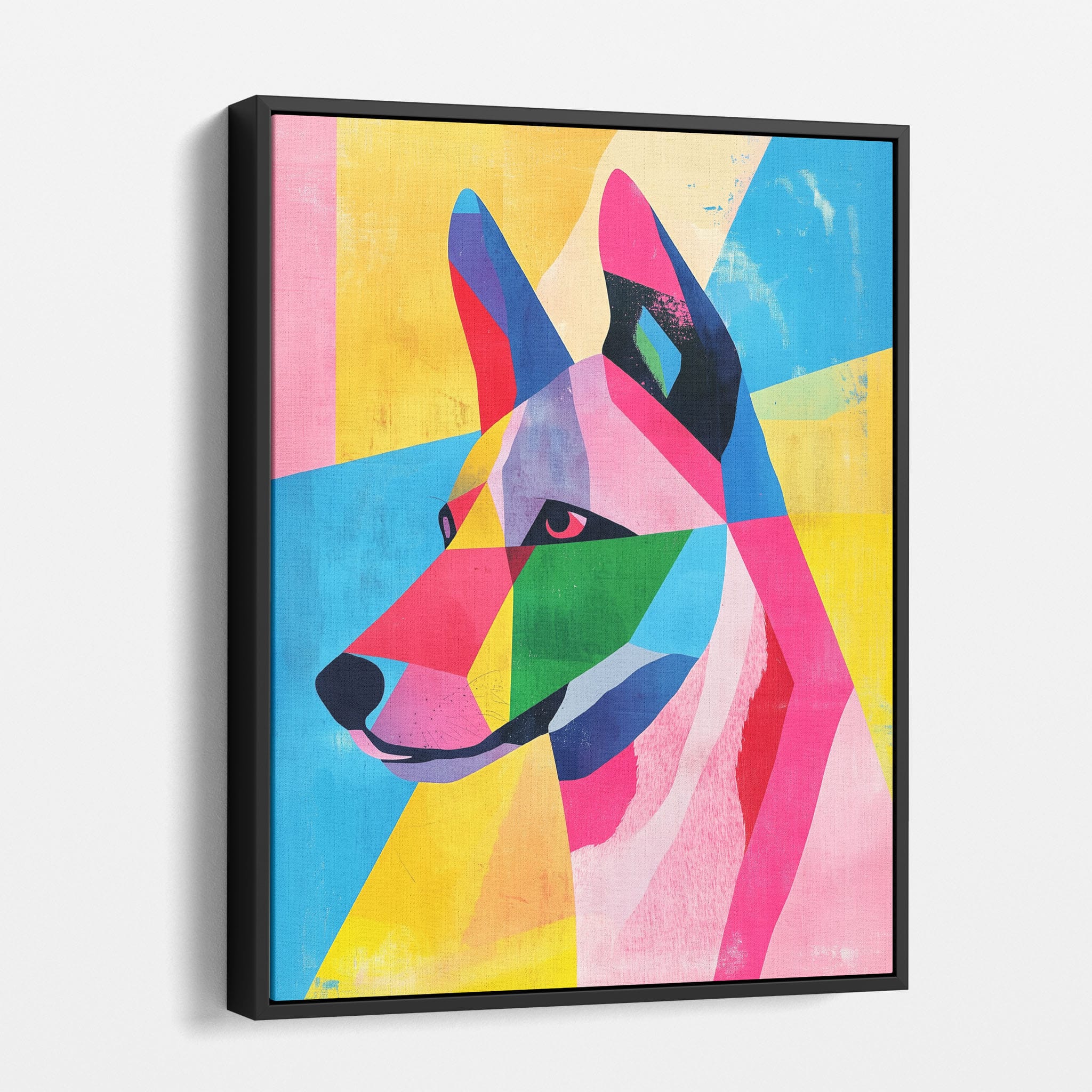 This art piece showcases a digital illustration of a dog, composed through a stunning array of geometric shapes and a vibrant color palette. Striking pink, blue, and yellow hues intersect to create a modern and eye-catching representation of man’s best friend. Its bold lines and sharp angles contrast beautifully, forming a dynamic composition that brings this contemporary canine portrait to life. Perfect for adding a splash of color and modernity to any room, this artwork is sure to appeal to animal lovers and fans of unique, digital artistry.