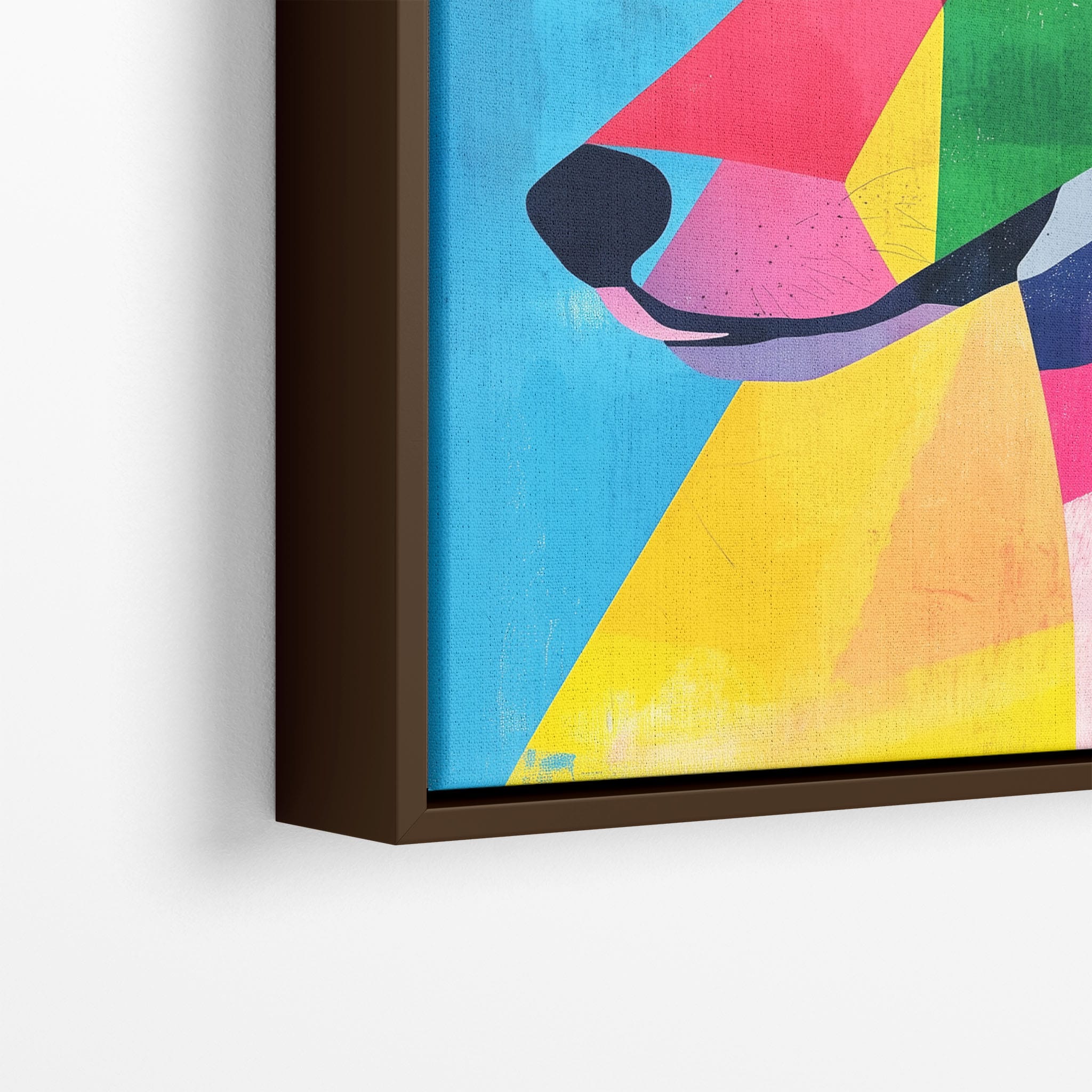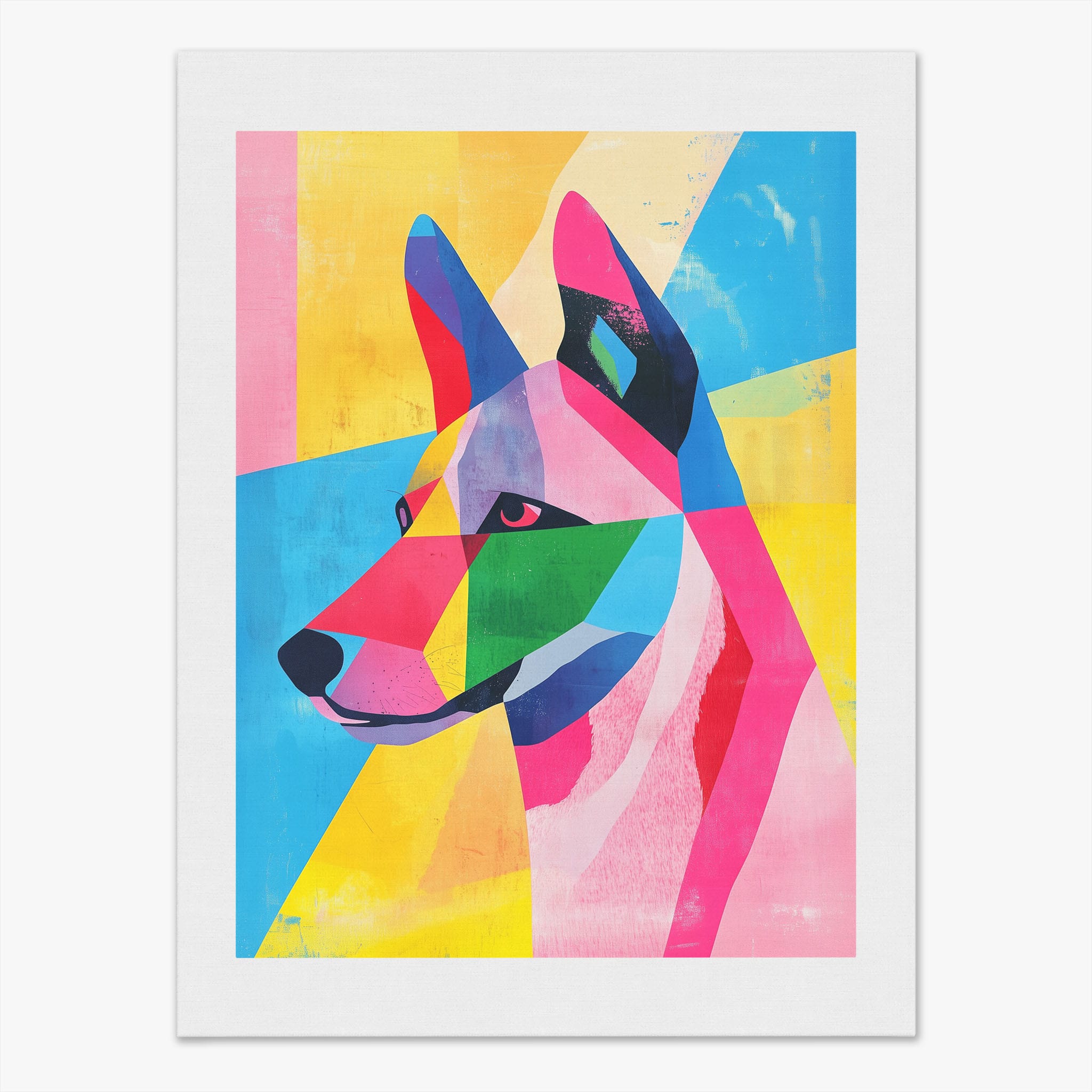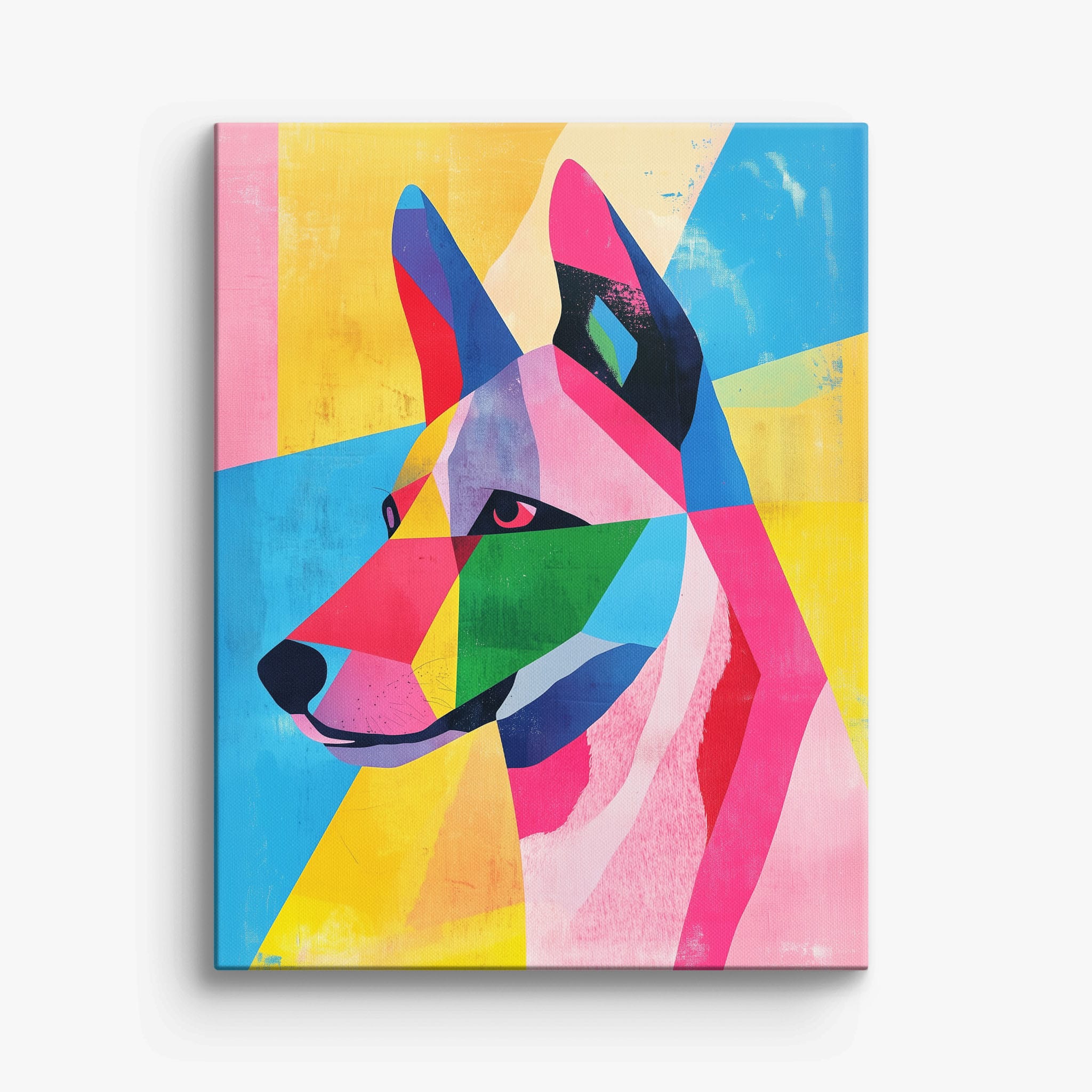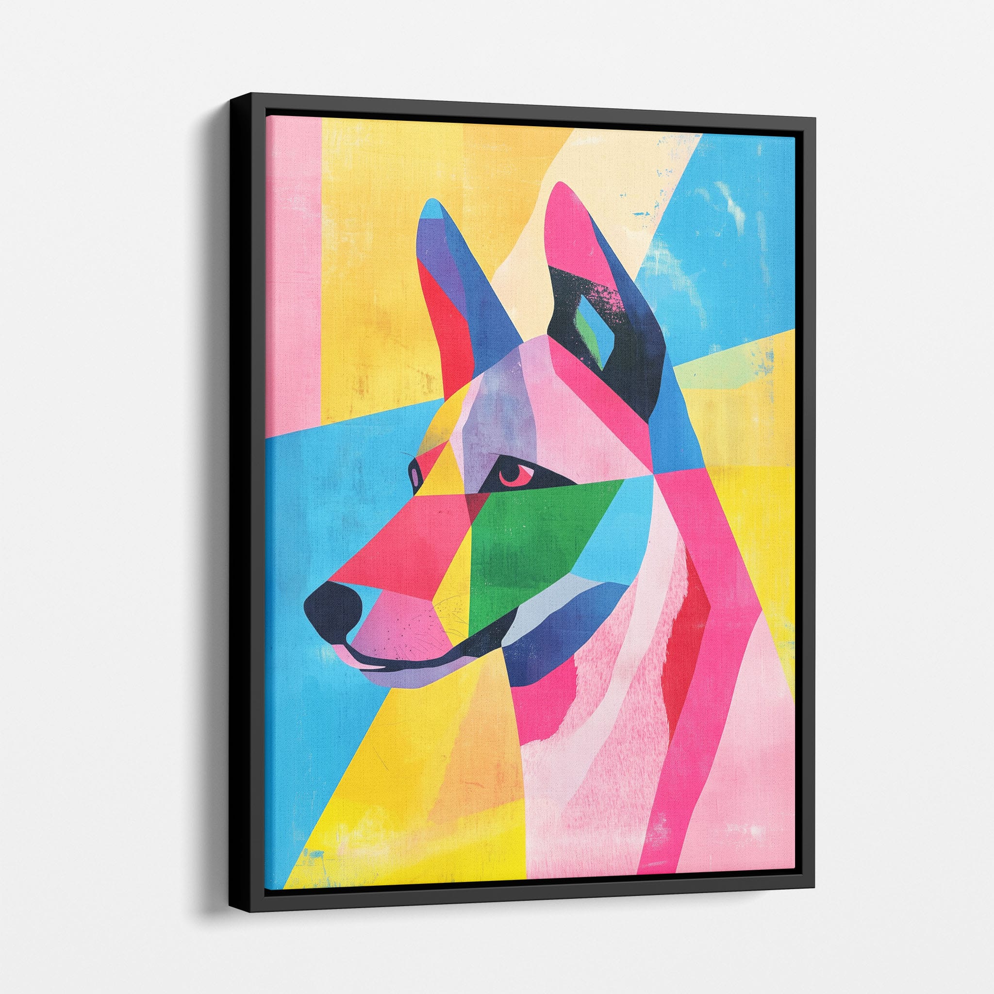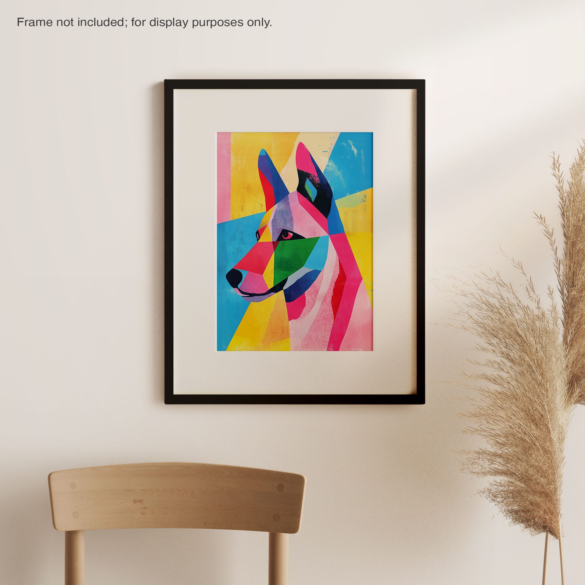 This art piece showcases a digital illustration of a dog, composed through a stunning array of geometric shapes and a vibrant color palette. Striking pink, blue, and yellow hues intersect to create a modern and eye-catching representation of man’s best friend. Its bold lines and sharp angles contrast beautifully, forming a dynamic composition that brings this contemporary canine portrait to life. Perfect for adding a splash of color and modernity to any room, this artwork is sure to appeal to animal lovers and fans of unique, digital artistry.