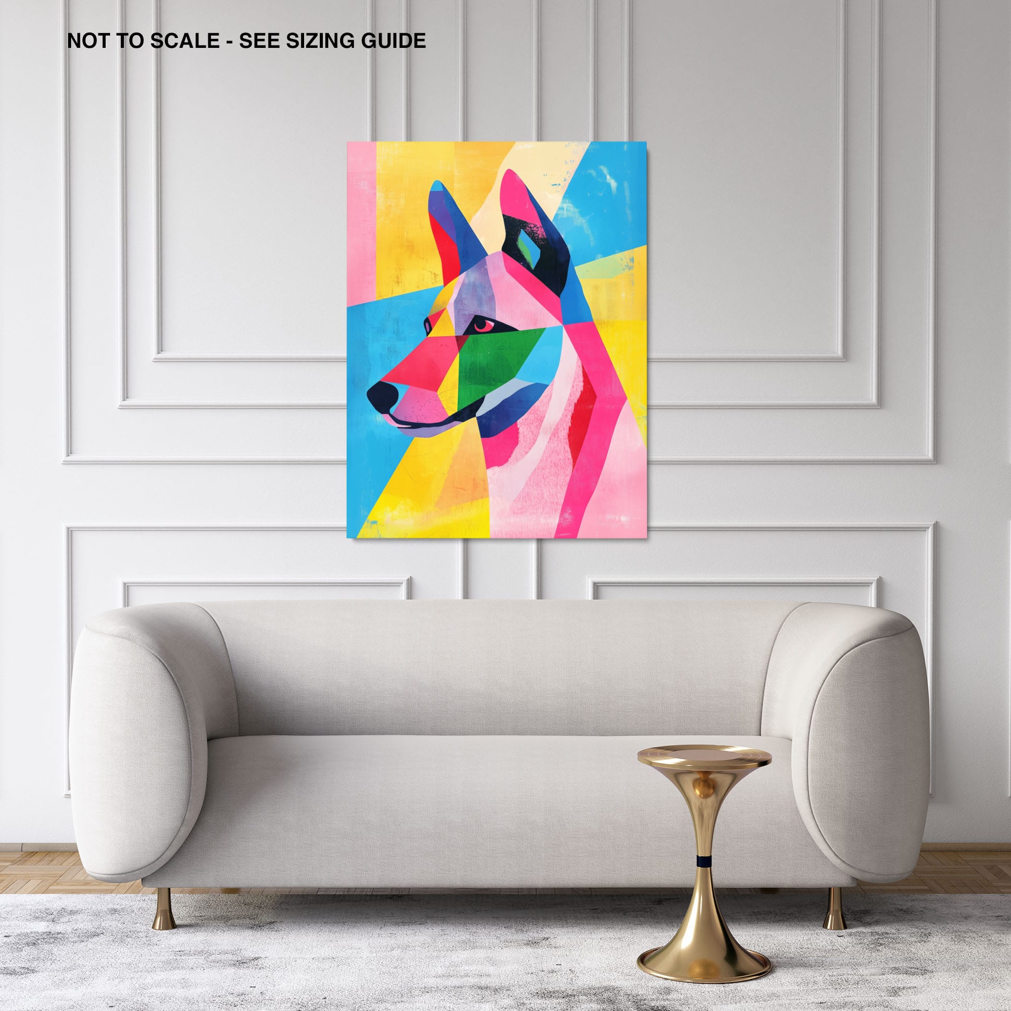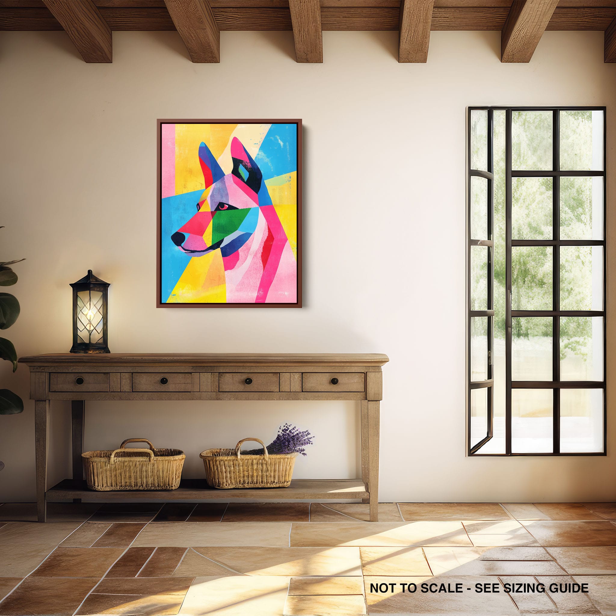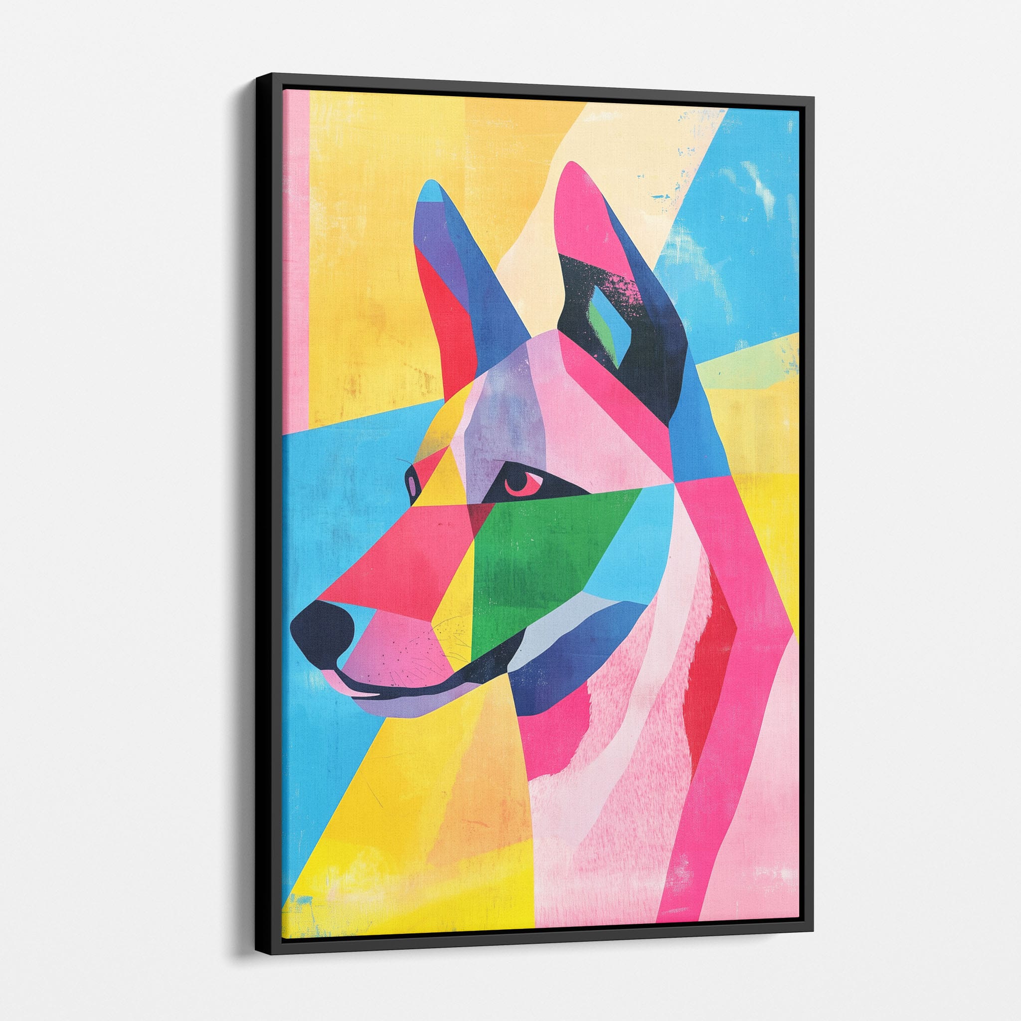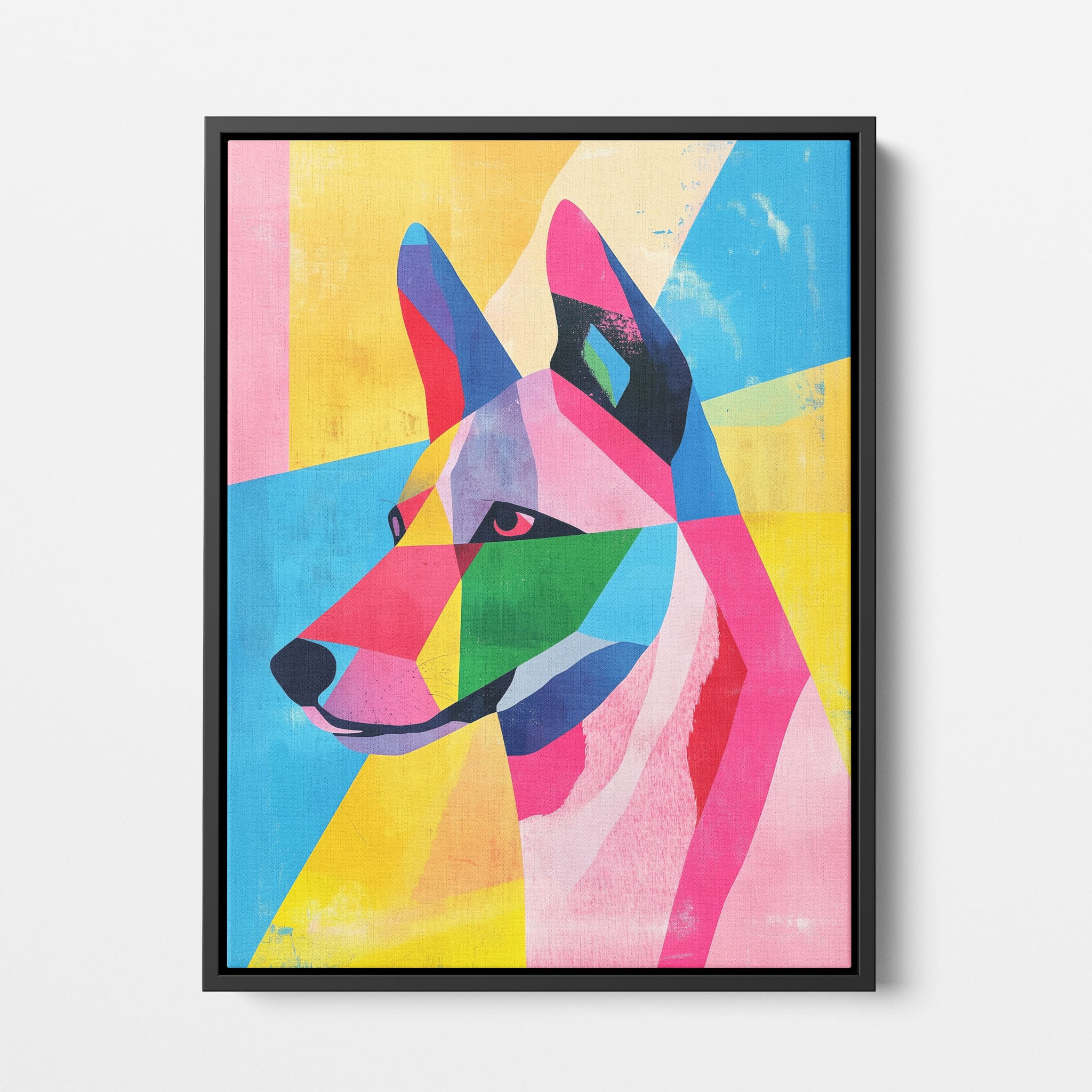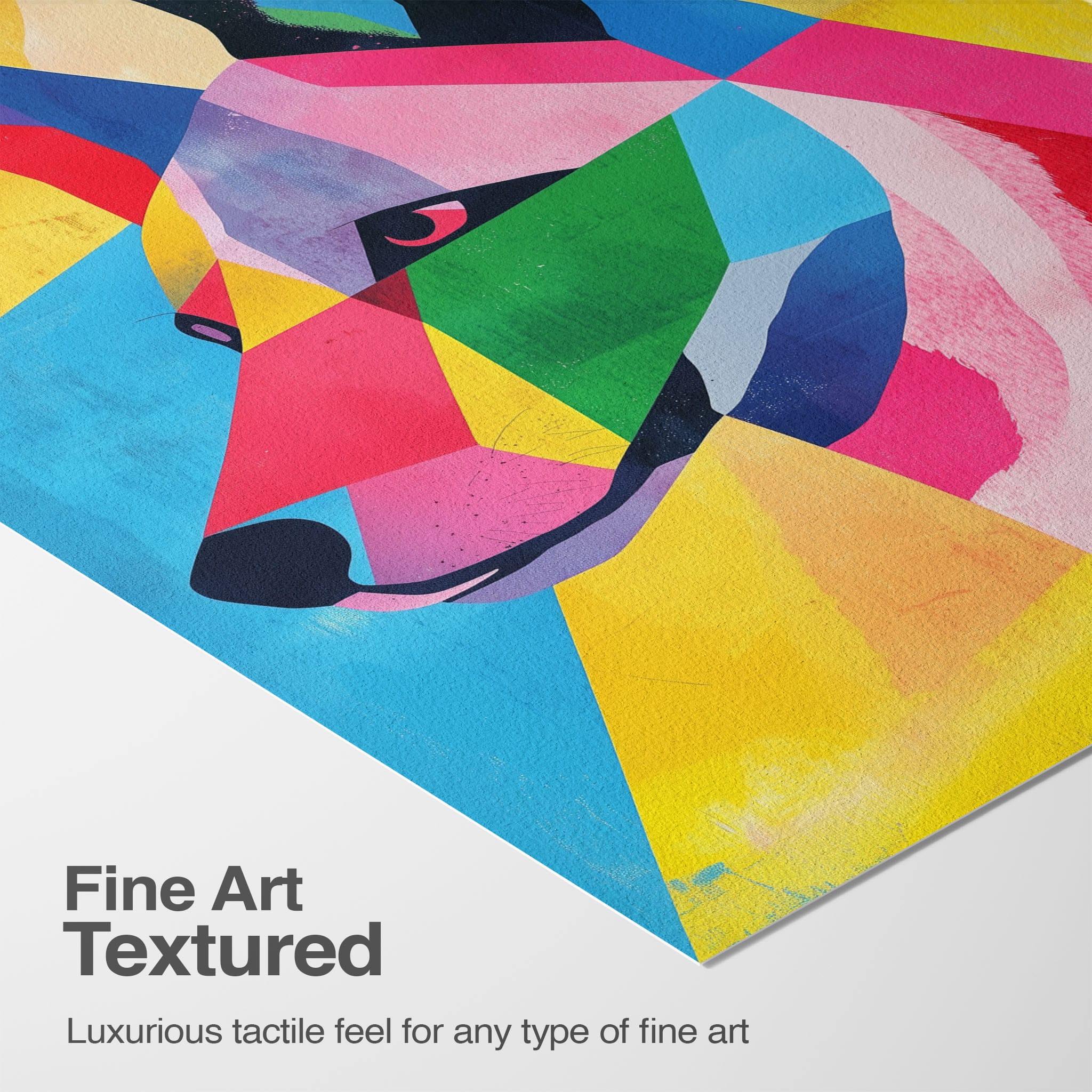 This art piece showcases a digital illustration of a dog, composed through a stunning array of geometric shapes and a vibrant color palette. Striking pink, blue, and yellow hues intersect to create a modern and eye-catching representation of man’s best friend. Its bold lines and sharp angles contrast beautifully, forming a dynamic composition that brings this contemporary canine portrait to life. Perfect for adding a splash of color and modernity to any room, this artwork is sure to appeal to animal lovers and fans of unique, digital artistry.