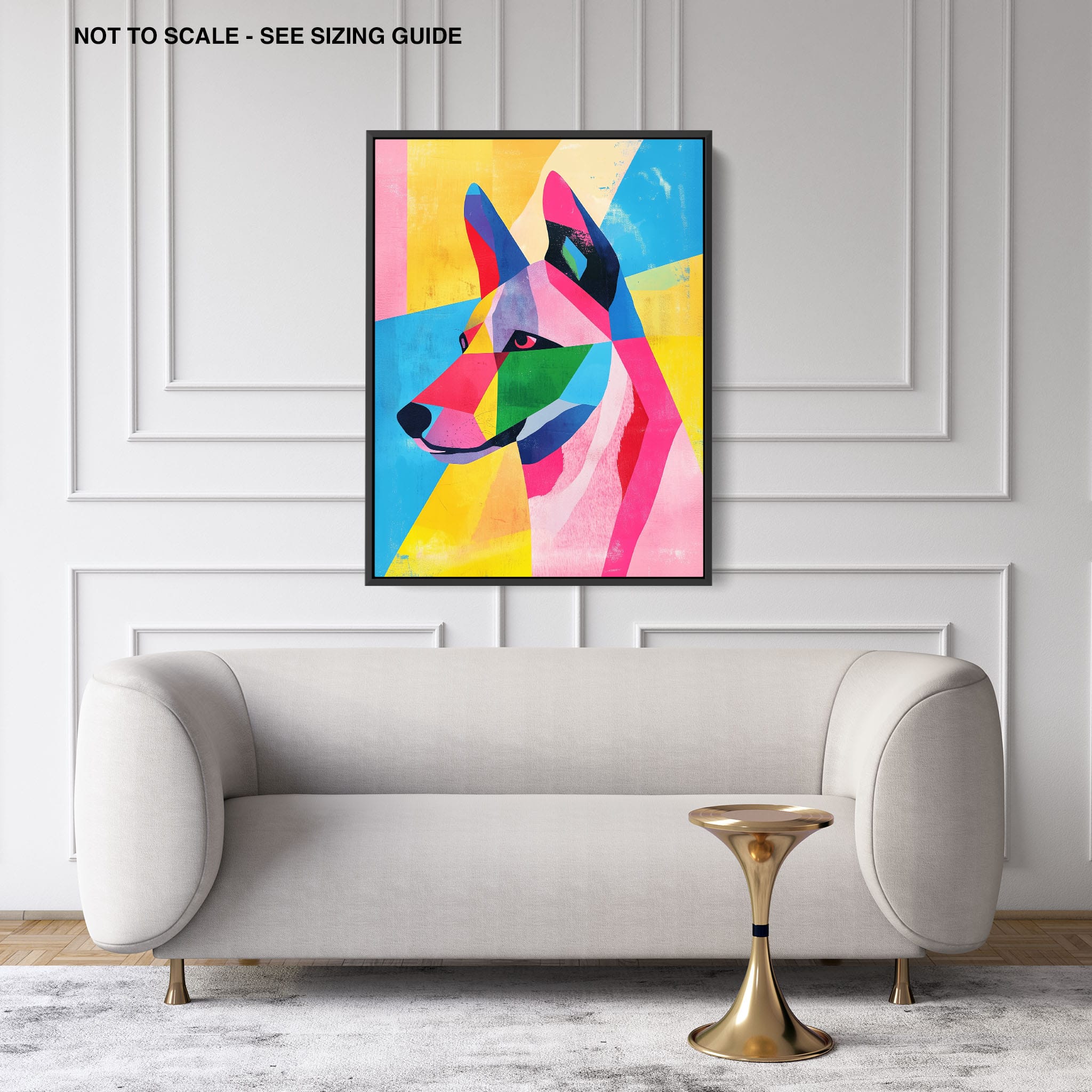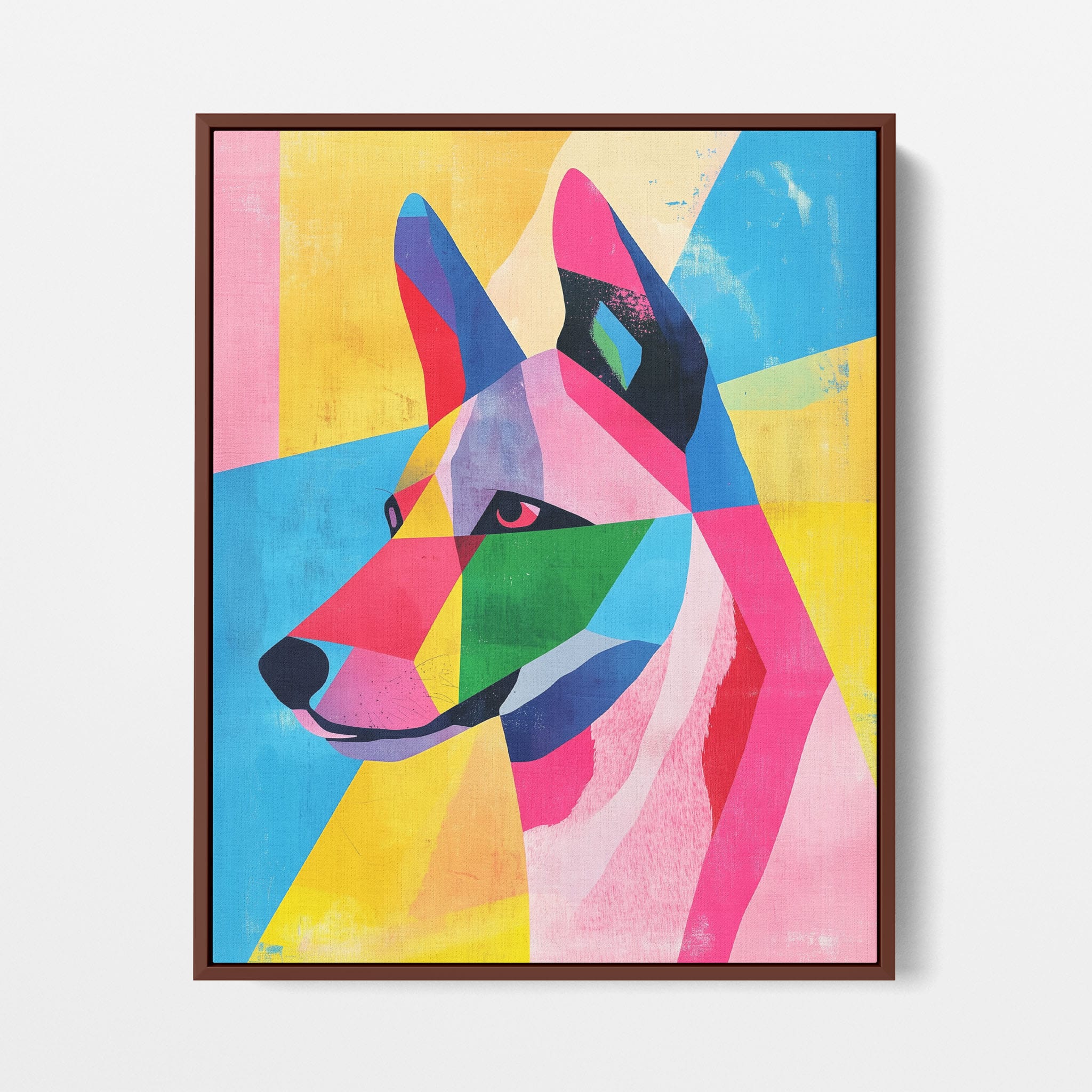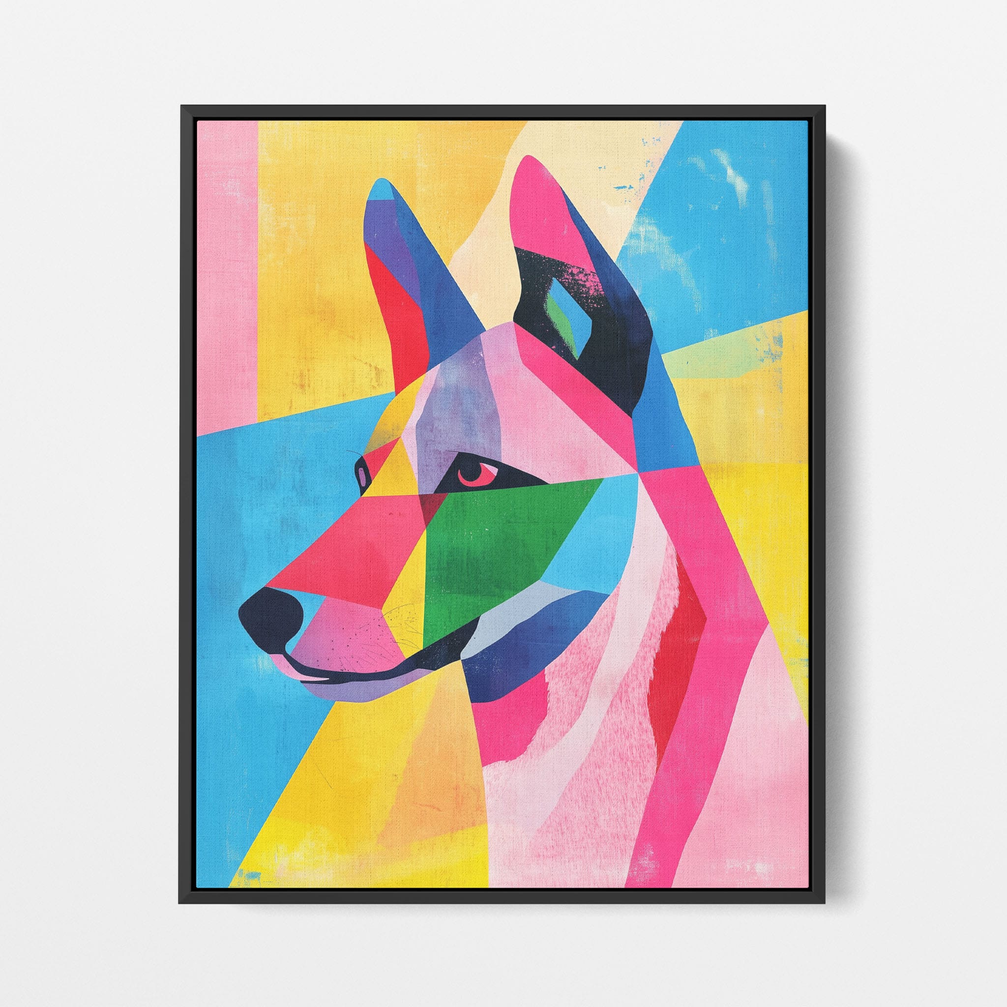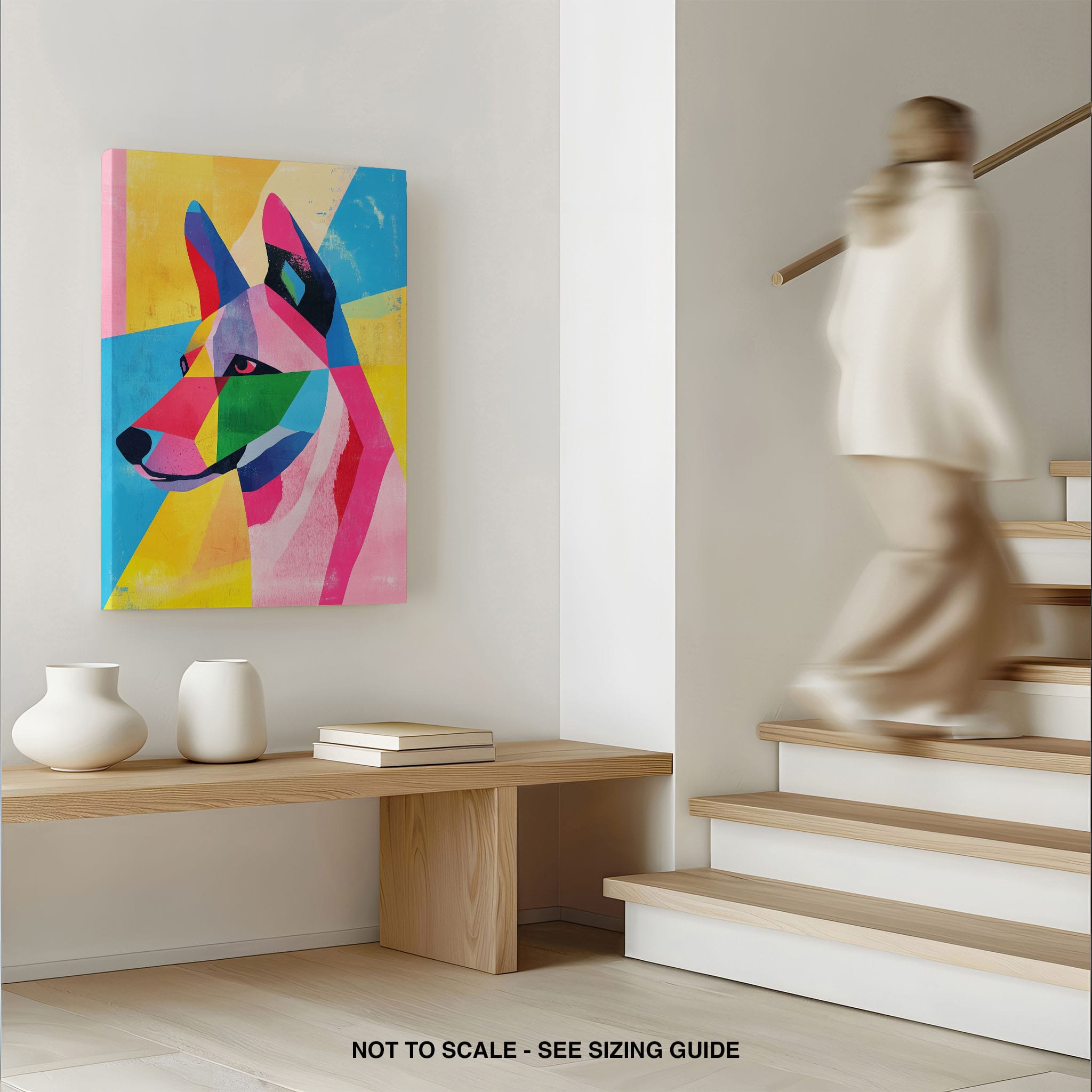 This art piece showcases a digital illustration of a dog, composed through a stunning array of geometric shapes and a vibrant color palette. Striking pink, blue, and yellow hues intersect to create a modern and eye-catching representation of man’s best friend. Its bold lines and sharp angles contrast beautifully, forming a dynamic composition that brings this contemporary canine portrait to life. Perfect for adding a splash of color and modernity to any room, this artwork is sure to appeal to animal lovers and fans of unique, digital artistry.