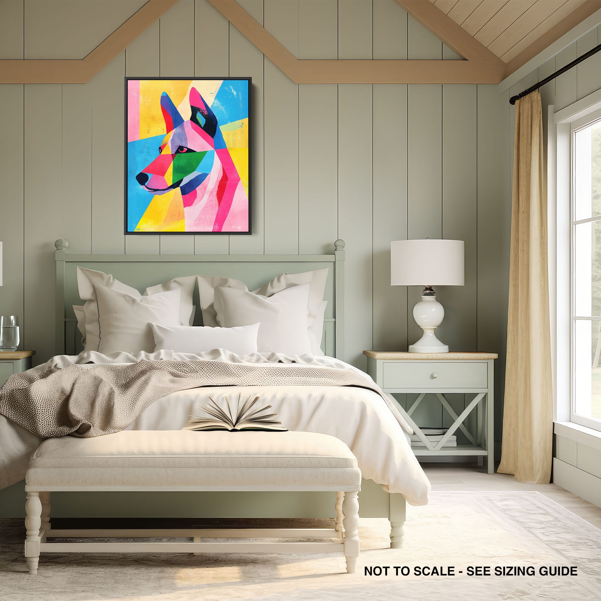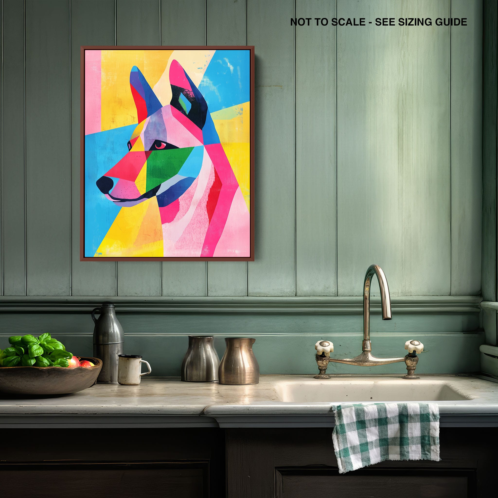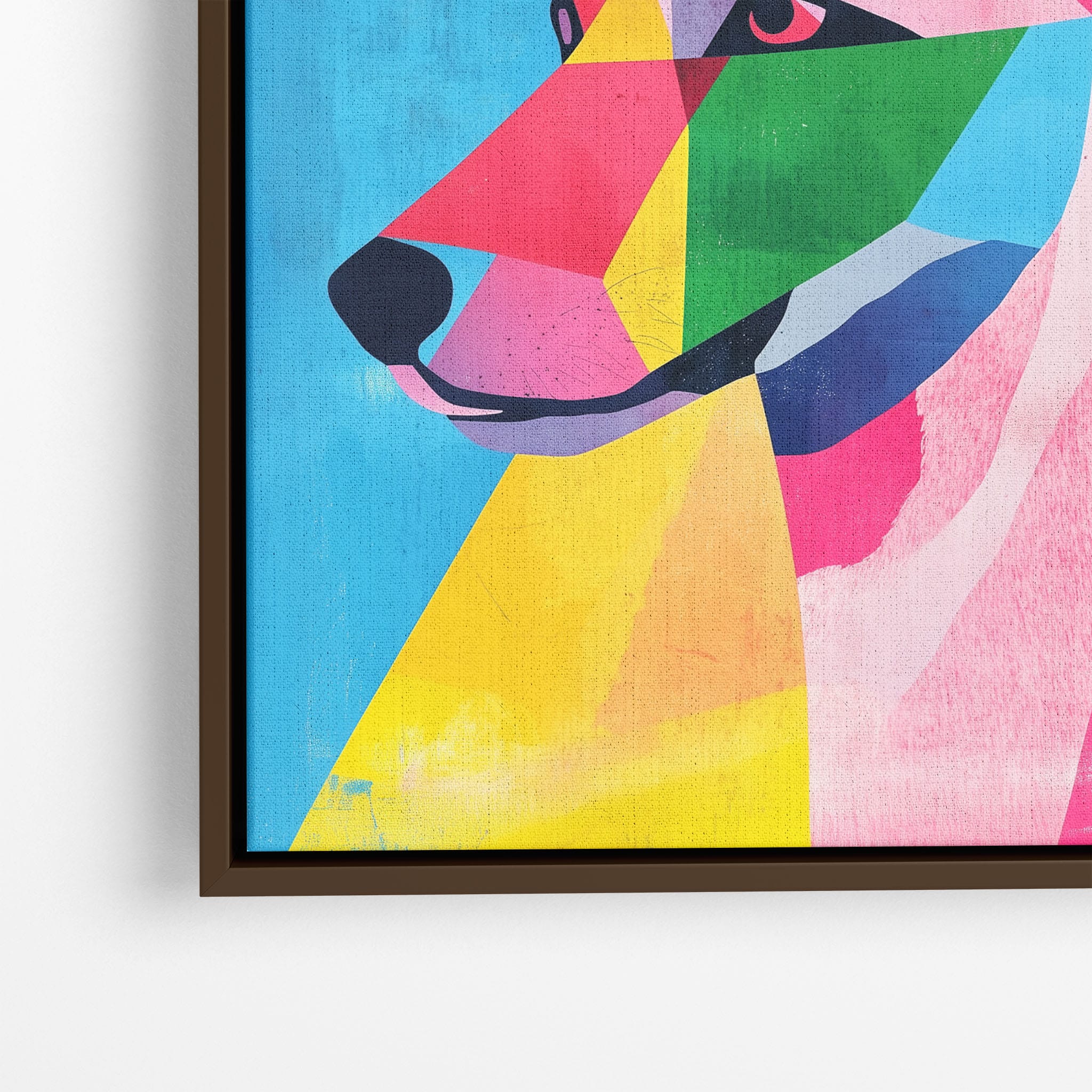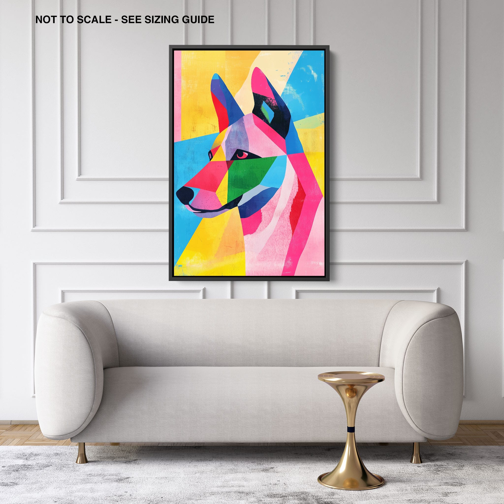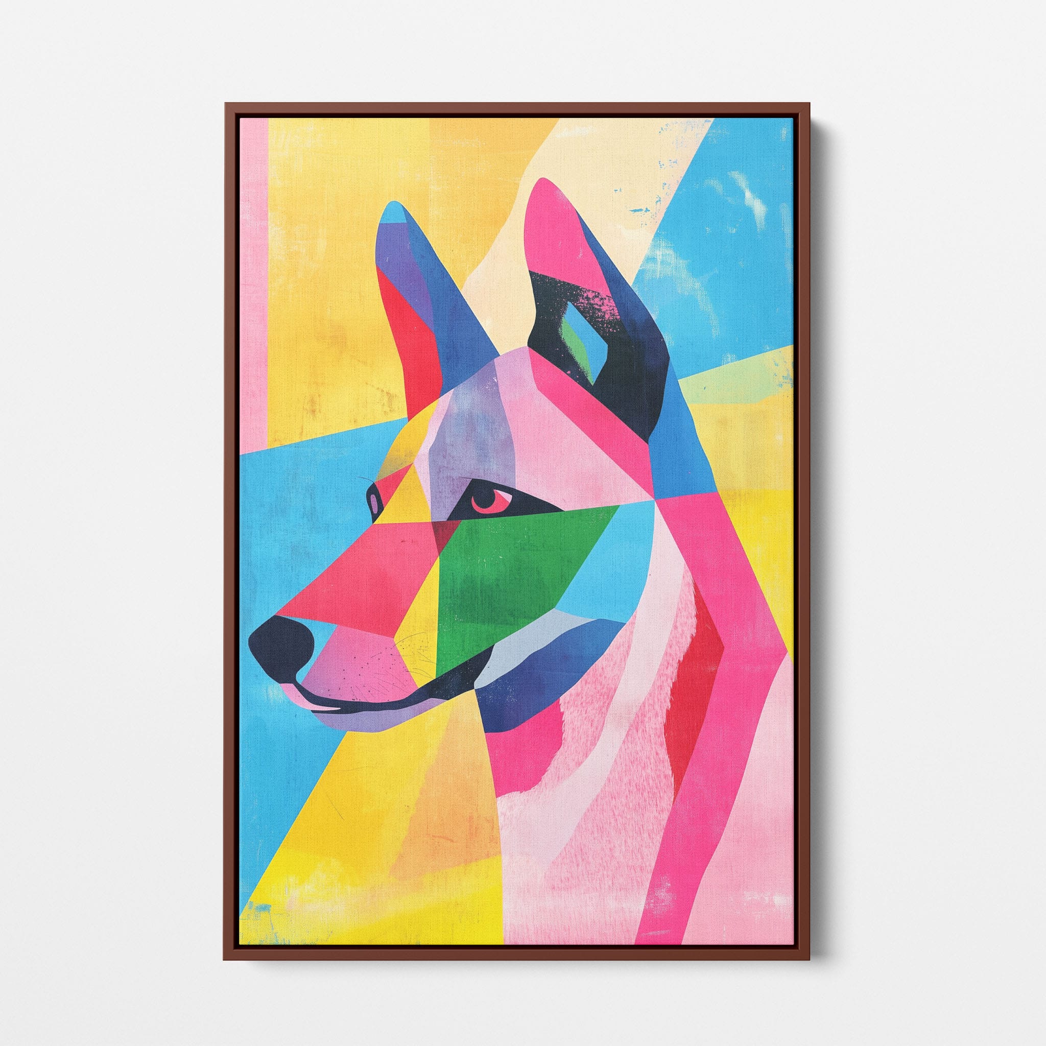 This art piece showcases a digital illustration of a dog, composed through a stunning array of geometric shapes and a vibrant color palette. Striking pink, blue, and yellow hues intersect to create a modern and eye-catching representation of man’s best friend. Its bold lines and sharp angles contrast beautifully, forming a dynamic composition that brings this contemporary canine portrait to life. Perfect for adding a splash of color and modernity to any room, this artwork is sure to appeal to animal lovers and fans of unique, digital artistry.