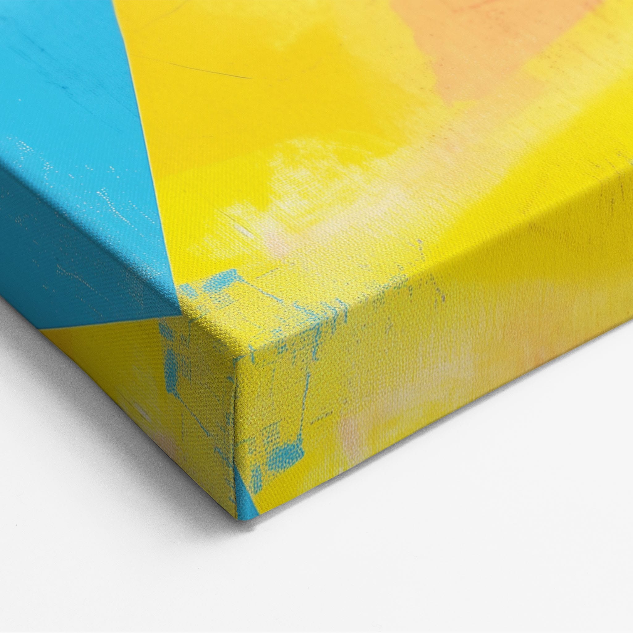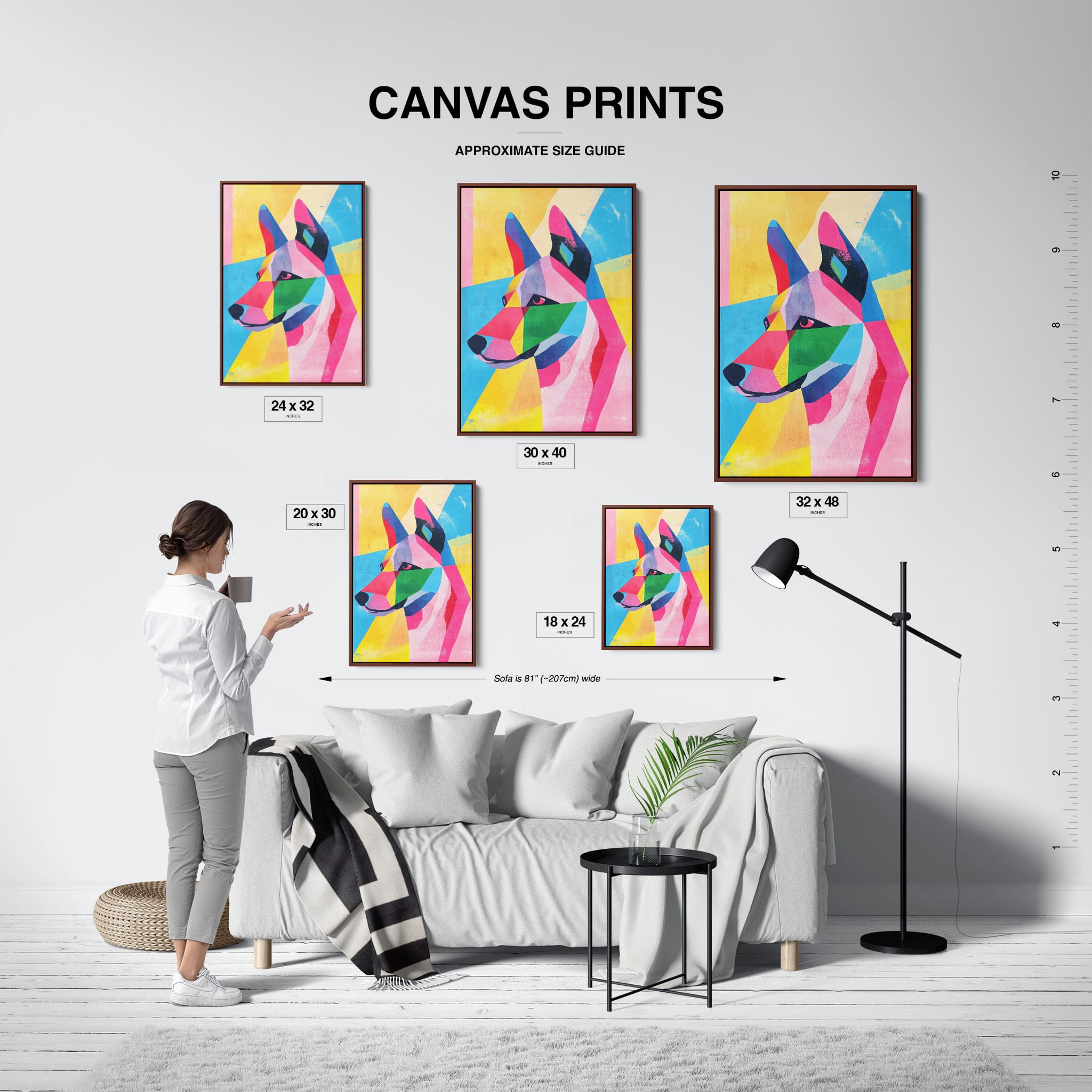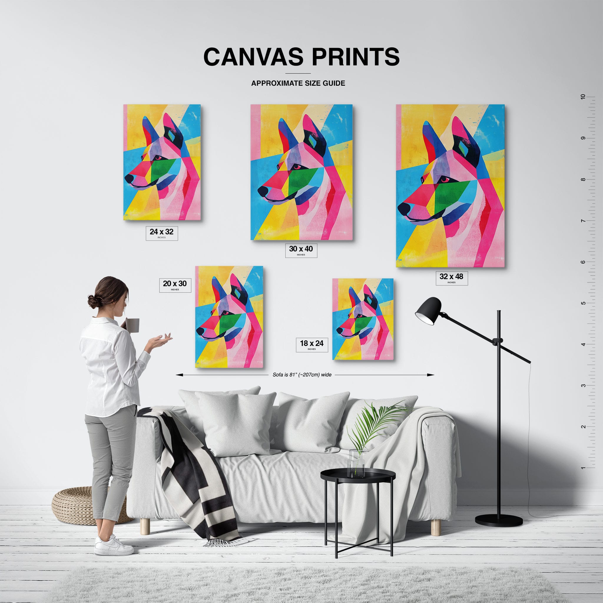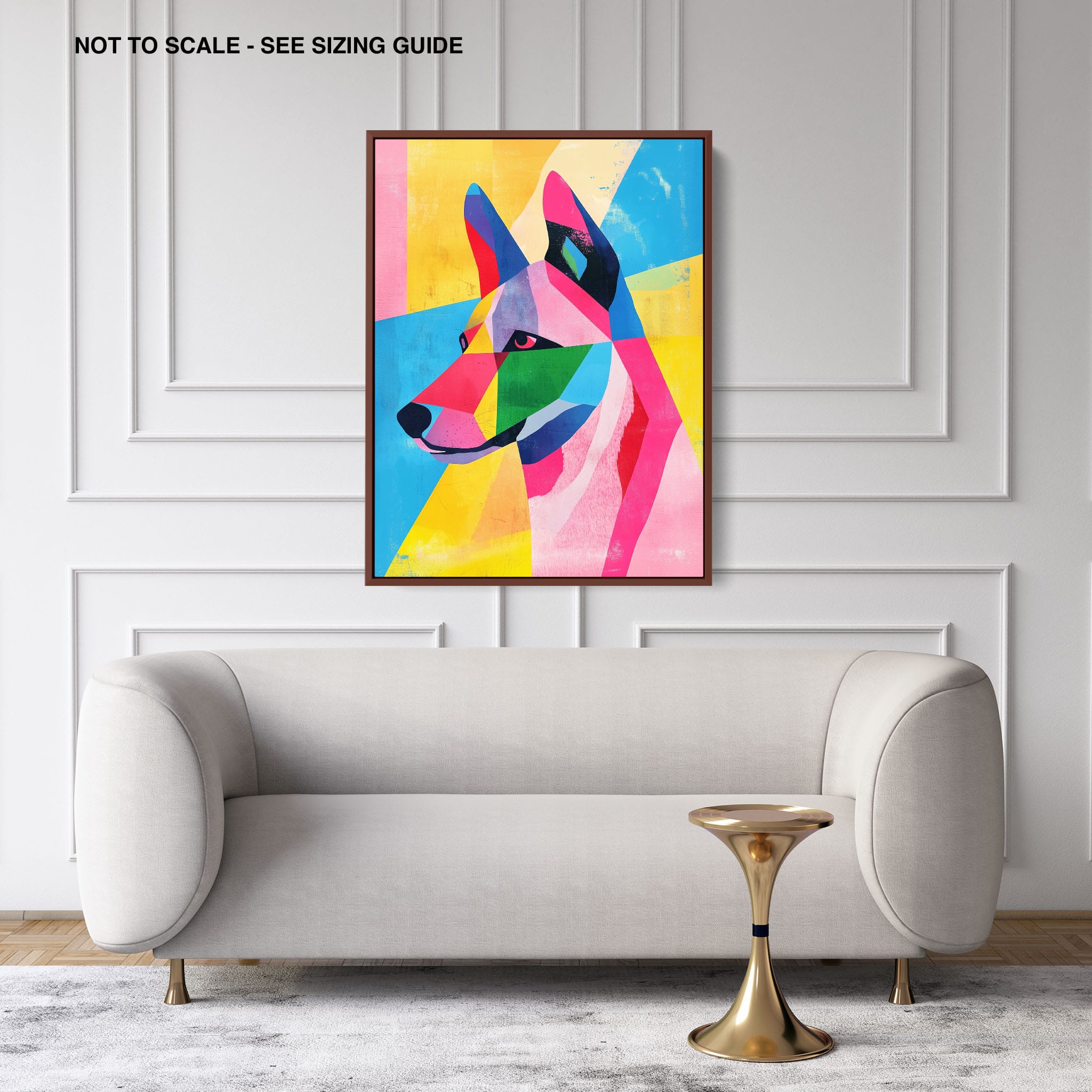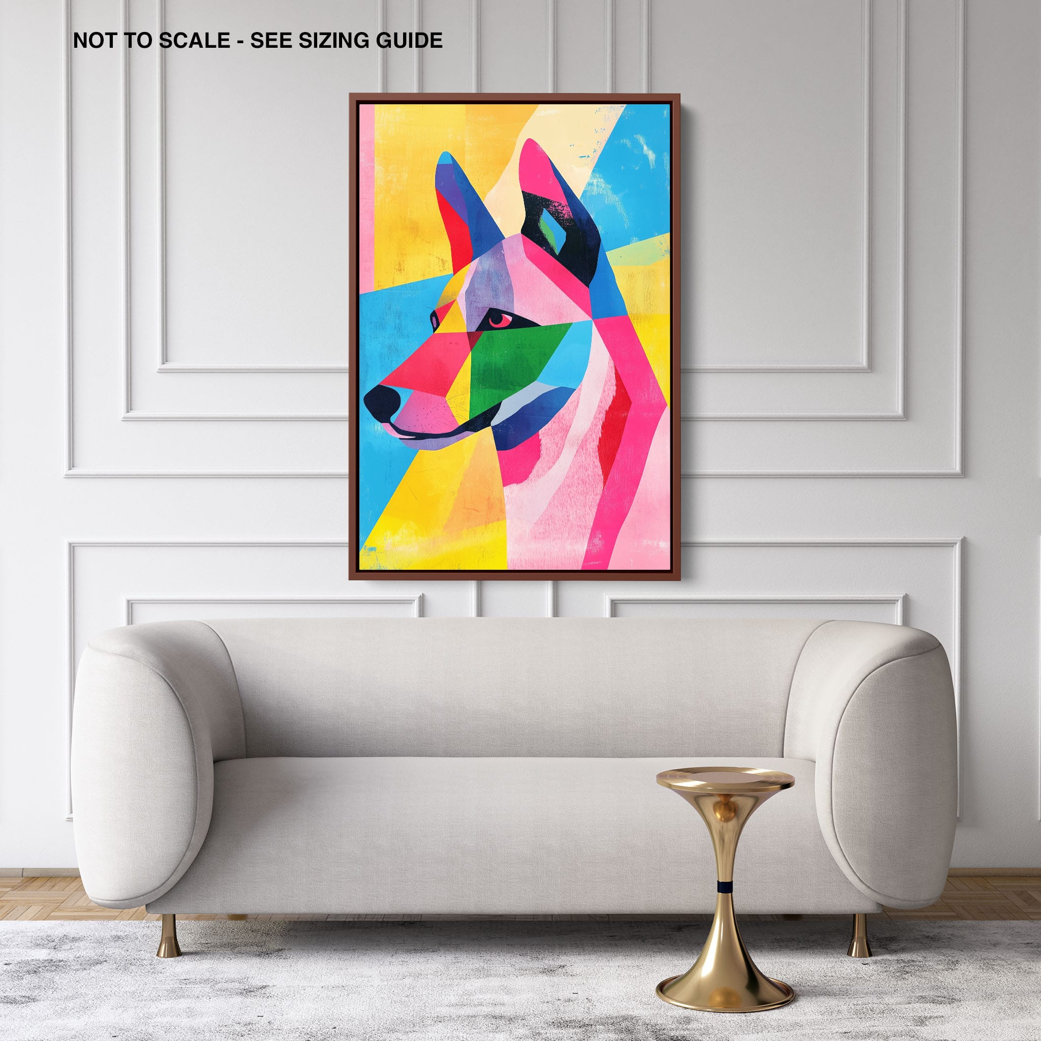 This art piece showcases a digital illustration of a dog, composed through a stunning array of geometric shapes and a vibrant color palette. Striking pink, blue, and yellow hues intersect to create a modern and eye-catching representation of man’s best friend. Its bold lines and sharp angles contrast beautifully, forming a dynamic composition that brings this contemporary canine portrait to life. Perfect for adding a splash of color and modernity to any room, this artwork is sure to appeal to animal lovers and fans of unique, digital artistry.