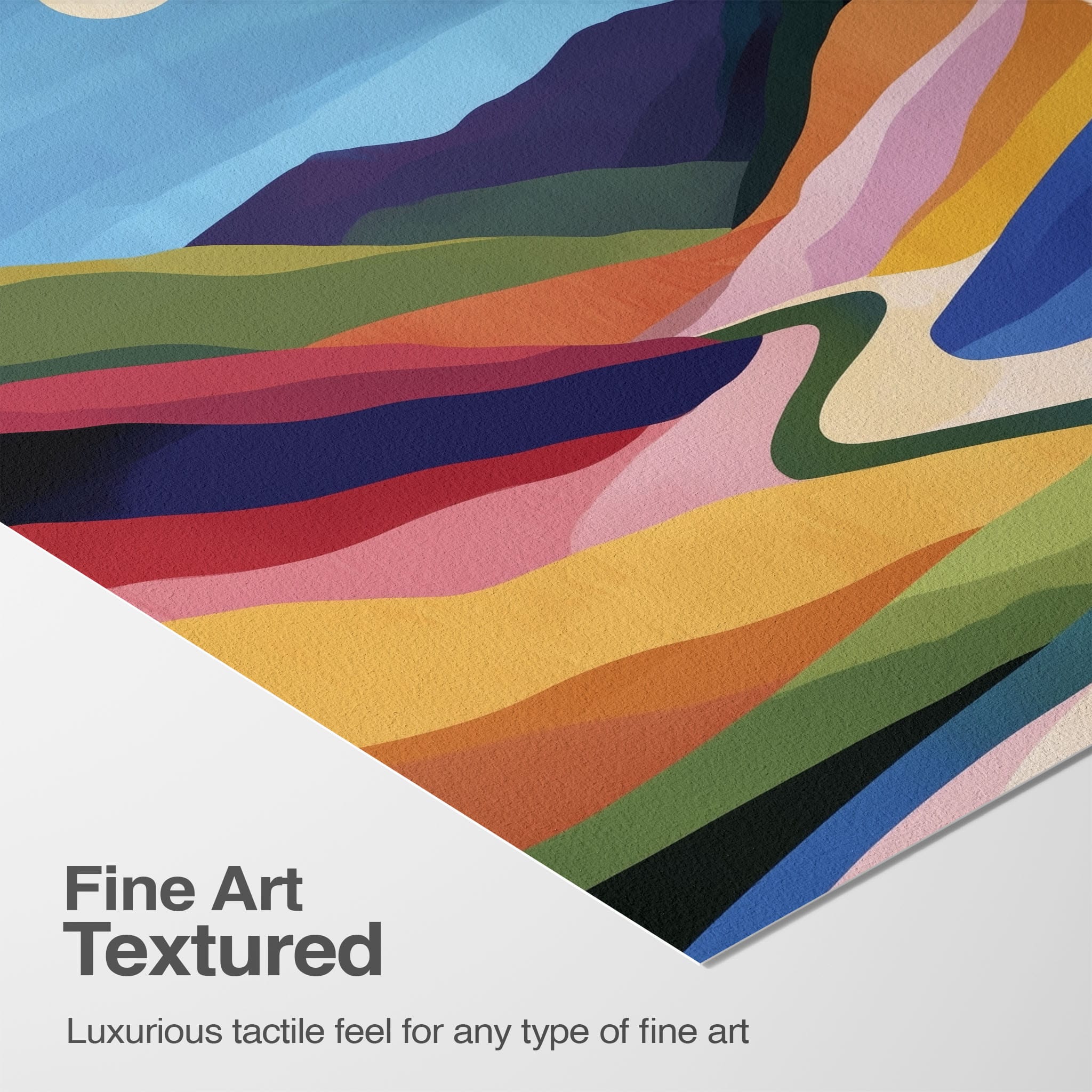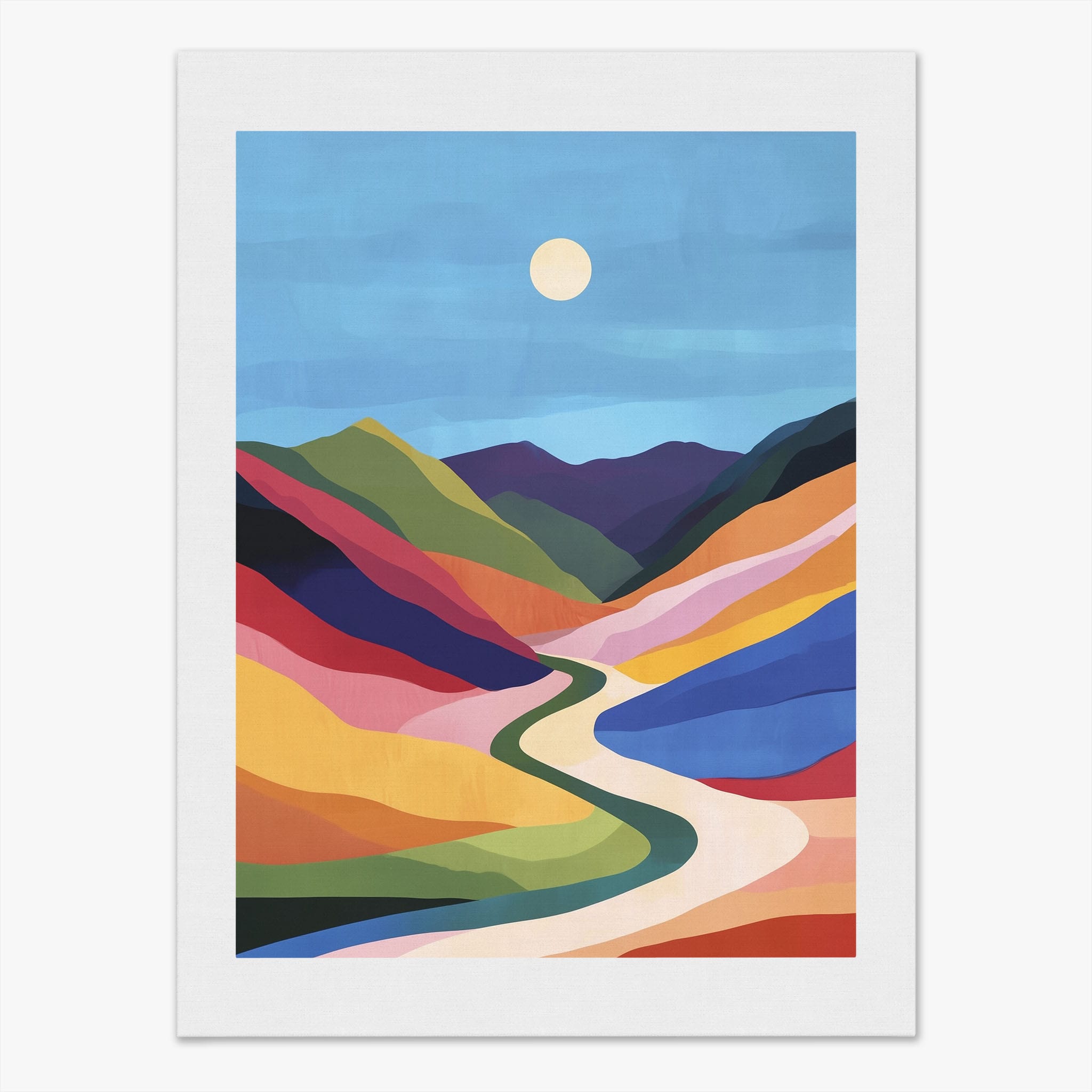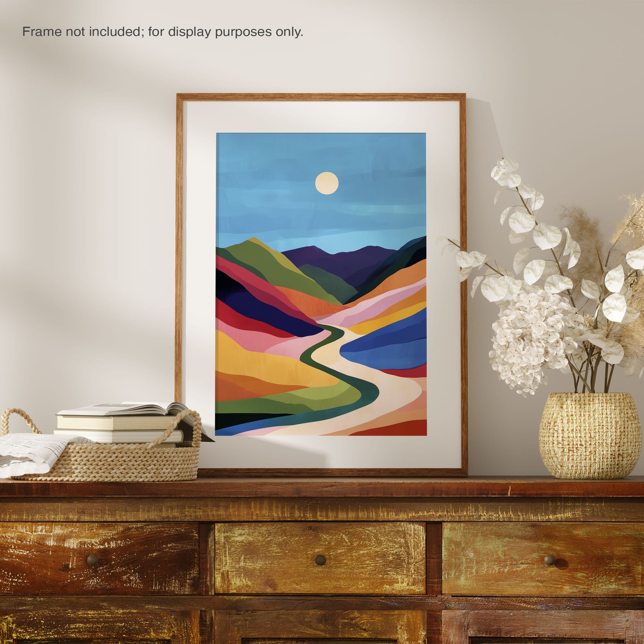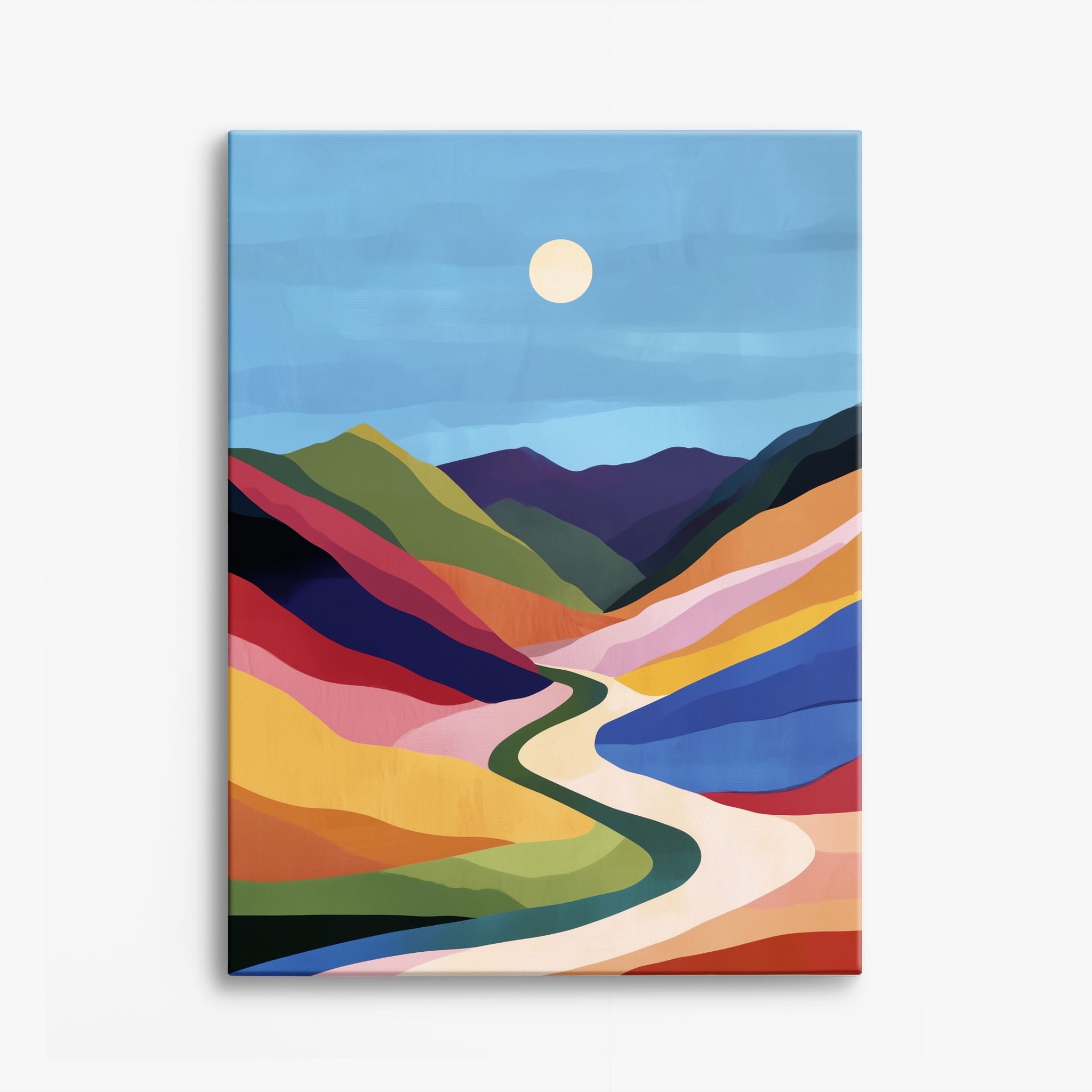 Behold the striking elegance of Vibrant Serenity of Geometric Hills, a digital illustration showcasing an array of bold, contrasting colors and smooth geometric shapes forming mesmerizing hills and valleys. The juxtaposition of the crisp undulating lines against the muted blue, serene backdrop alludes to both modern and minimalist influences, creating an atmosphere of calm and contemplation. This artwork is an ideal choice for contemporary spaces, inviting viewers to lose themselves in its simplistic yet profound beauty. Perfect for those looking to add a touch of color and modern design to their home or office.
