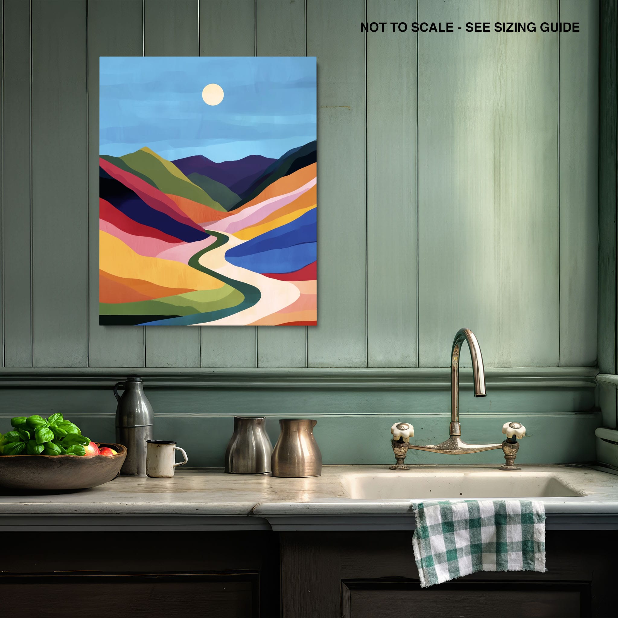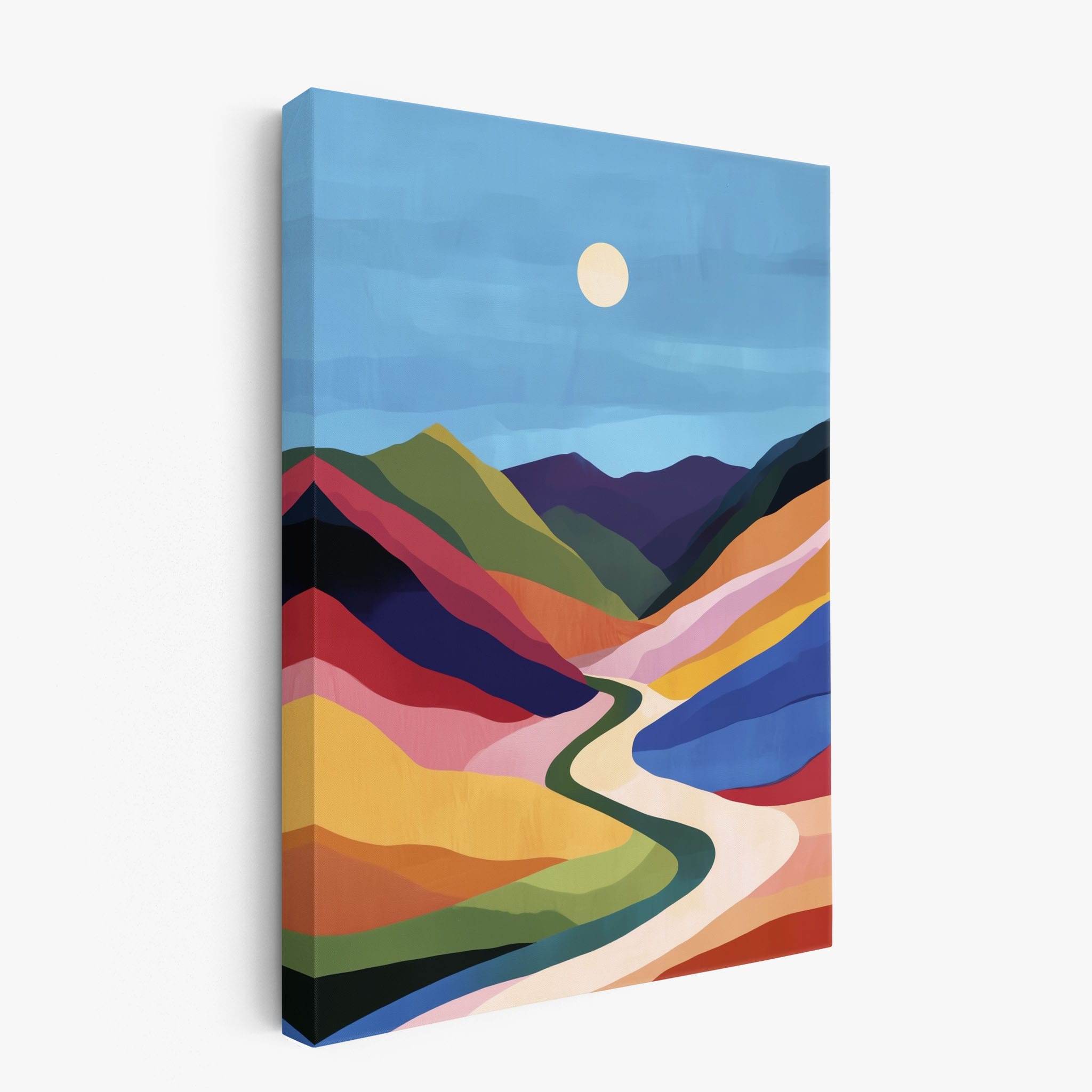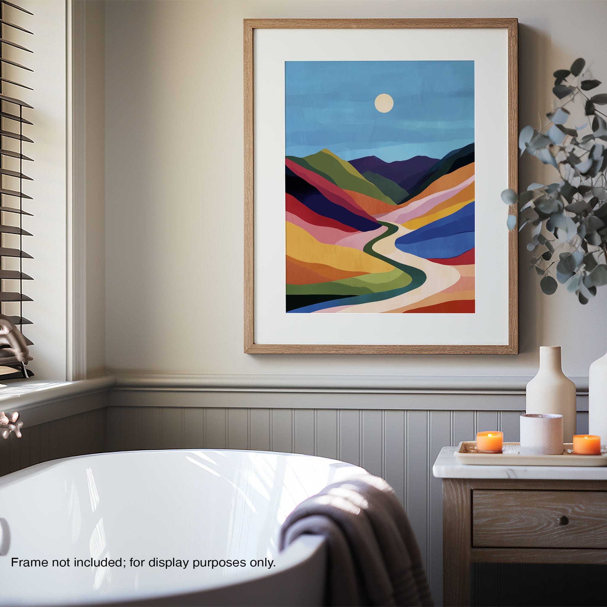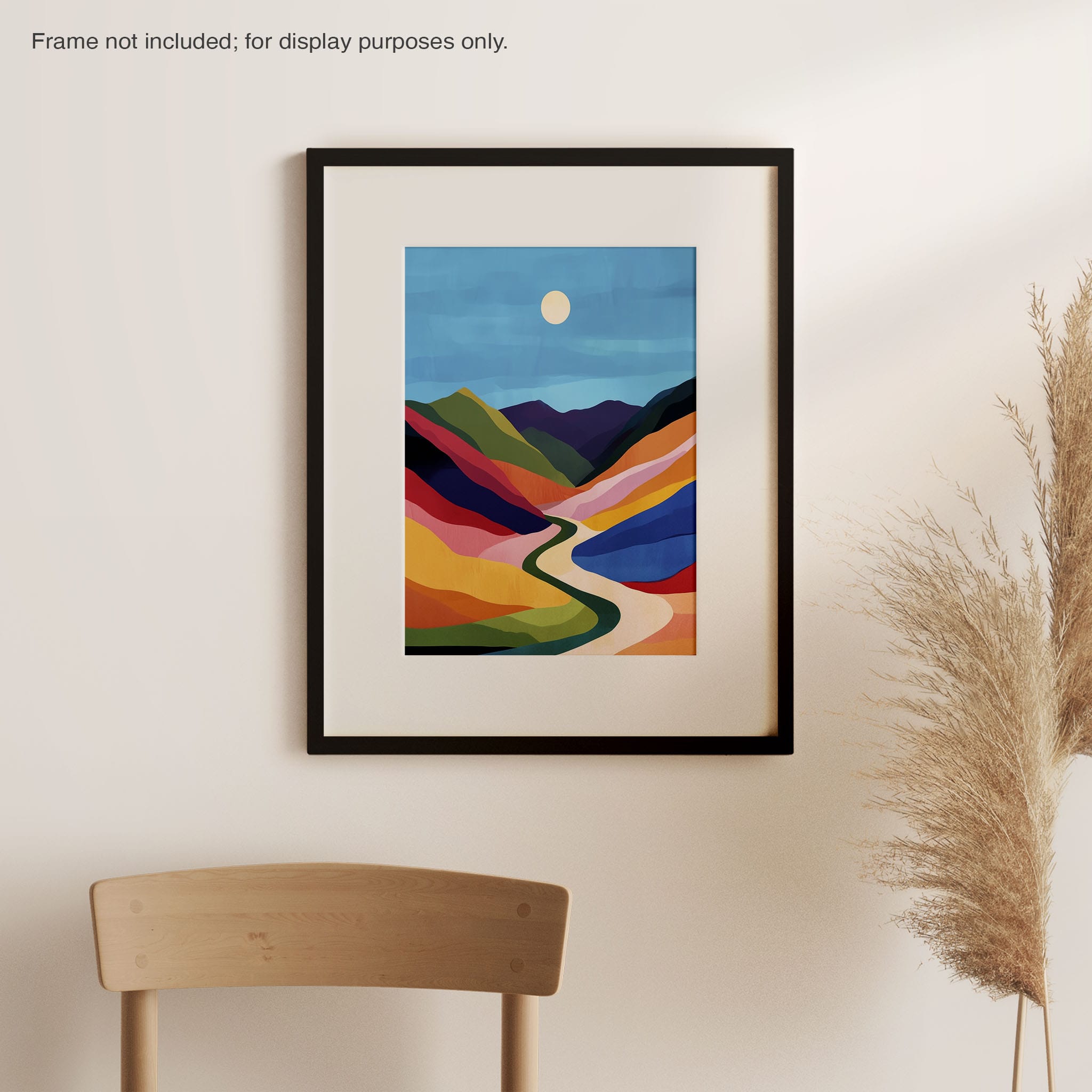 Behold the striking elegance of Vibrant Serenity of Geometric Hills, a digital illustration showcasing an array of bold, contrasting colors and smooth geometric shapes forming mesmerizing hills and valleys. The juxtaposition of the crisp undulating lines against the muted blue, serene backdrop alludes to both modern and minimalist influences, creating an atmosphere of calm and contemplation. This artwork is an ideal choice for contemporary spaces, inviting viewers to lose themselves in its simplistic yet profound beauty. Perfect for those looking to add a touch of color and modern design to their home or office.