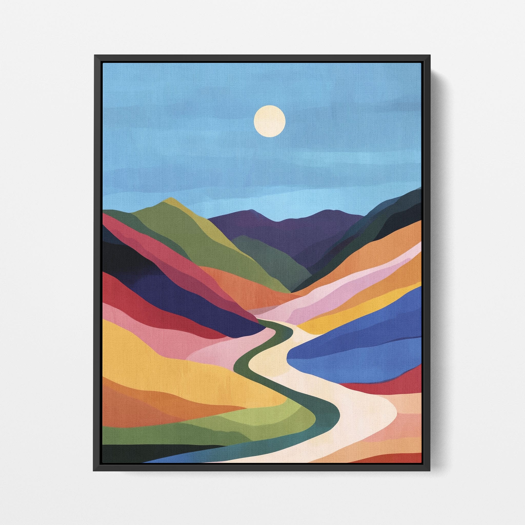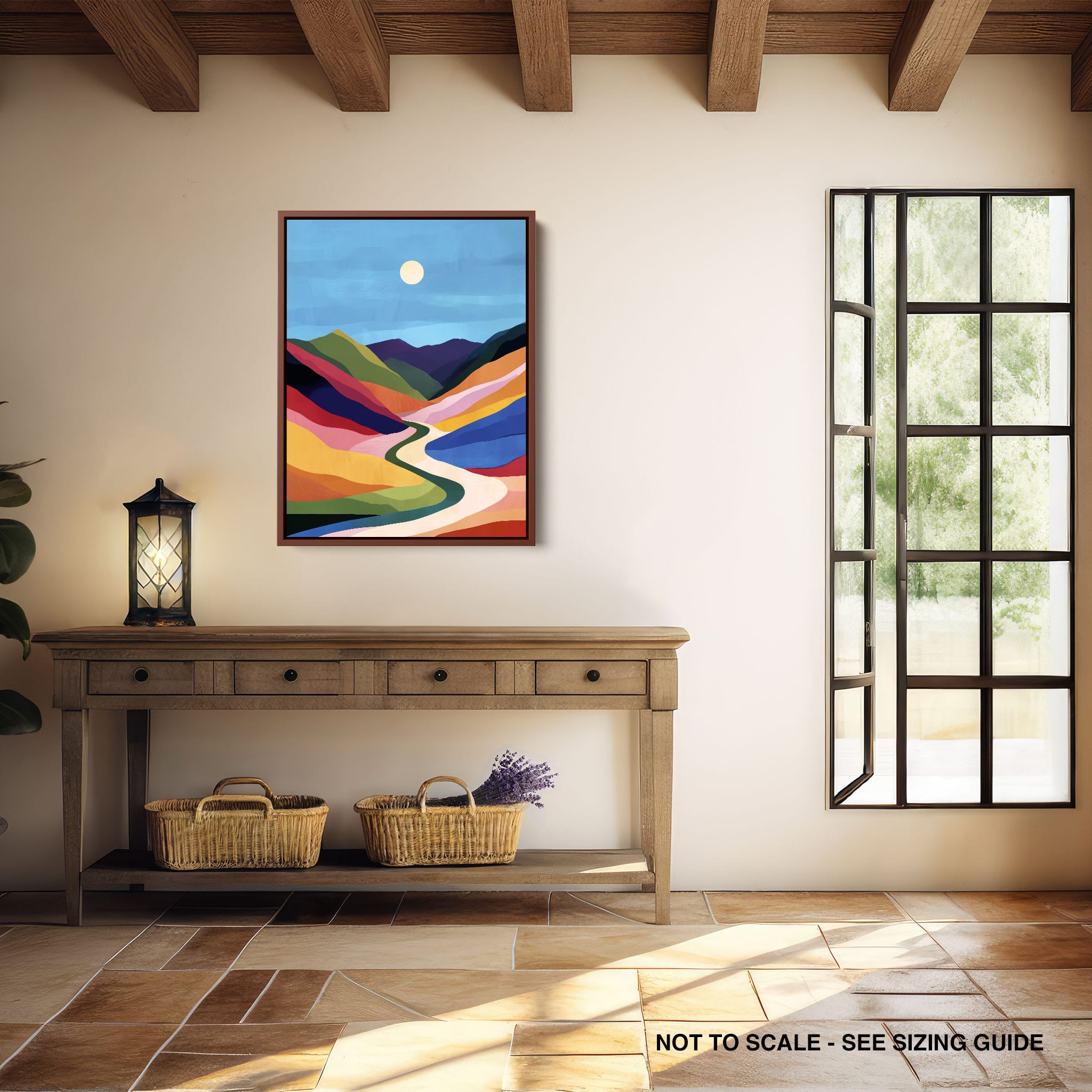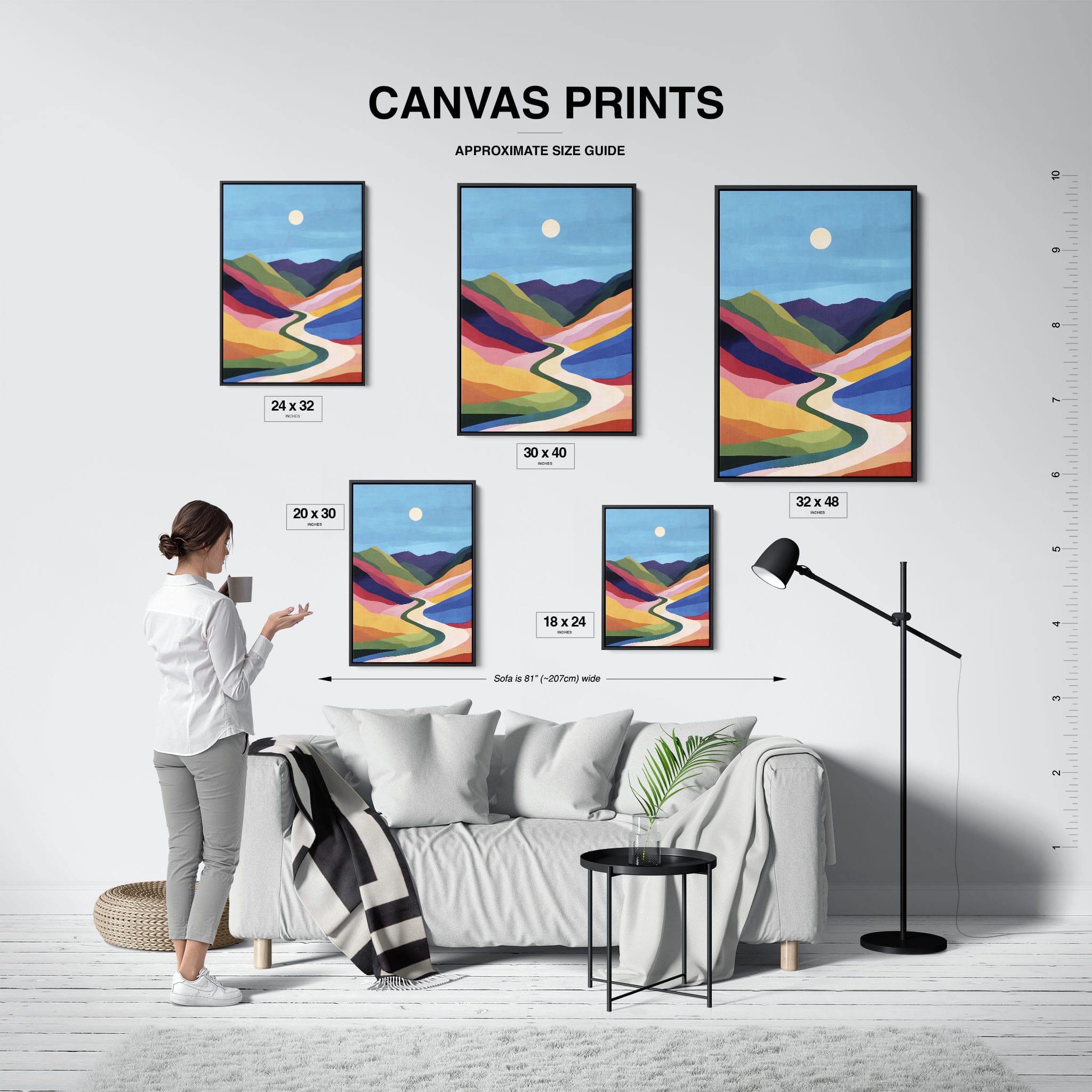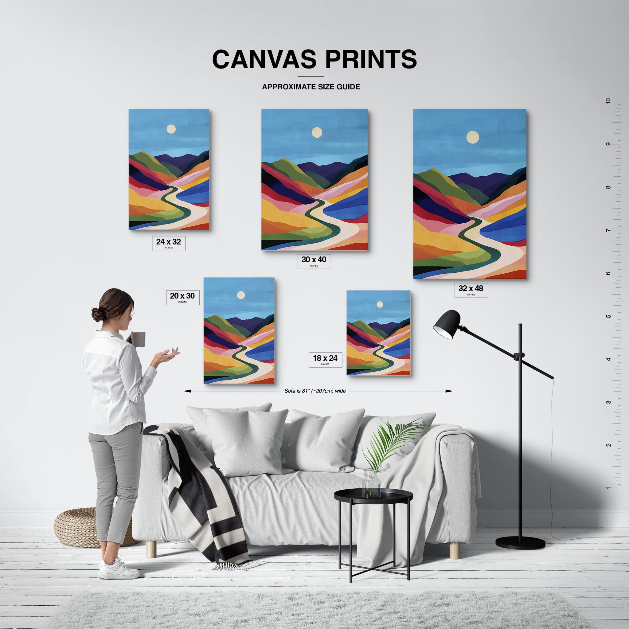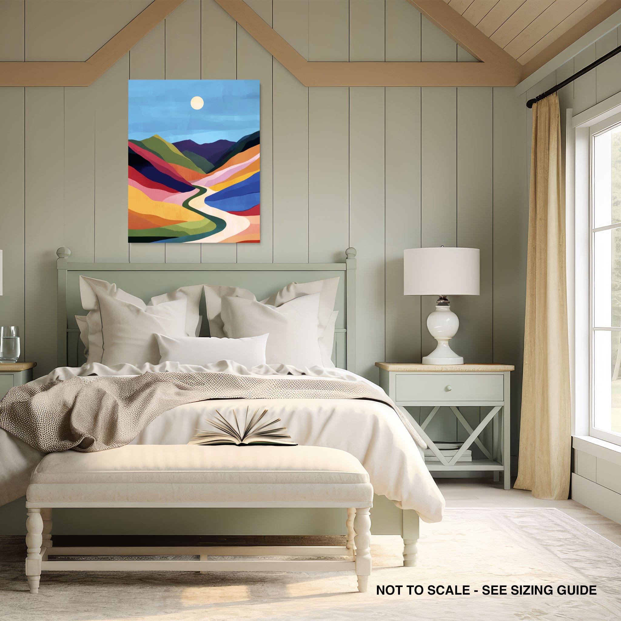 Behold the striking elegance of Vibrant Serenity of Geometric Hills, a digital illustration showcasing an array of bold, contrasting colors and smooth geometric shapes forming mesmerizing hills and valleys. The juxtaposition of the crisp undulating lines against the muted blue, serene backdrop alludes to both modern and minimalist influences, creating an atmosphere of calm and contemplation. This artwork is an ideal choice for contemporary spaces, inviting viewers to lose themselves in its simplistic yet profound beauty. Perfect for those looking to add a touch of color and modern design to their home or office.