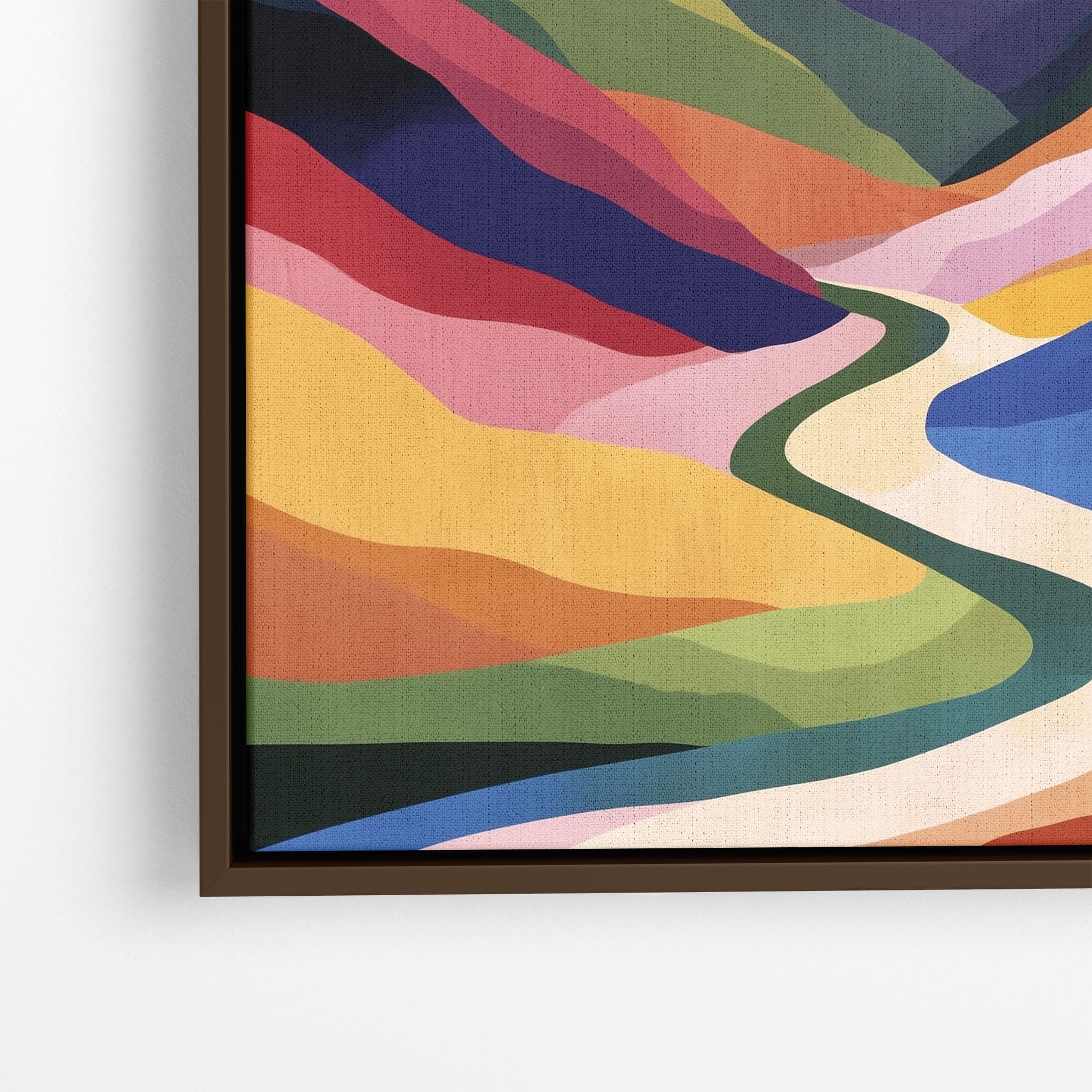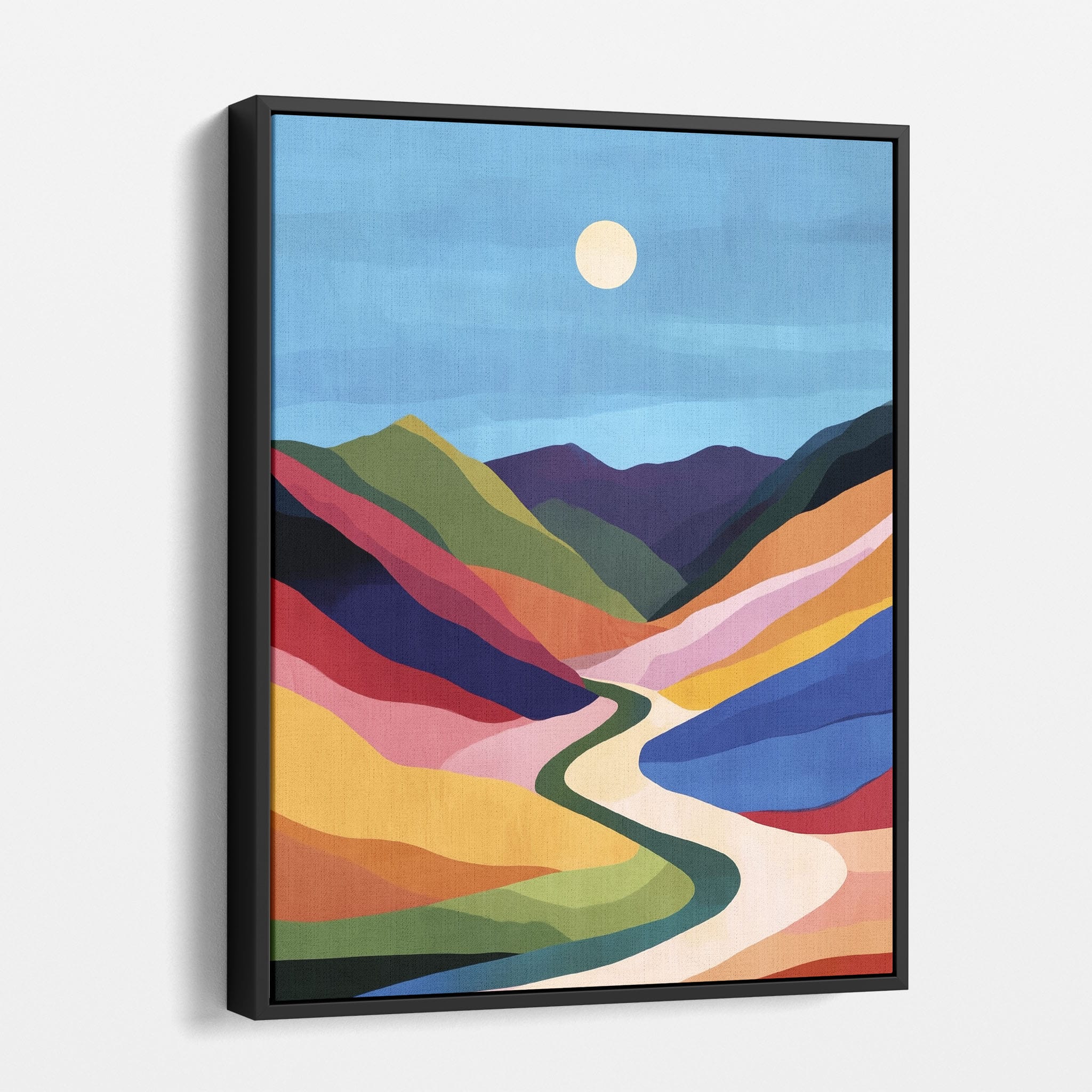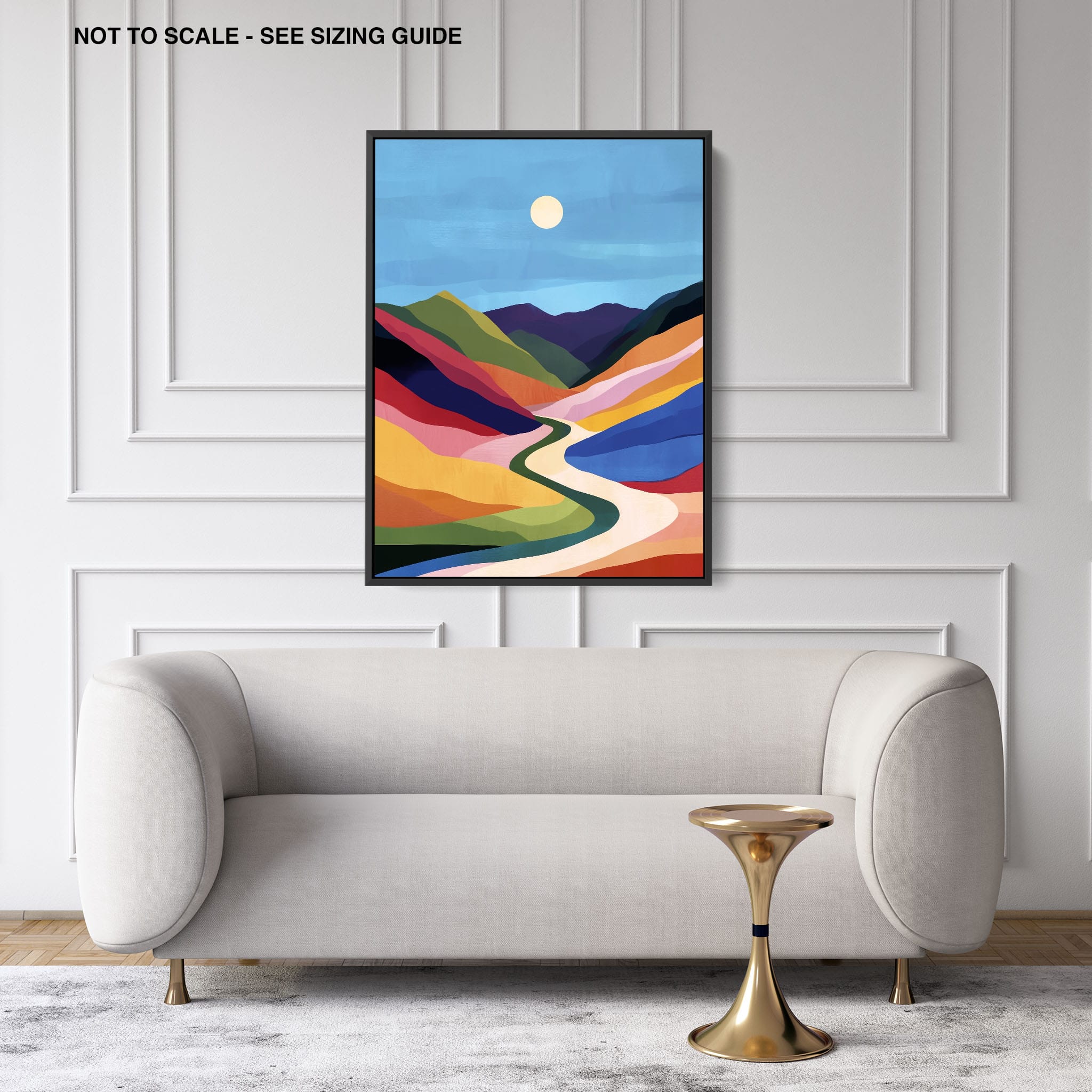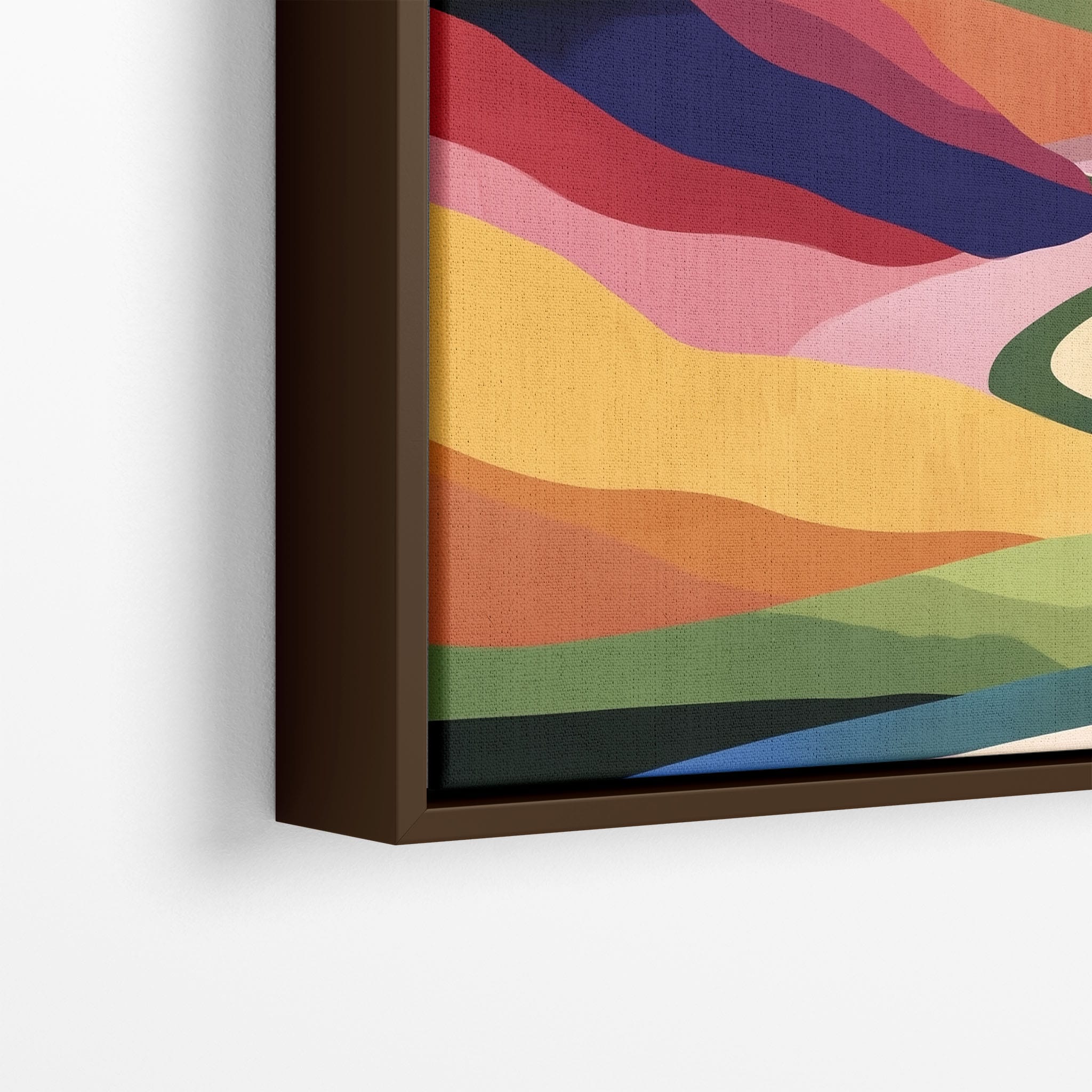 Behold the striking elegance of Vibrant Serenity of Geometric Hills, a digital illustration showcasing an array of bold, contrasting colors and smooth geometric shapes forming mesmerizing hills and valleys. The juxtaposition of the crisp undulating lines against the muted blue, serene backdrop alludes to both modern and minimalist influences, creating an atmosphere of calm and contemplation. This artwork is an ideal choice for contemporary spaces, inviting viewers to lose themselves in its simplistic yet profound beauty. Perfect for those looking to add a touch of color and modern design to their home or office.