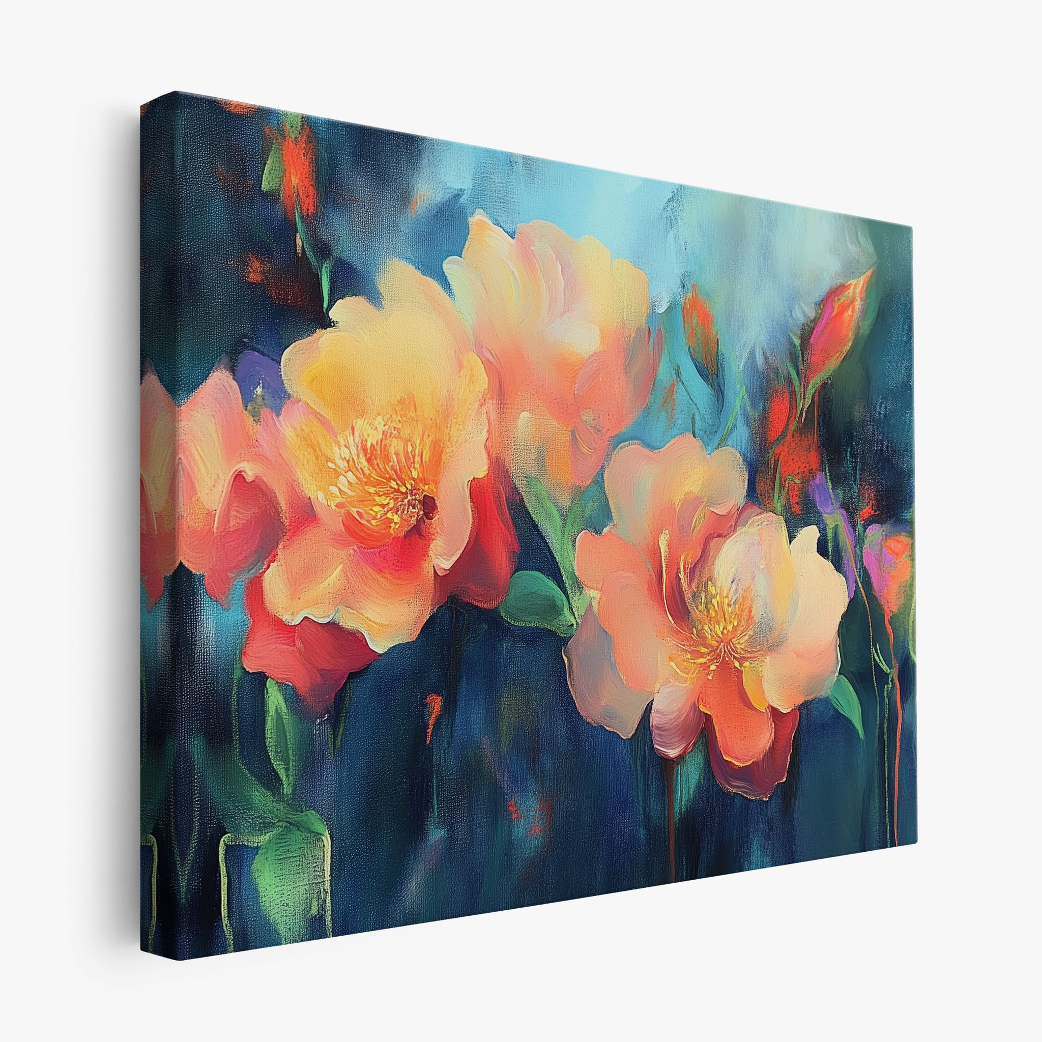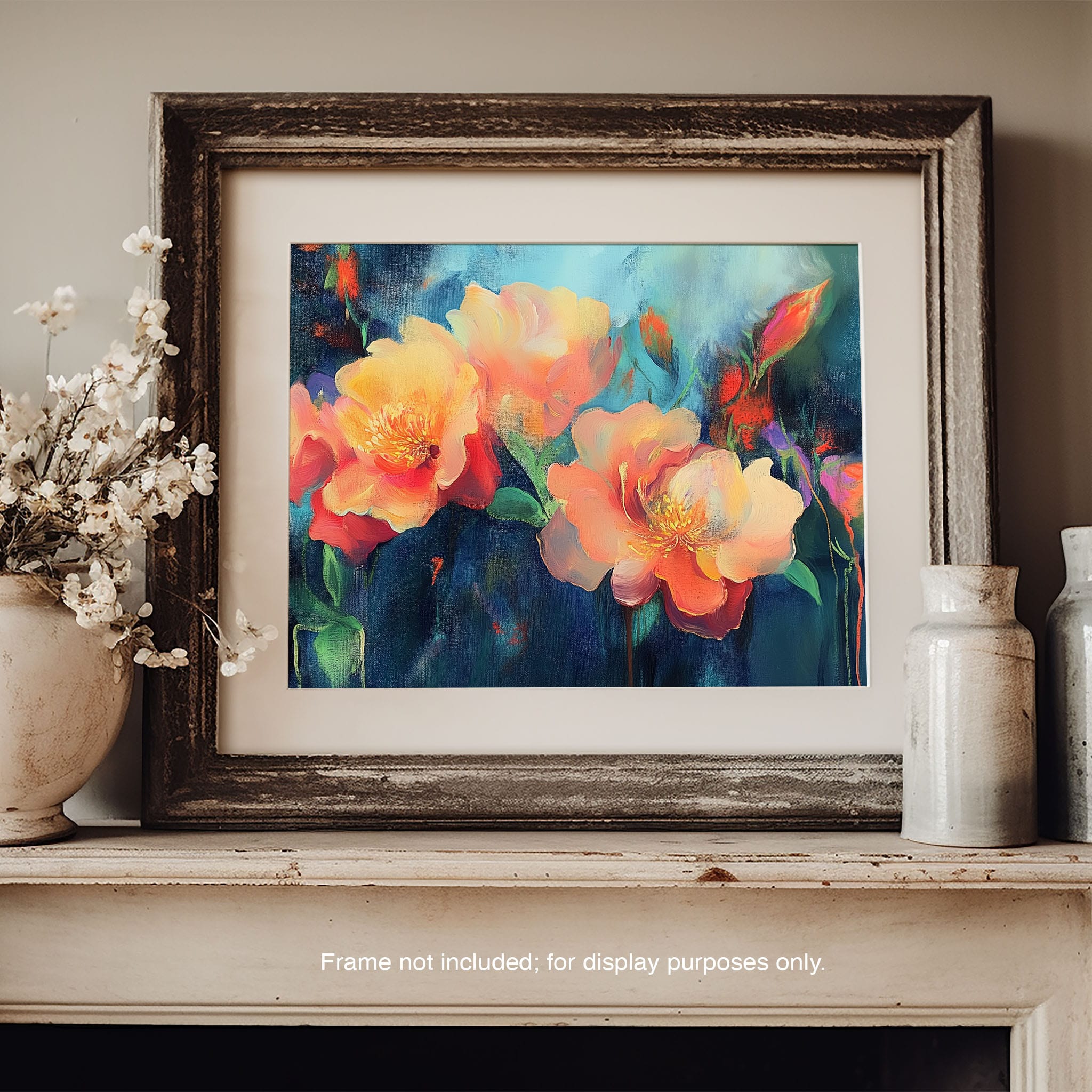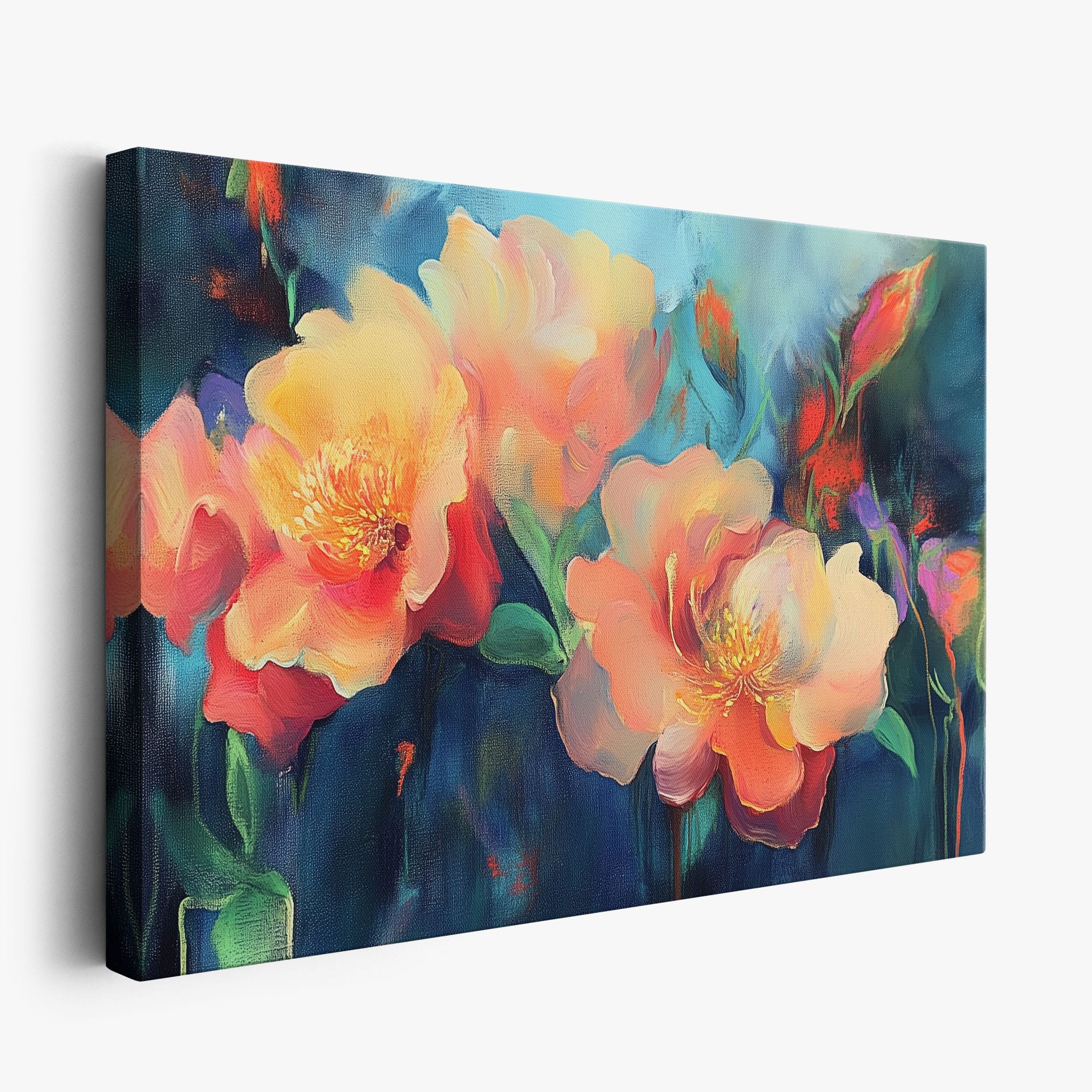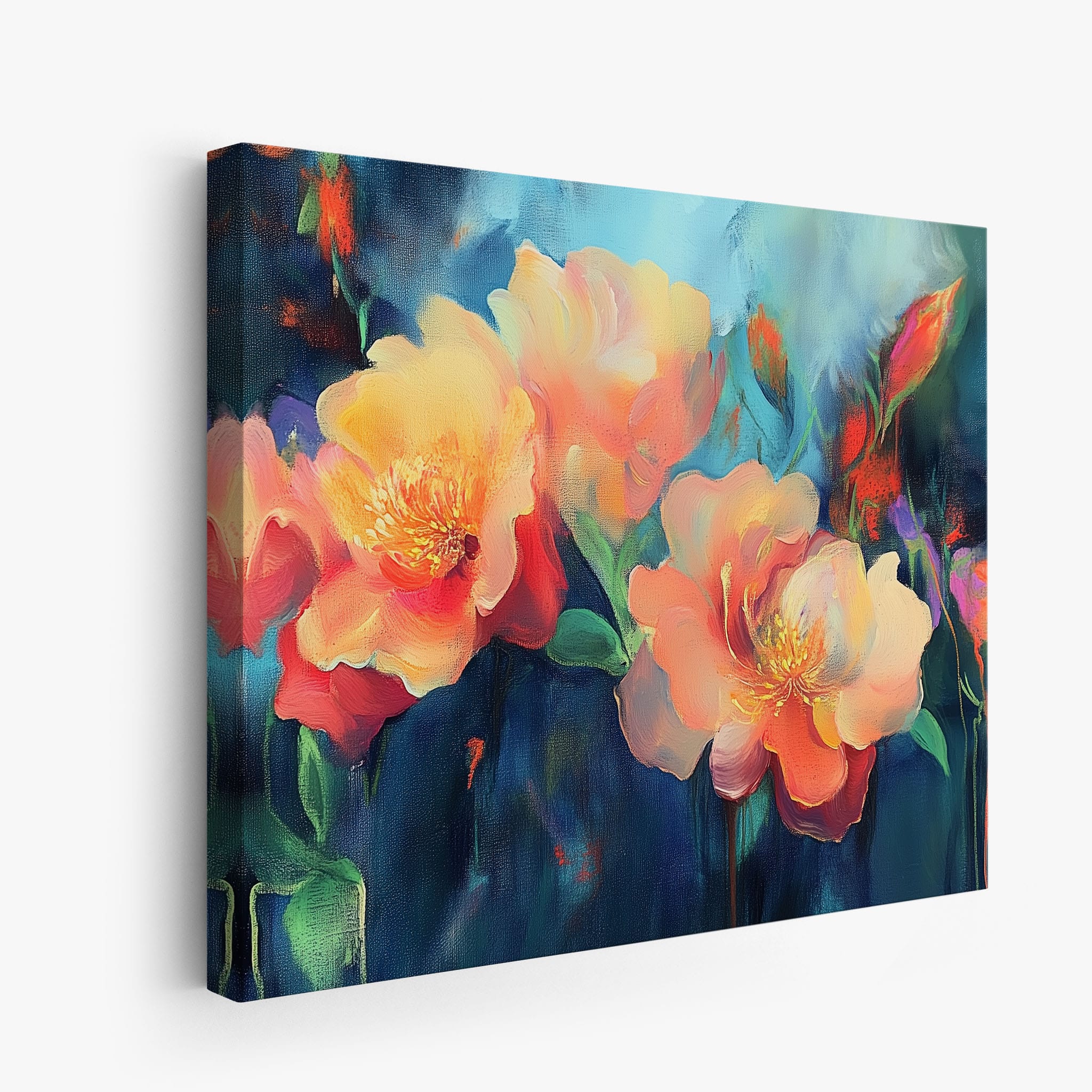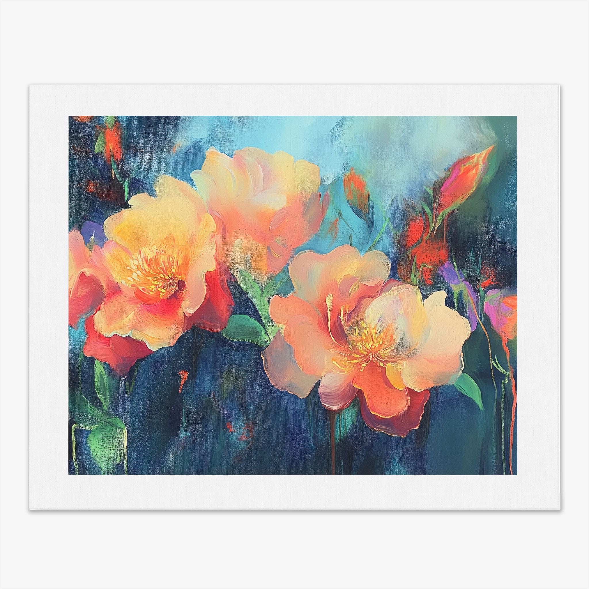 This painting captures the bold and vibrant essence of blooming flowers, using impressionistic brush strokes that blend rich hues of red, pink, and blue to create a lively floral scene. The modern style simplifies the shapes and colors, highlighting the beauty and transient nature of life. The visually striking palette and dynamic composition make this artwork a perfect choice for those who wish to bring a touch of nature's vibrancy into their homes. Add this piece to your space to enjoy a perpetual state of spring.