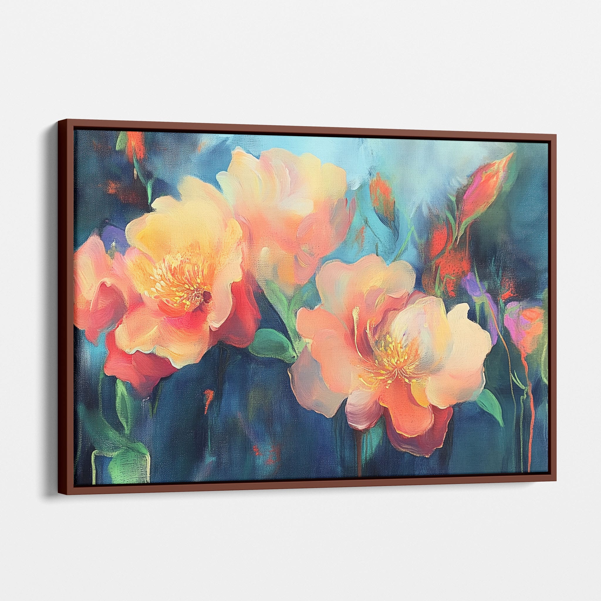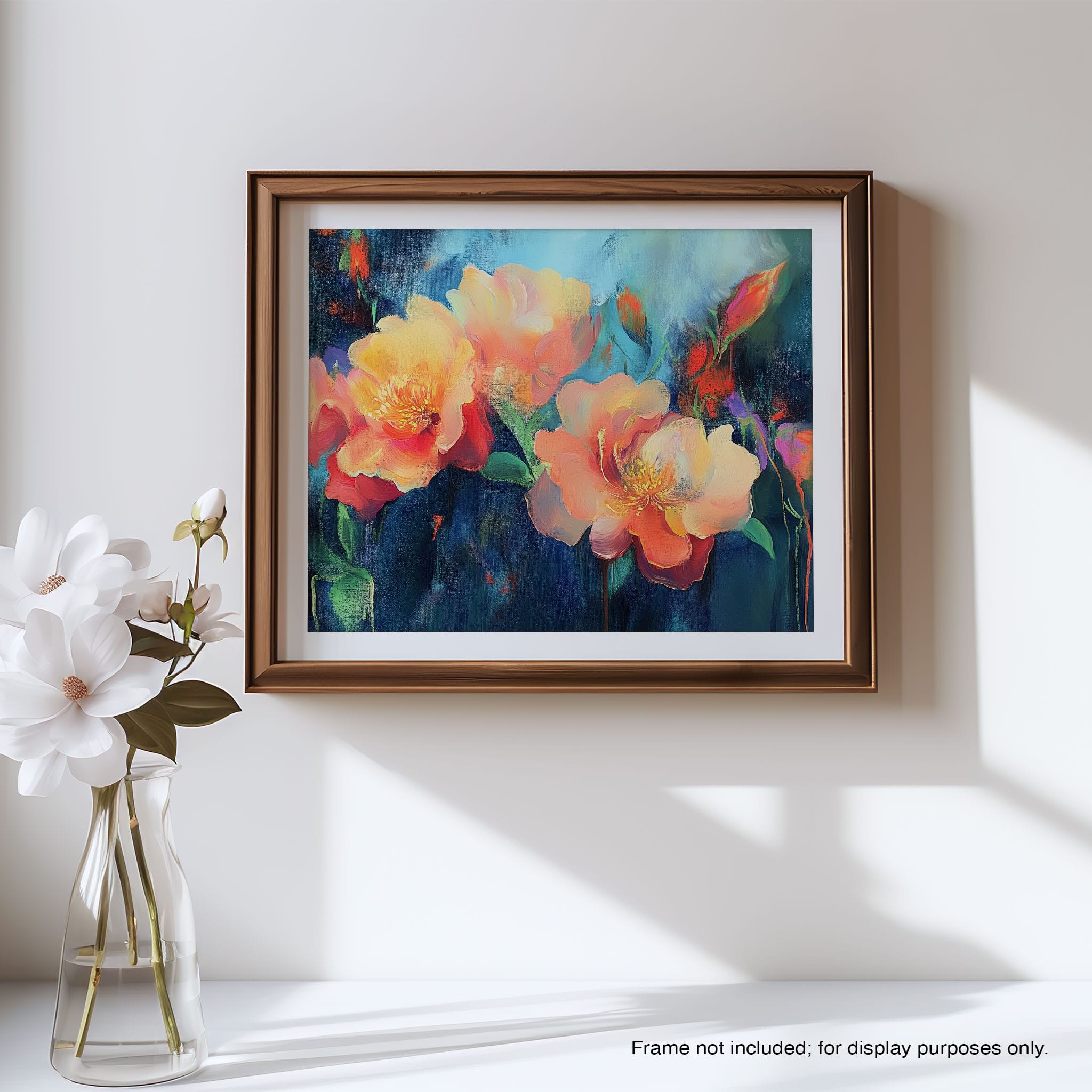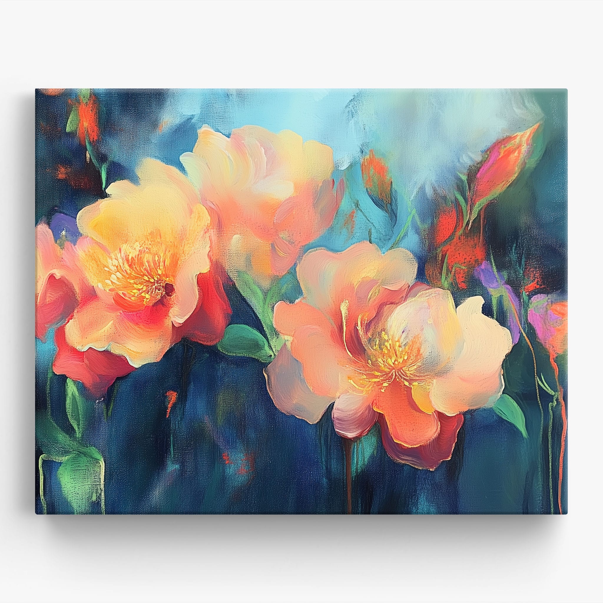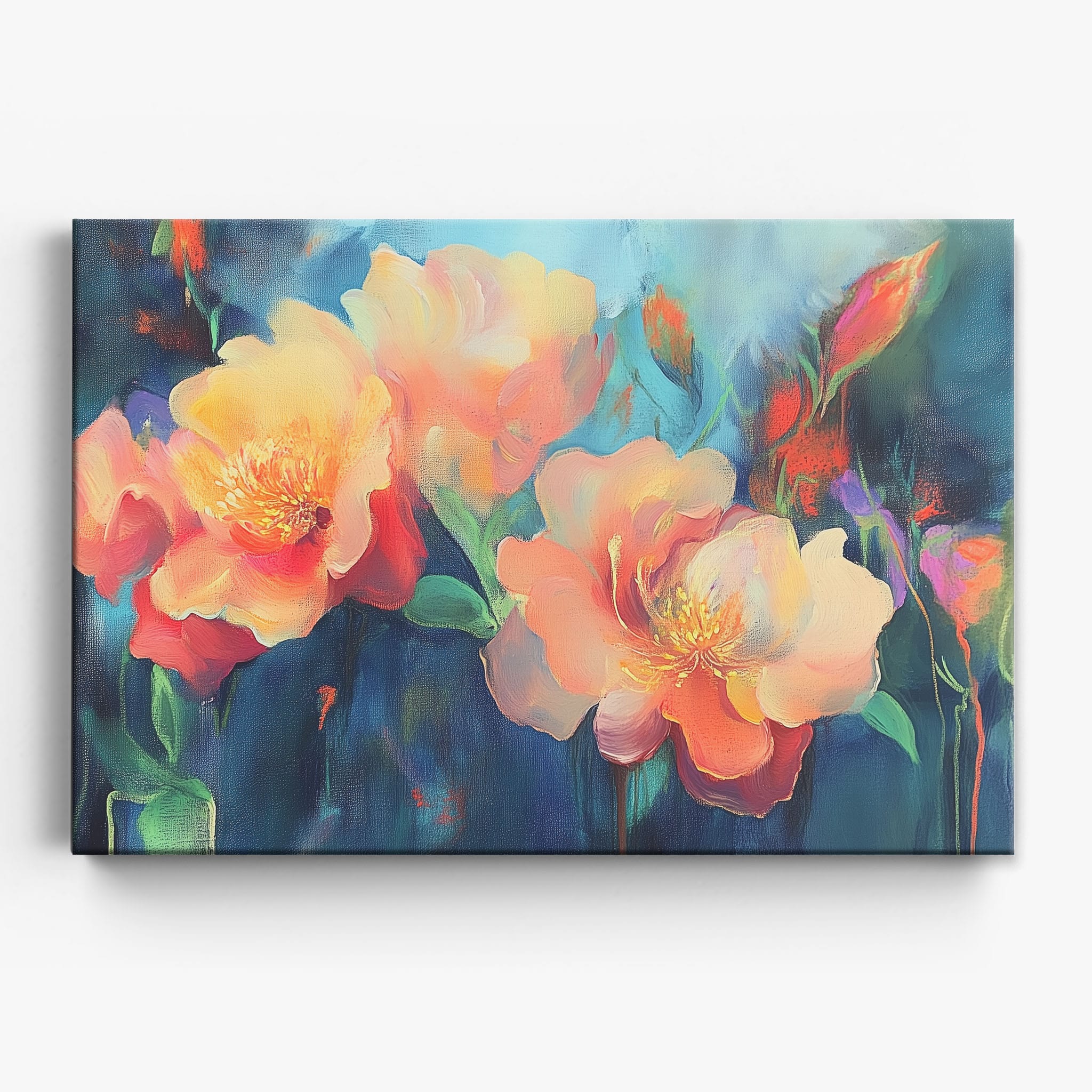 This painting captures the bold and vibrant essence of blooming flowers, using impressionistic brush strokes that blend rich hues of red, pink, and blue to create a lively floral scene. The modern style simplifies the shapes and colors, highlighting the beauty and transient nature of life. The visually striking palette and dynamic composition make this artwork a perfect choice for those who wish to bring a touch of nature's vibrancy into their homes. Add this piece to your space to enjoy a perpetual state of spring.