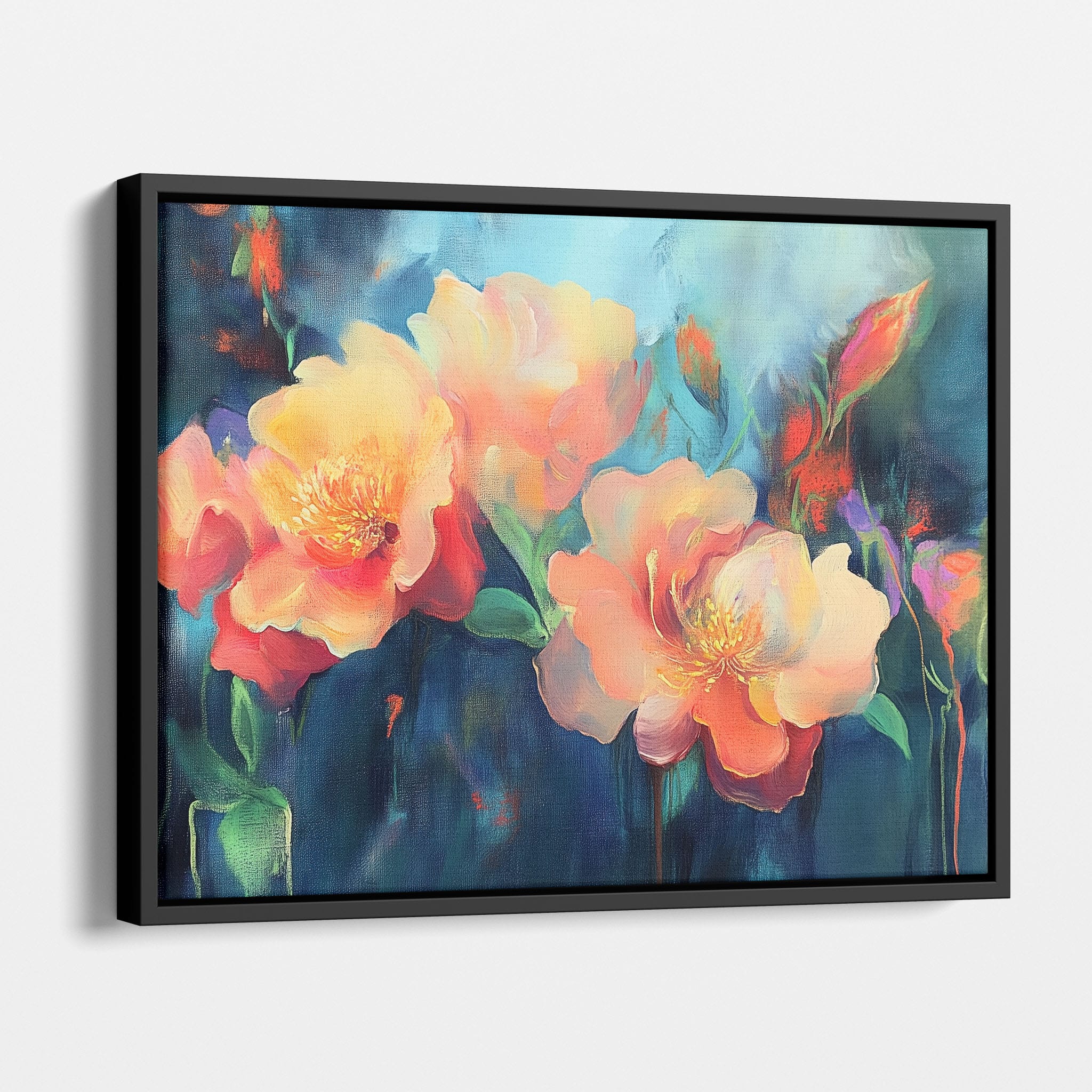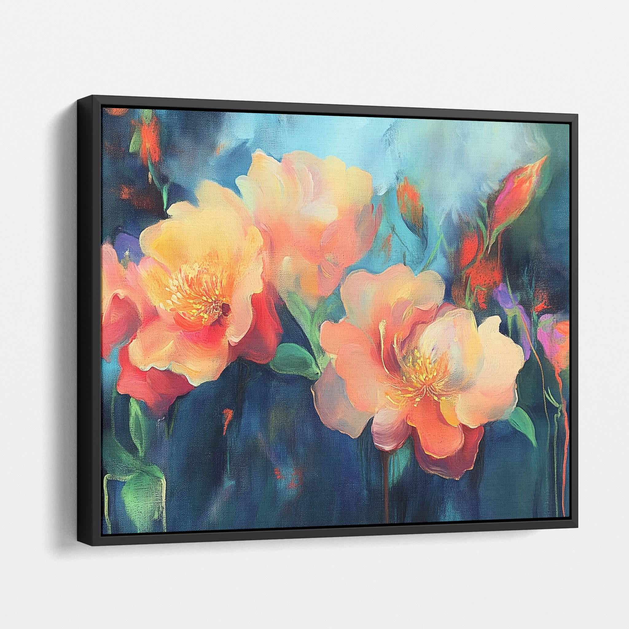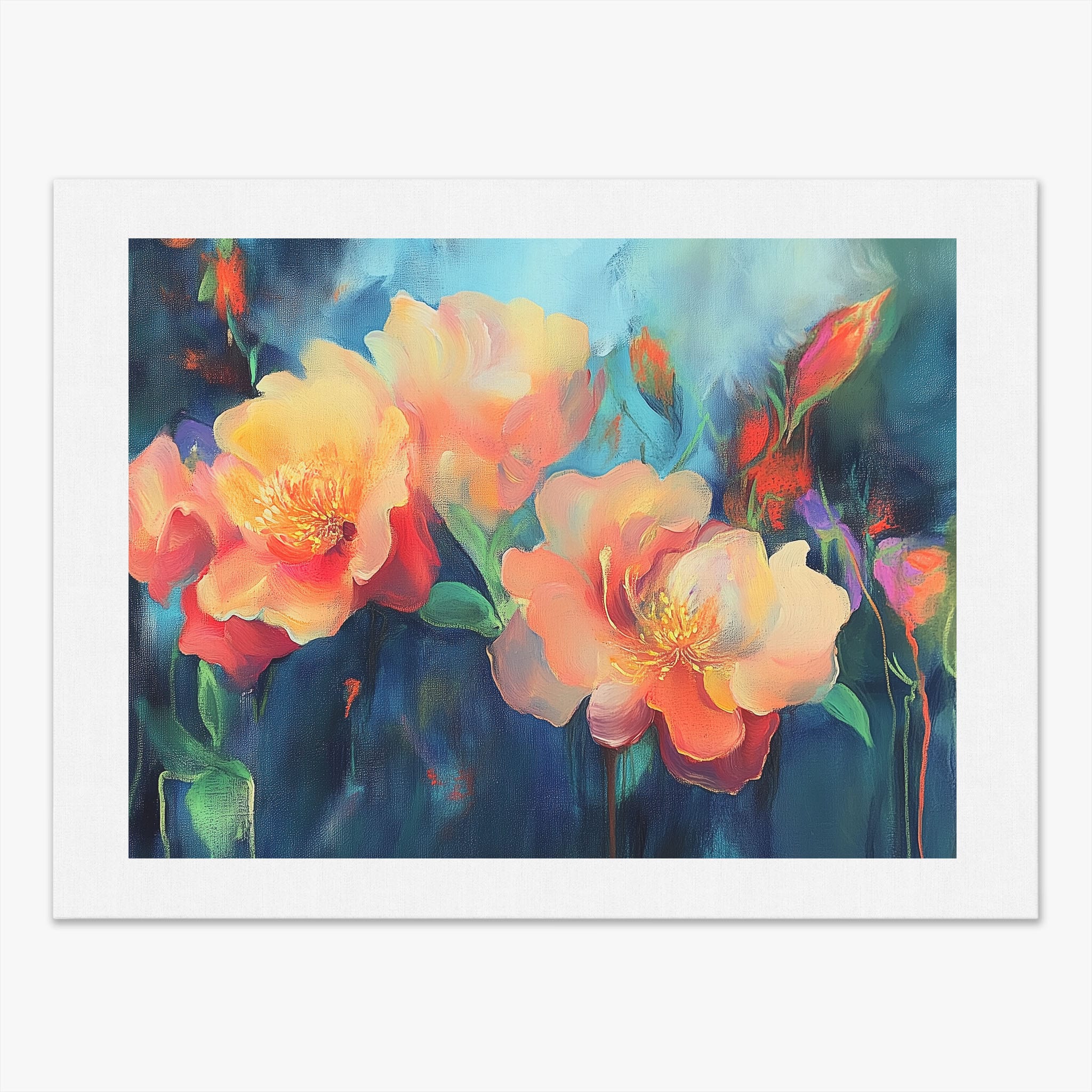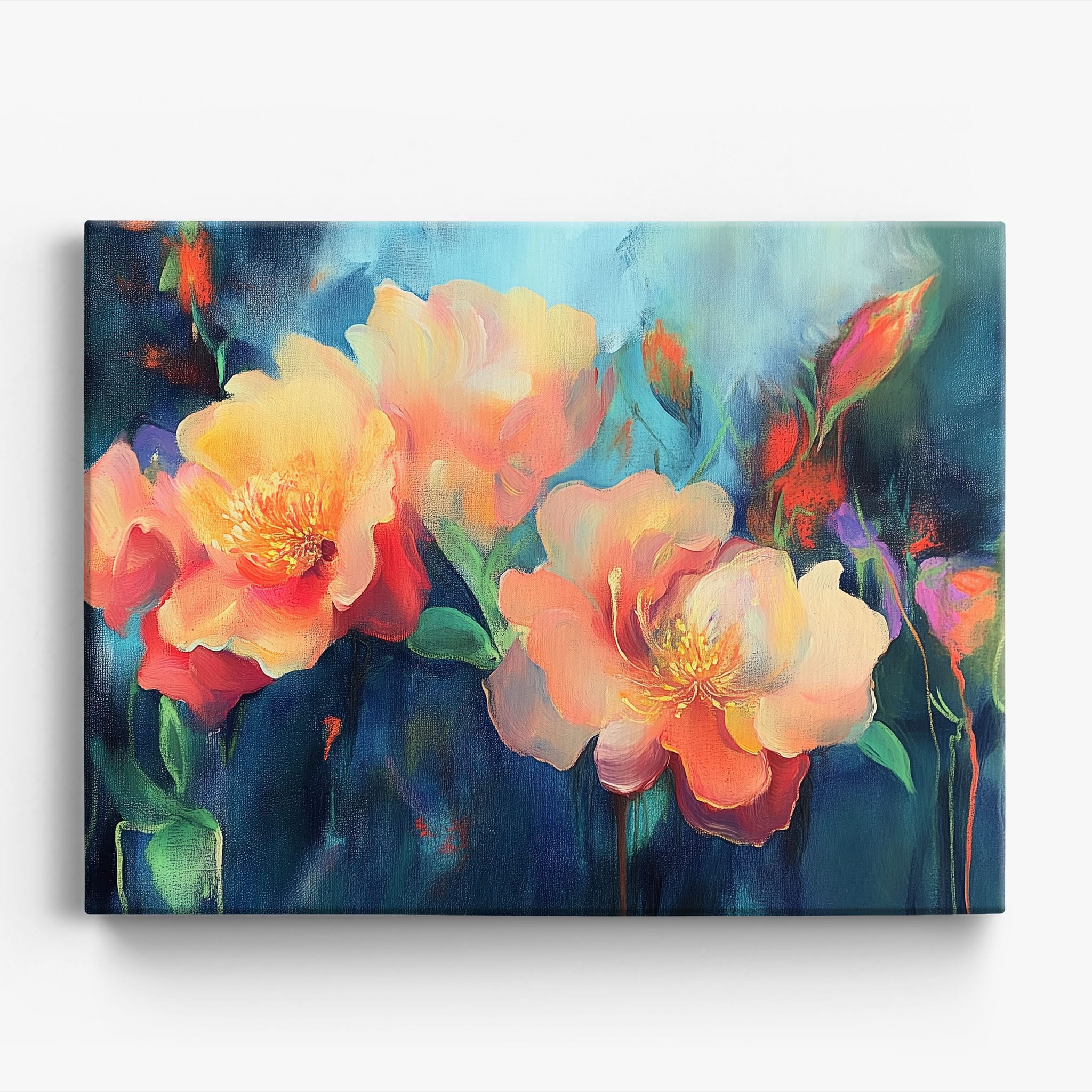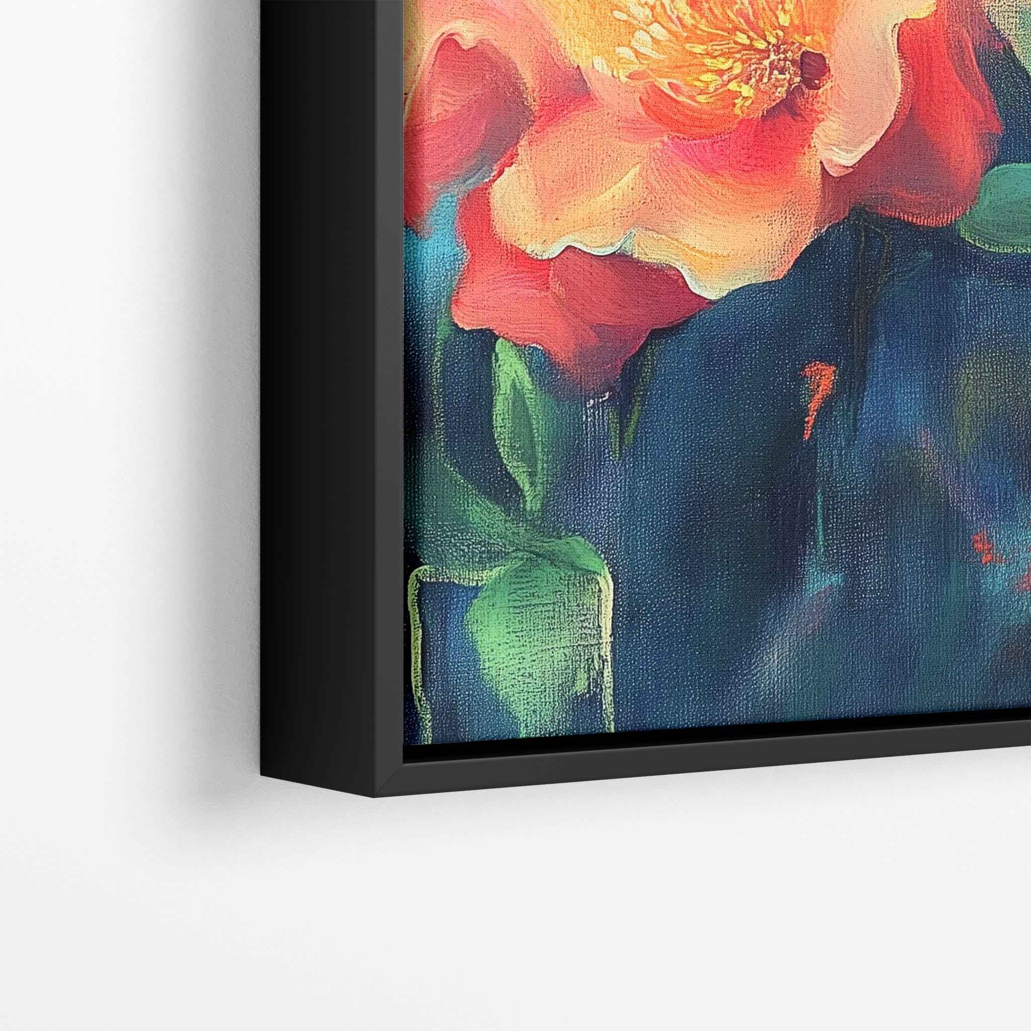 This painting captures the bold and vibrant essence of blooming flowers, using impressionistic brush strokes that blend rich hues of red, pink, and blue to create a lively floral scene. The modern style simplifies the shapes and colors, highlighting the beauty and transient nature of life. The visually striking palette and dynamic composition make this artwork a perfect choice for those who wish to bring a touch of nature's vibrancy into their homes. Add this piece to your space to enjoy a perpetual state of spring.