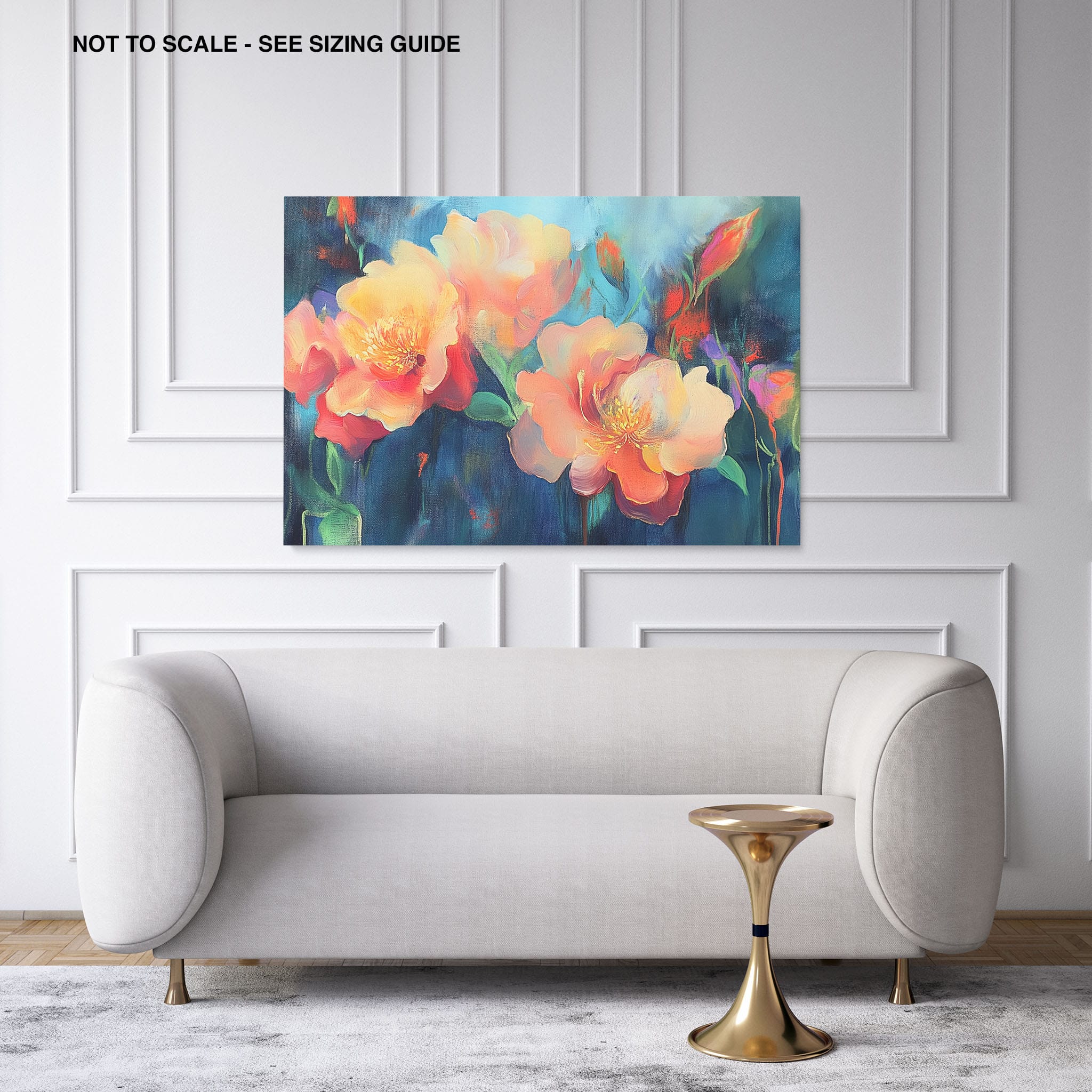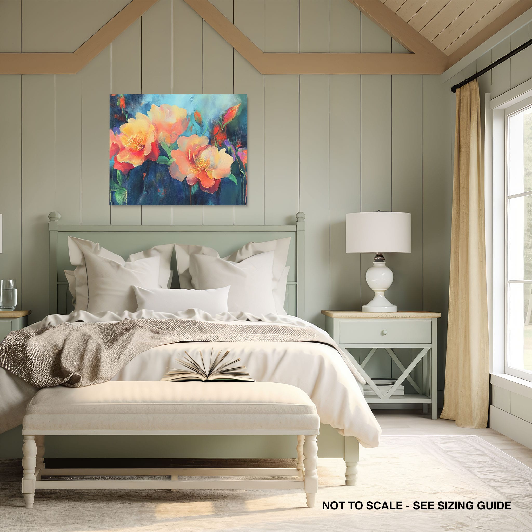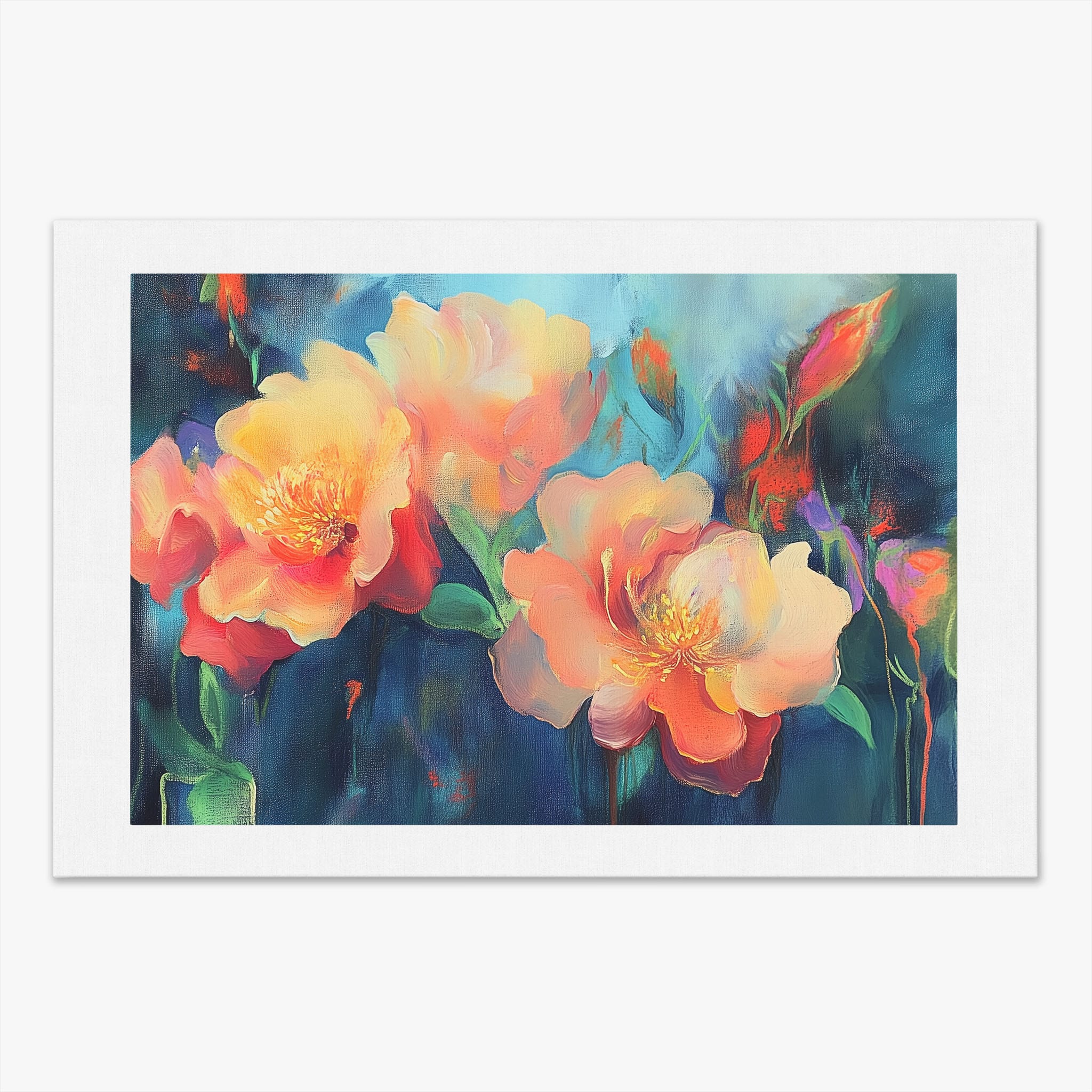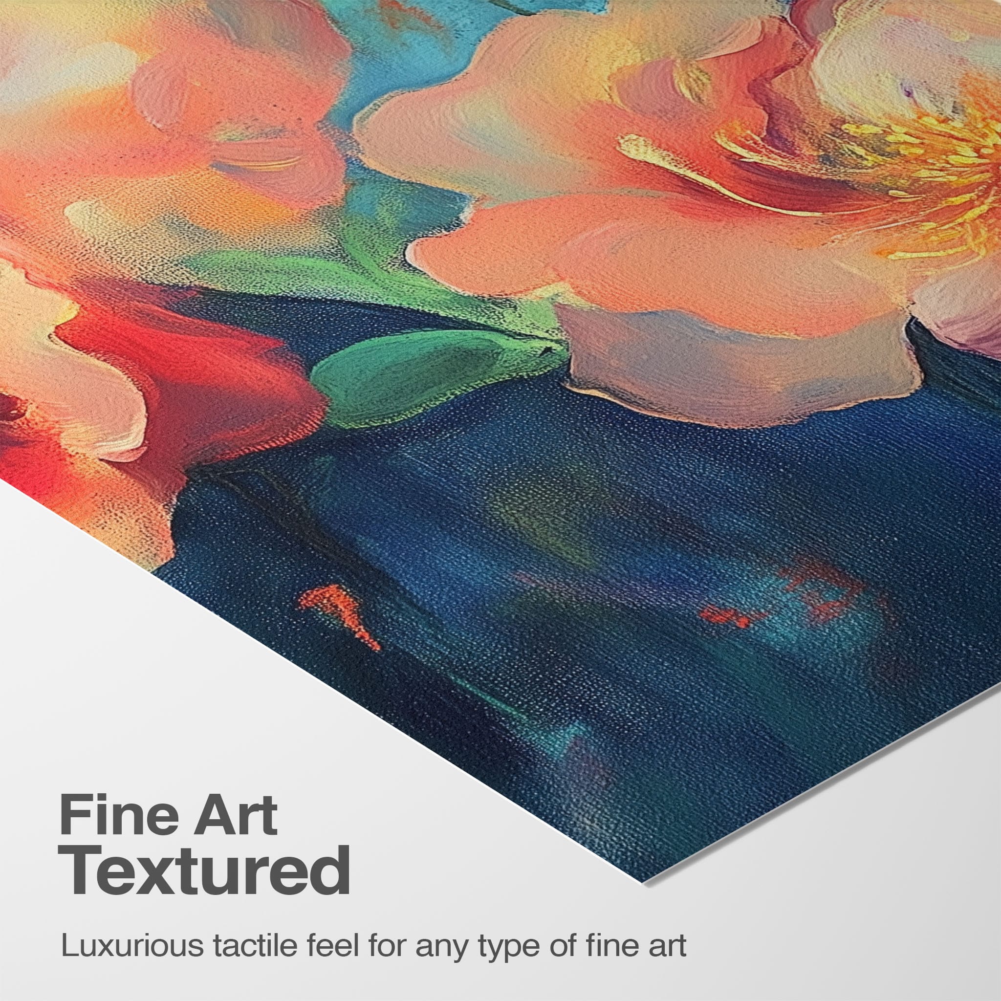This painting captures the bold and vibrant essence of blooming flowers, using impressionistic brush strokes that blend rich hues of red, pink, and blue to create a lively floral scene. The modern style simplifies the shapes and colors, highlighting the beauty and transient nature of life. The visually striking palette and dynamic composition make this artwork a perfect choice for those who wish to bring a touch of nature's vibrancy into their homes. Add this piece to your space to enjoy a perpetual state of spring.
