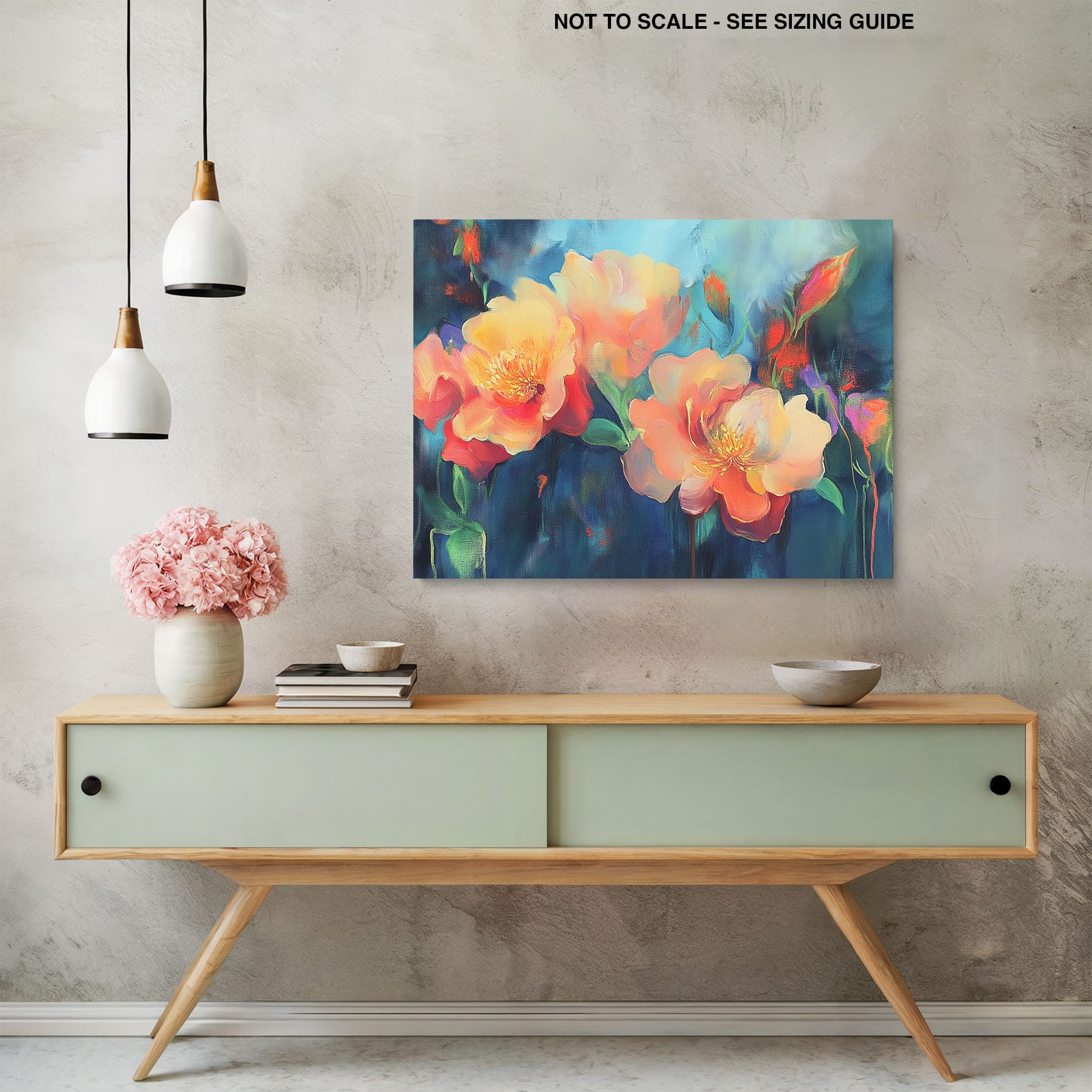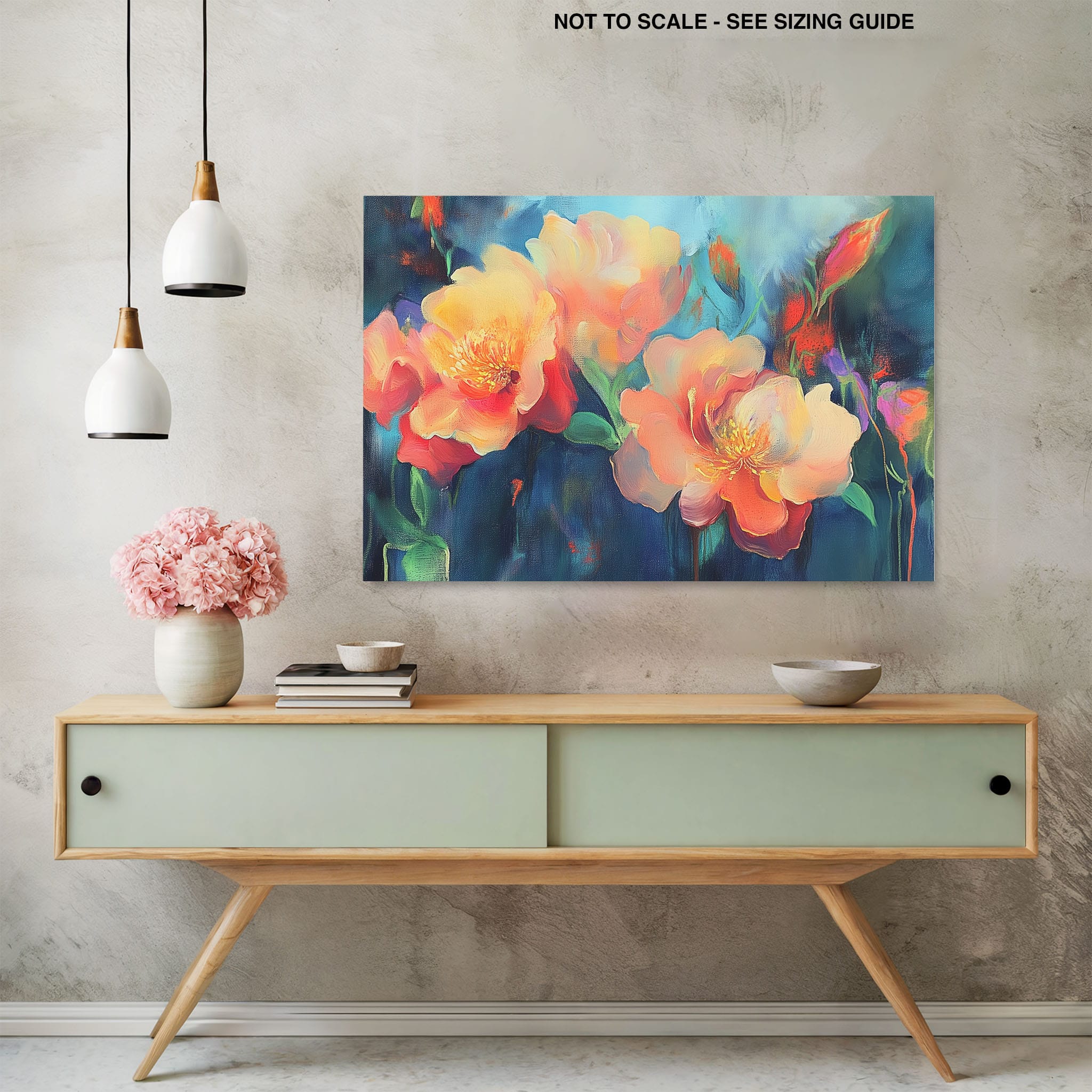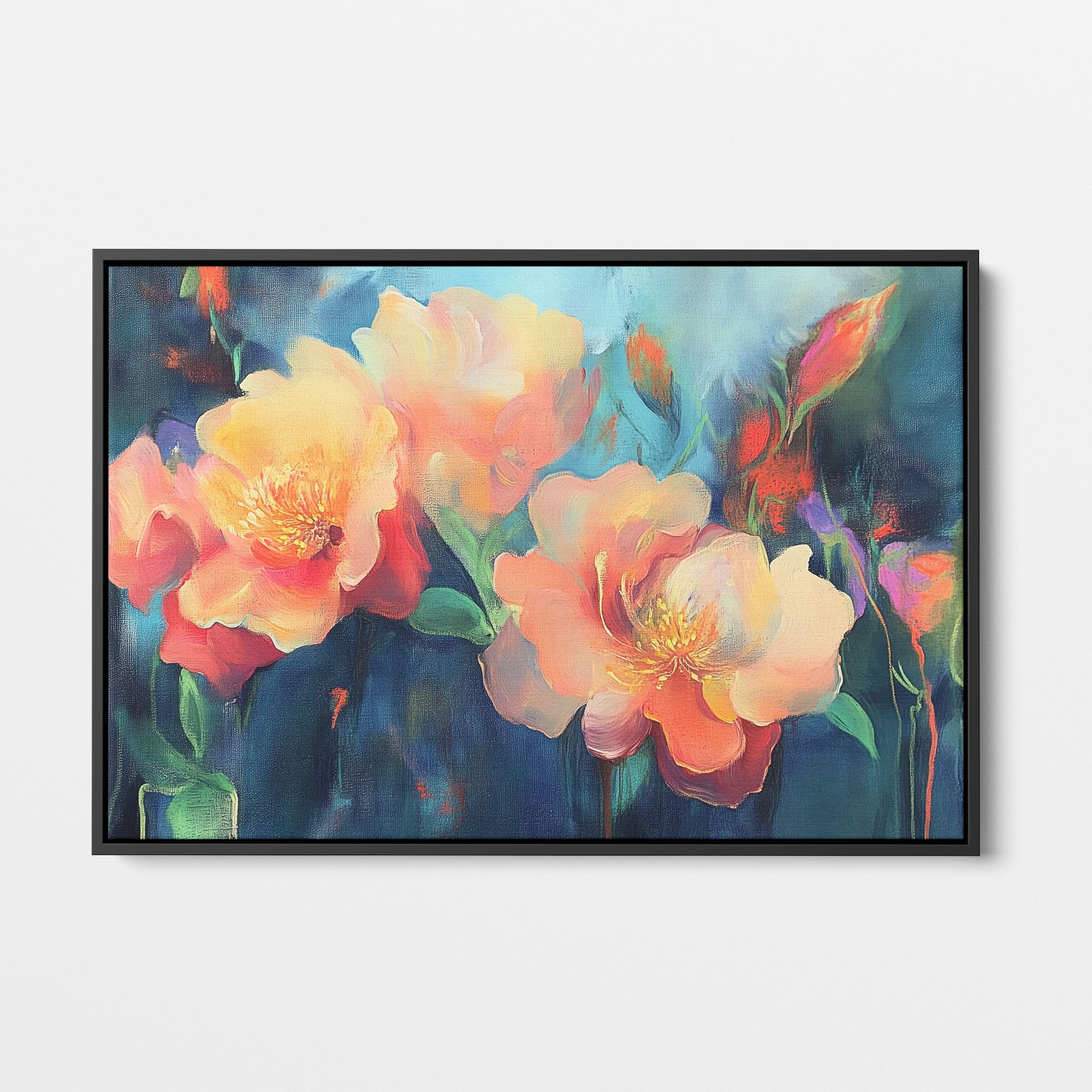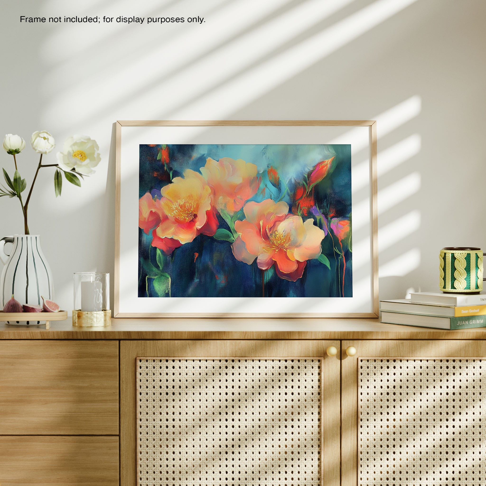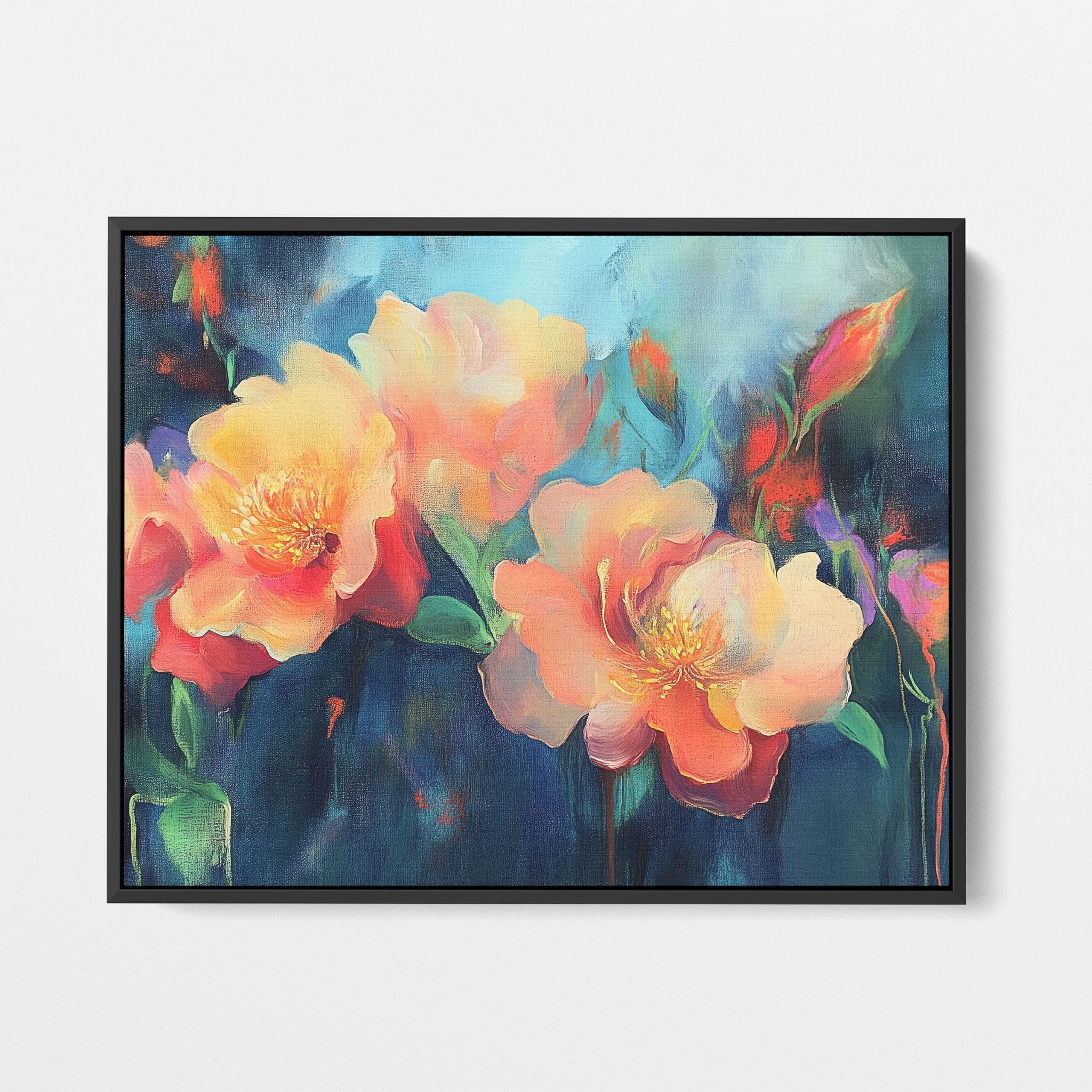 This painting captures the bold and vibrant essence of blooming flowers, using impressionistic brush strokes that blend rich hues of red, pink, and blue to create a lively floral scene. The modern style simplifies the shapes and colors, highlighting the beauty and transient nature of life. The visually striking palette and dynamic composition make this artwork a perfect choice for those who wish to bring a touch of nature's vibrancy into their homes. Add this piece to your space to enjoy a perpetual state of spring.