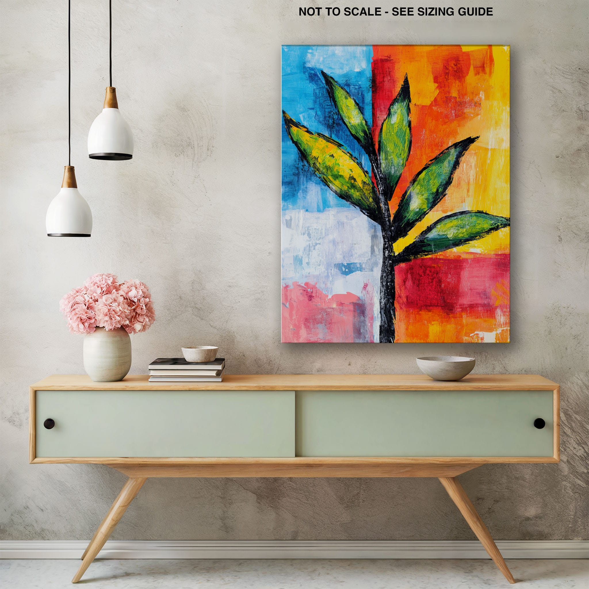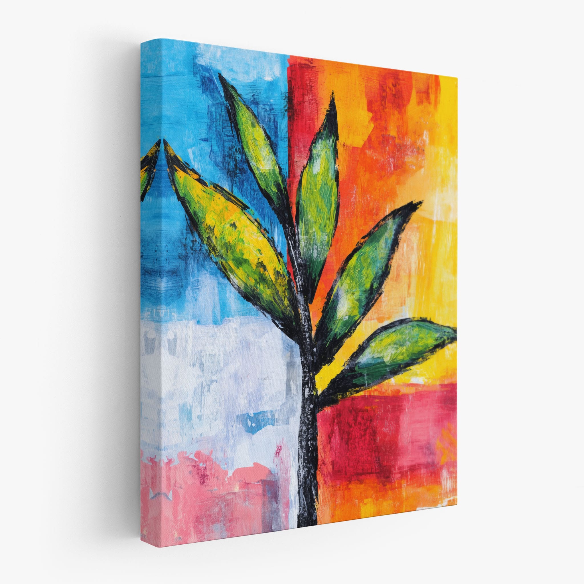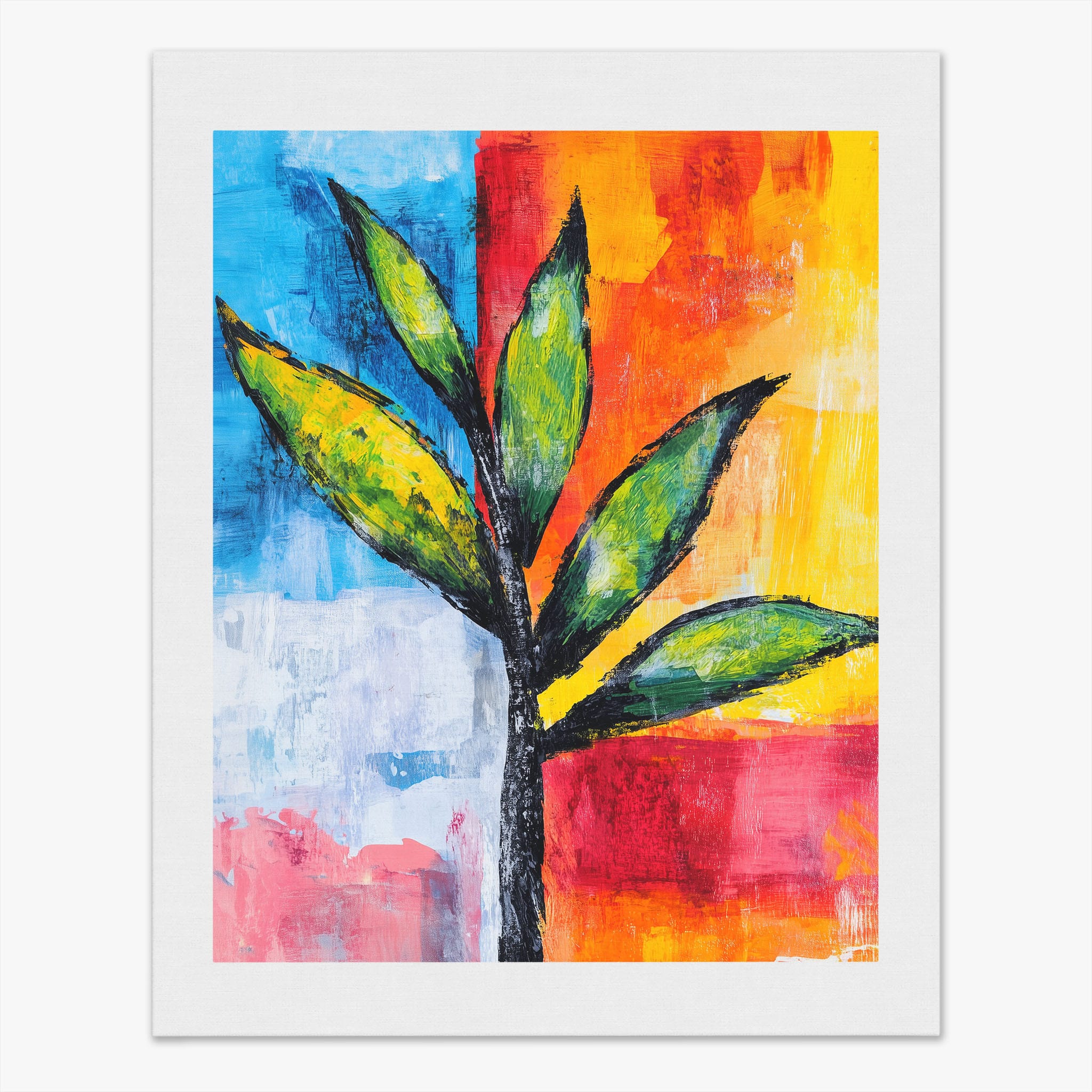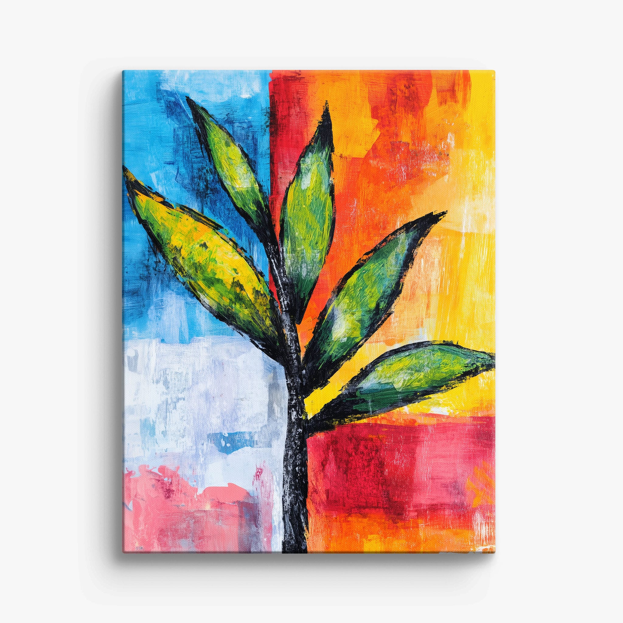 This vibrant painting captures a dynamic sprout set against a striking background of intense color gradients. With broad, confident brush strokes reminiscent of Expressionism, the artist brings life to the canvas, blending Modern art influences with Abstract designs. Each leaf is highlighted in varying shades of green, seeming almost to stretch towards the warmth of the reds, yellows, and blues that envelop it. This artwork is perfect for those seeking a bold statement piece that combines artistic intensity with a celebration of natural forms. Add this piece to your living space to introduce a splash of color and creativity.