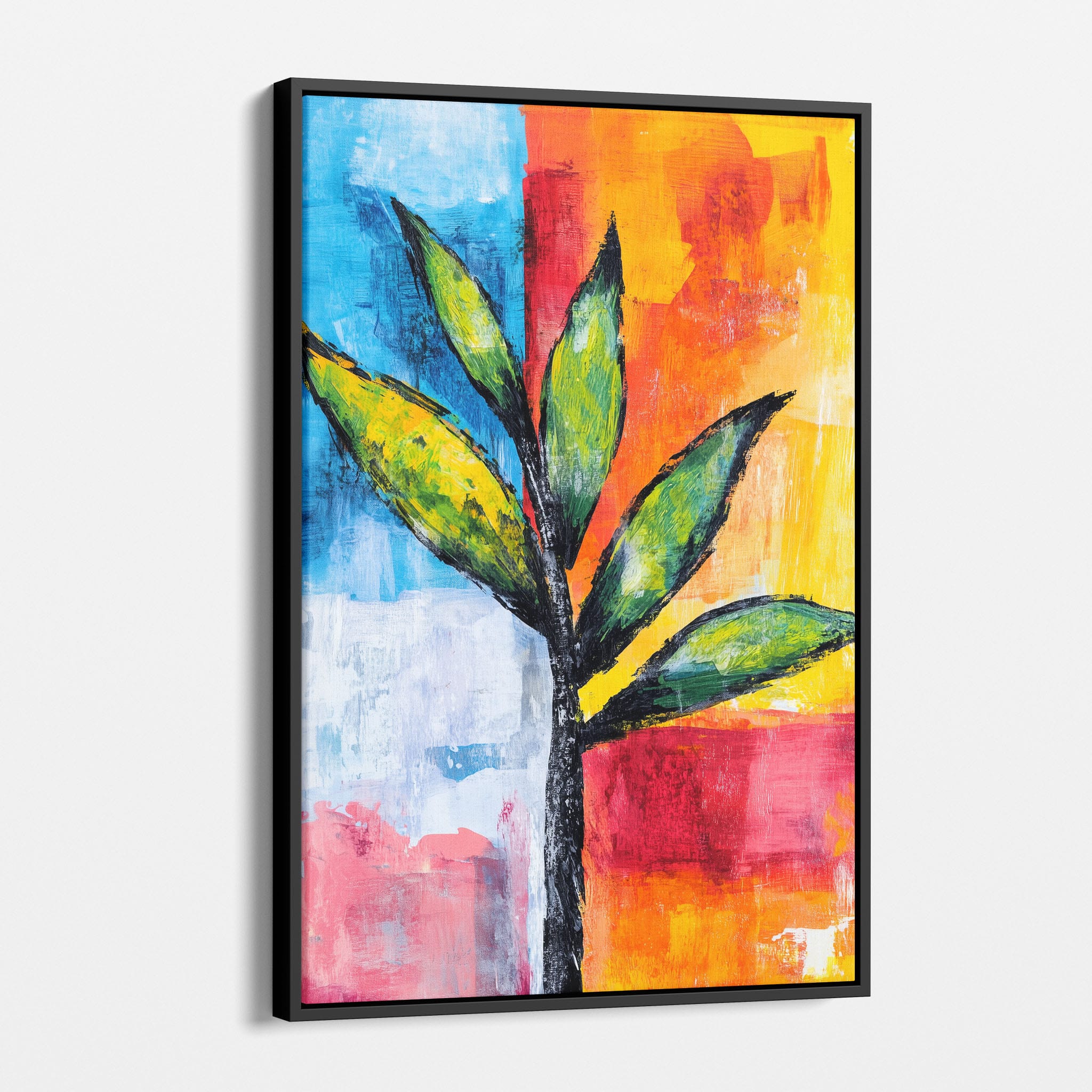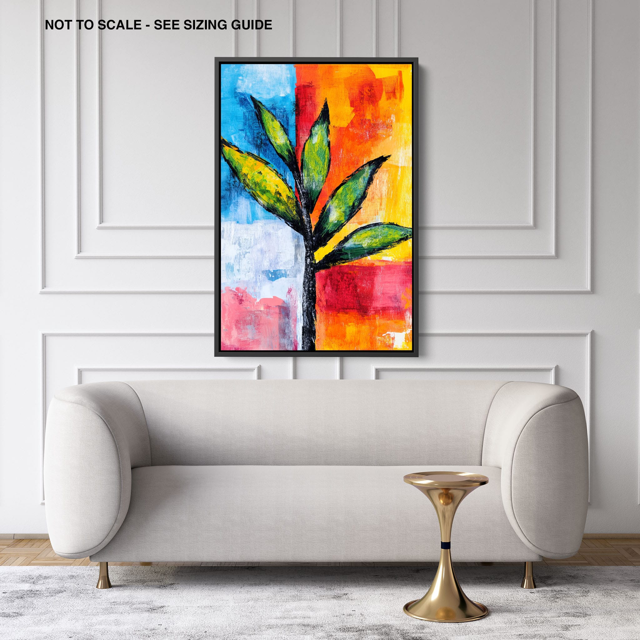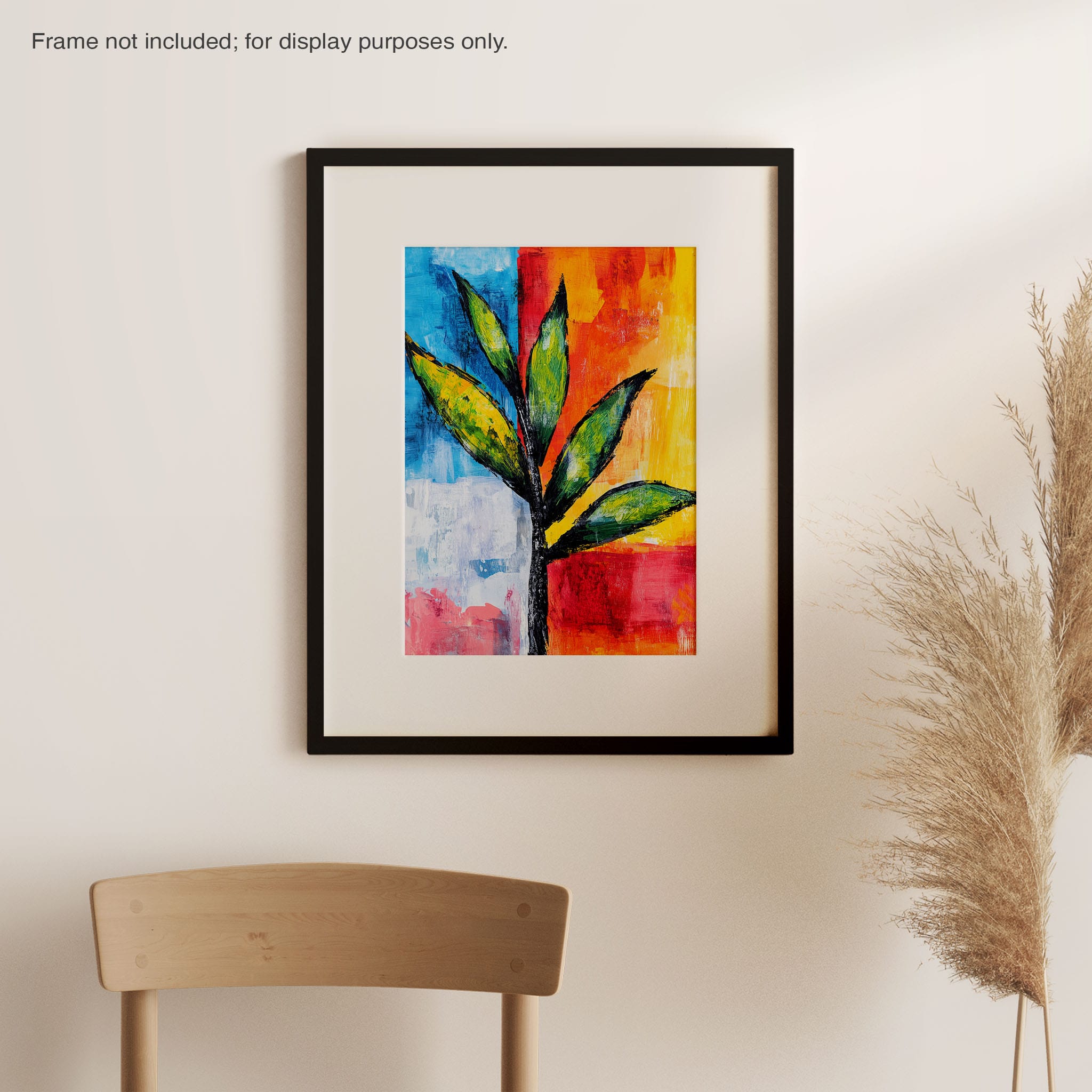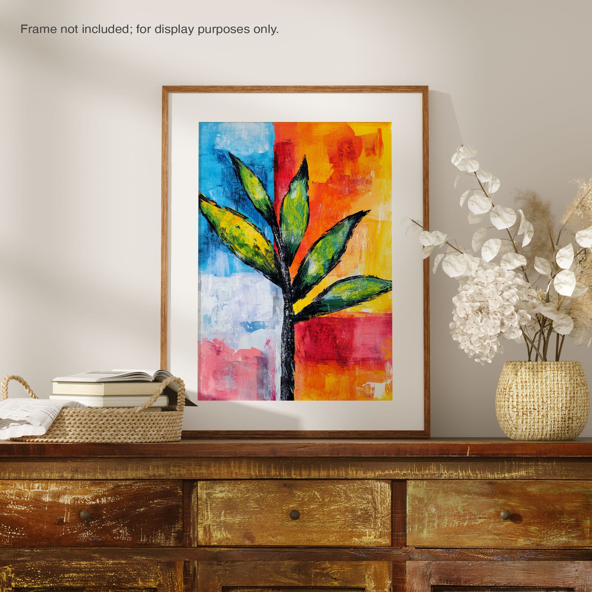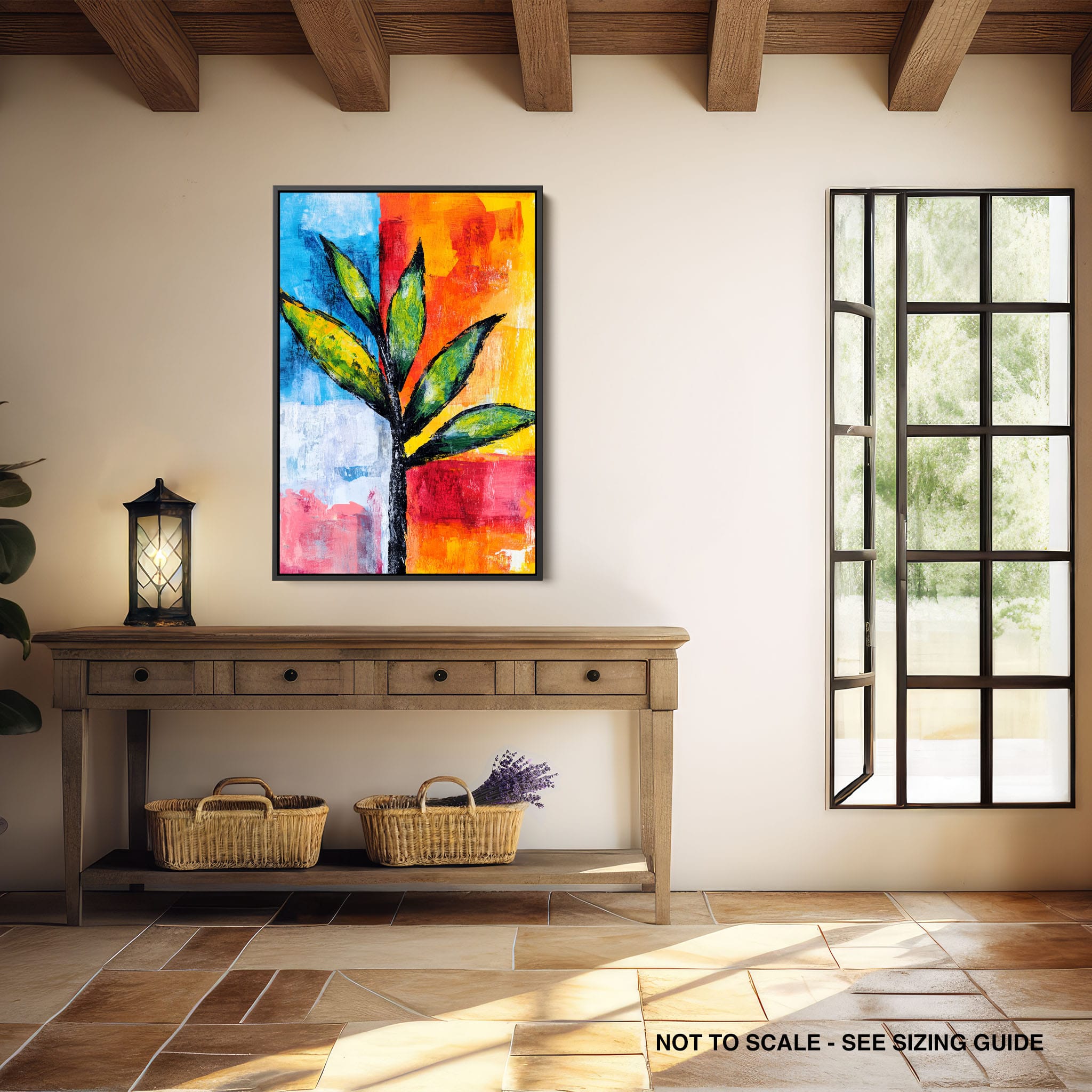This vibrant painting captures a dynamic sprout set against a striking background of intense color gradients. With broad, confident brush strokes reminiscent of Expressionism, the artist brings life to the canvas, blending Modern art influences with Abstract designs. Each leaf is highlighted in varying shades of green, seeming almost to stretch towards the warmth of the reds, yellows, and blues that envelop it. This artwork is perfect for those seeking a bold statement piece that combines artistic intensity with a celebration of natural forms. Add this piece to your living space to introduce a splash of color and creativity.