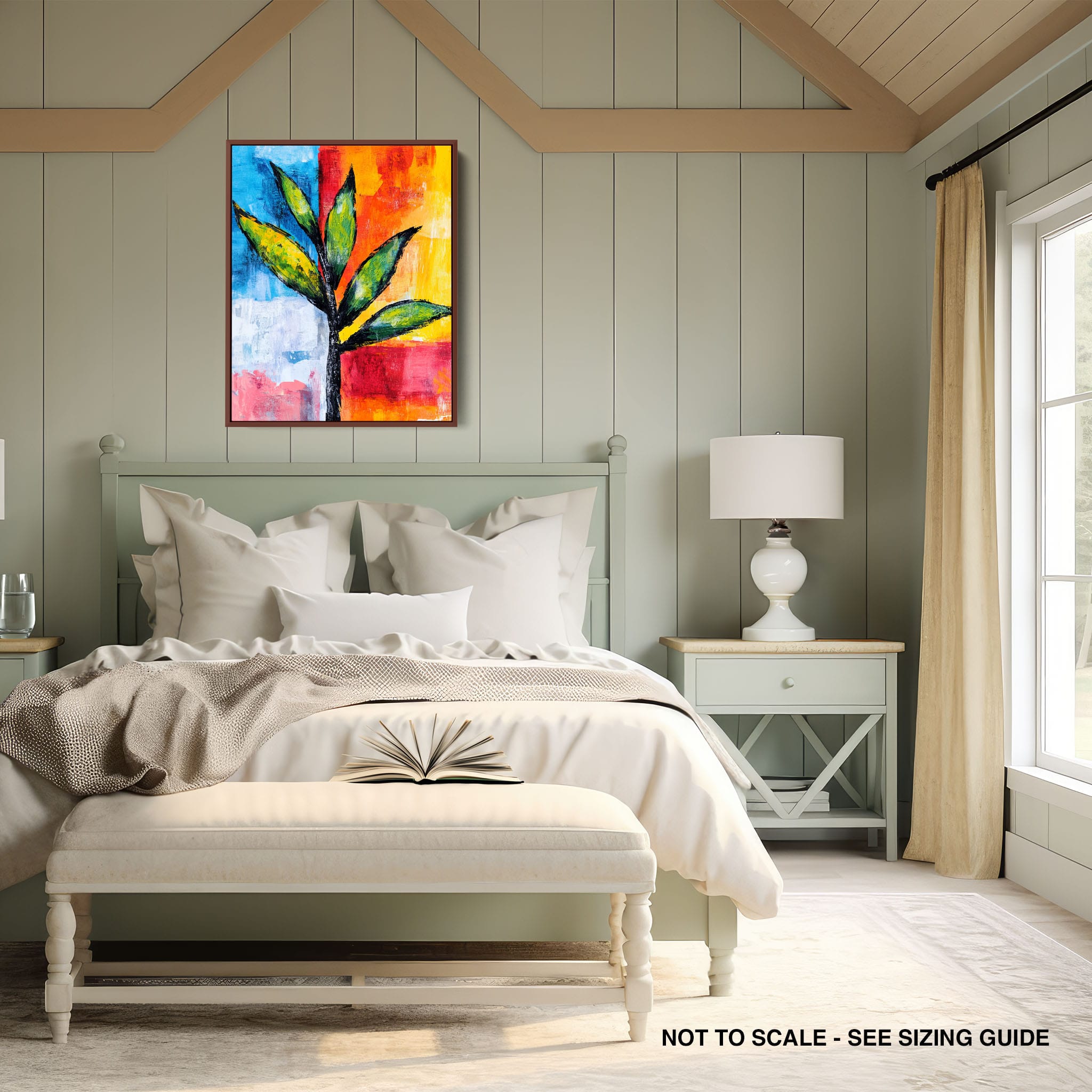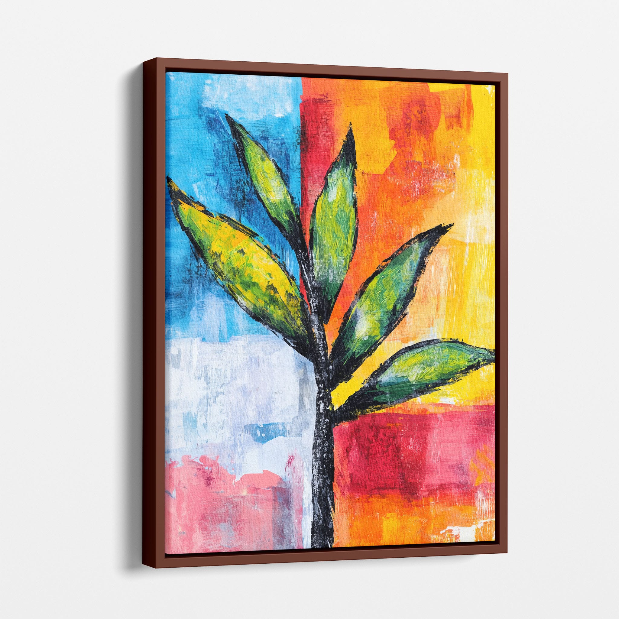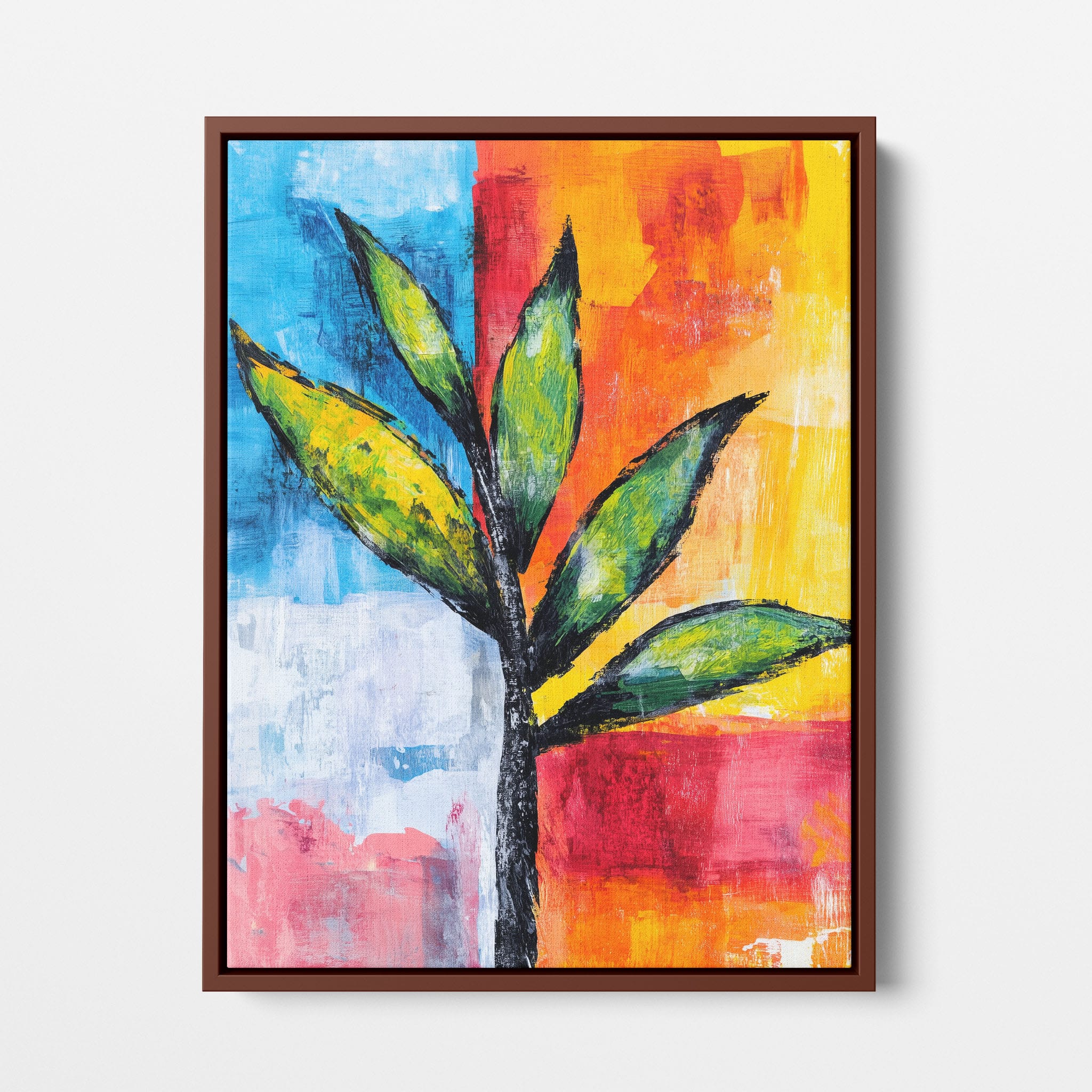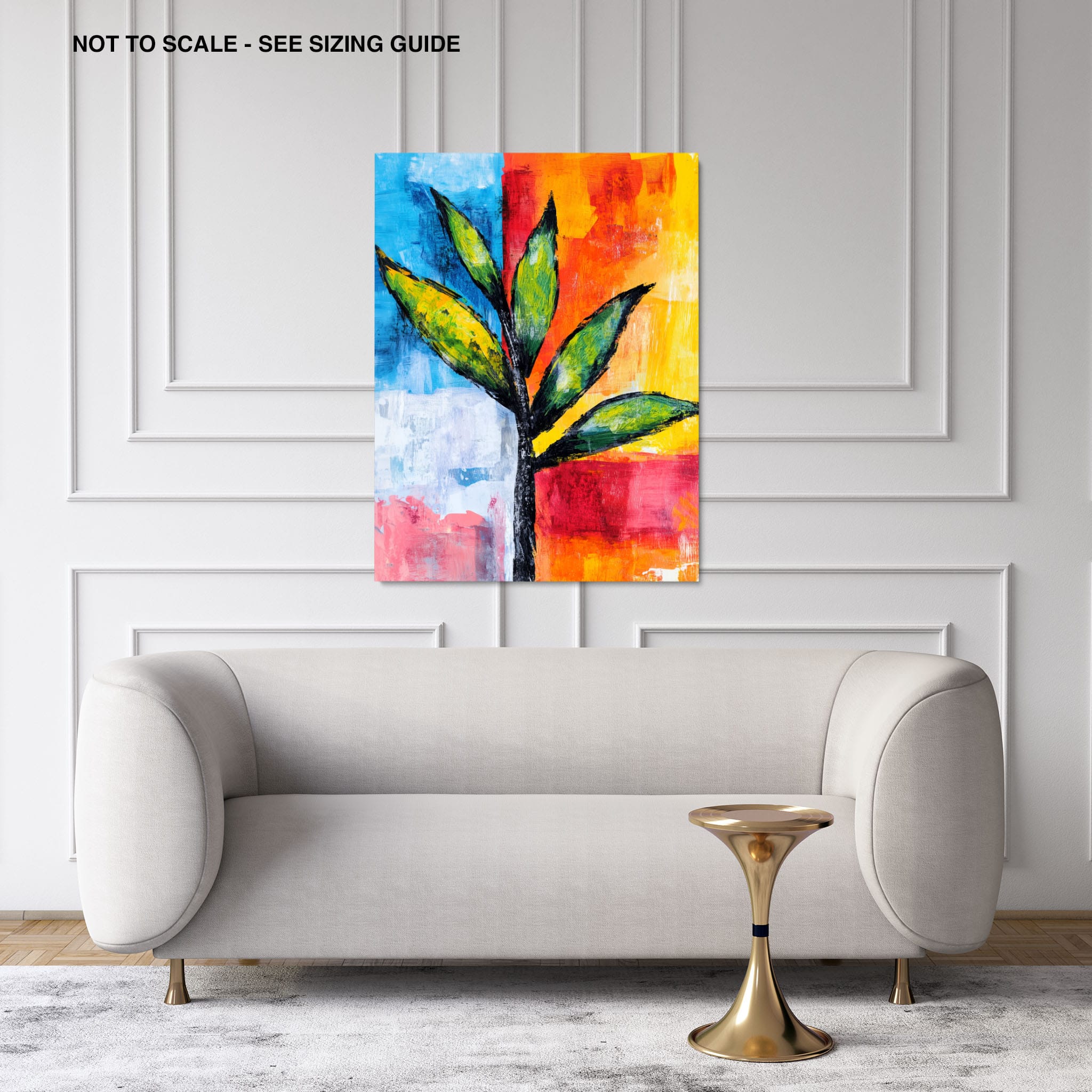 This vibrant painting captures a dynamic sprout set against a striking background of intense color gradients. With broad, confident brush strokes reminiscent of Expressionism, the artist brings life to the canvas, blending Modern art influences with Abstract designs. Each leaf is highlighted in varying shades of green, seeming almost to stretch towards the warmth of the reds, yellows, and blues that envelop it. This artwork is perfect for those seeking a bold statement piece that combines artistic intensity with a celebration of natural forms. Add this piece to your living space to introduce a splash of color and creativity.