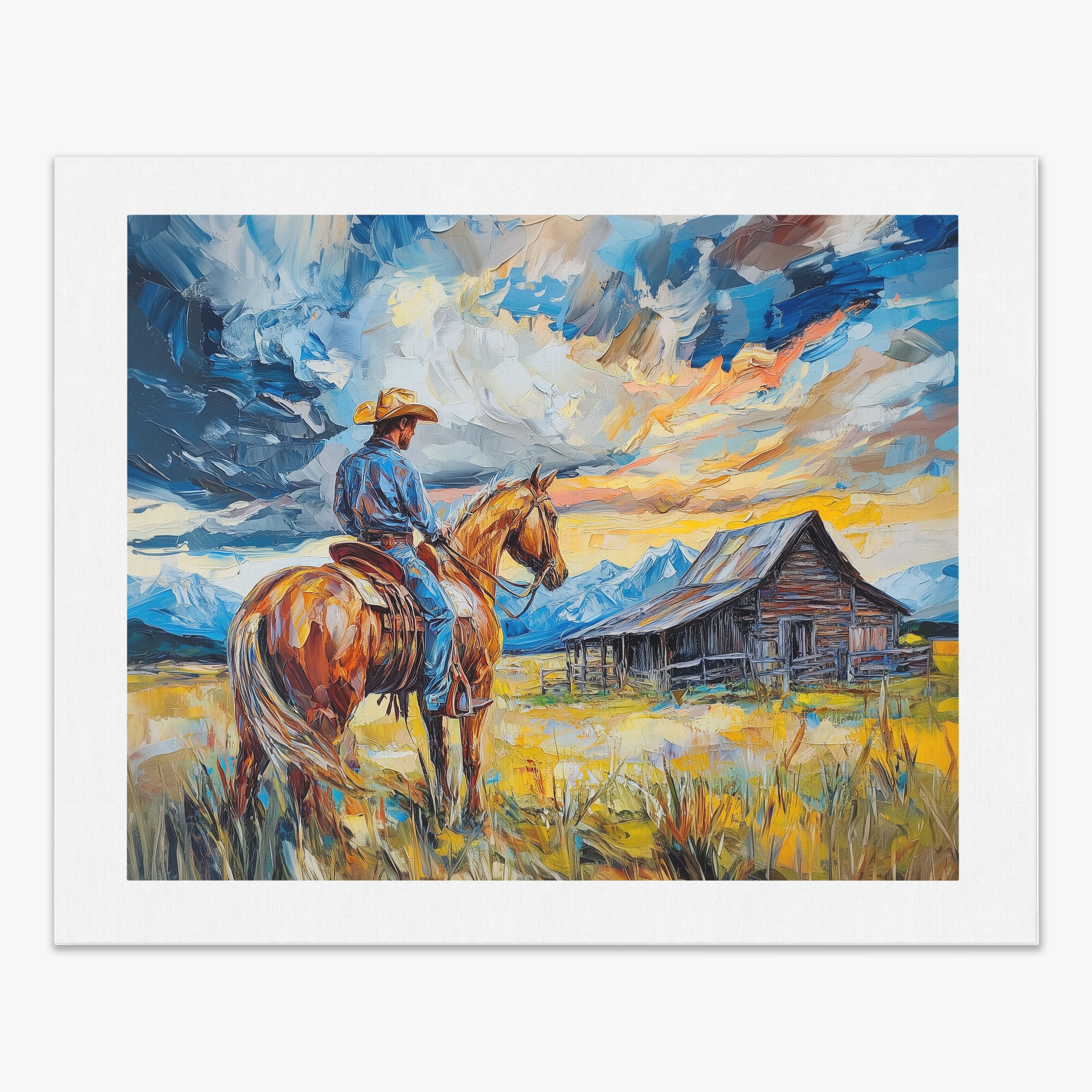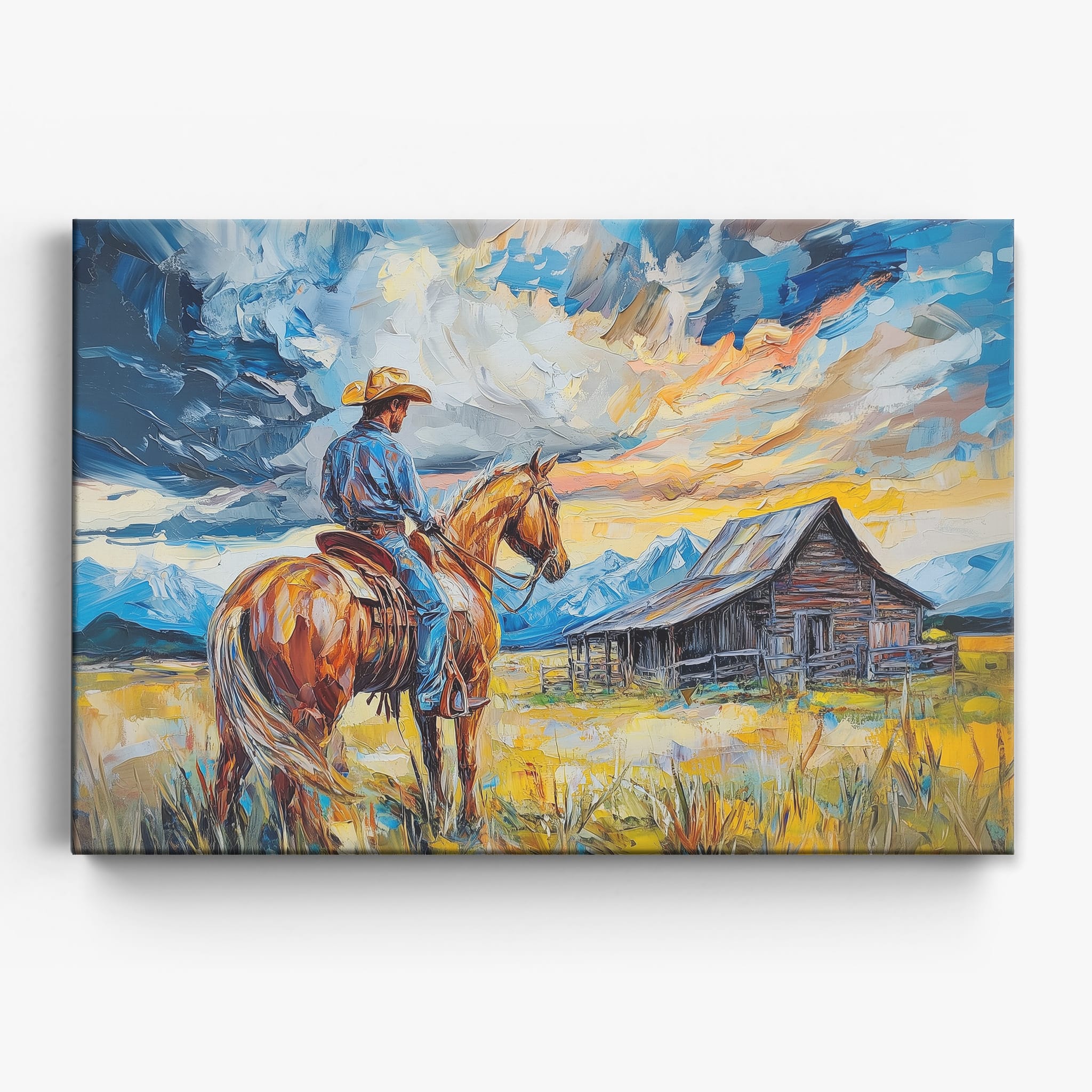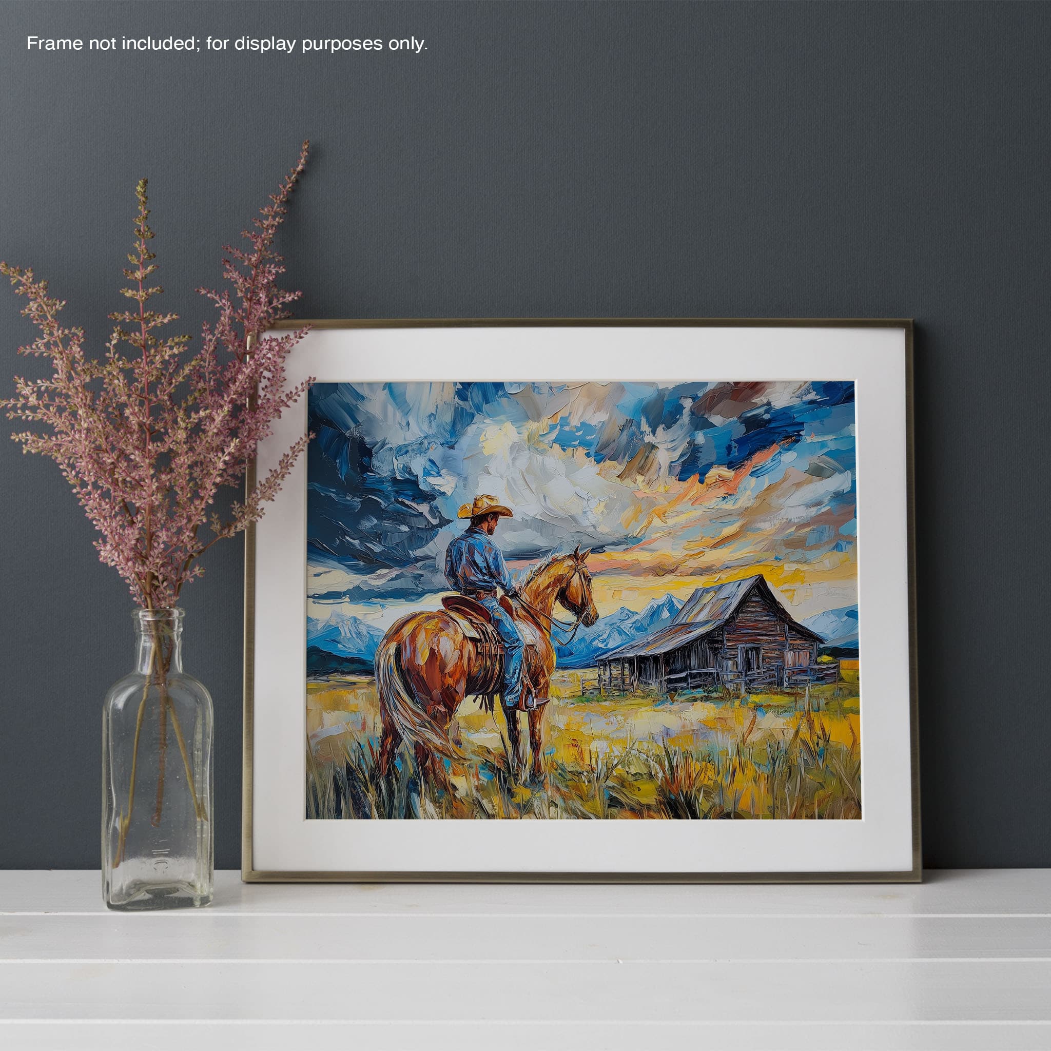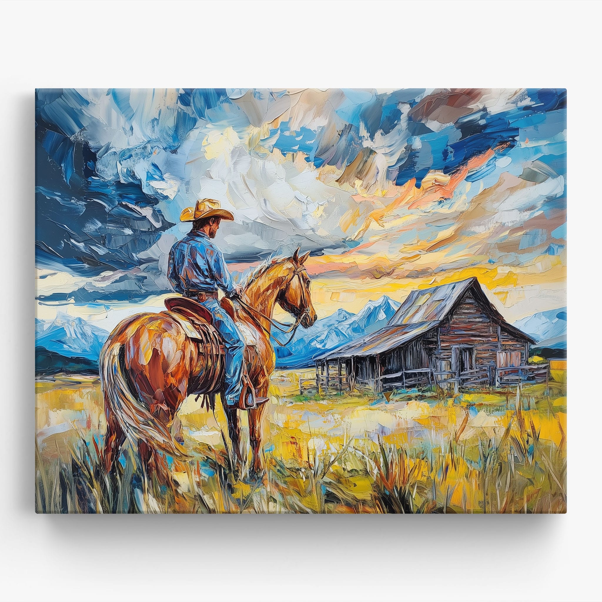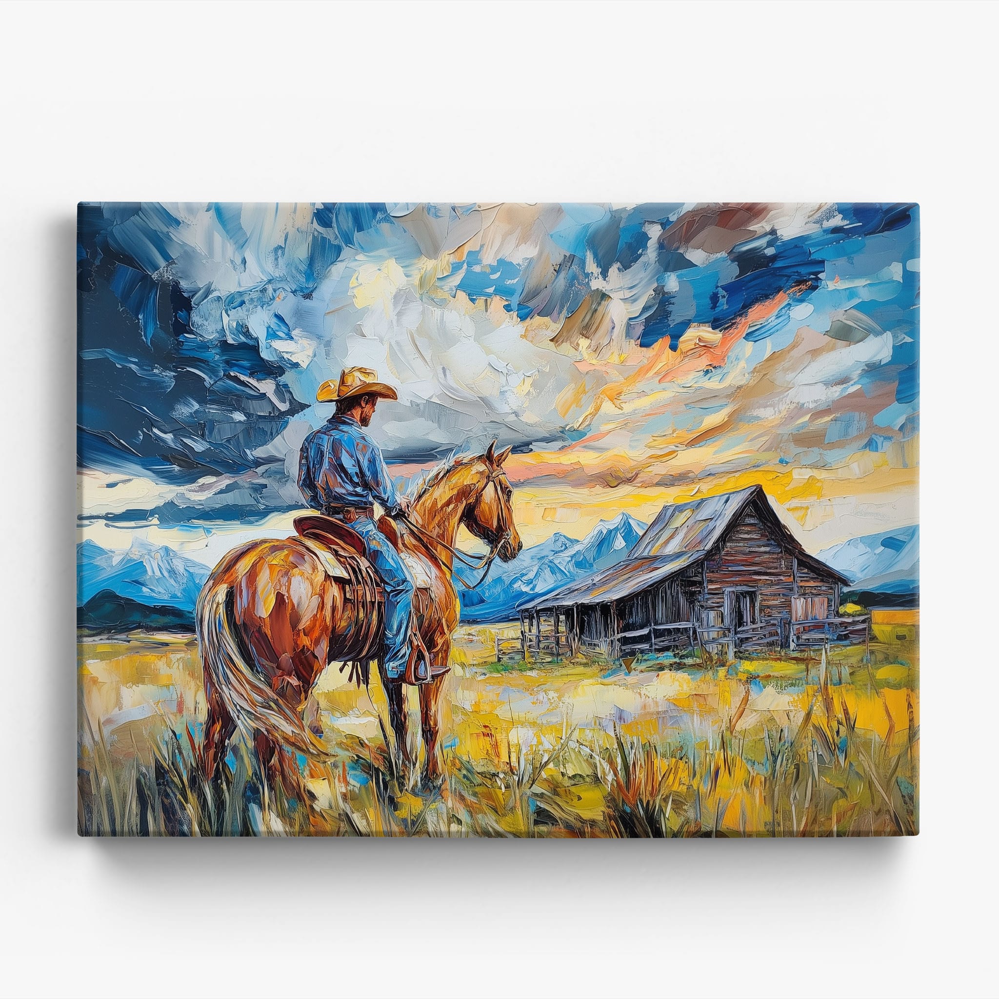 A cowboy on horseback gazes towards a rustic barn set against a majestic mountain range bathed in the vibrant hues of sunset. This digital oil painting, with its rich textures and dynamic brushstrokes, captures the essence of the American West. The luminous sky and the contrast of shadowy clouds add depth and drama, making this piece a visual feast for art lovers. Perfect for adorning the walls of any home, this artwork is a striking blend of impressionism and Western art, ideal for those seeking to infuse their space with a touch of rugged romance and vibrant color.