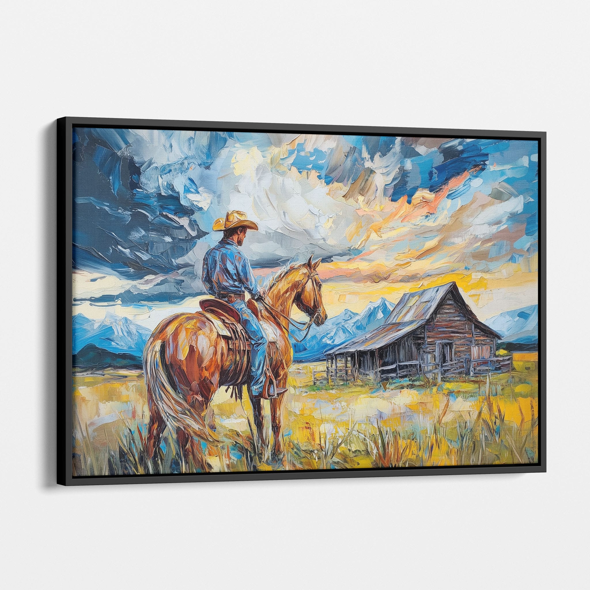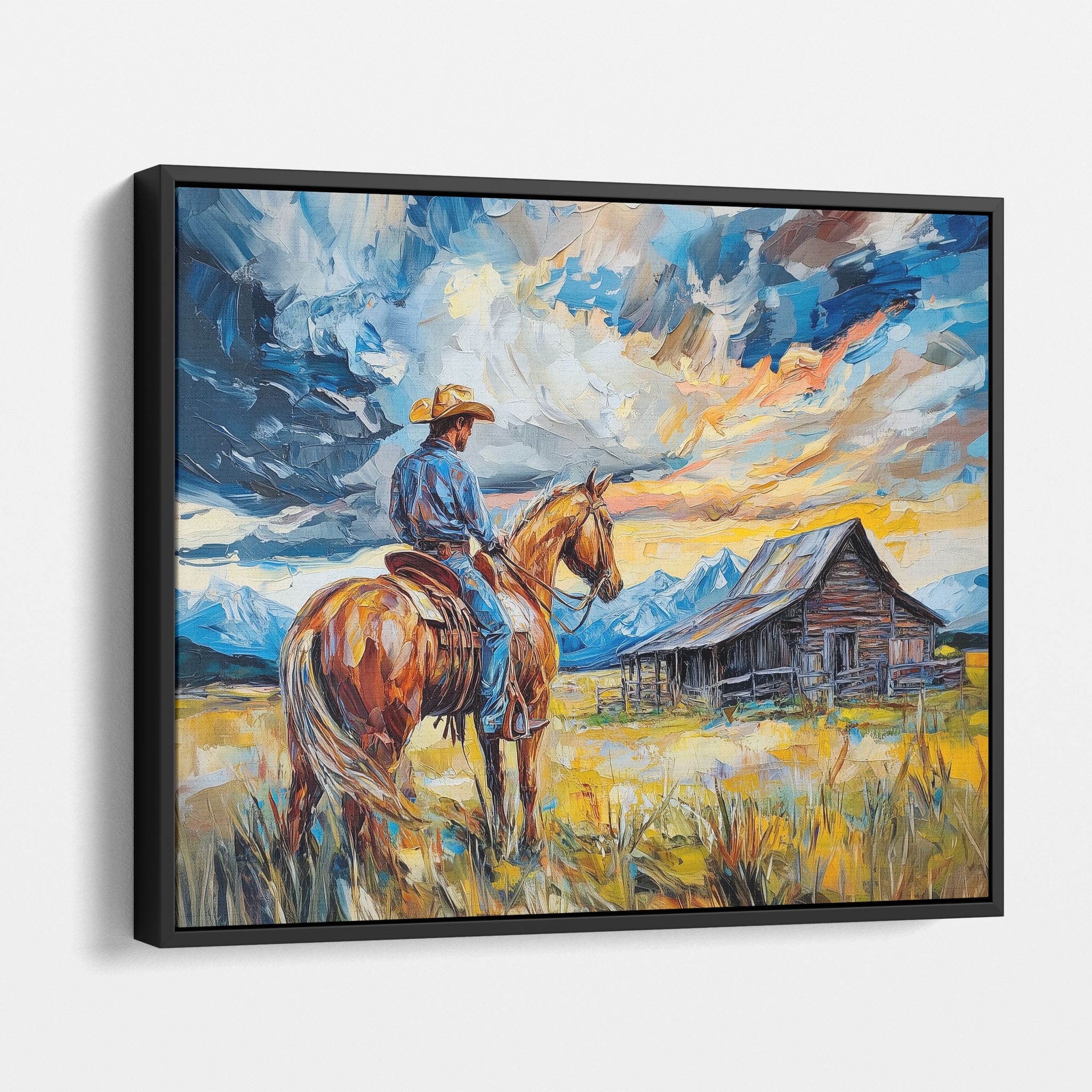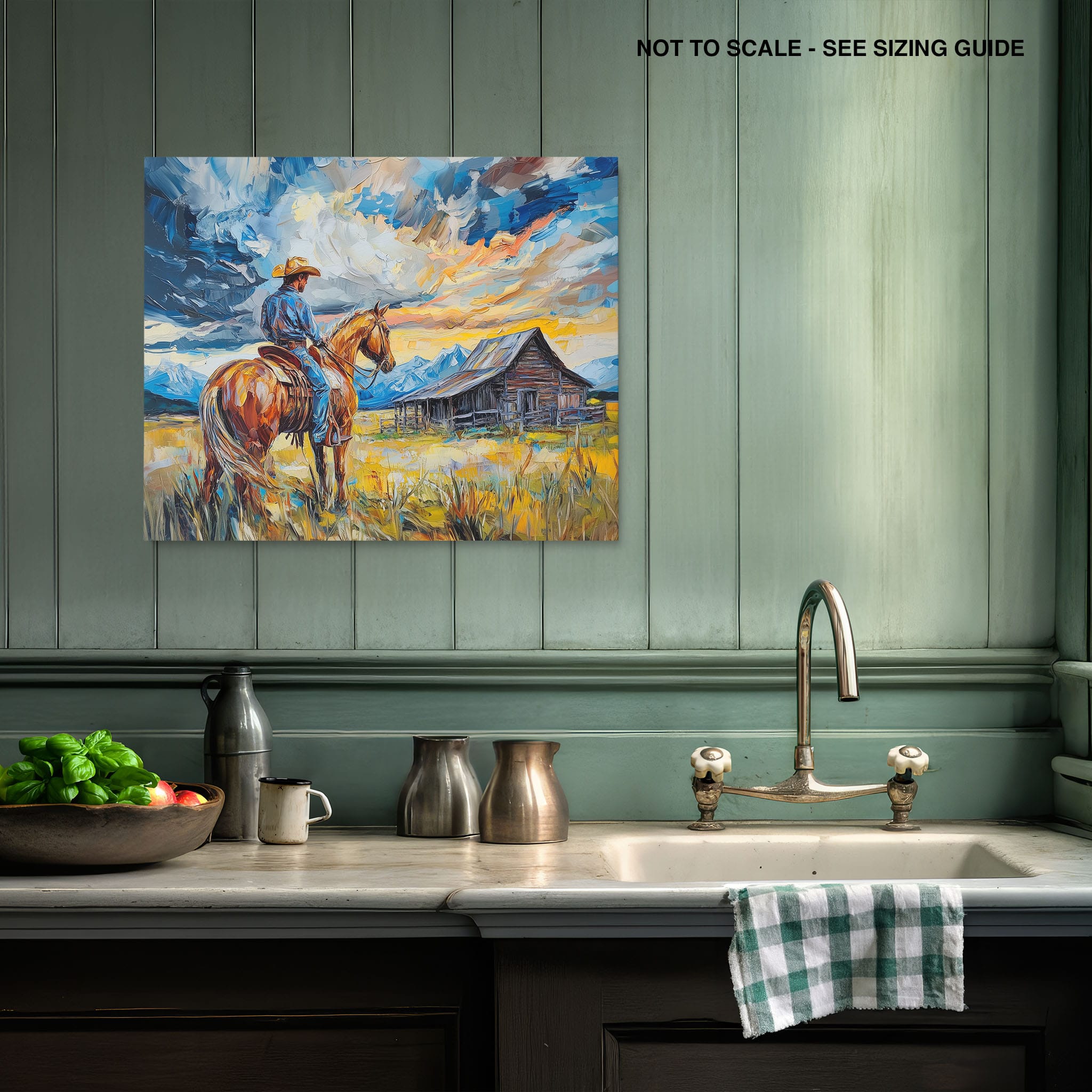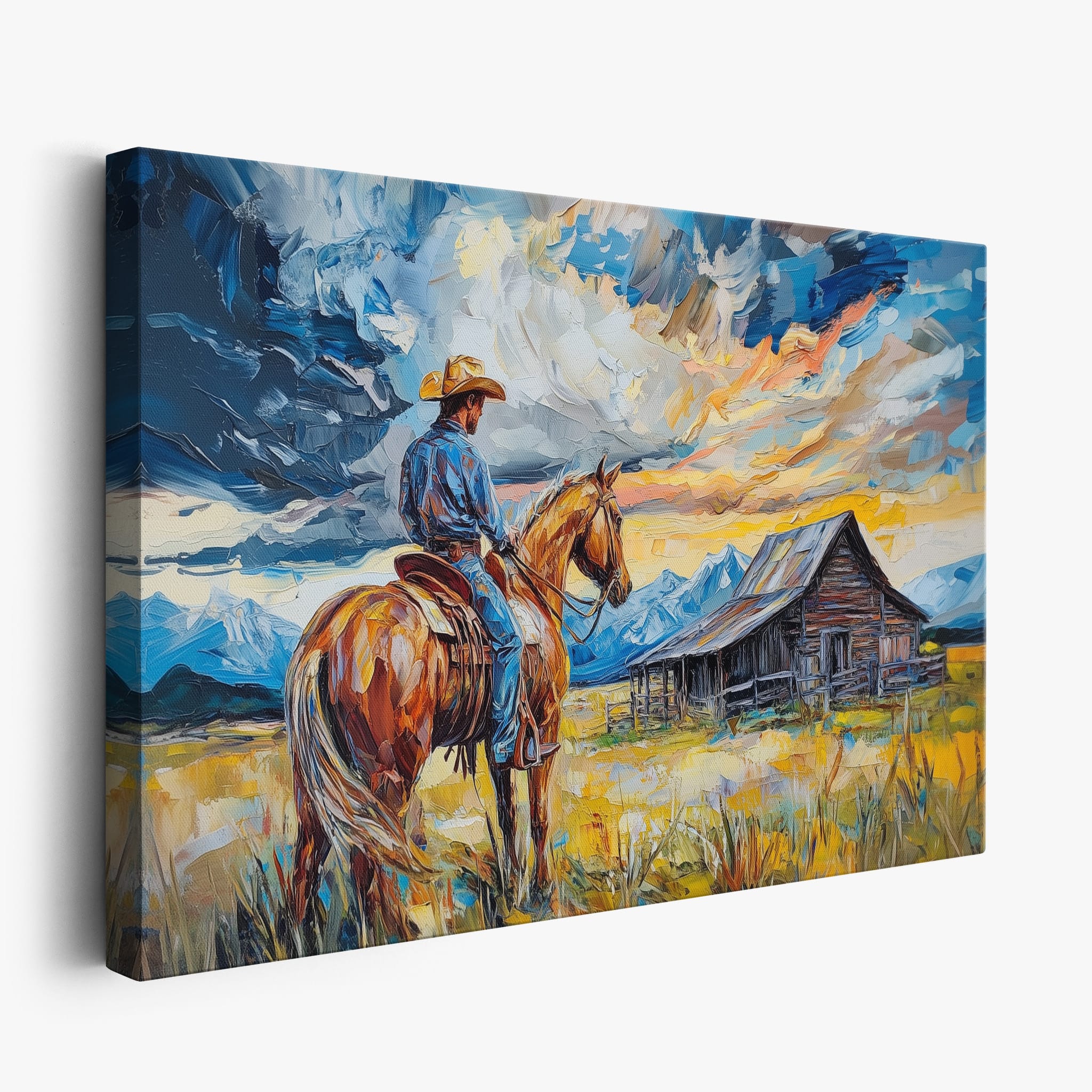 A cowboy on horseback gazes towards a rustic barn set against a majestic mountain range bathed in the vibrant hues of sunset. This digital oil painting, with its rich textures and dynamic brushstrokes, captures the essence of the American West. The luminous sky and the contrast of shadowy clouds add depth and drama, making this piece a visual feast for art lovers. Perfect for adorning the walls of any home, this artwork is a striking blend of impressionism and Western art, ideal for those seeking to infuse their space with a touch of rugged romance and vibrant color.