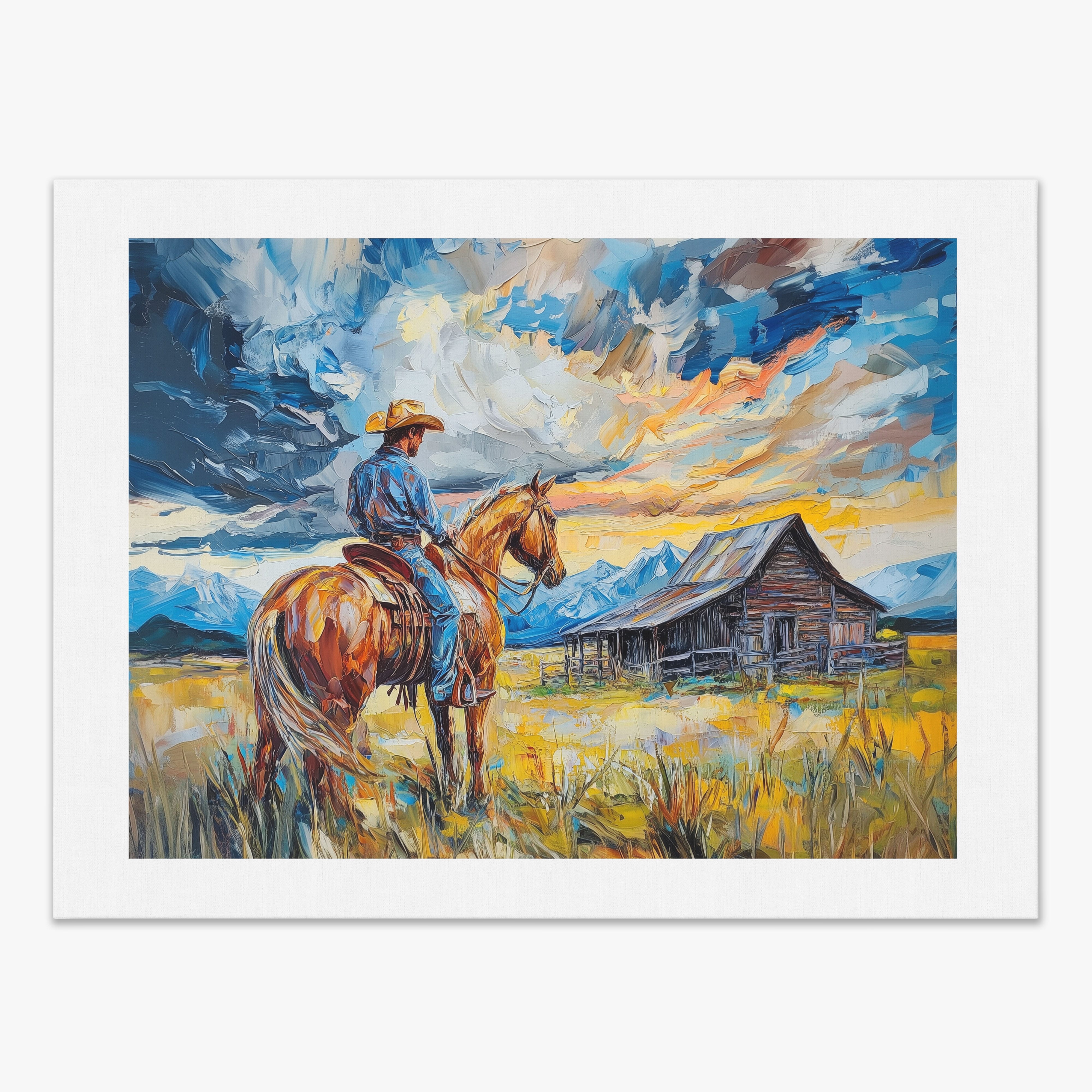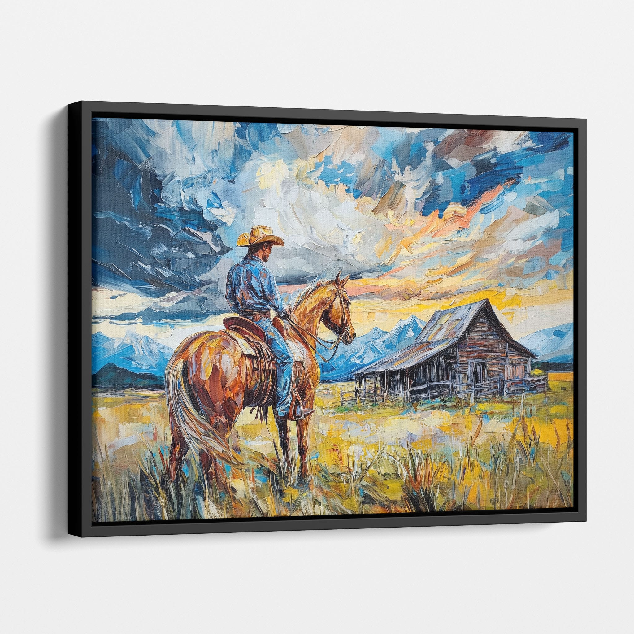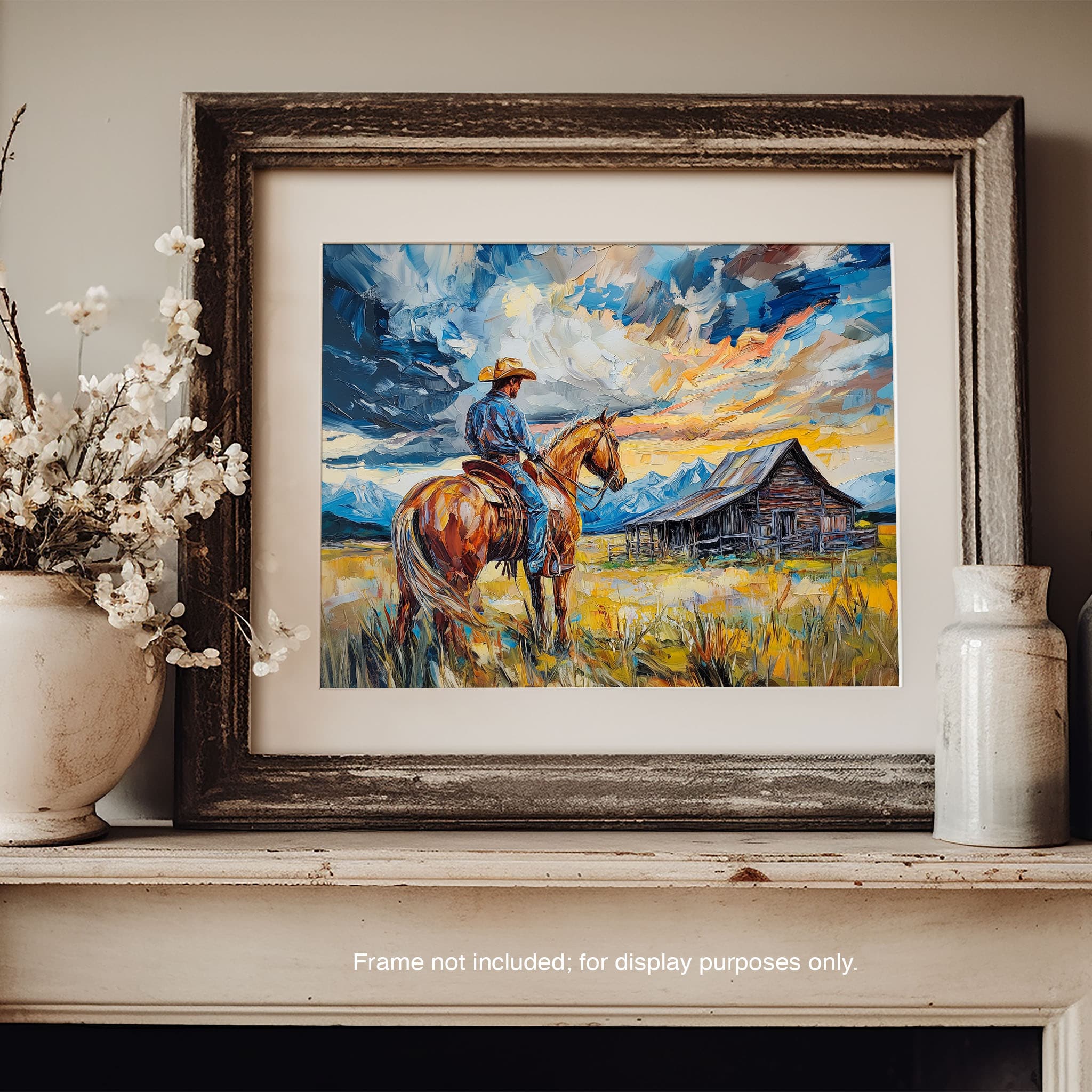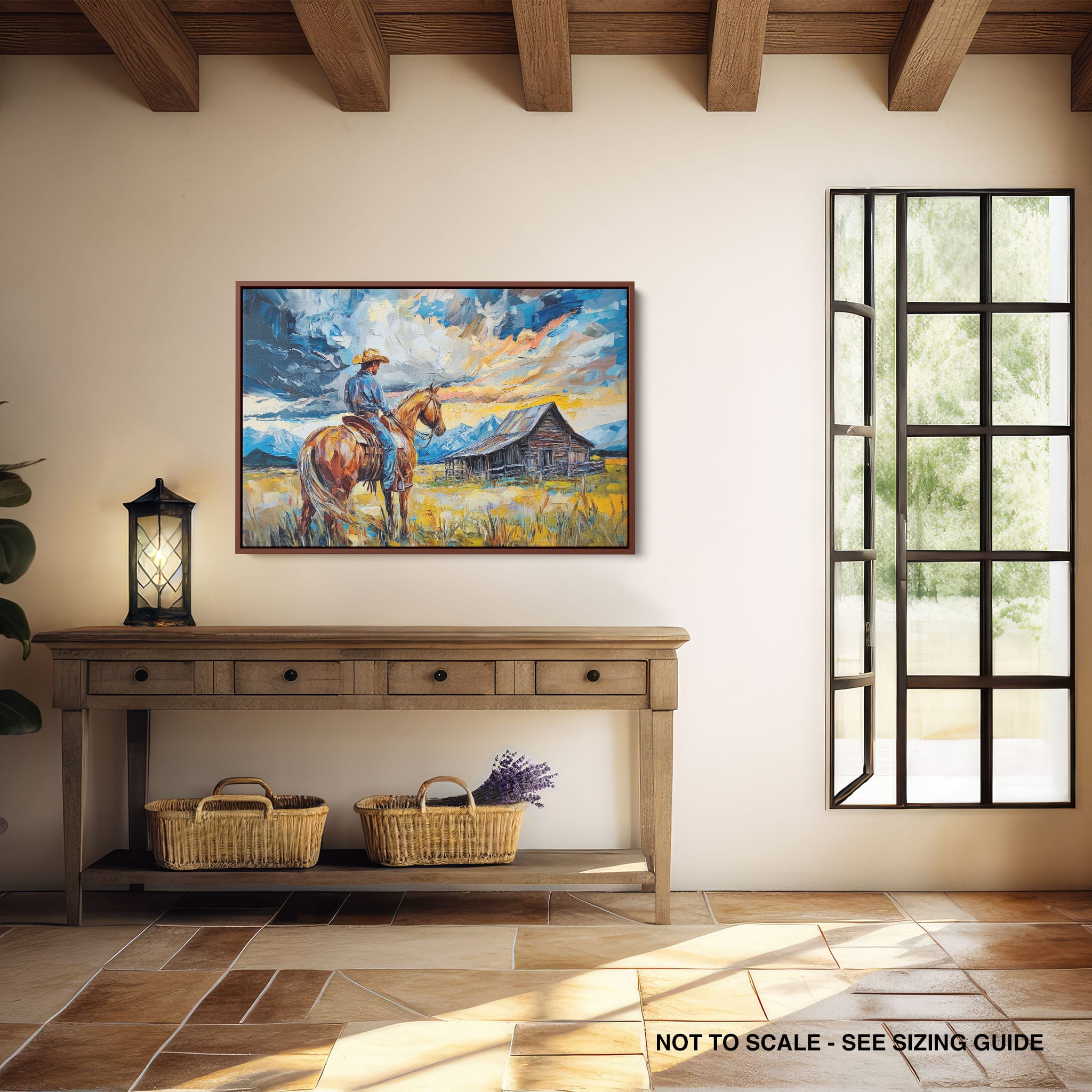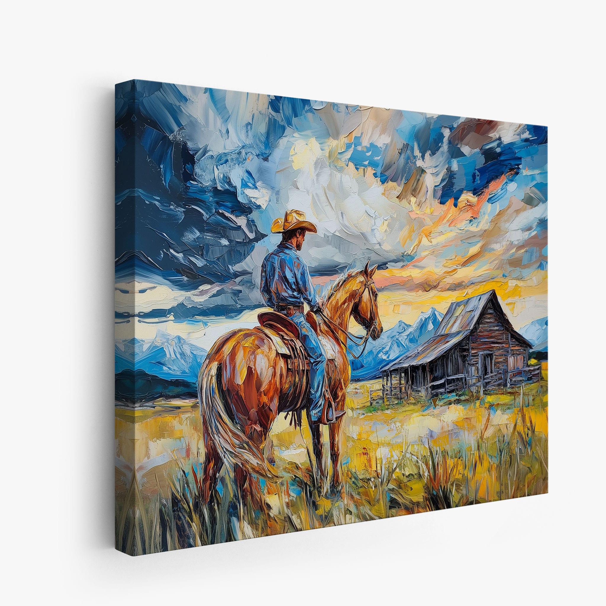 A cowboy on horseback gazes towards a rustic barn set against a majestic mountain range bathed in the vibrant hues of sunset. This digital oil painting, with its rich textures and dynamic brushstrokes, captures the essence of the American West. The luminous sky and the contrast of shadowy clouds add depth and drama, making this piece a visual feast for art lovers. Perfect for adorning the walls of any home, this artwork is a striking blend of impressionism and Western art, ideal for those seeking to infuse their space with a touch of rugged romance and vibrant color.