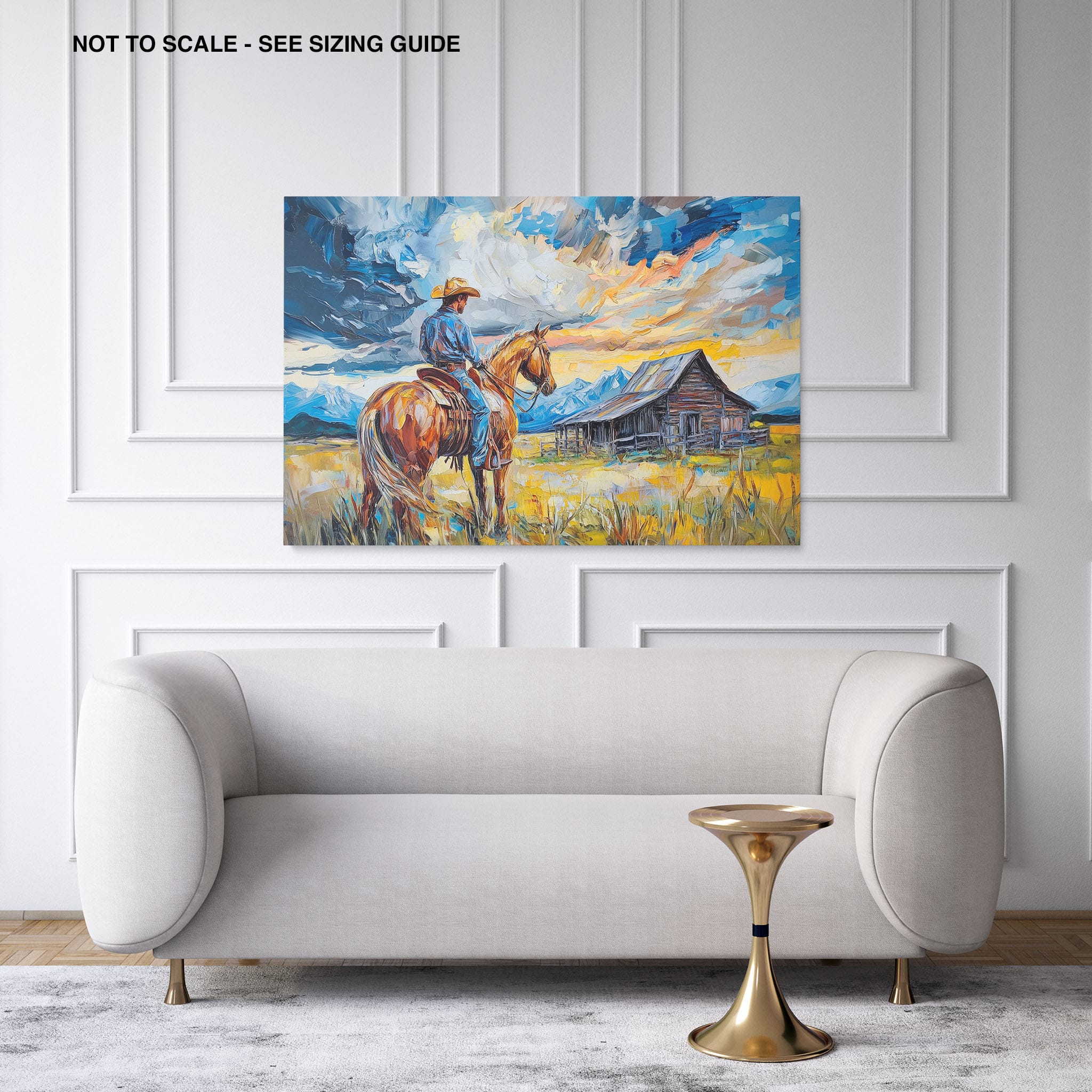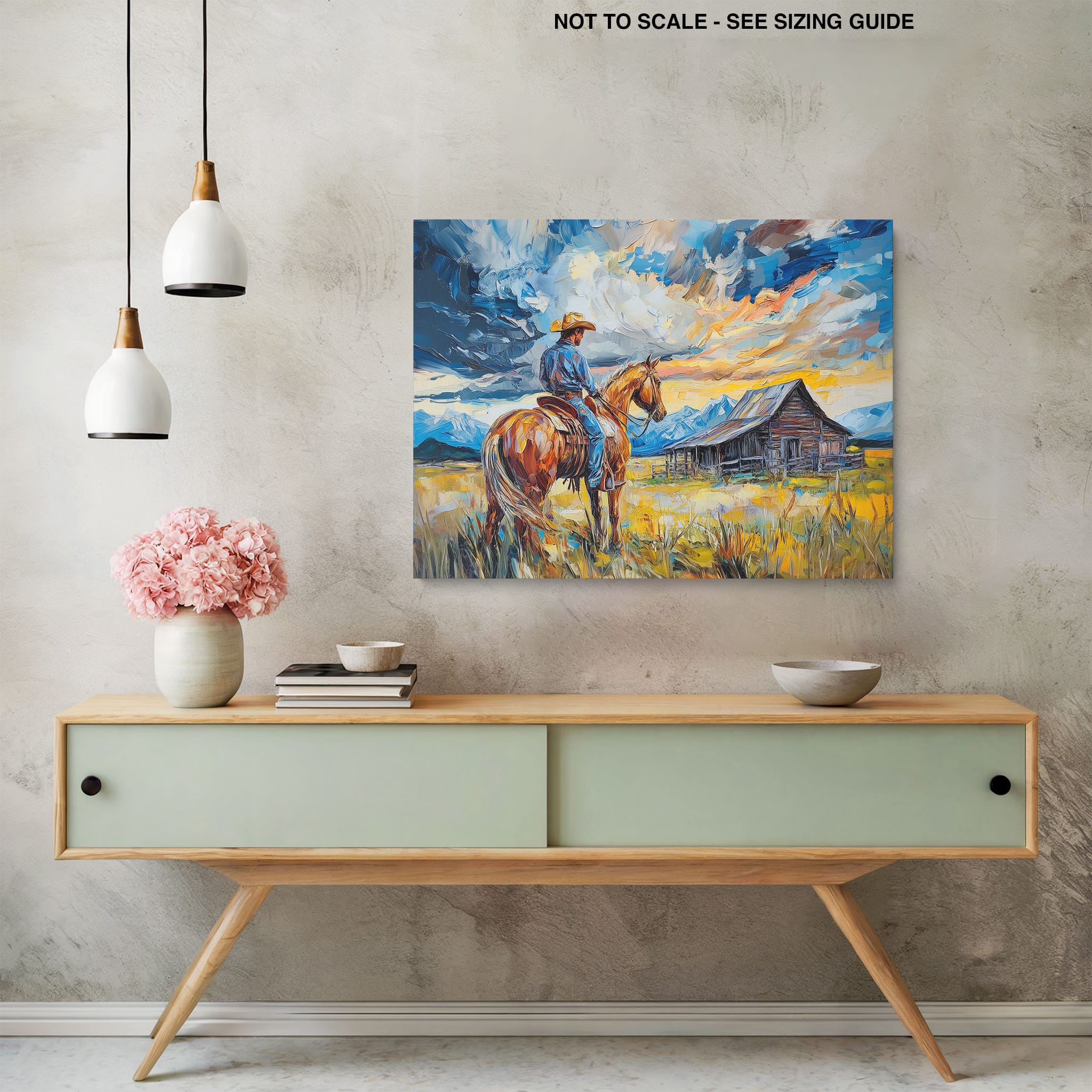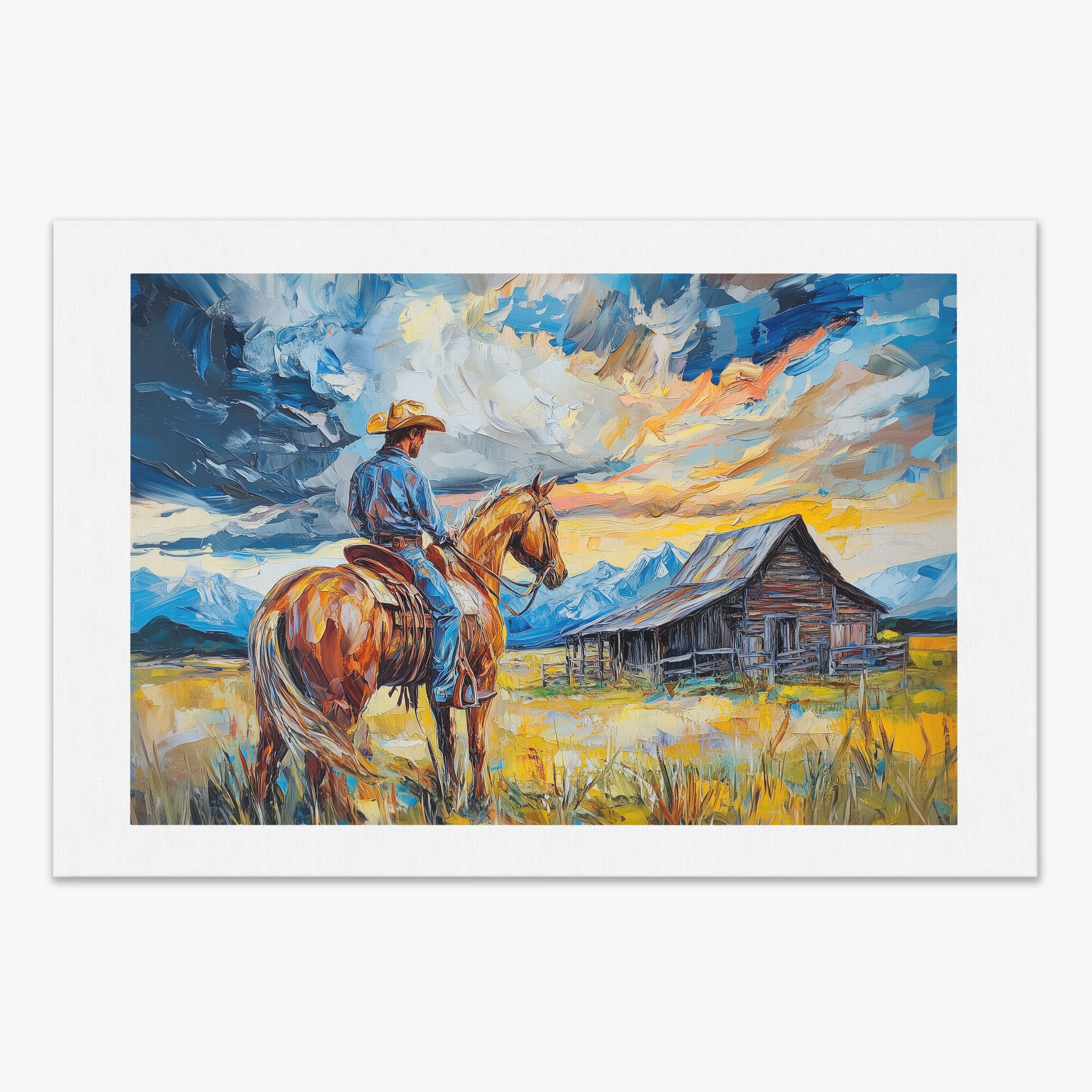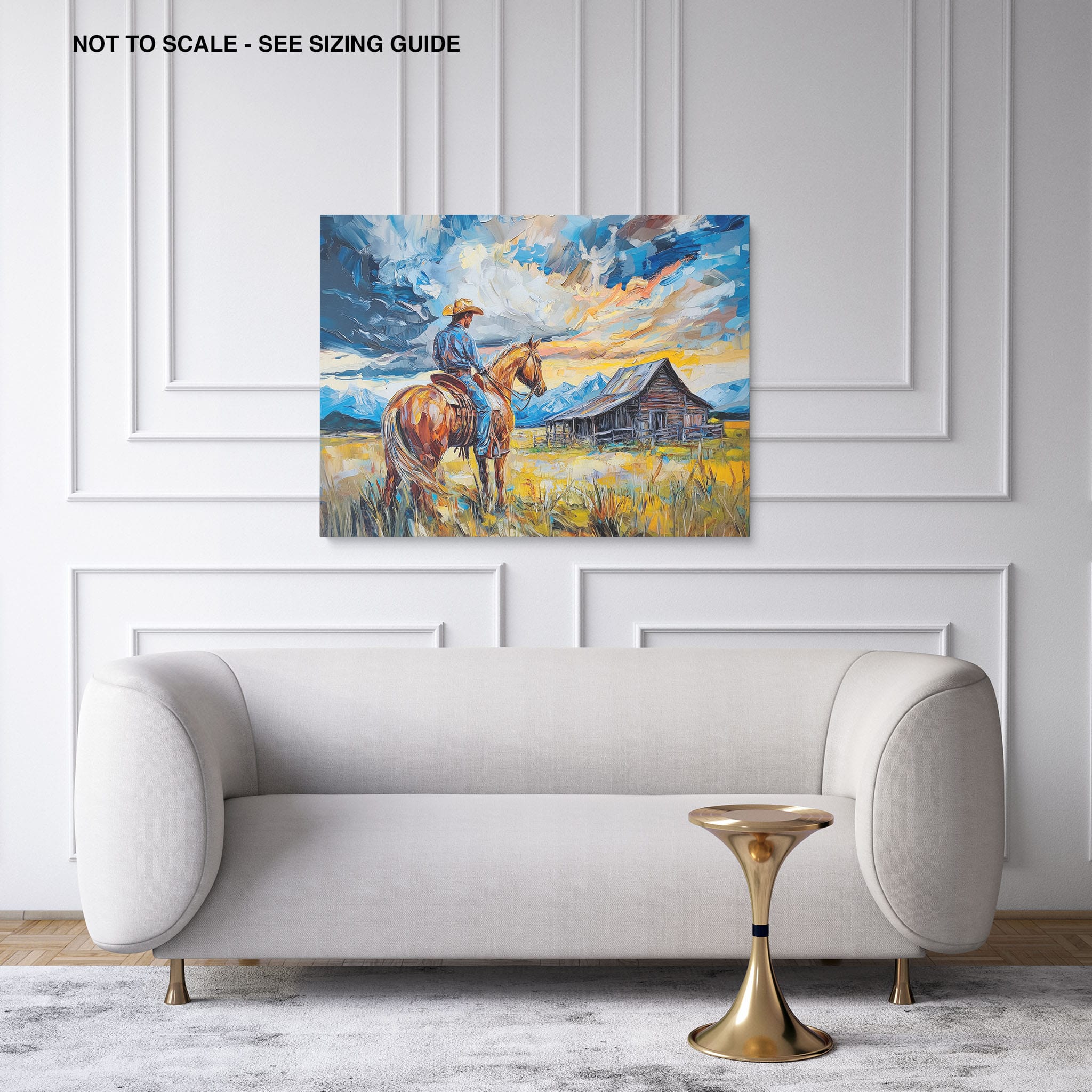 A cowboy on horseback gazes towards a rustic barn set against a majestic mountain range bathed in the vibrant hues of sunset. This digital oil painting, with its rich textures and dynamic brushstrokes, captures the essence of the American West. The luminous sky and the contrast of shadowy clouds add depth and drama, making this piece a visual feast for art lovers. Perfect for adorning the walls of any home, this artwork is a striking blend of impressionism and Western art, ideal for those seeking to infuse their space with a touch of rugged romance and vibrant color.