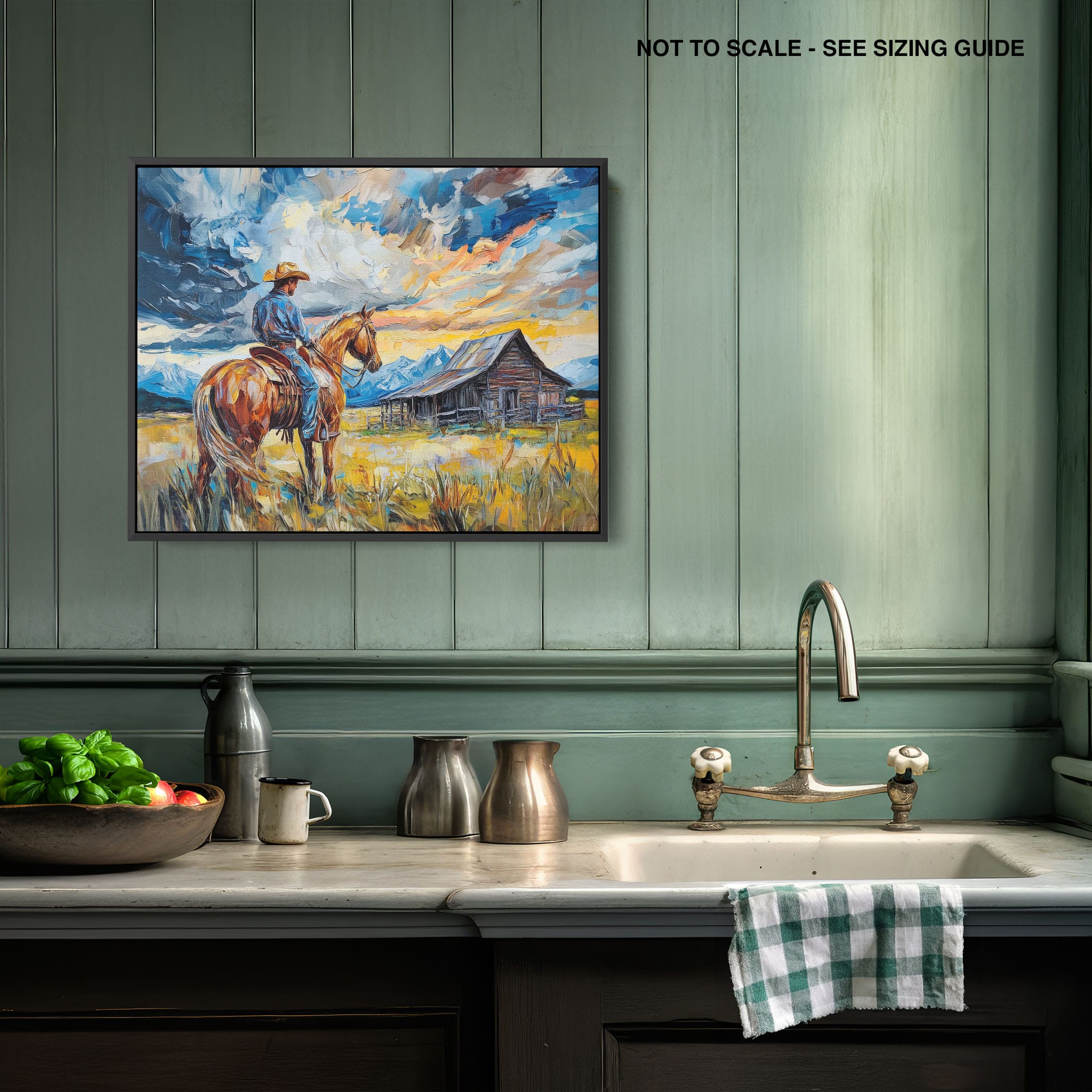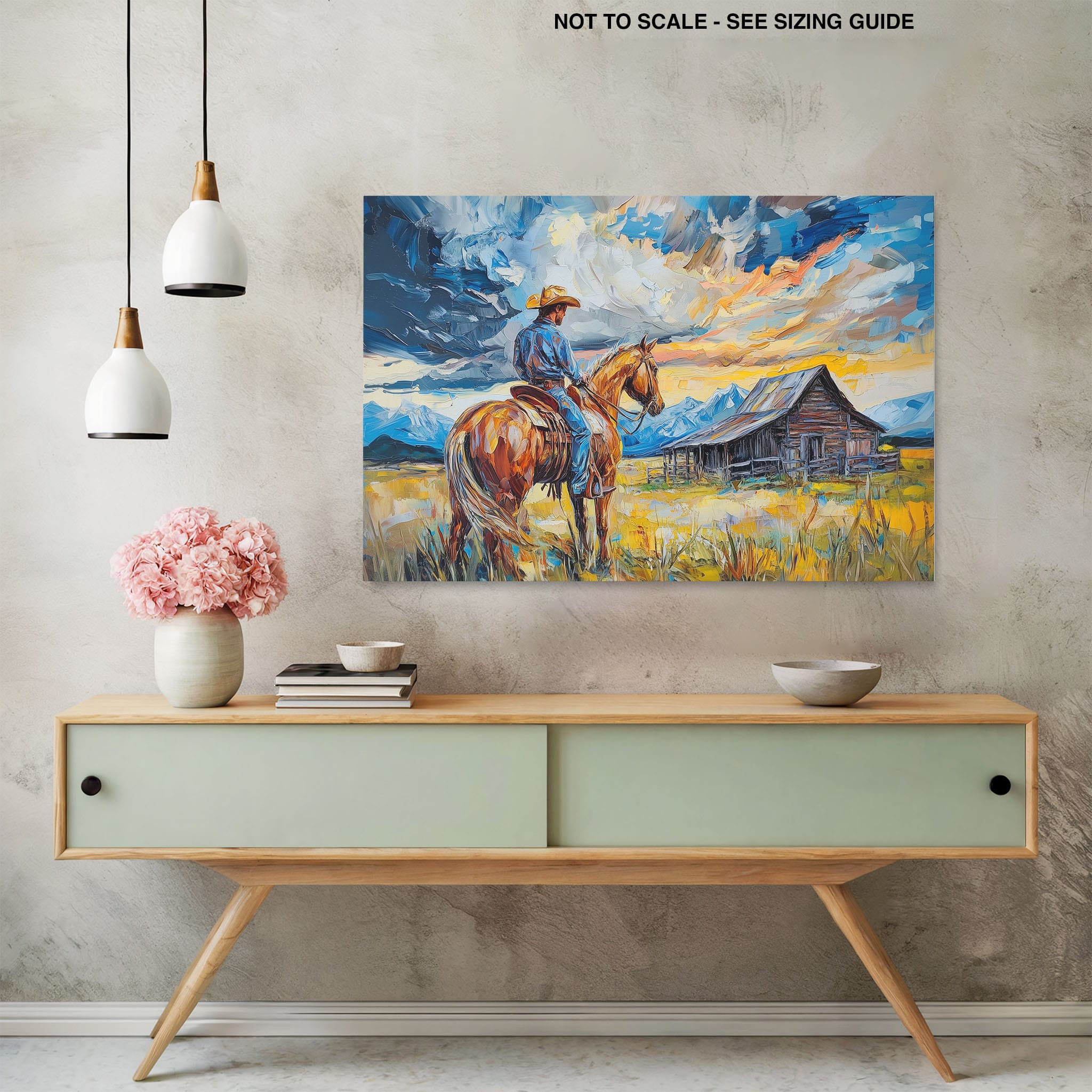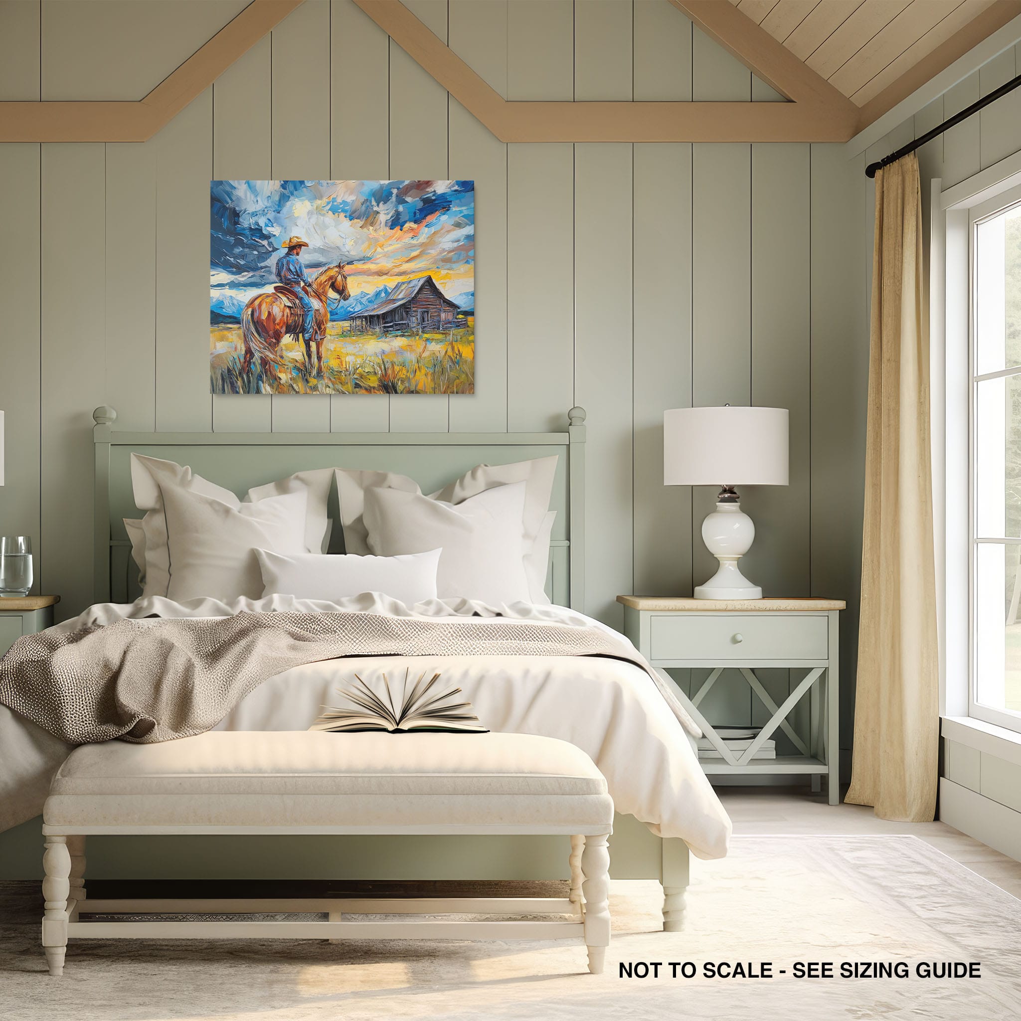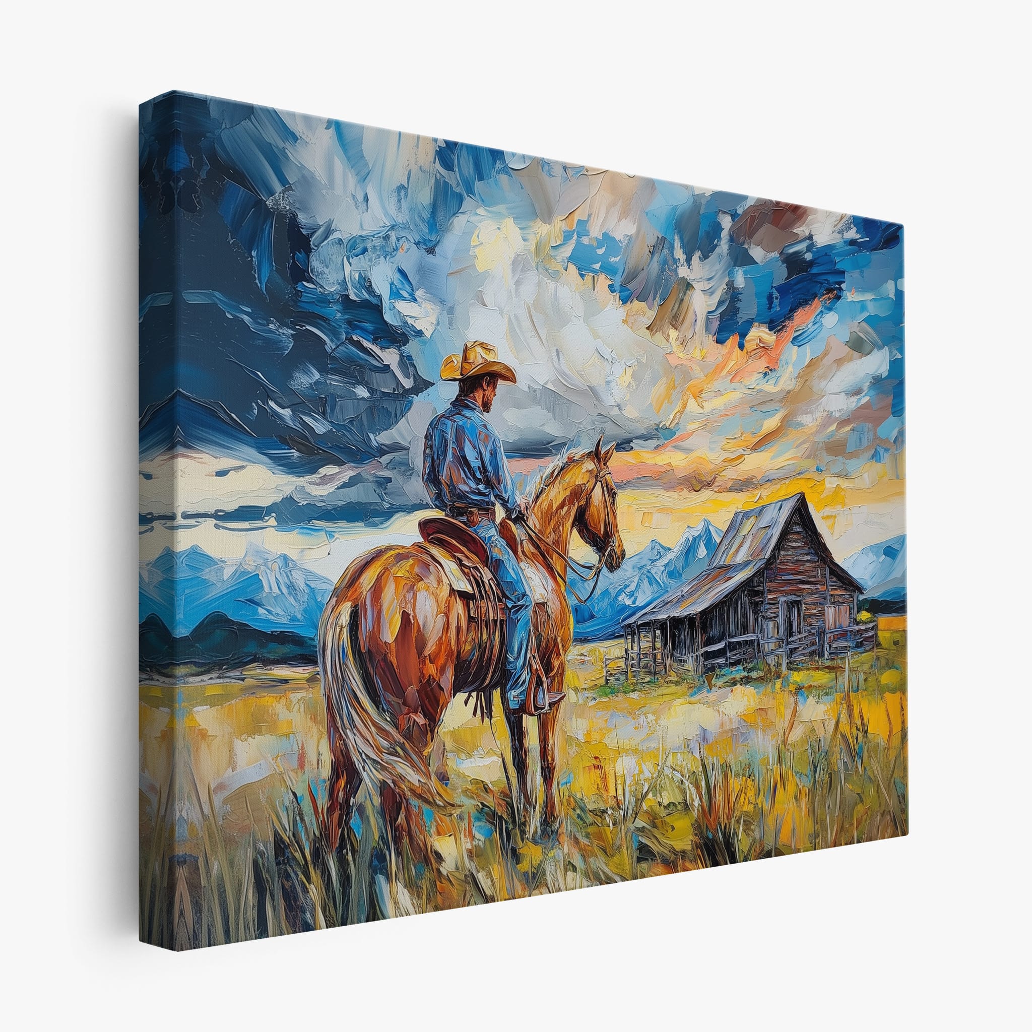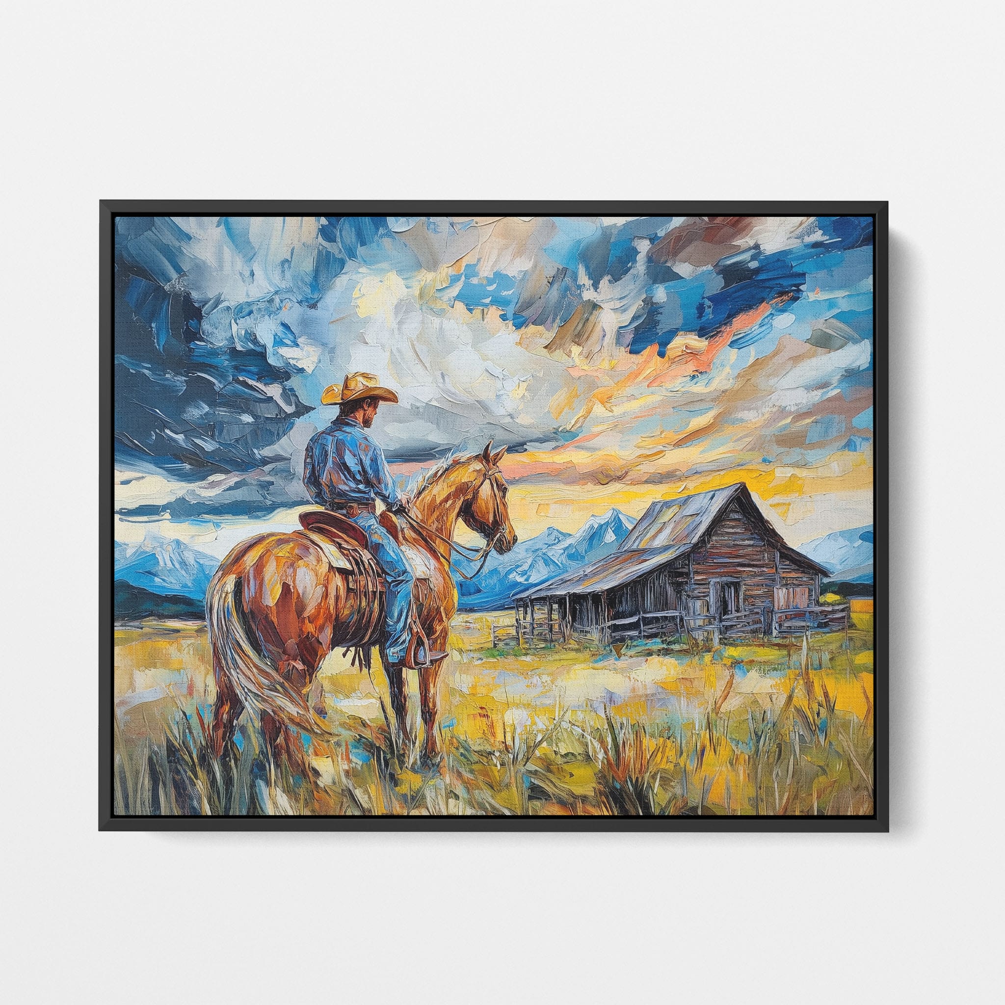 A cowboy on horseback gazes towards a rustic barn set against a majestic mountain range bathed in the vibrant hues of sunset. This digital oil painting, with its rich textures and dynamic brushstrokes, captures the essence of the American West. The luminous sky and the contrast of shadowy clouds add depth and drama, making this piece a visual feast for art lovers. Perfect for adorning the walls of any home, this artwork is a striking blend of impressionism and Western art, ideal for those seeking to infuse their space with a touch of rugged romance and vibrant color.