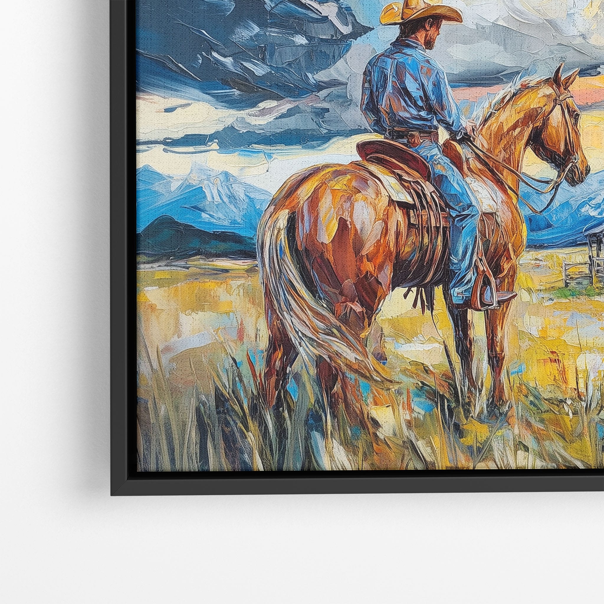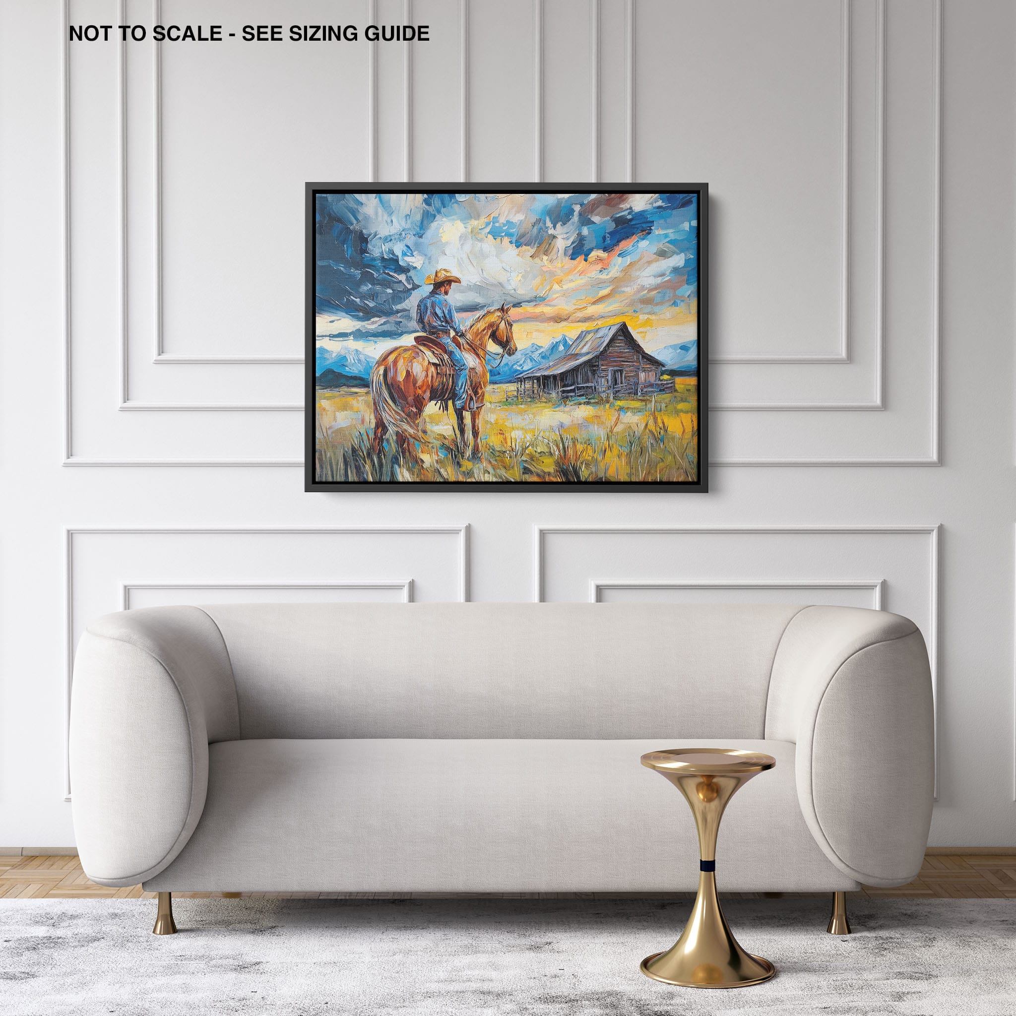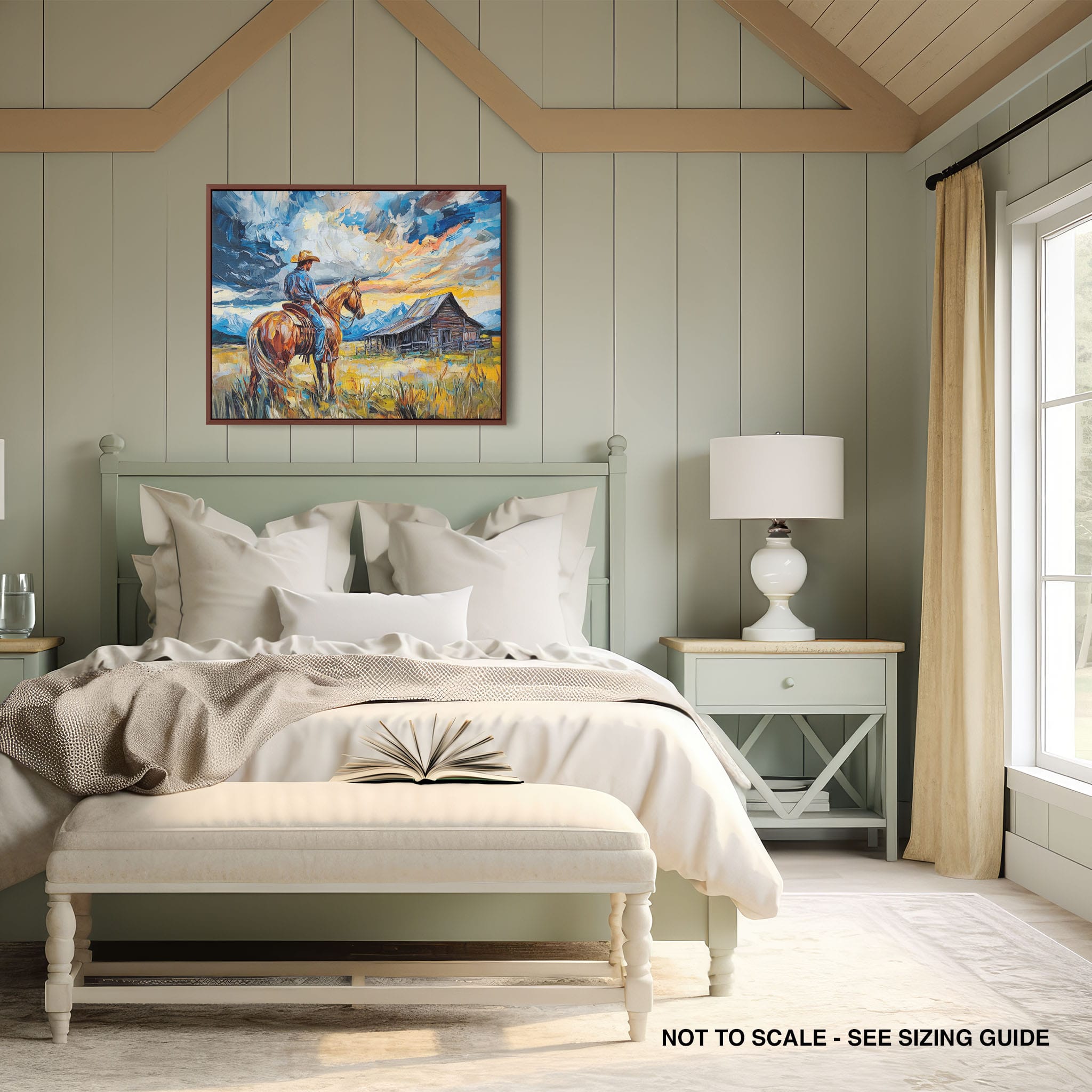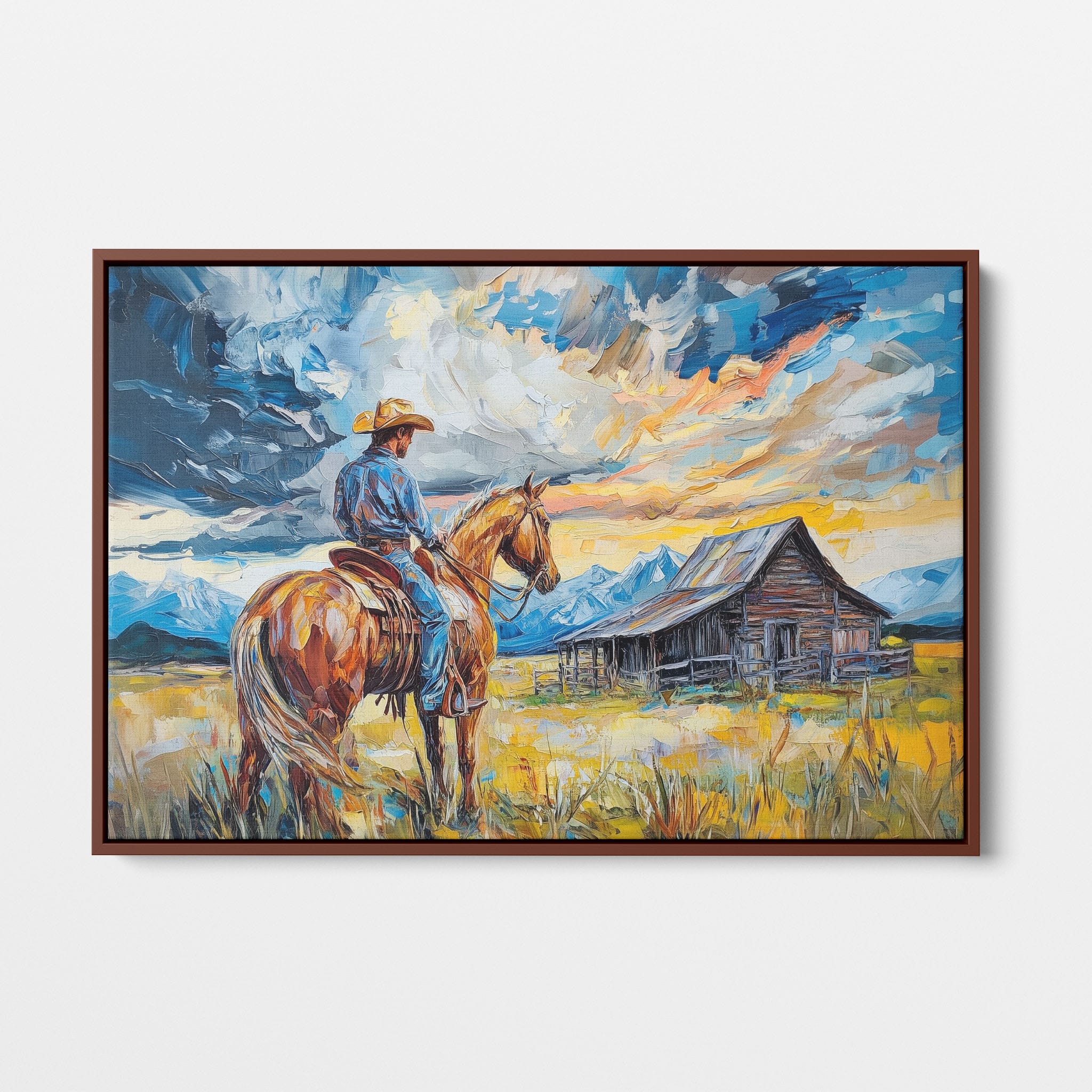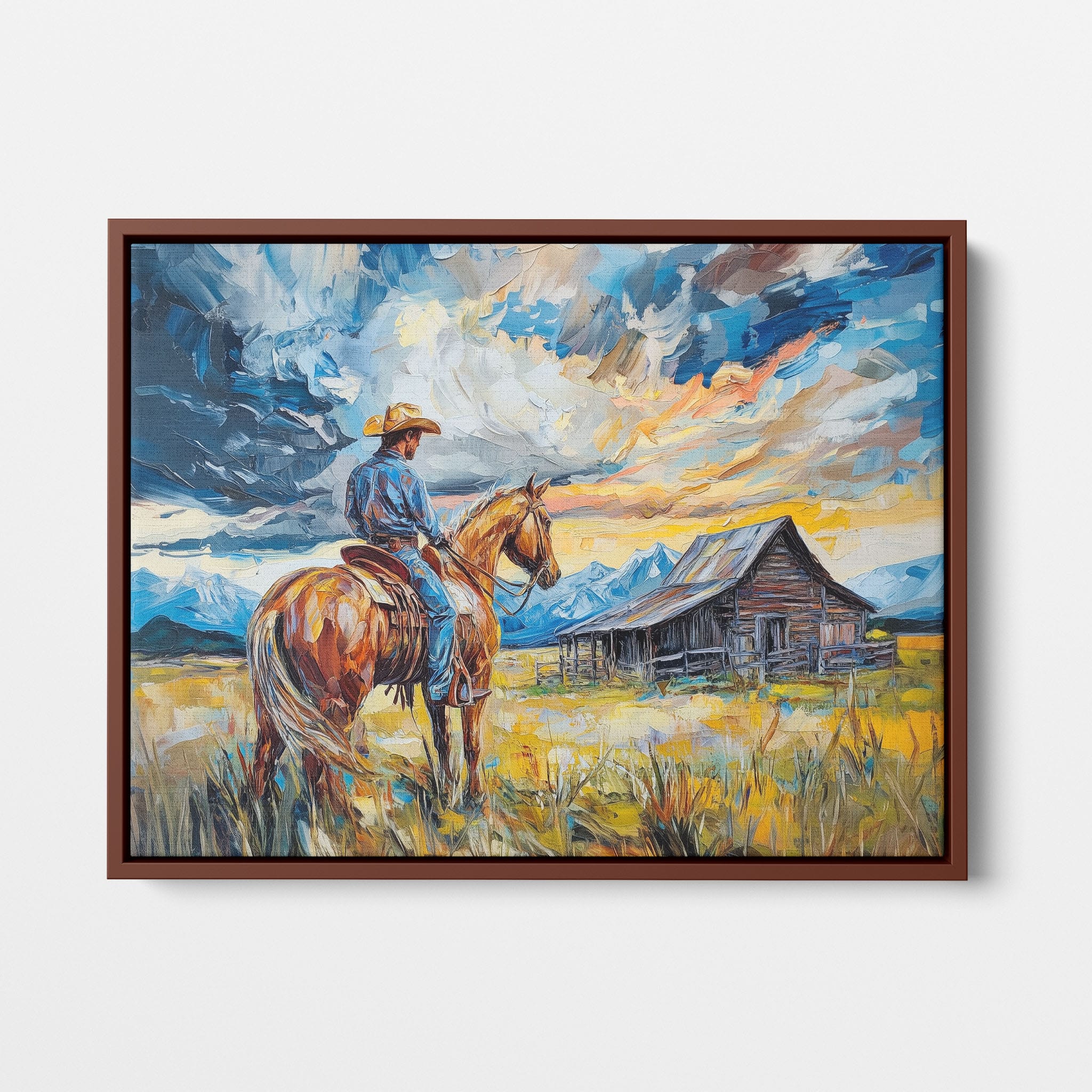 A cowboy on horseback gazes towards a rustic barn set against a majestic mountain range bathed in the vibrant hues of sunset. This digital oil painting, with its rich textures and dynamic brushstrokes, captures the essence of the American West. The luminous sky and the contrast of shadowy clouds add depth and drama, making this piece a visual feast for art lovers. Perfect for adorning the walls of any home, this artwork is a striking blend of impressionism and Western art, ideal for those seeking to infuse their space with a touch of rugged romance and vibrant color.