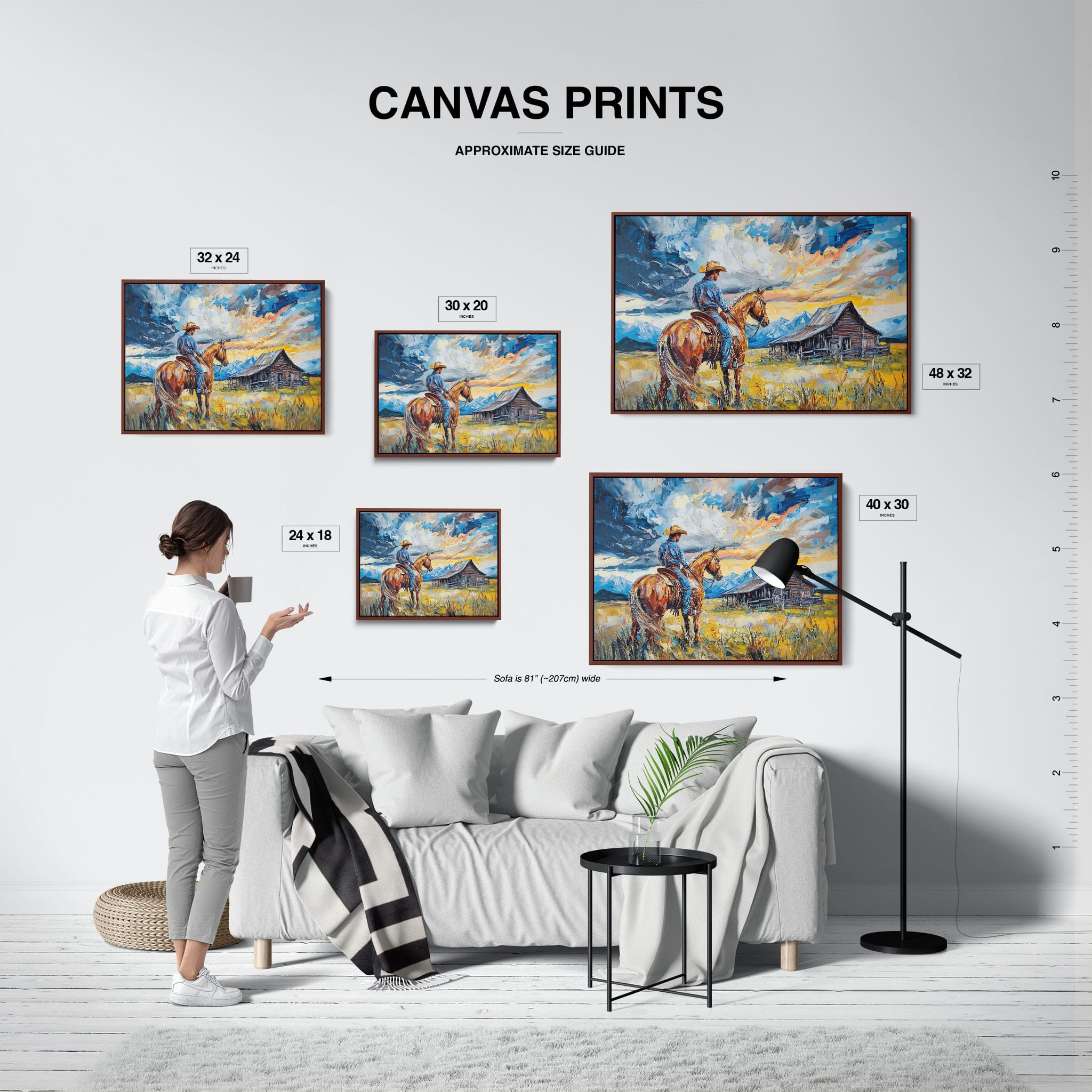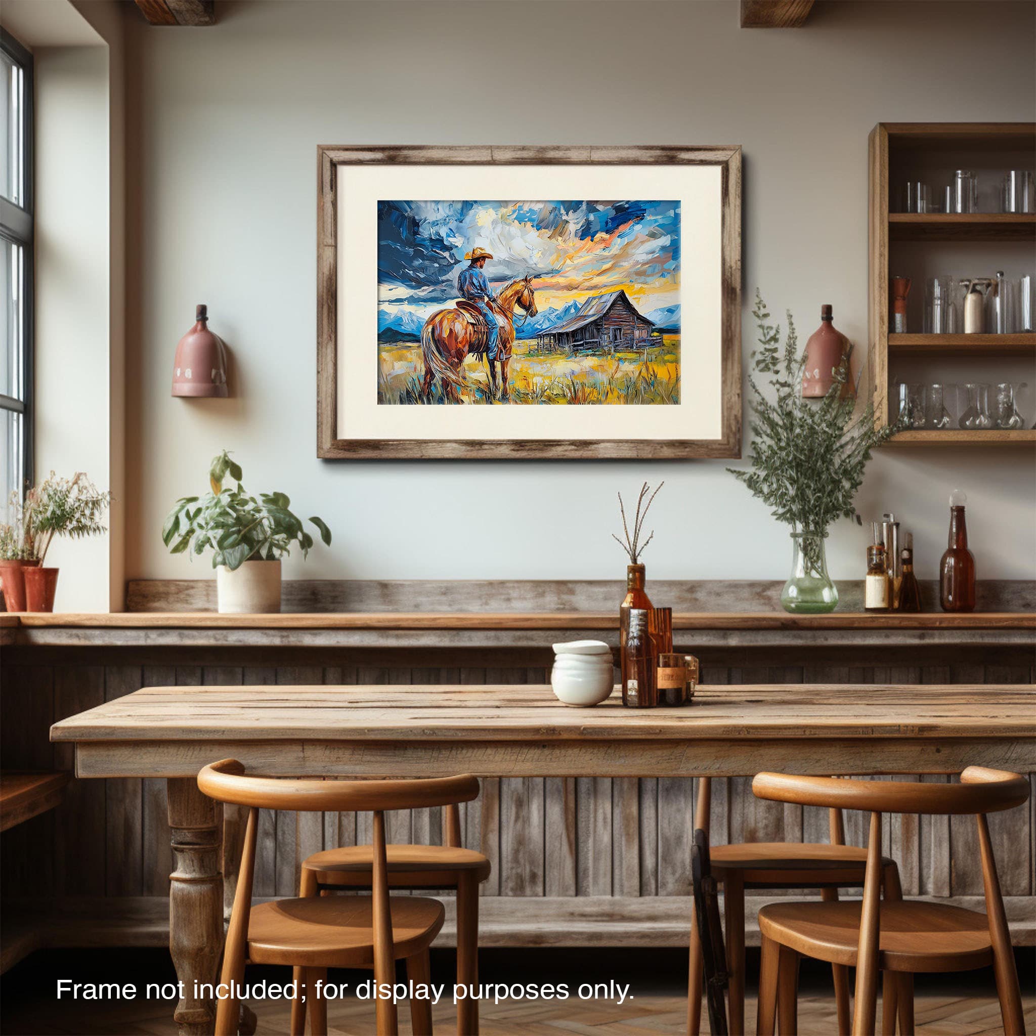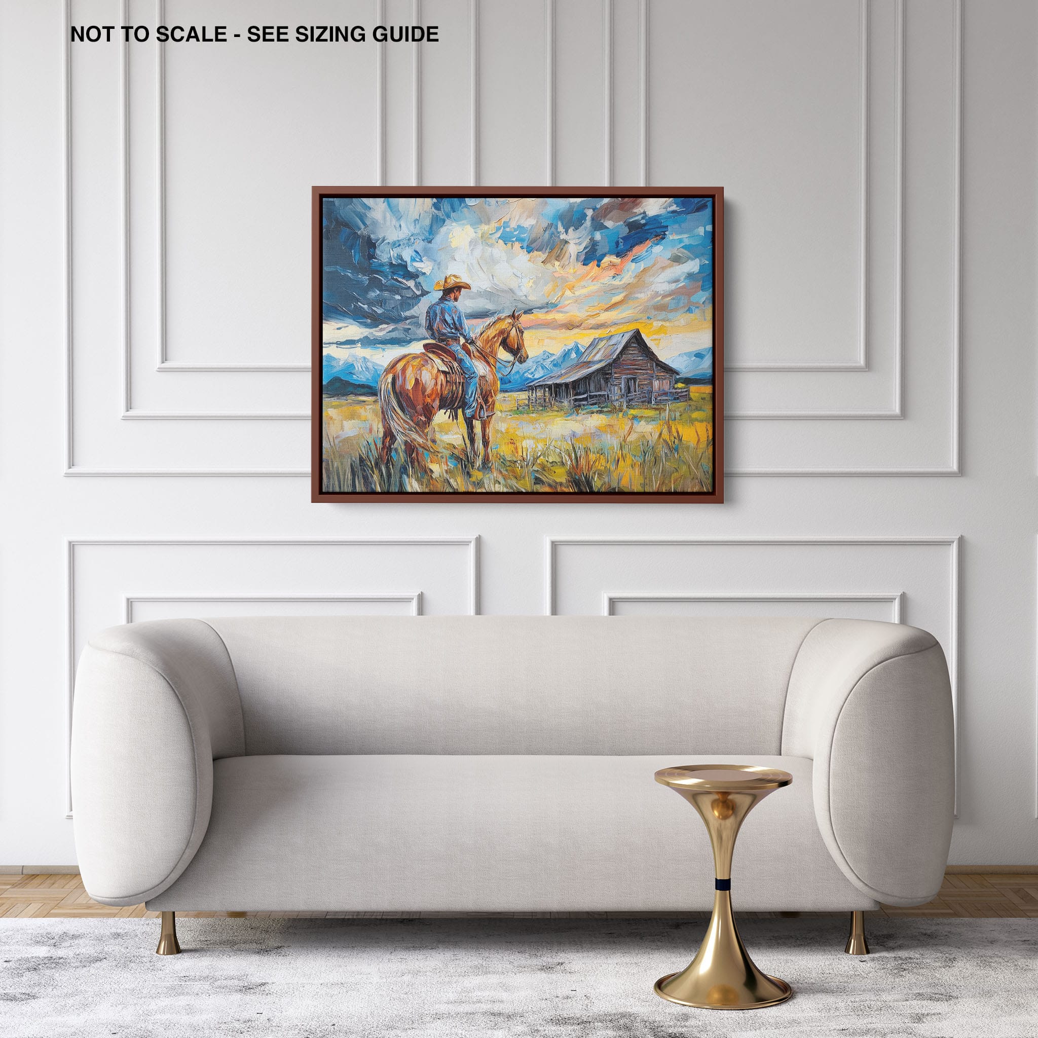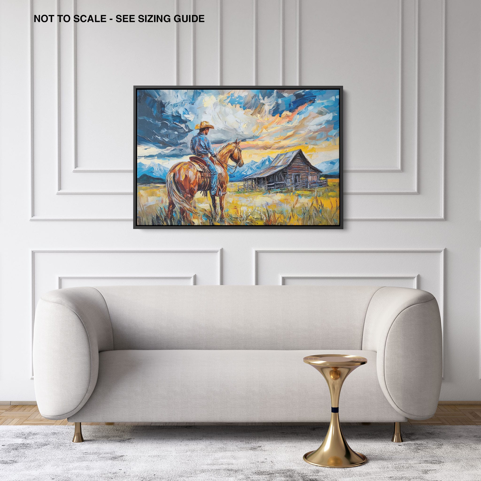 A cowboy on horseback gazes towards a rustic barn set against a majestic mountain range bathed in the vibrant hues of sunset. This digital oil painting, with its rich textures and dynamic brushstrokes, captures the essence of the American West. The luminous sky and the contrast of shadowy clouds add depth and drama, making this piece a visual feast for art lovers. Perfect for adorning the walls of any home, this artwork is a striking blend of impressionism and Western art, ideal for those seeking to infuse their space with a touch of rugged romance and vibrant color.