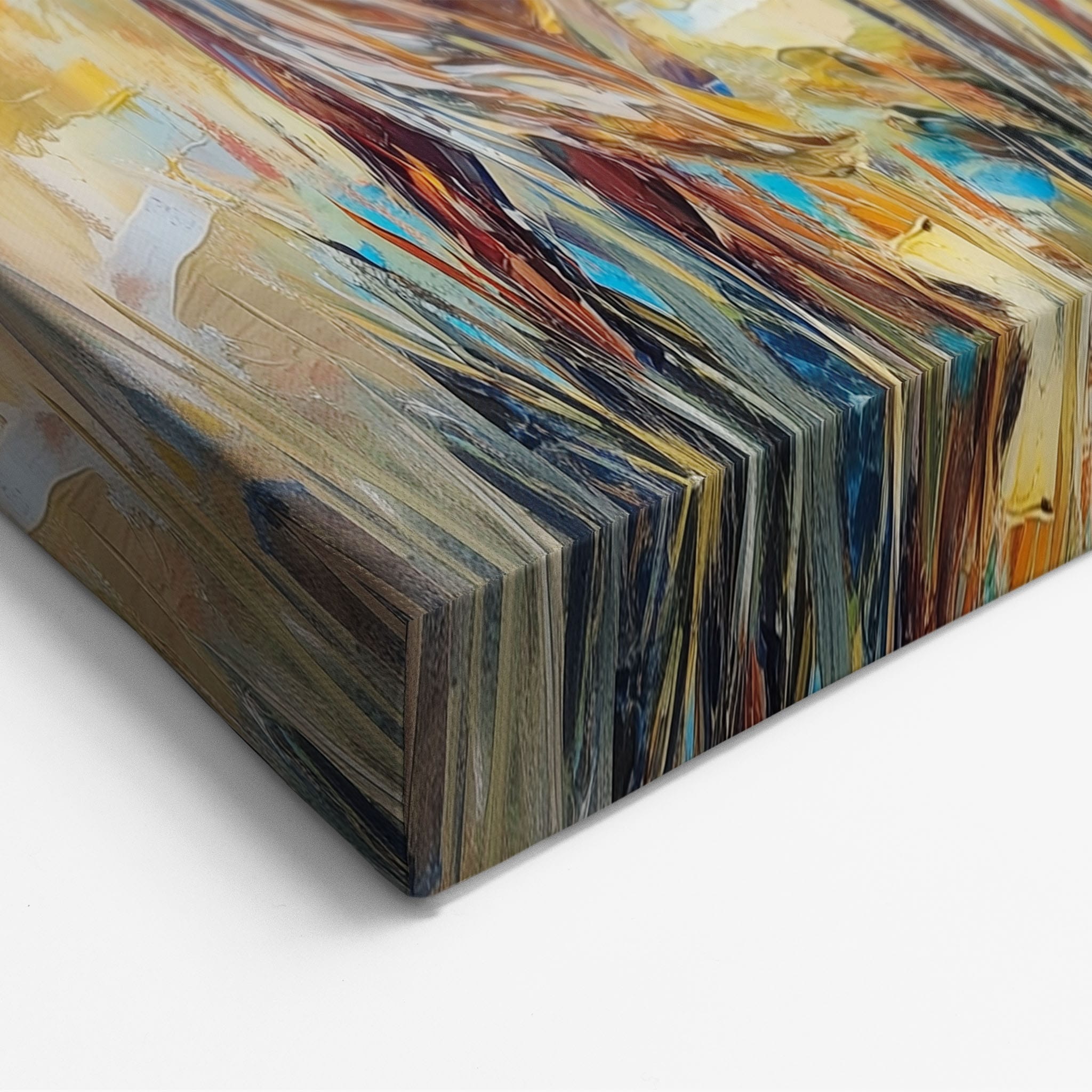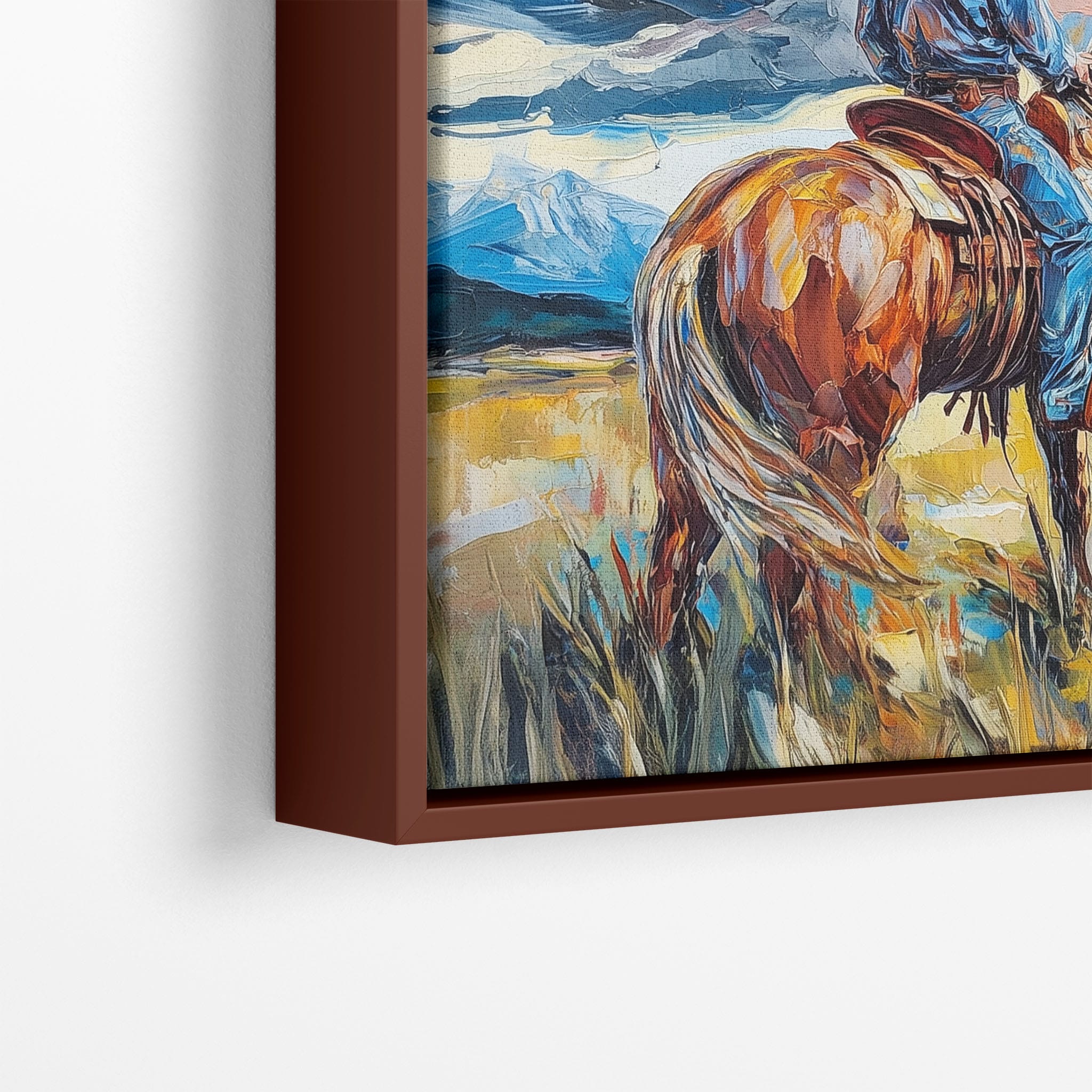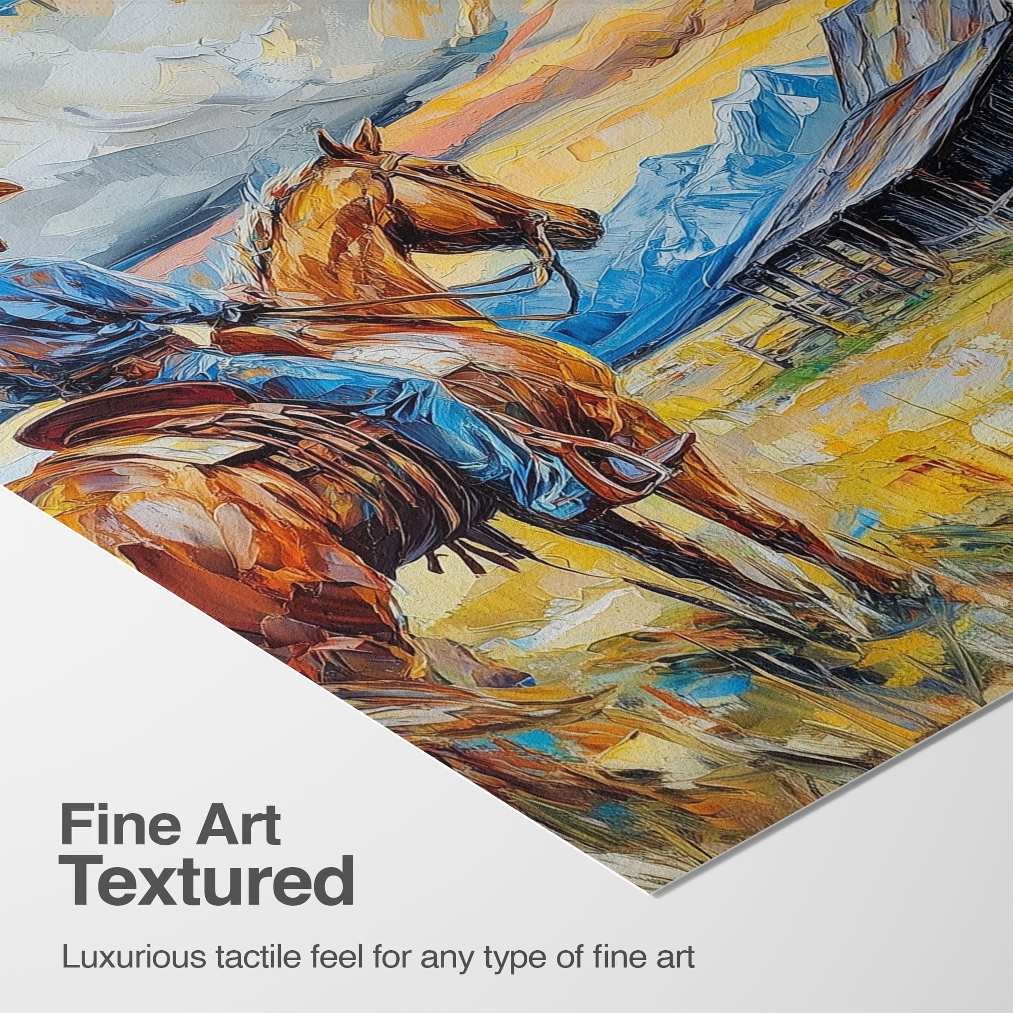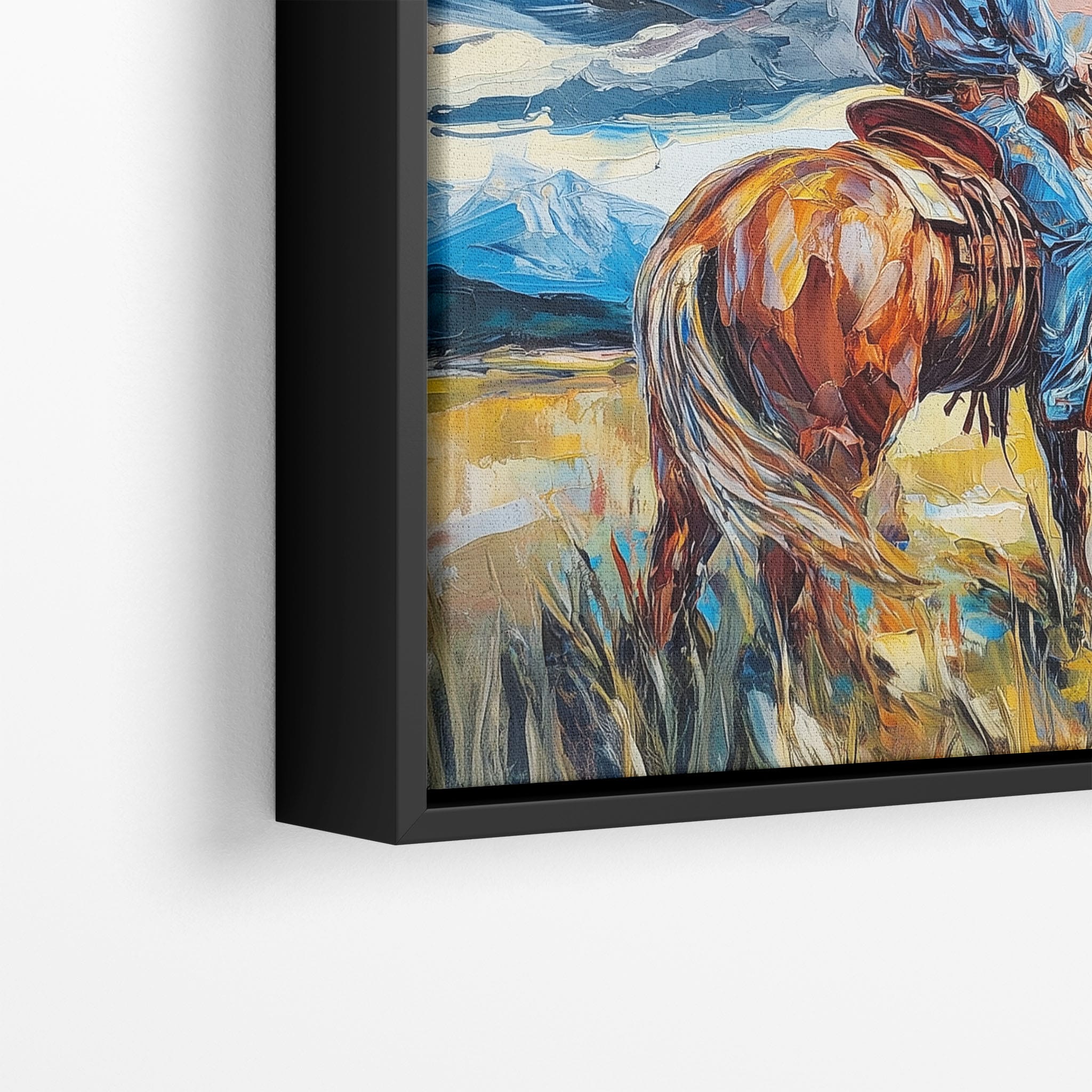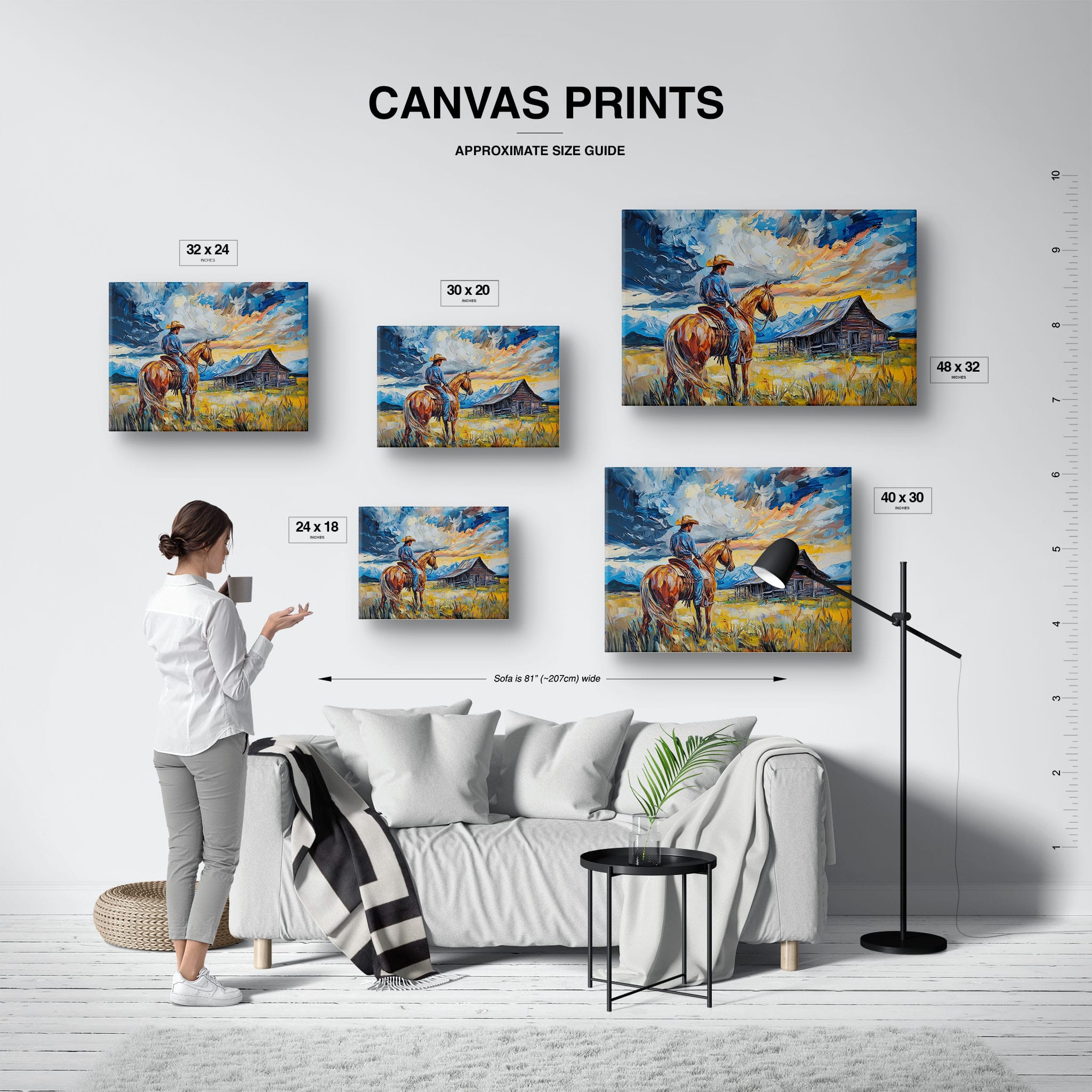 A cowboy on horseback gazes towards a rustic barn set against a majestic mountain range bathed in the vibrant hues of sunset. This digital oil painting, with its rich textures and dynamic brushstrokes, captures the essence of the American West. The luminous sky and the contrast of shadowy clouds add depth and drama, making this piece a visual feast for art lovers. Perfect for adorning the walls of any home, this artwork is a striking blend of impressionism and Western art, ideal for those seeking to infuse their space with a touch of rugged romance and vibrant color.
