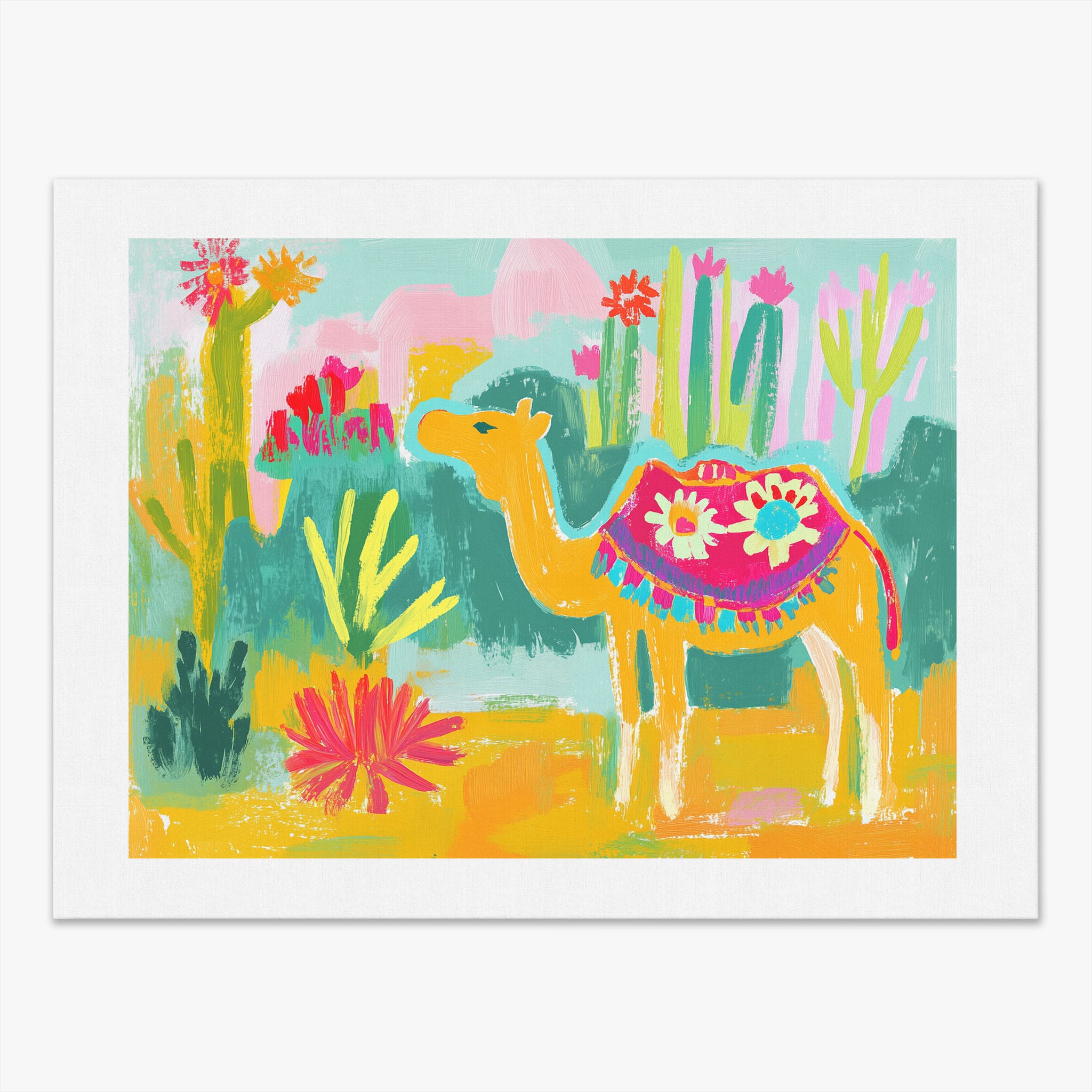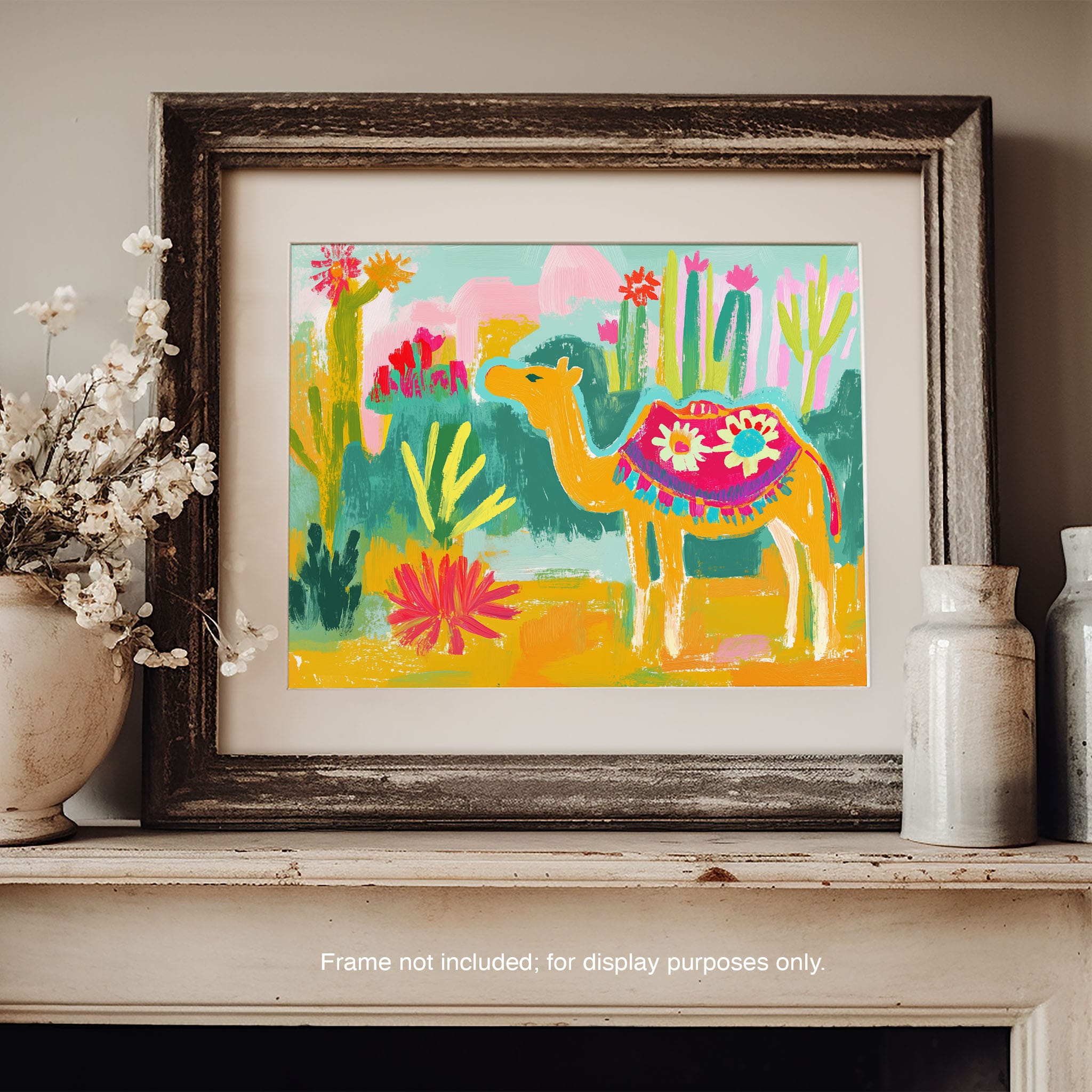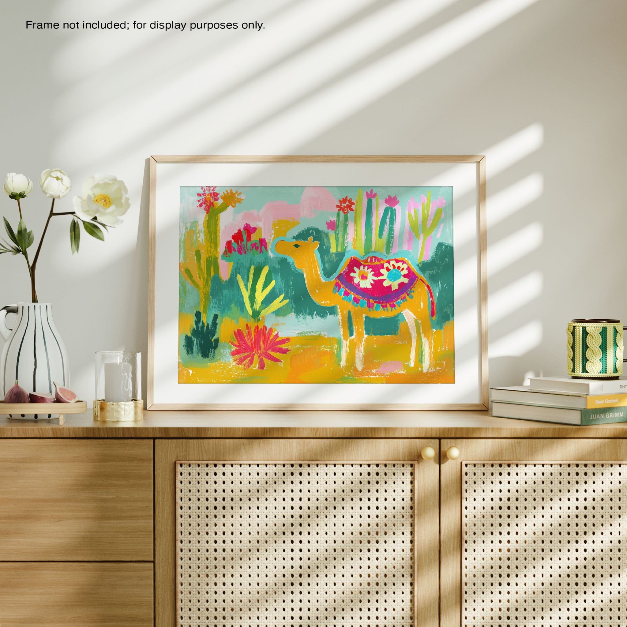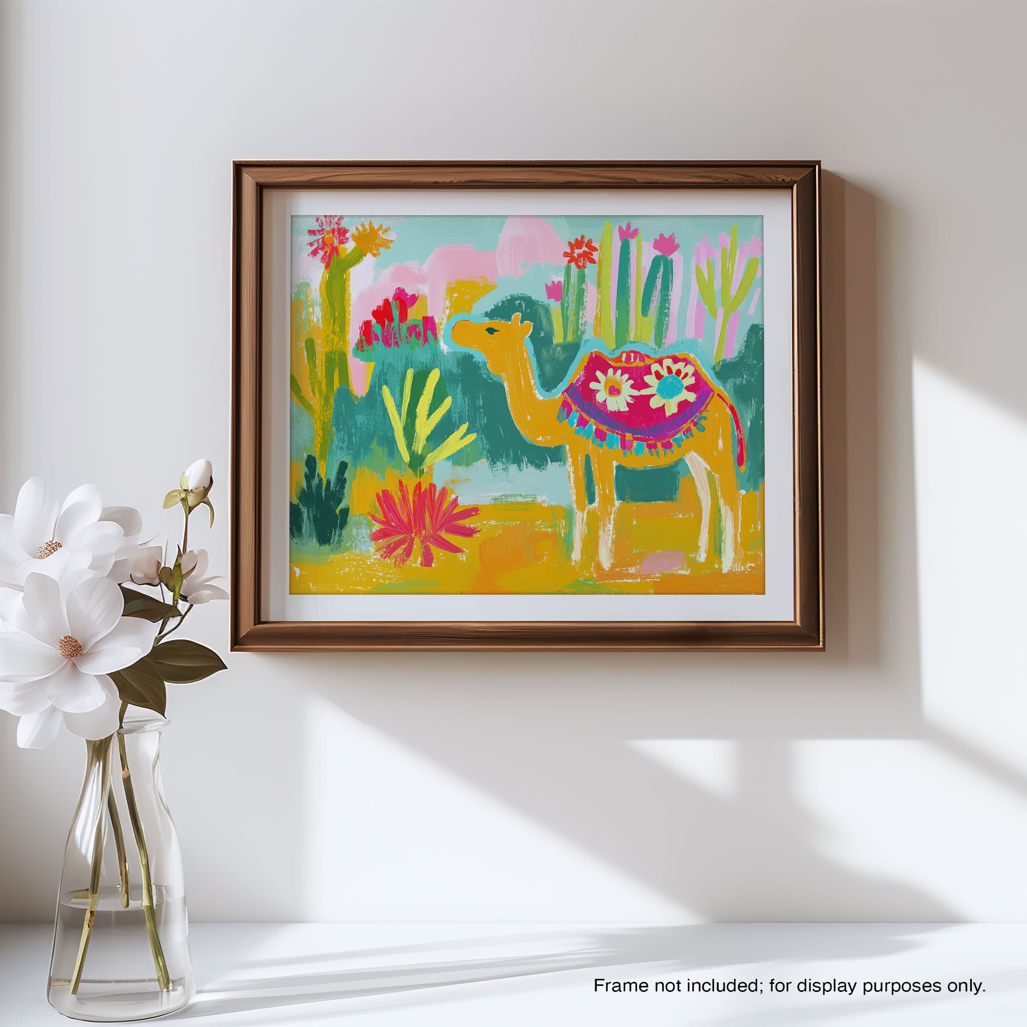This vibrant digital illustration captures a whimsically styled camel adorned in a brightly colored saddle, positioned gracefully against a backdrop of abstract cacti and florals. The playful interaction of vivid colors and simplified forms invites viewers into a cheerful and fantastical desert scene. Perfect for adding a pop of color and a dose of joy to any room, this artwork resonates with lovers of both modern design and animal-themed decor. A delightful pick for nurturing a lively and artistic environment at home or in the office.