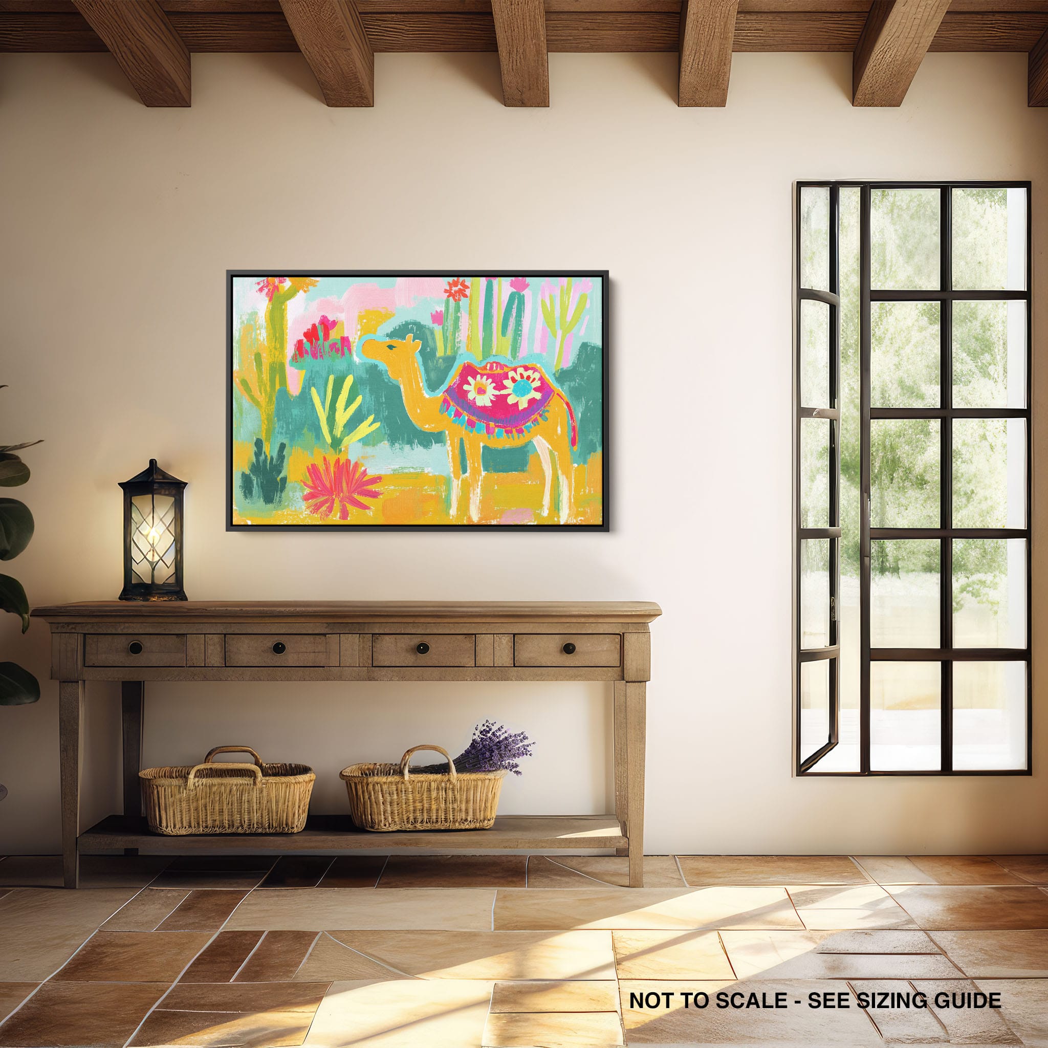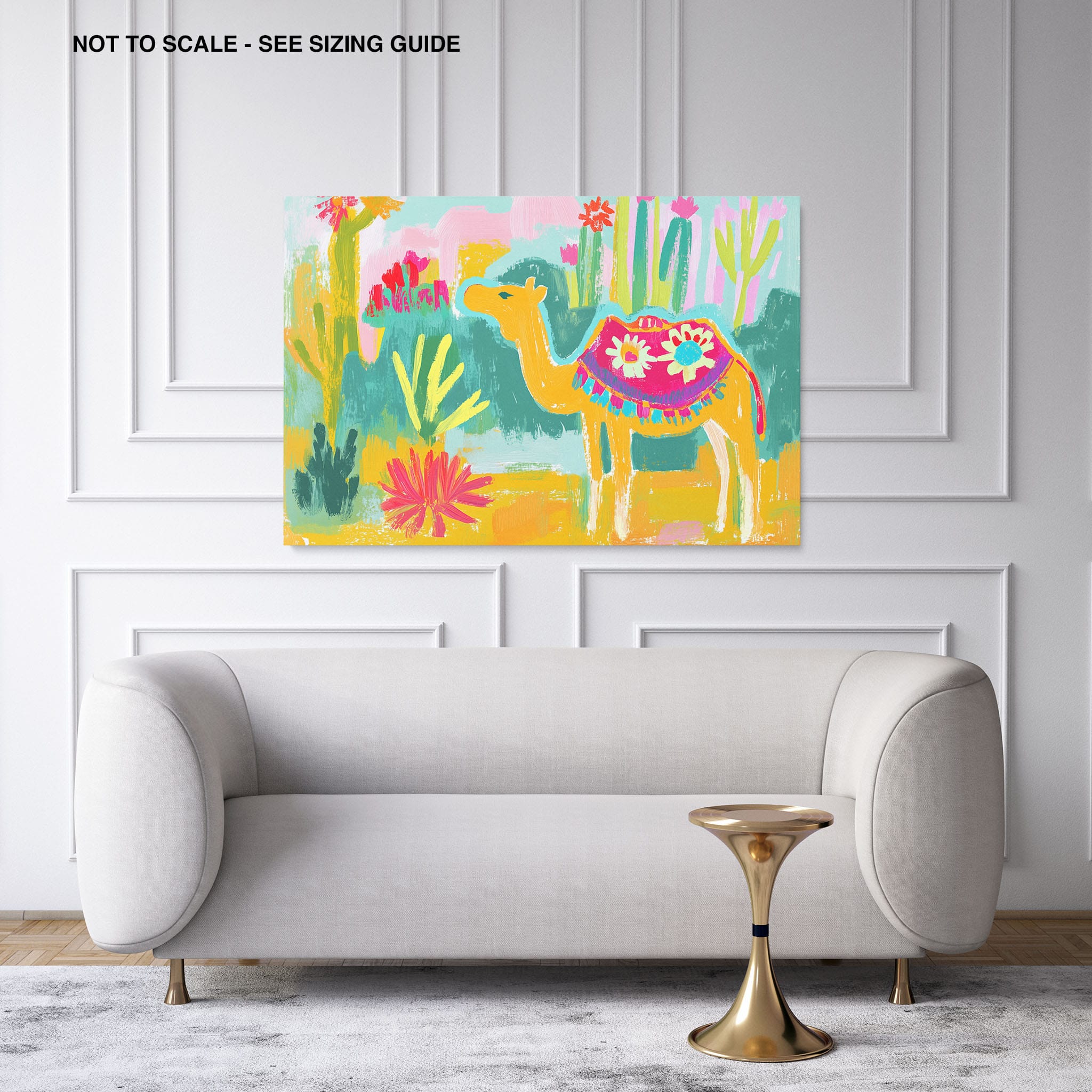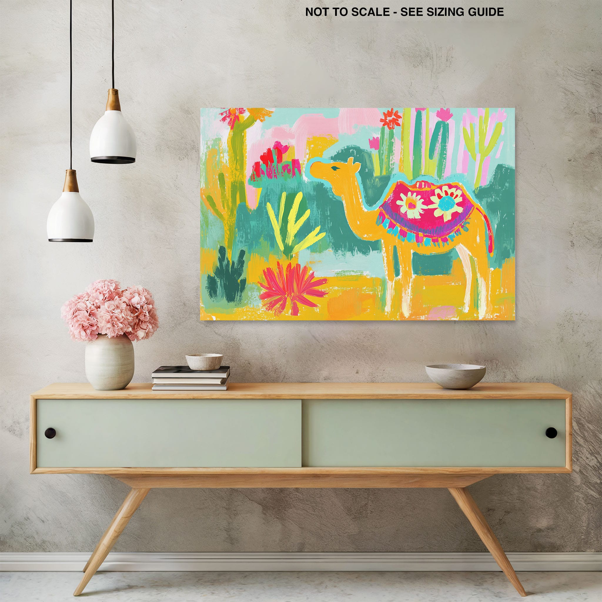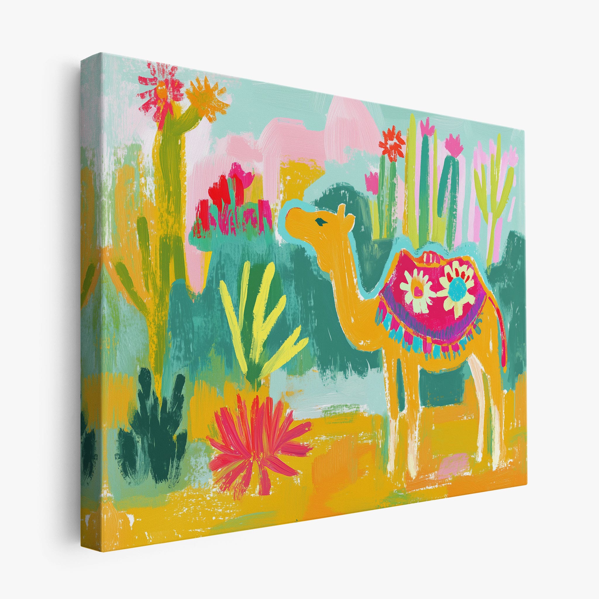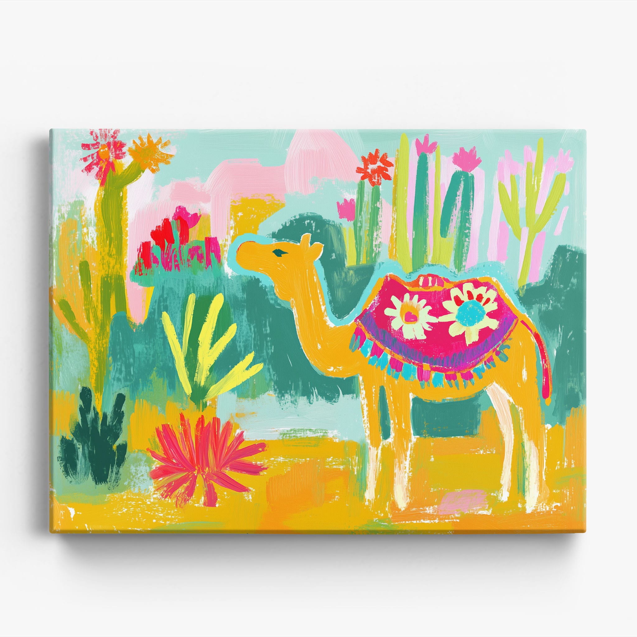 This vibrant digital illustration captures a whimsically styled camel adorned in a brightly colored saddle, positioned gracefully against a backdrop of abstract cacti and florals. The playful interaction of vivid colors and simplified forms invites viewers into a cheerful and fantastical desert scene. Perfect for adding a pop of color and a dose of joy to any room, this artwork resonates with lovers of both modern design and animal-themed decor. A delightful pick for nurturing a lively and artistic environment at home or in the office.