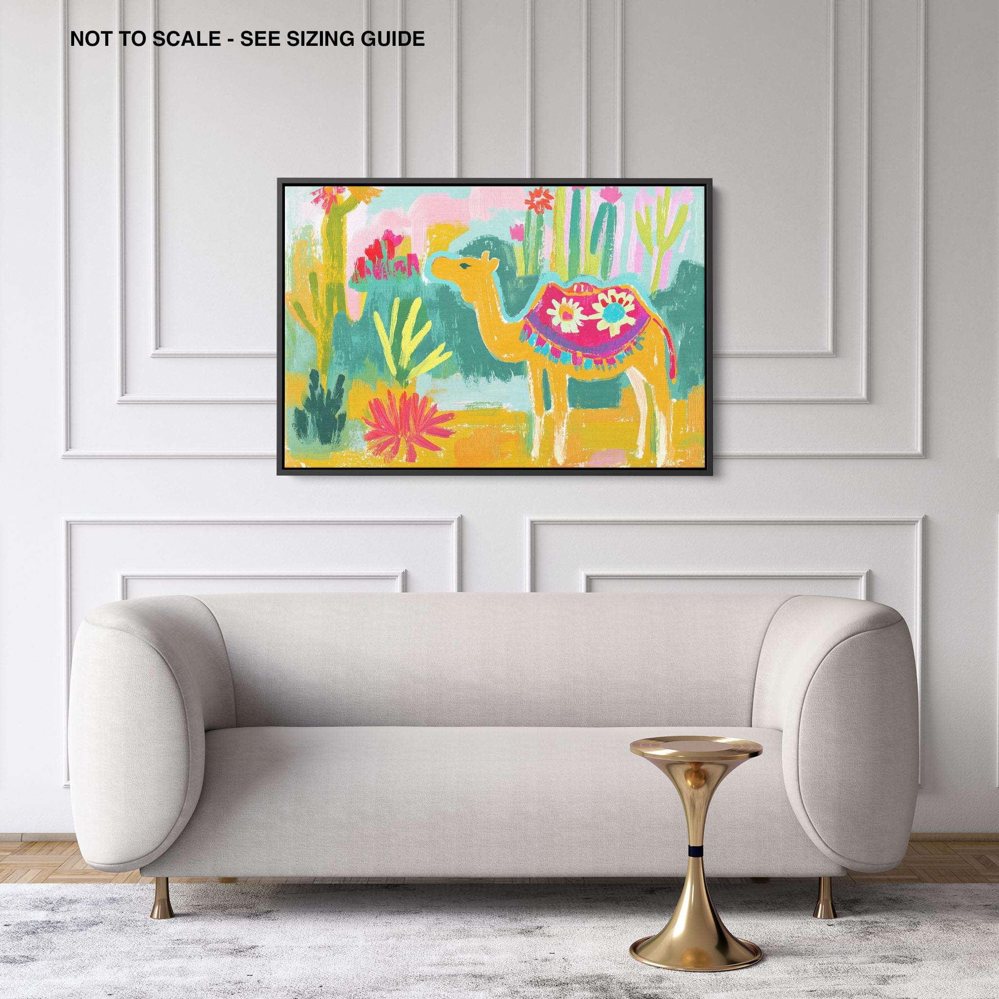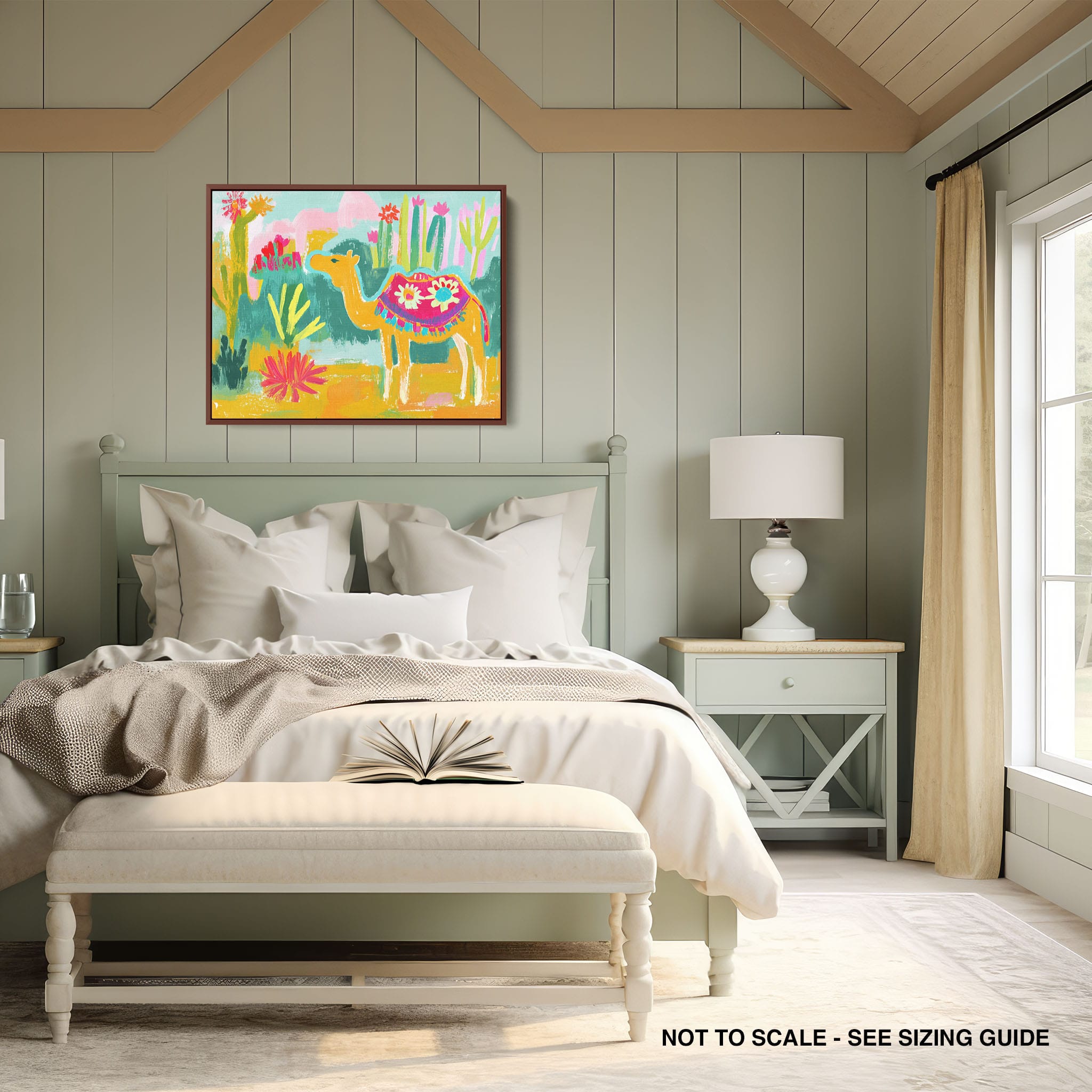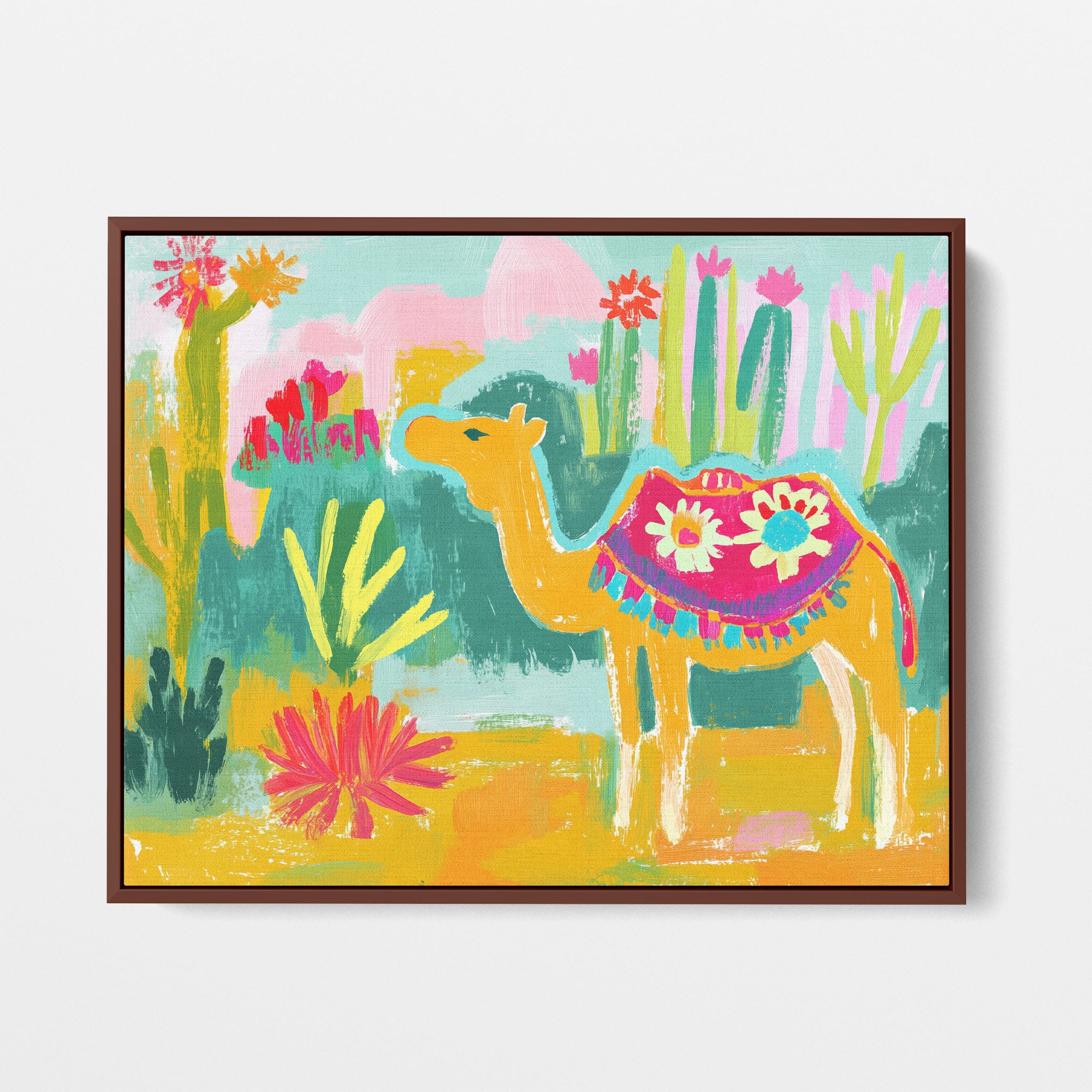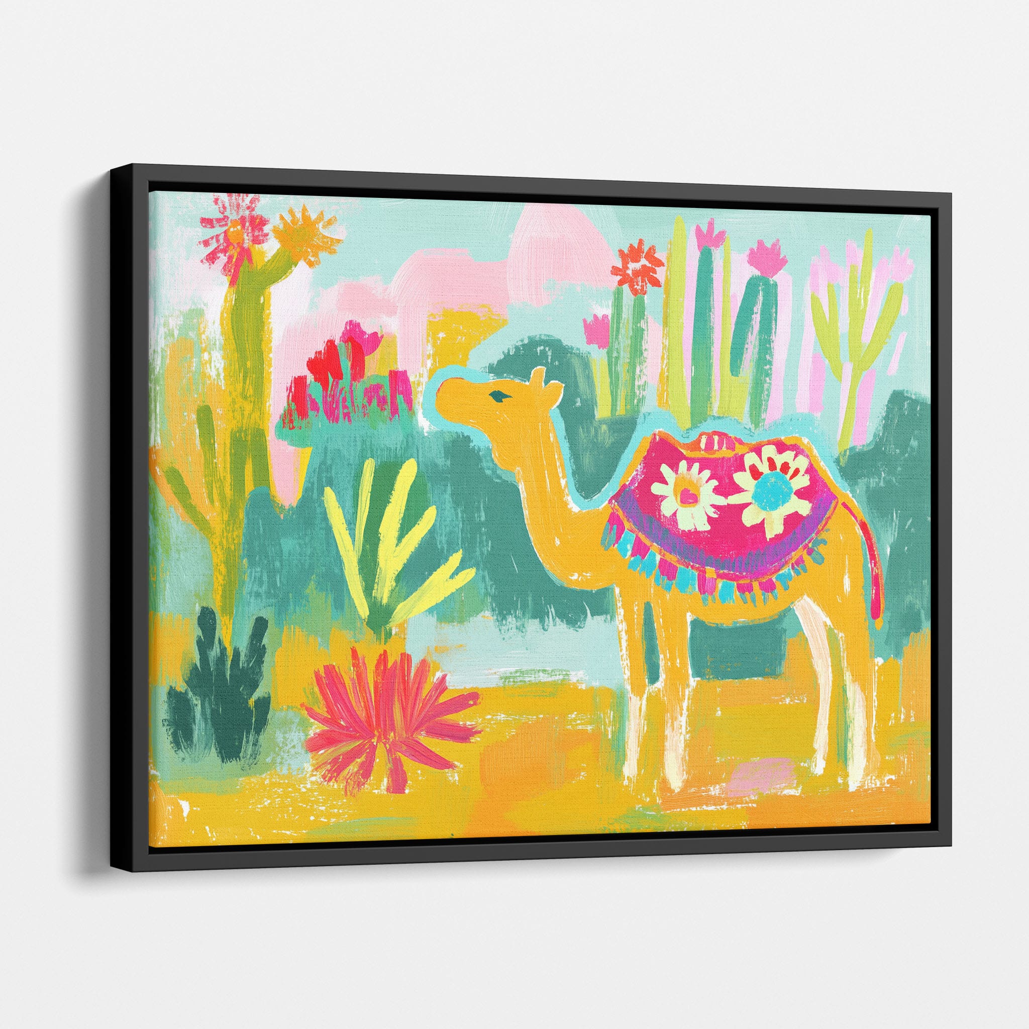 This vibrant digital illustration captures a whimsically styled camel adorned in a brightly colored saddle, positioned gracefully against a backdrop of abstract cacti and florals. The playful interaction of vivid colors and simplified forms invites viewers into a cheerful and fantastical desert scene. Perfect for adding a pop of color and a dose of joy to any room, this artwork resonates with lovers of both modern design and animal-themed decor. A delightful pick for nurturing a lively and artistic environment at home or in the office.