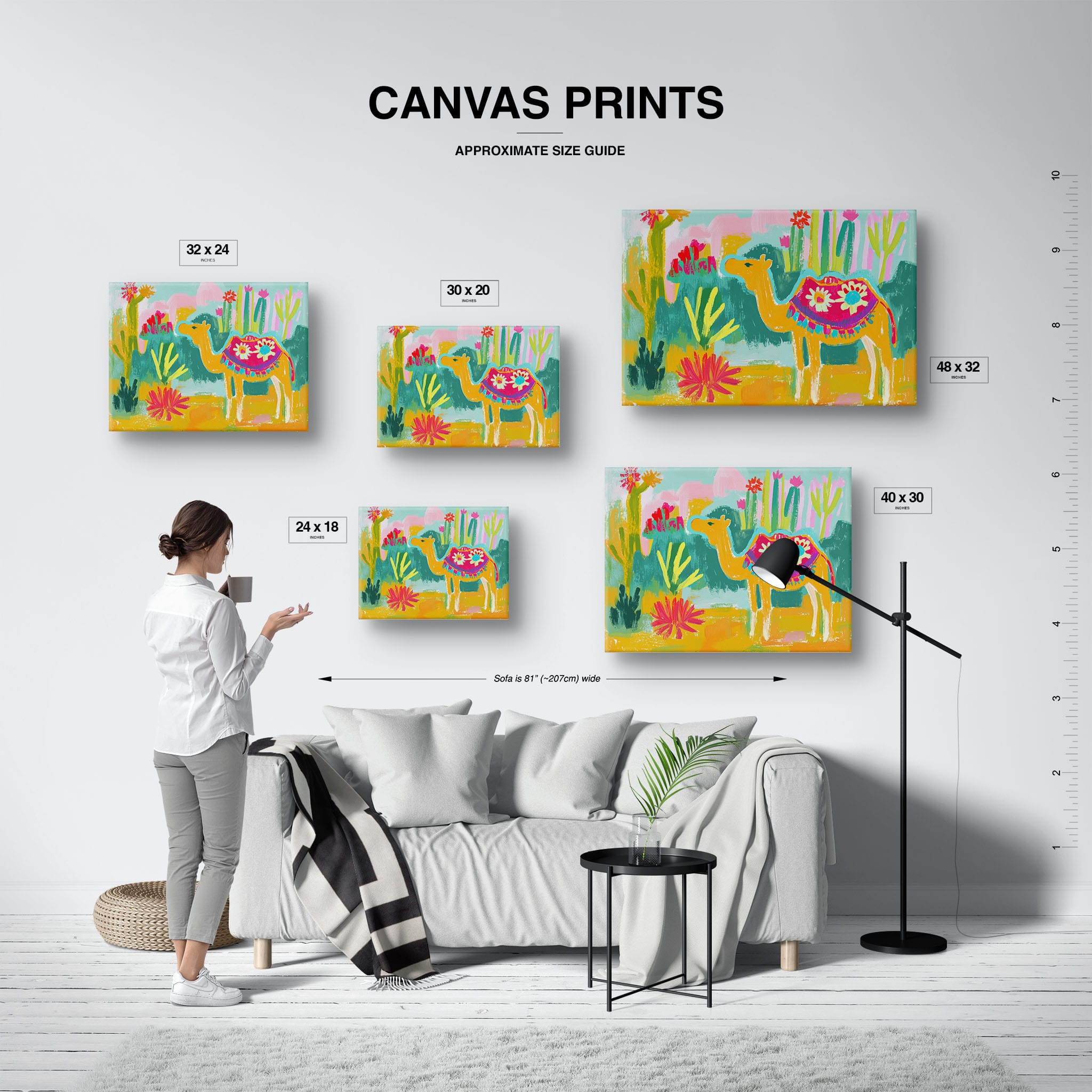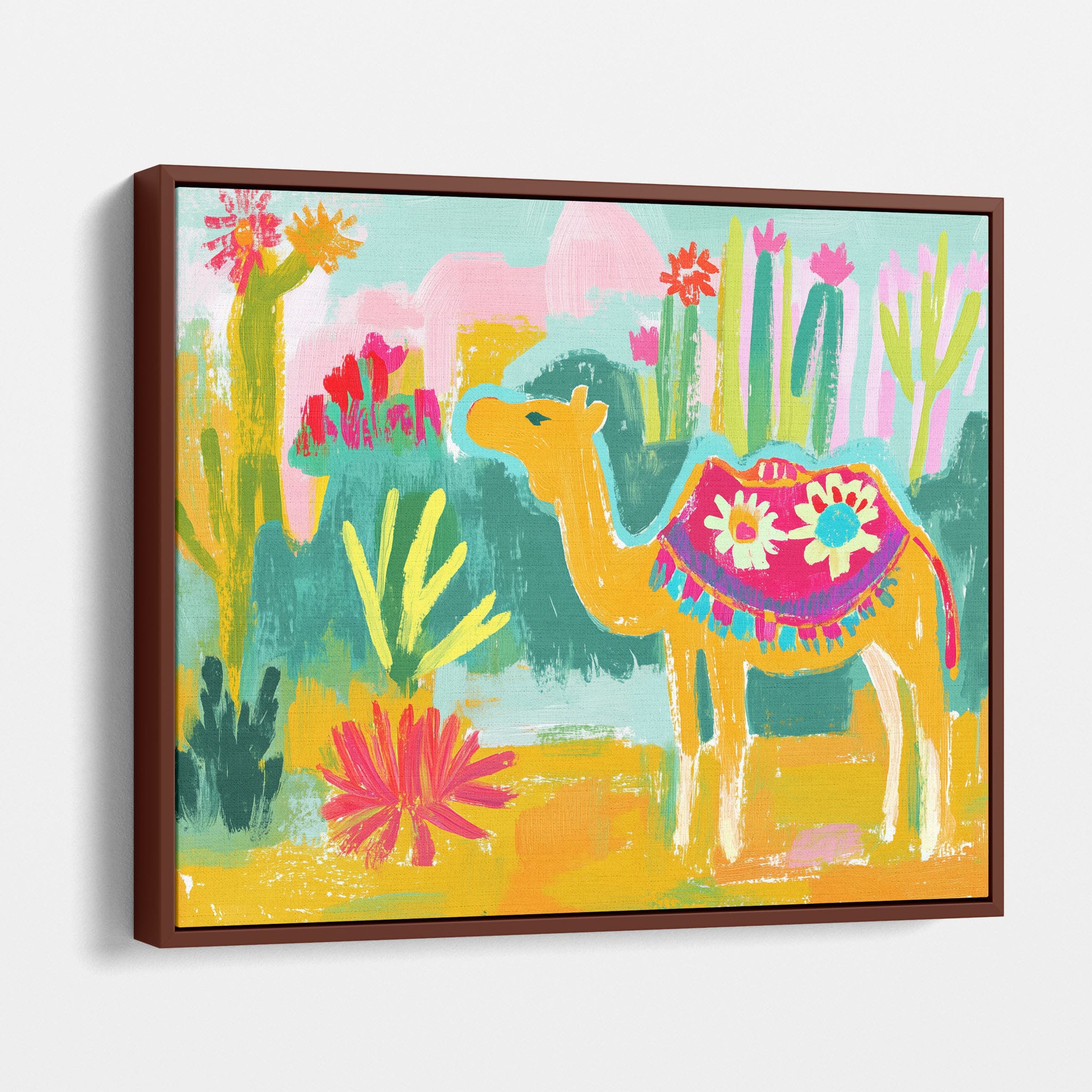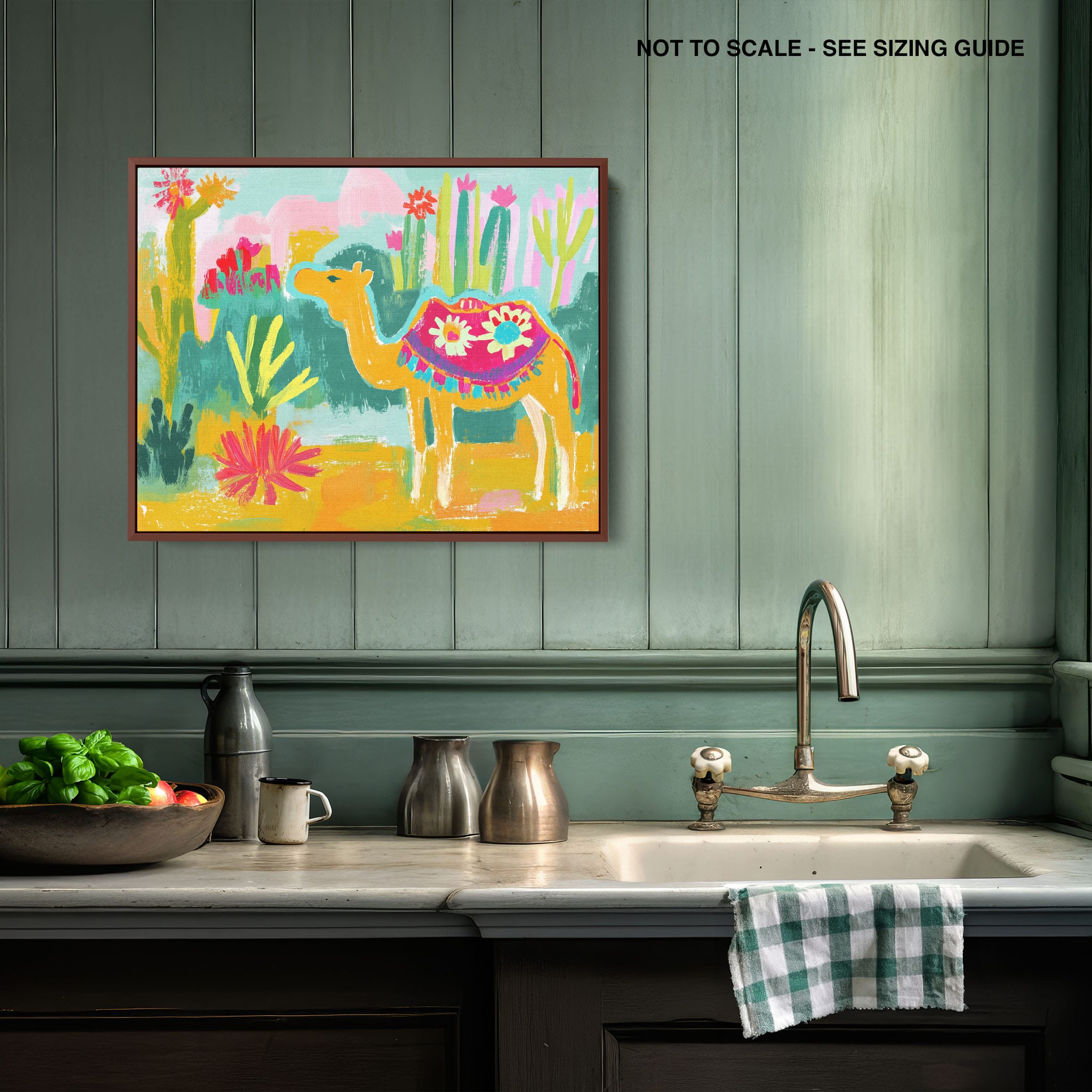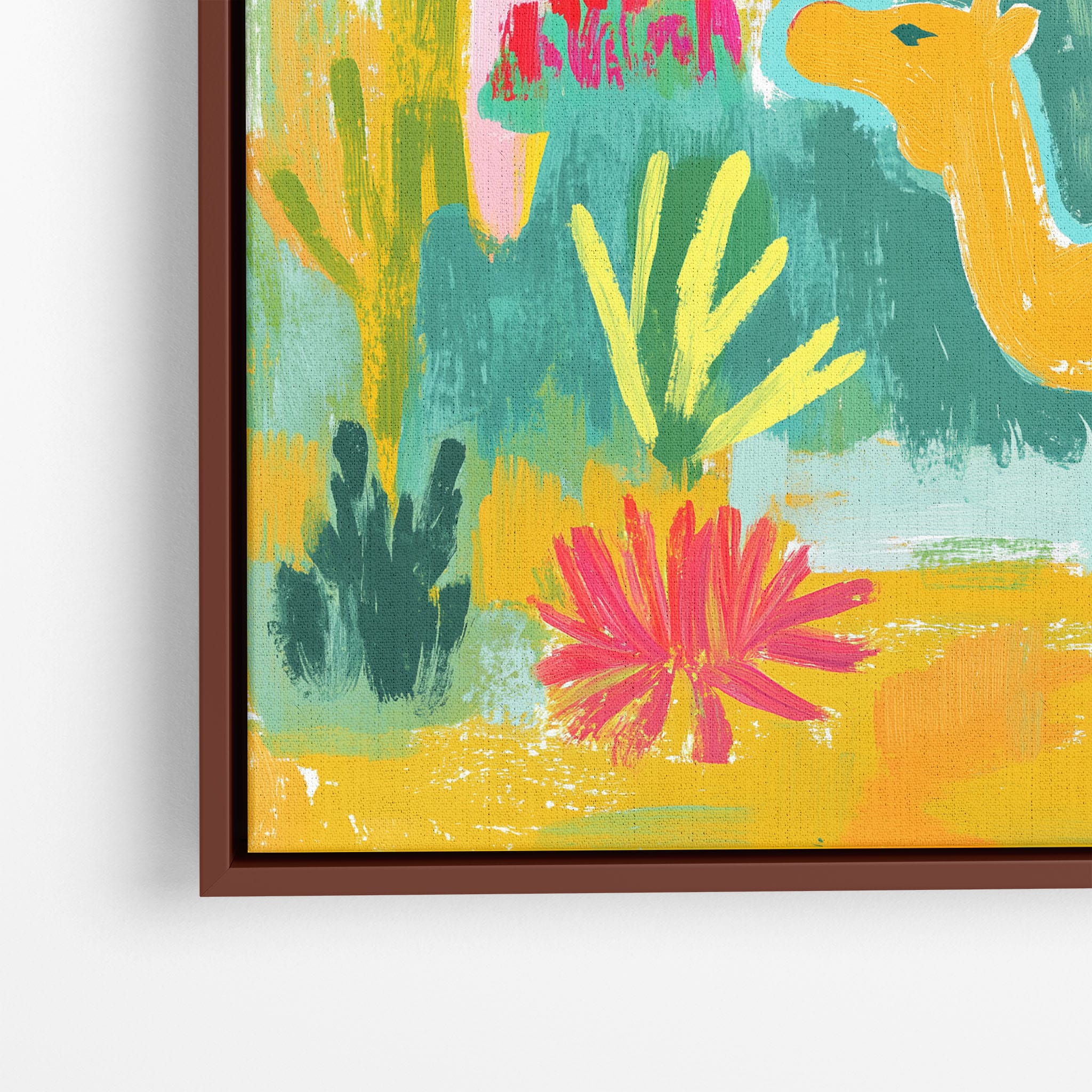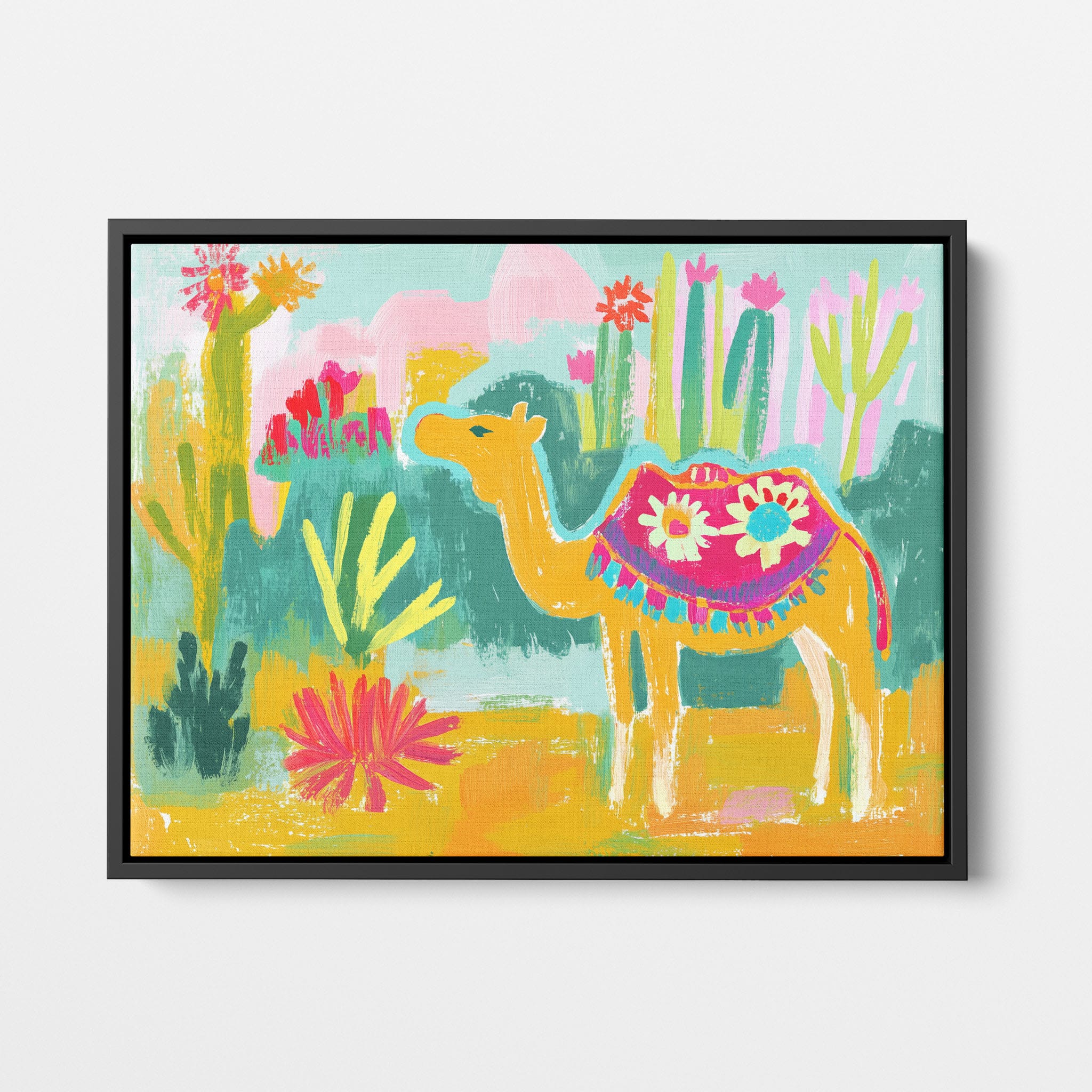 This vibrant digital illustration captures a whimsically styled camel adorned in a brightly colored saddle, positioned gracefully against a backdrop of abstract cacti and florals. The playful interaction of vivid colors and simplified forms invites viewers into a cheerful and fantastical desert scene. Perfect for adding a pop of color and a dose of joy to any room, this artwork resonates with lovers of both modern design and animal-themed decor. A delightful pick for nurturing a lively and artistic environment at home or in the office.