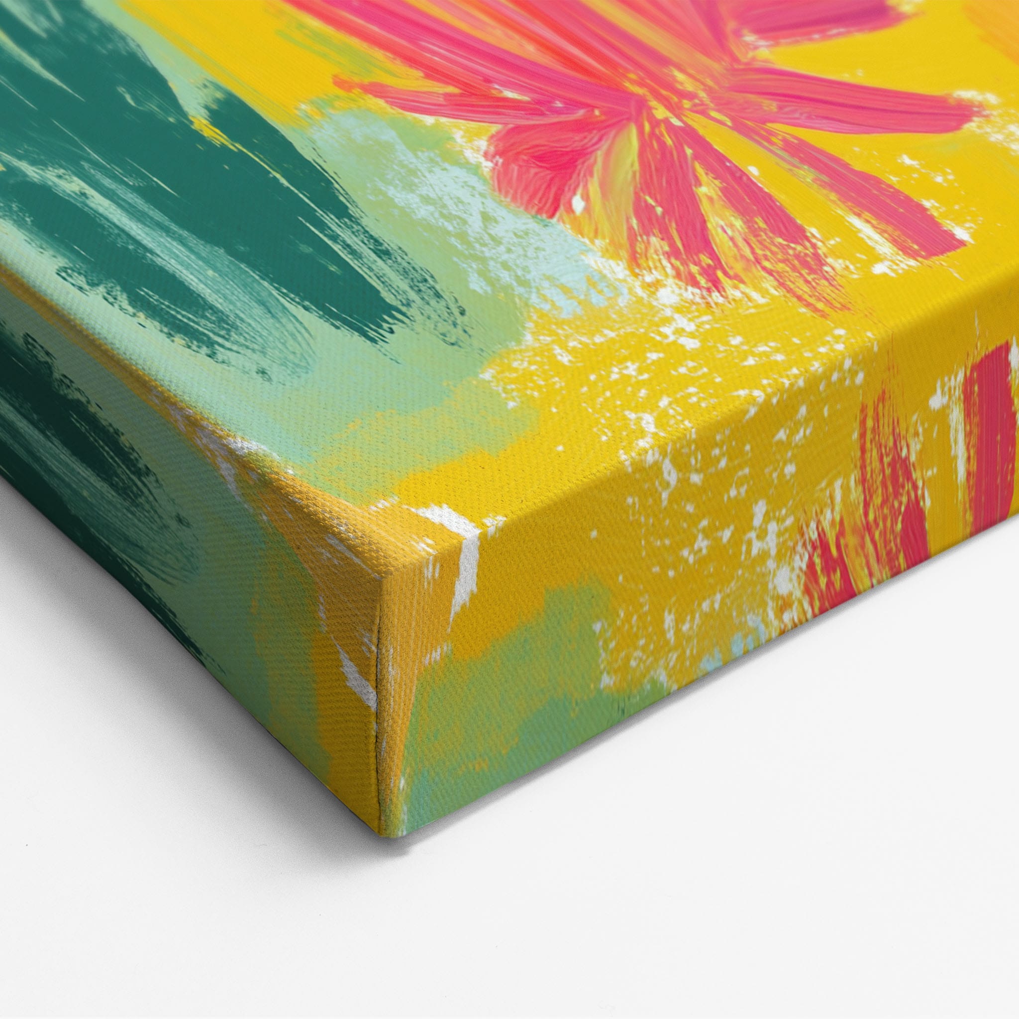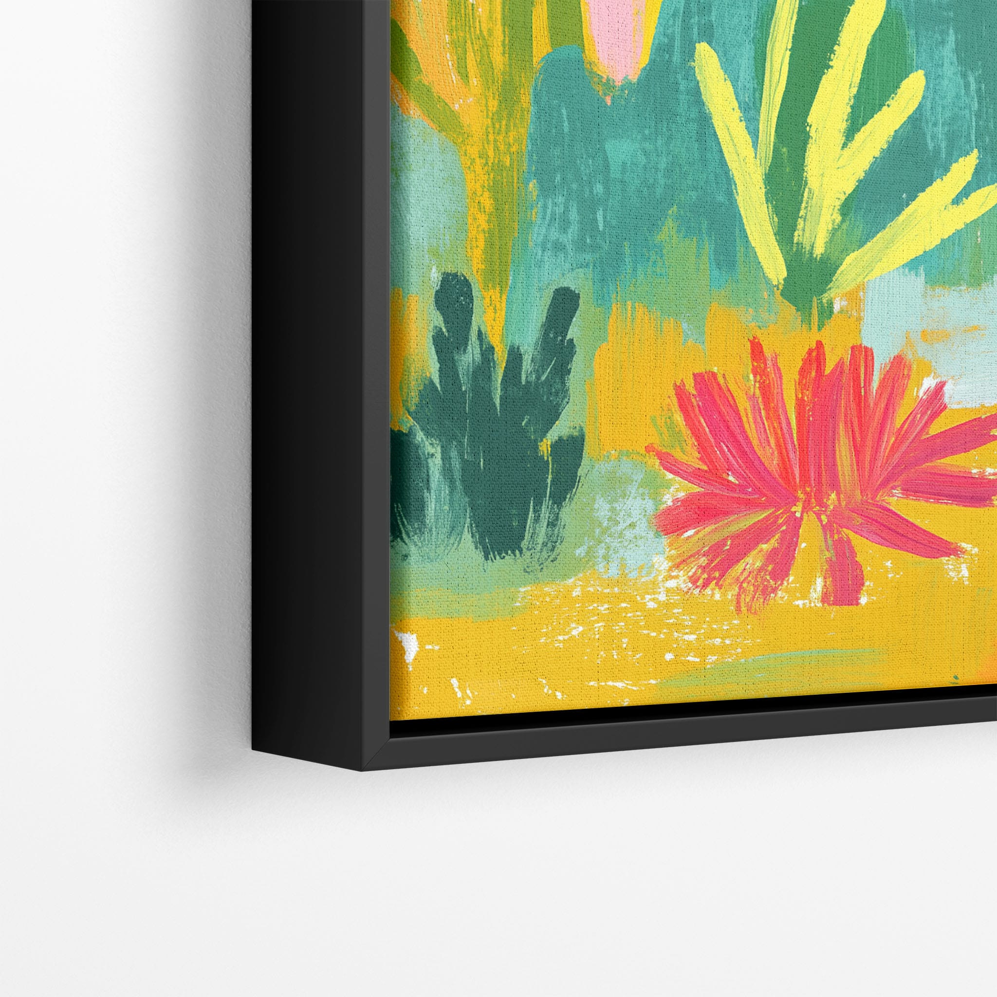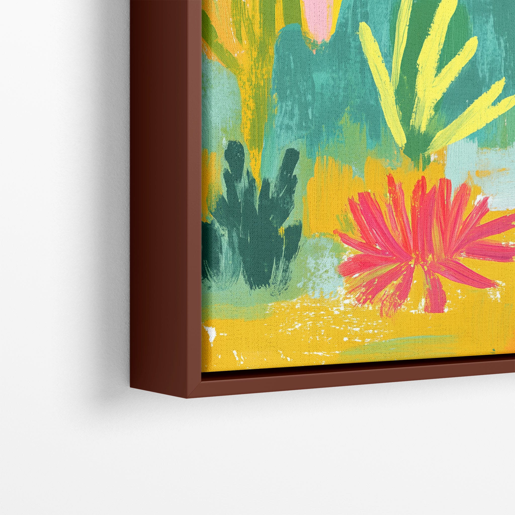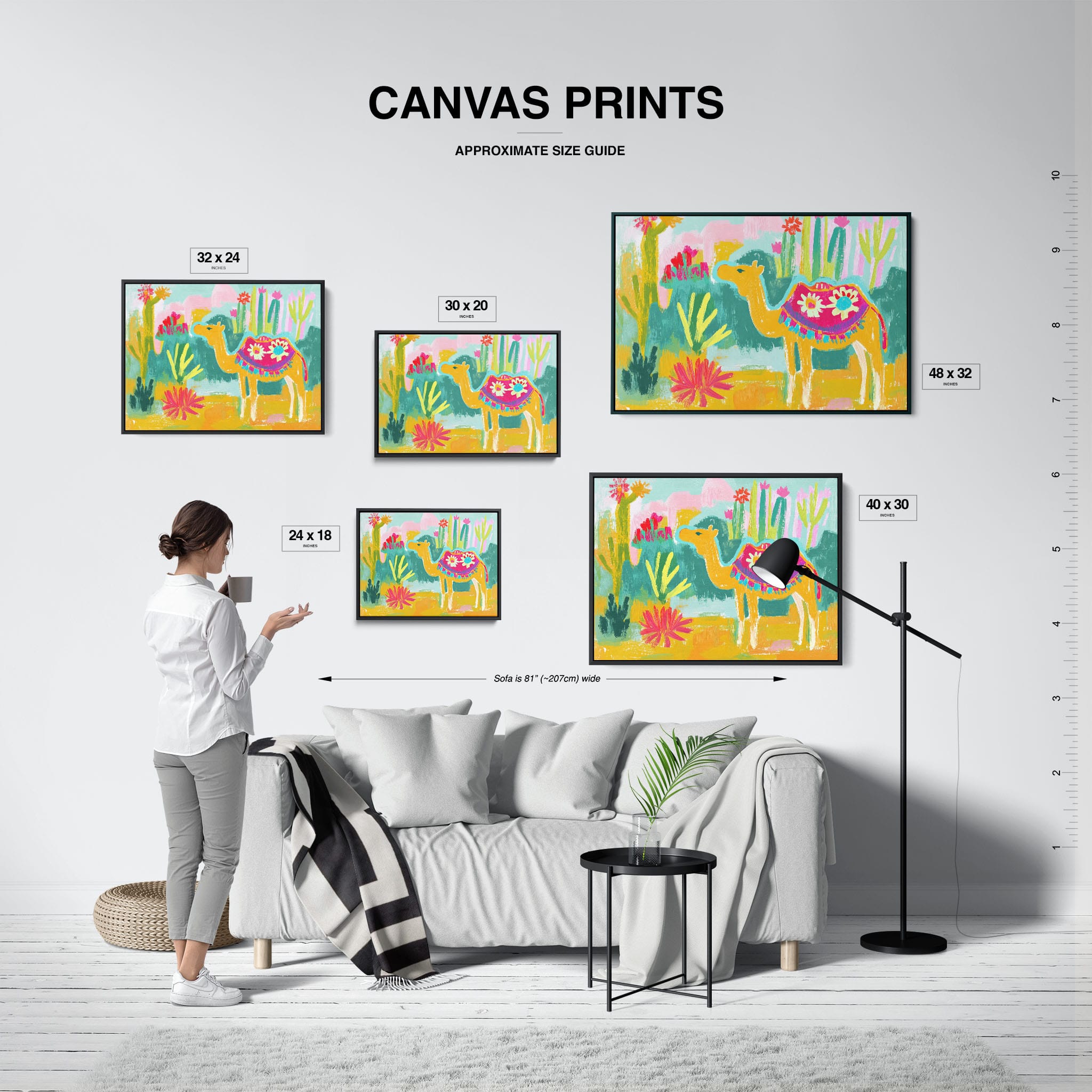 This vibrant digital illustration captures a whimsically styled camel adorned in a brightly colored saddle, positioned gracefully against a backdrop of abstract cacti and florals. The playful interaction of vivid colors and simplified forms invites viewers into a cheerful and fantastical desert scene. Perfect for adding a pop of color and a dose of joy to any room, this artwork resonates with lovers of both modern design and animal-themed decor. A delightful pick for nurturing a lively and artistic environment at home or in the office.