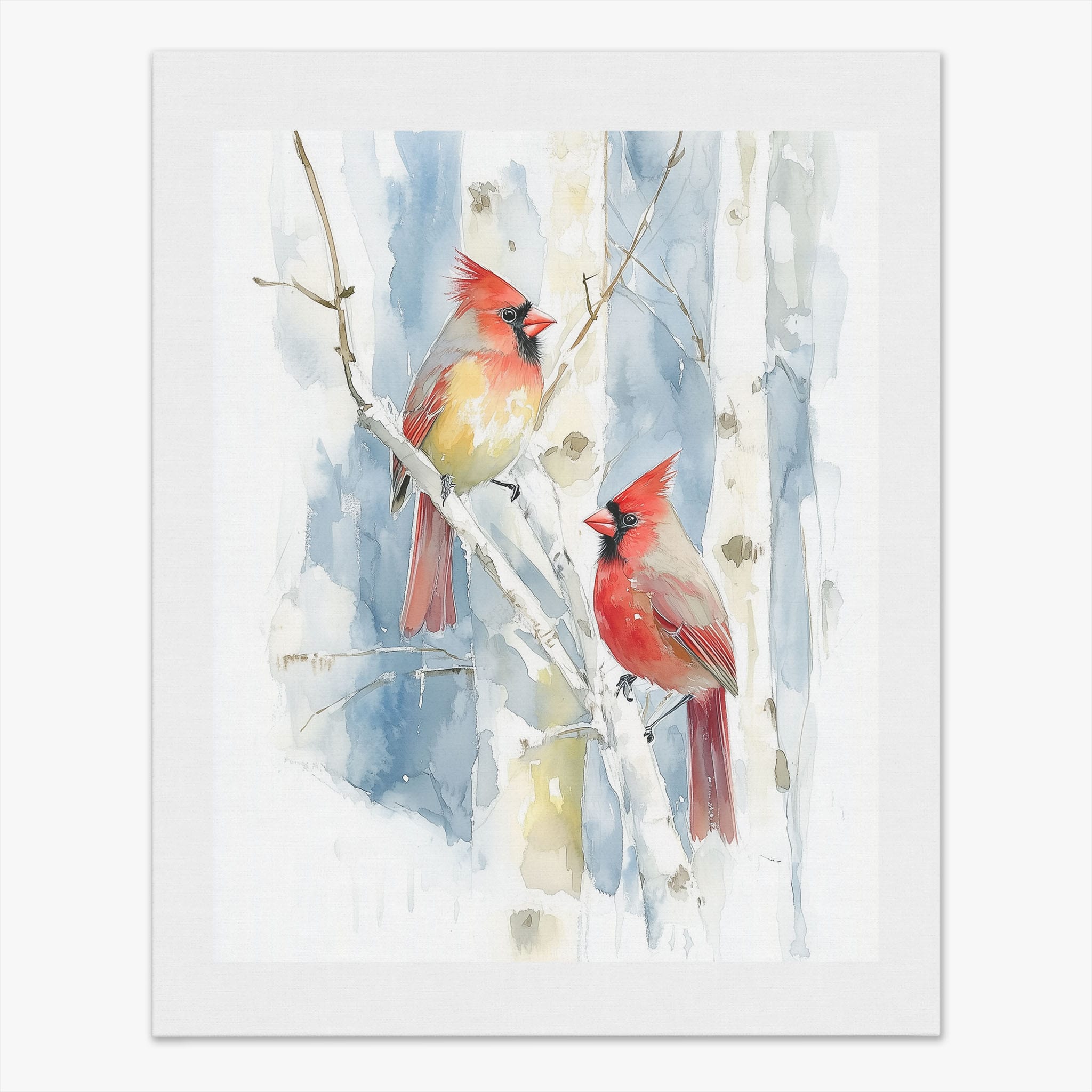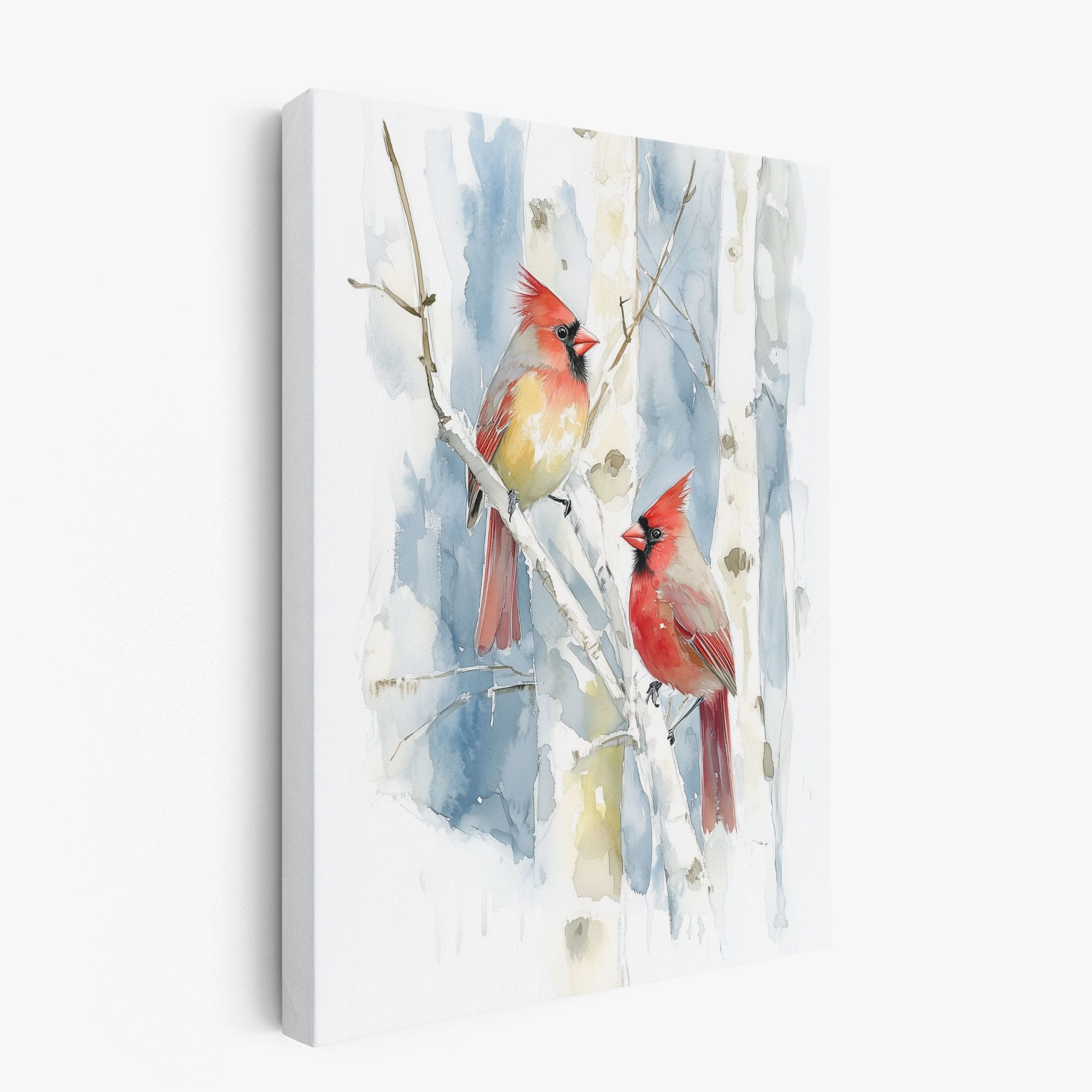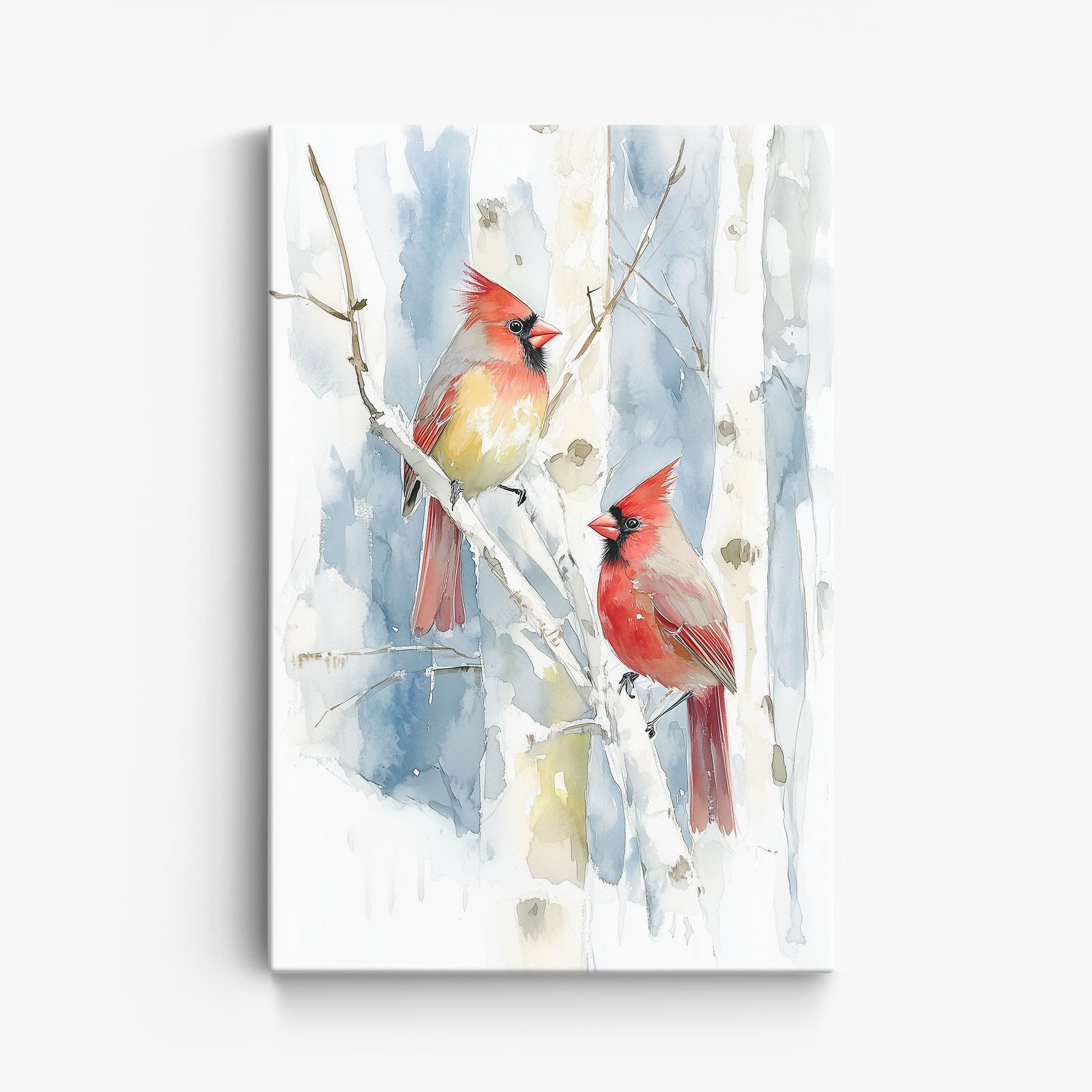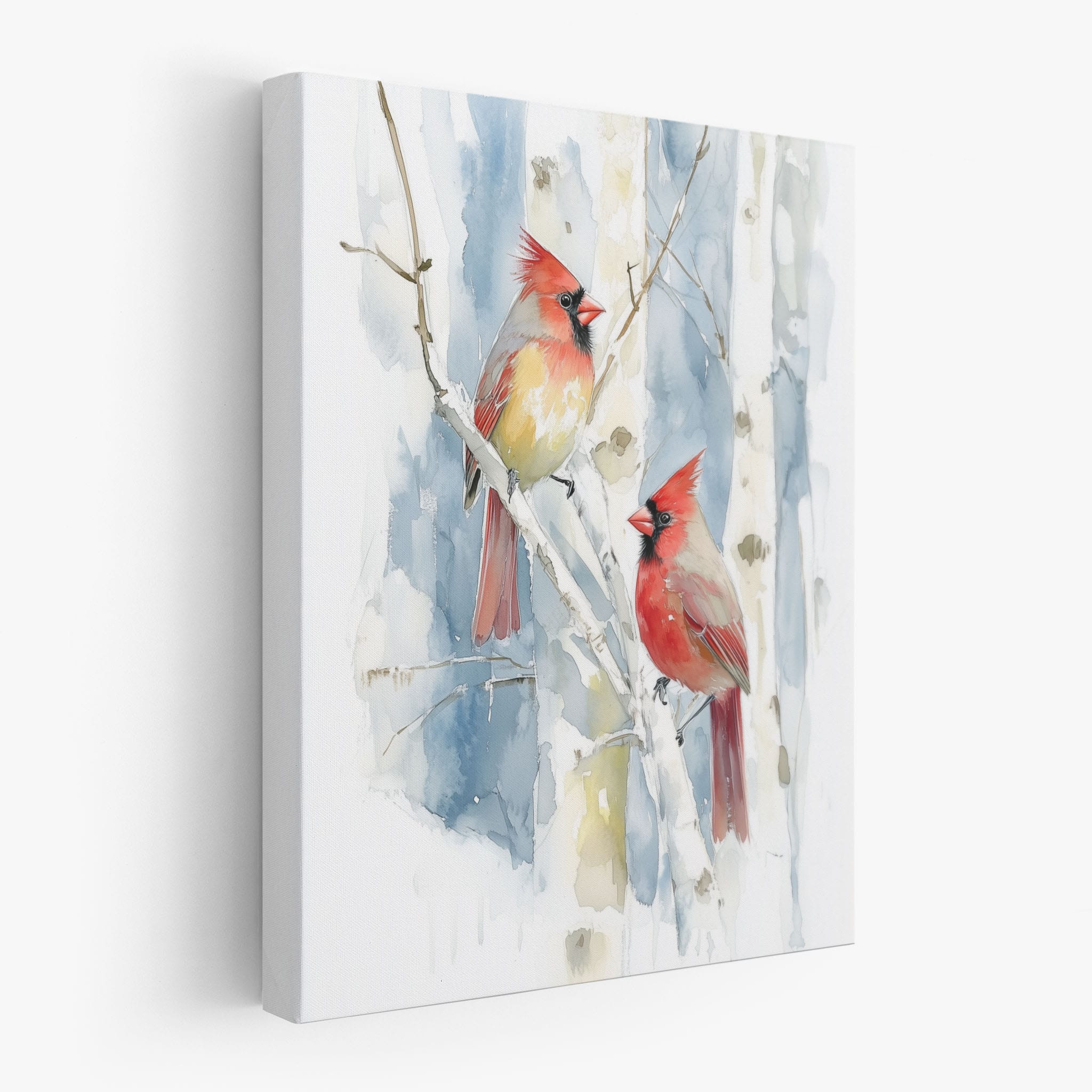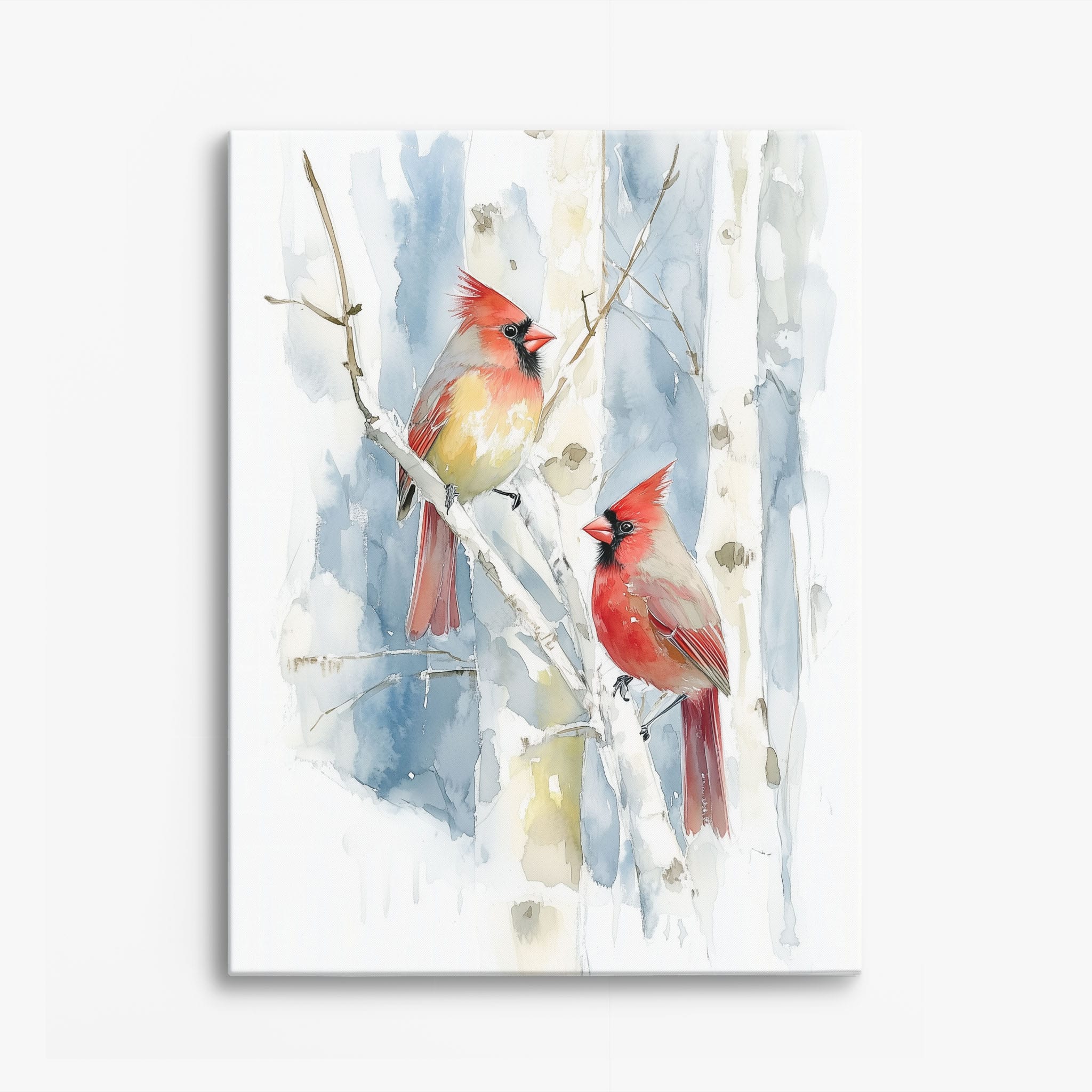 This stunning watercolor artwork captures the natural elegance of two cardinals perched delicately on winter branches. Their vibrant red plumage contrasts beautifully against the softly blended blues and neutrals of the background, invoking a serene yet playful impressionist vibe. Ideal for any bird lover or art aficionado, this piece brings a touch of whimsy and color to any room. Transform your space with this lovely depiction of nature's simplicity and beauty. Perfect for both modern and rustic decors, it is a must-have for those who appreciate art that combines realism with a touch of the fantastical.