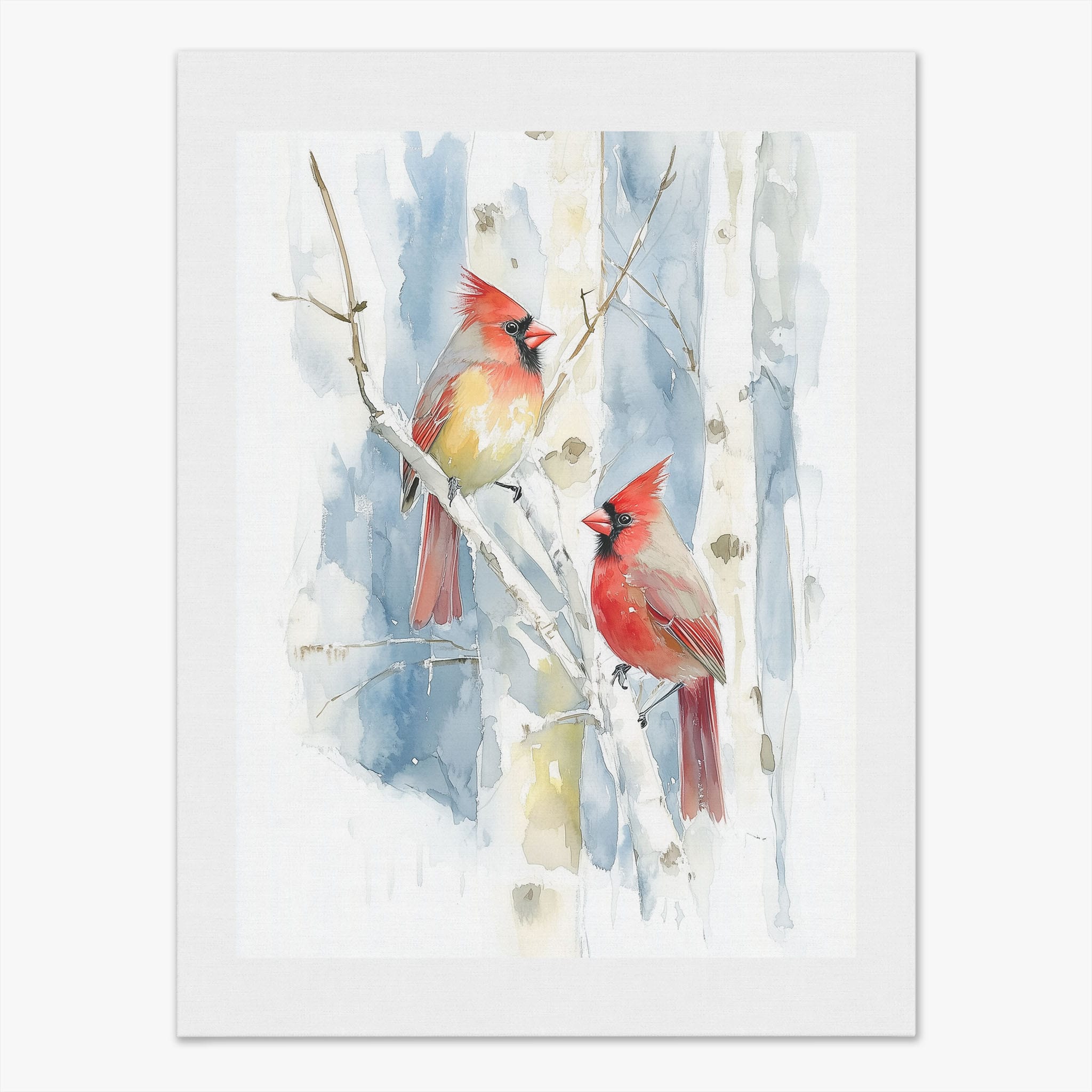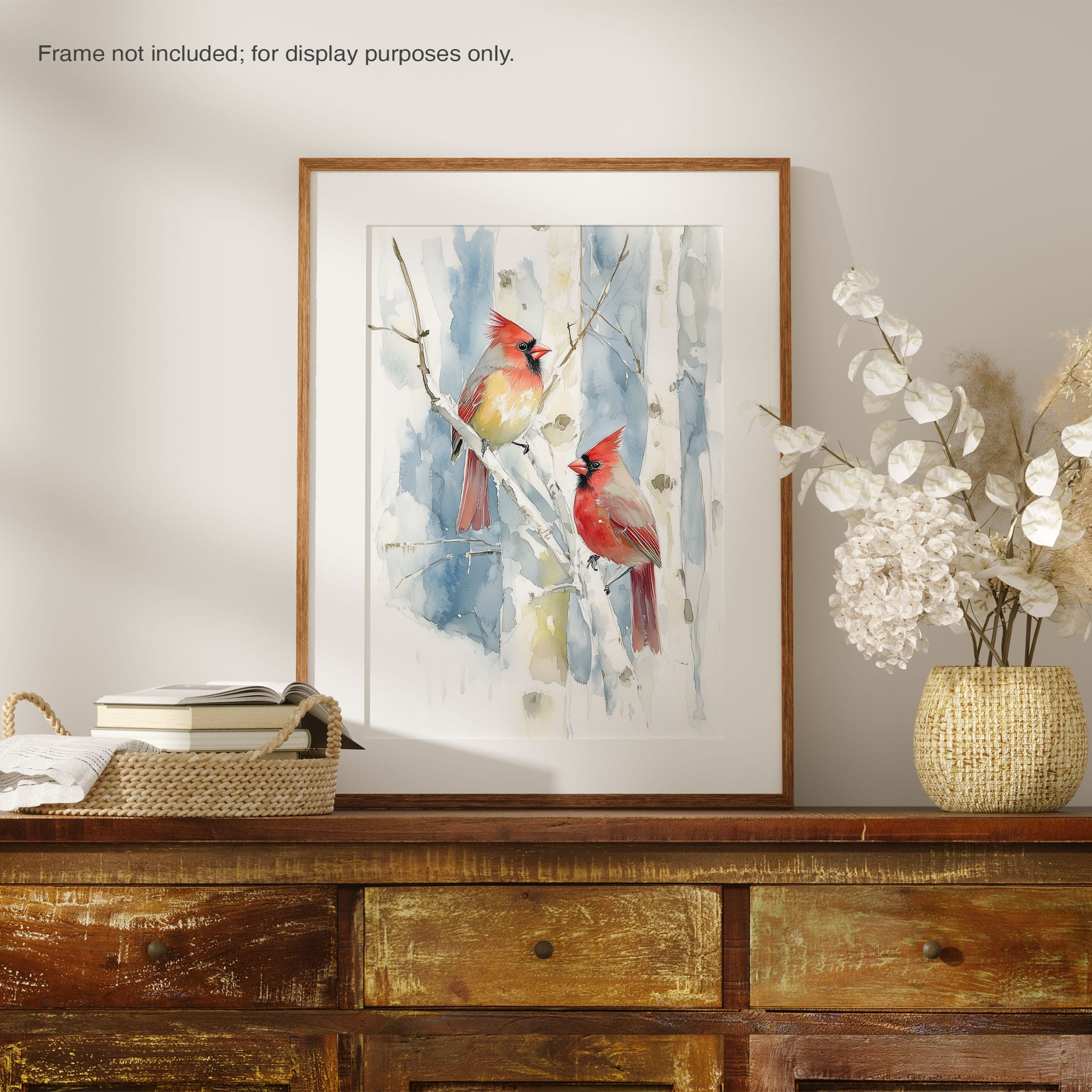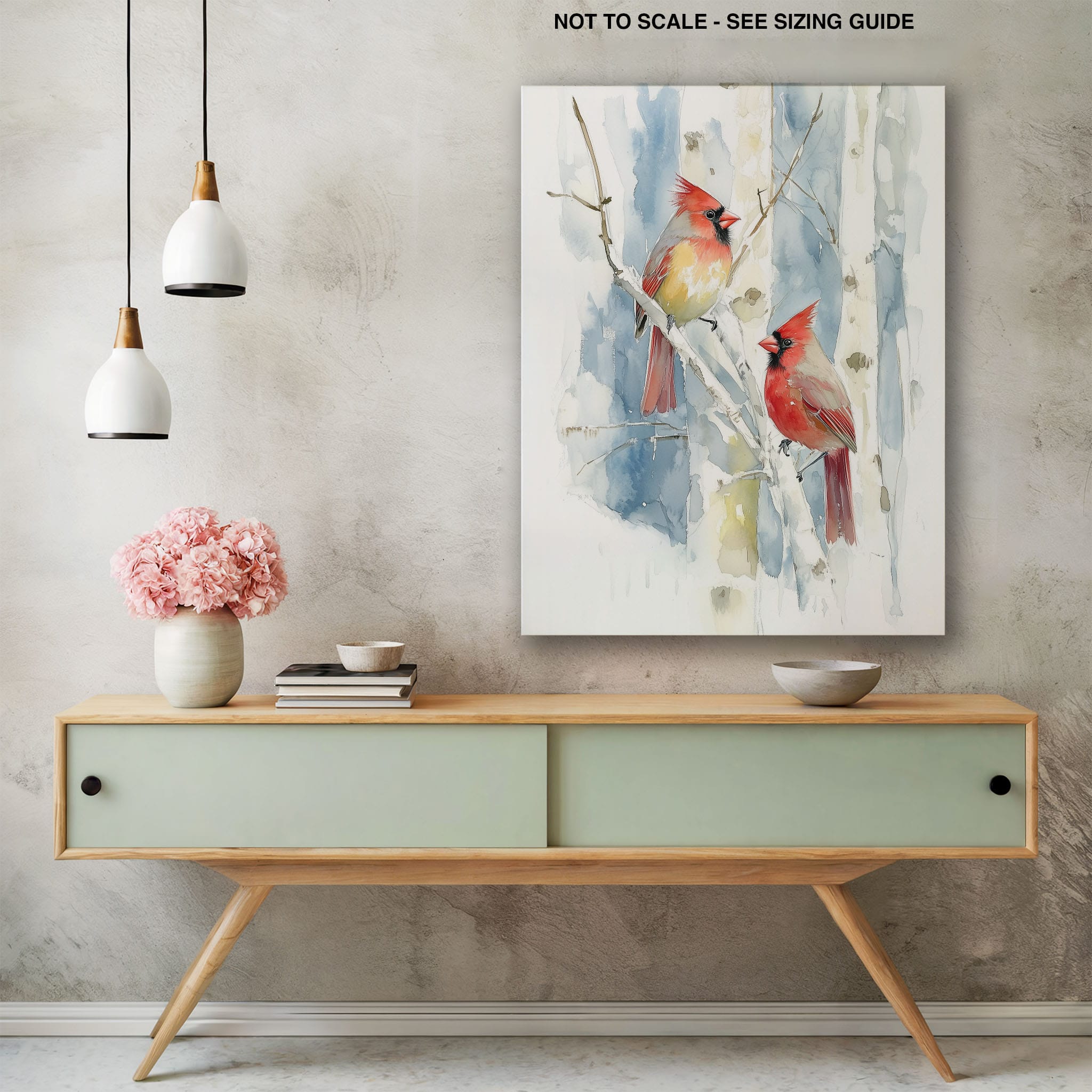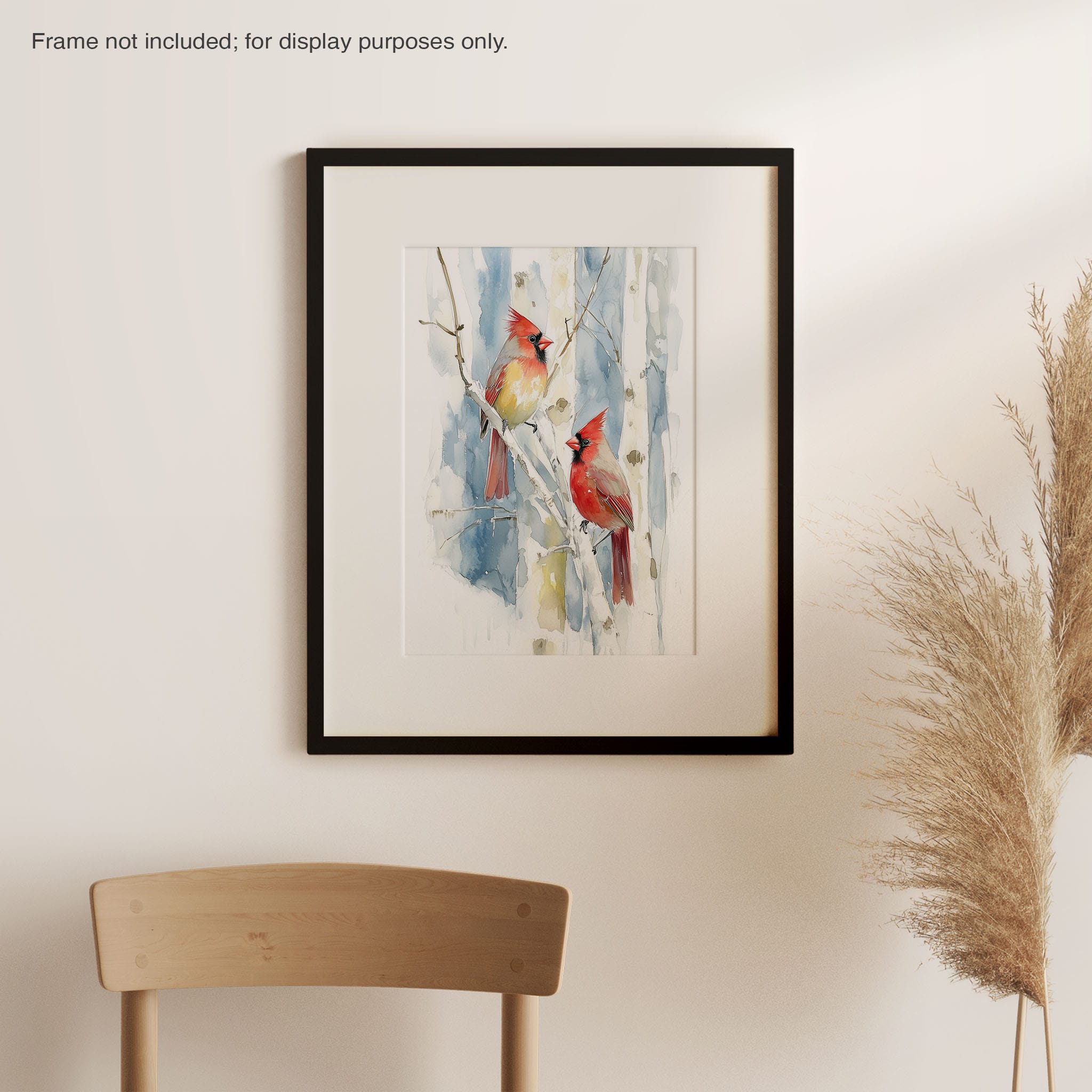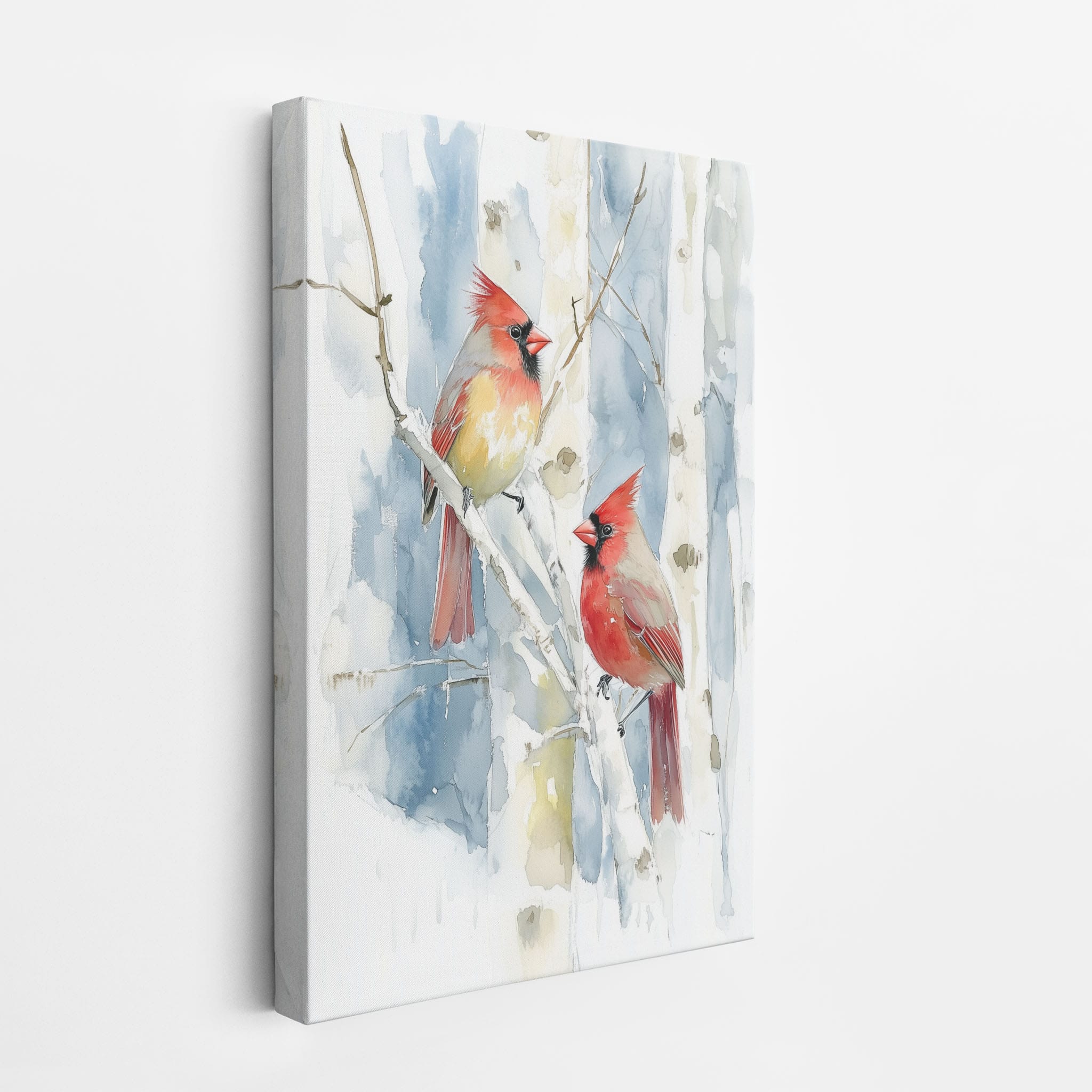 This stunning watercolor artwork captures the natural elegance of two cardinals perched delicately on winter branches. Their vibrant red plumage contrasts beautifully against the softly blended blues and neutrals of the background, invoking a serene yet playful impressionist vibe. Ideal for any bird lover or art aficionado, this piece brings a touch of whimsy and color to any room. Transform your space with this lovely depiction of nature's simplicity and beauty. Perfect for both modern and rustic decors, it is a must-have for those who appreciate art that combines realism with a touch of the fantastical.