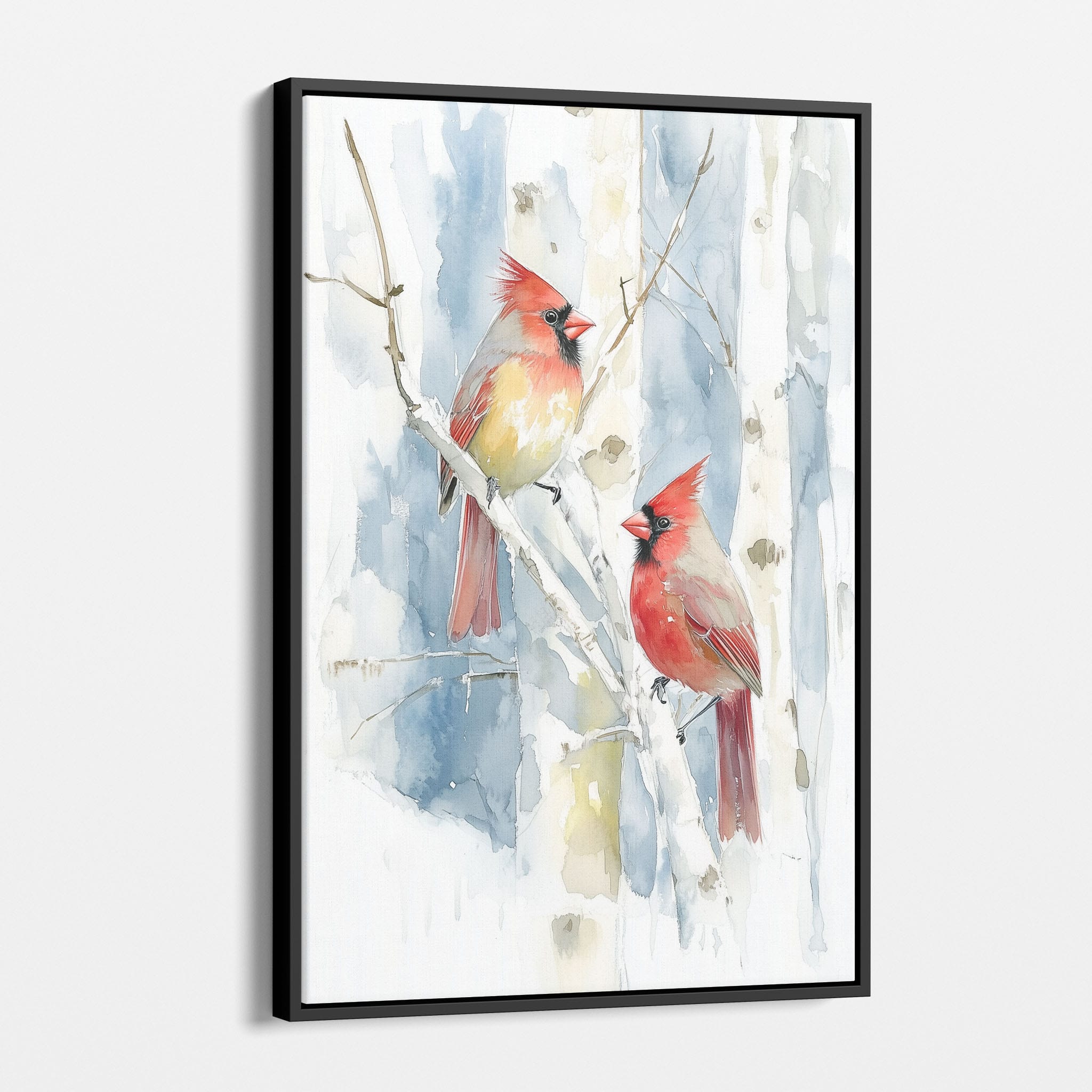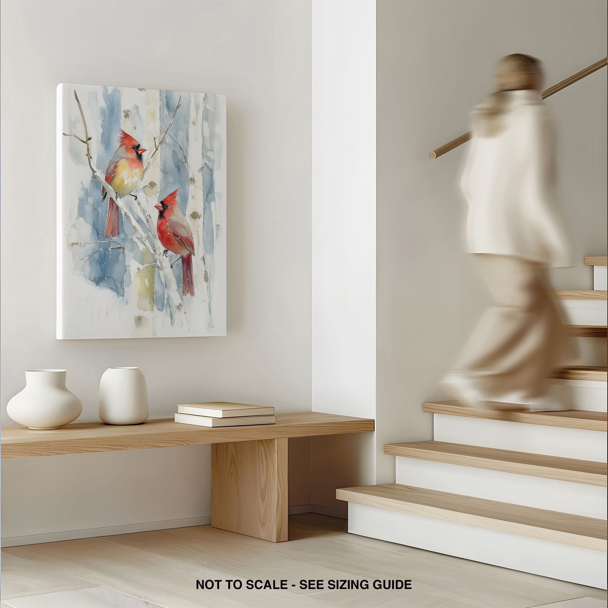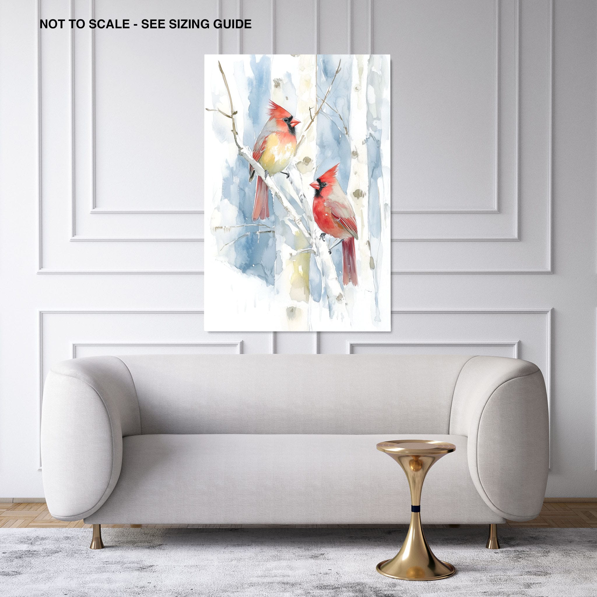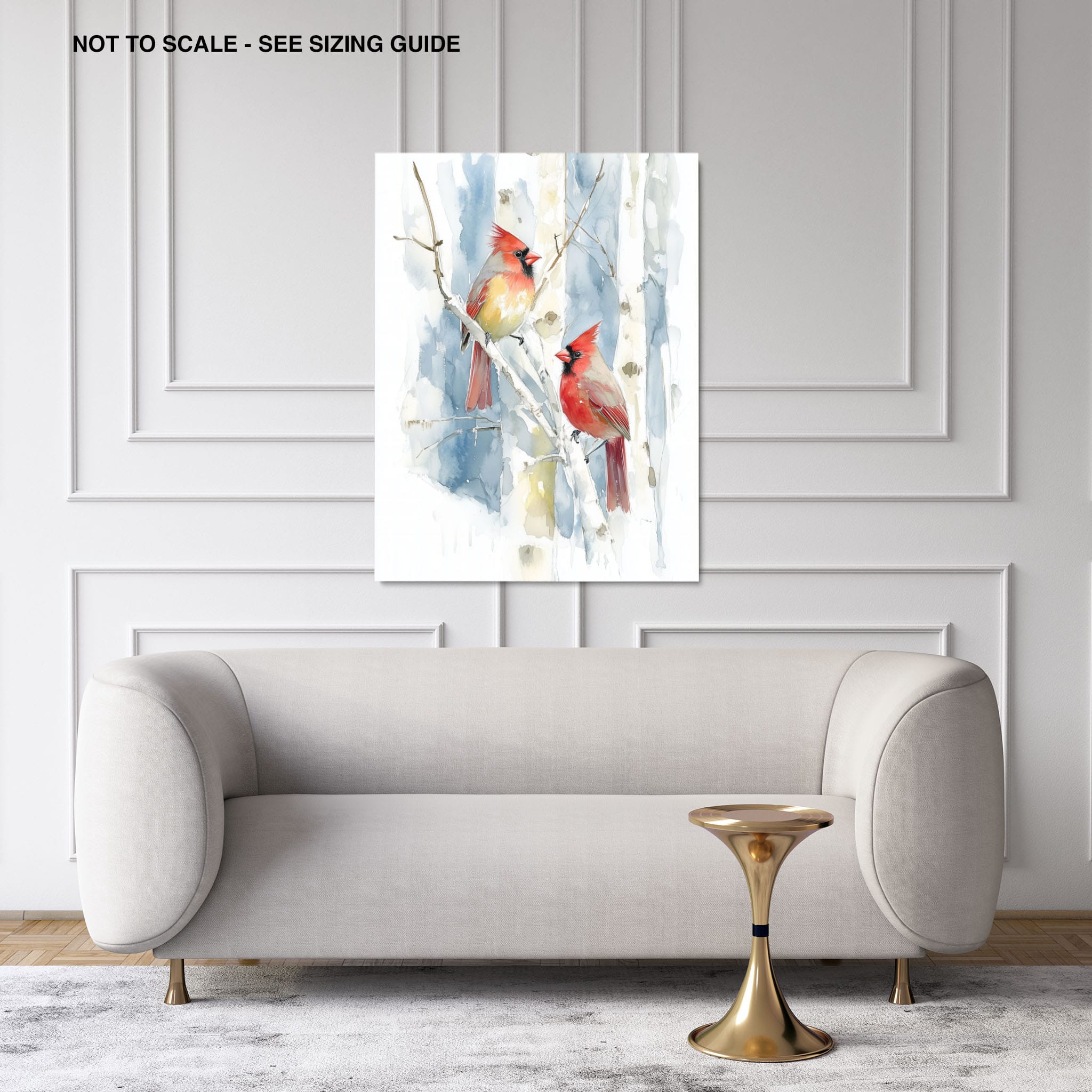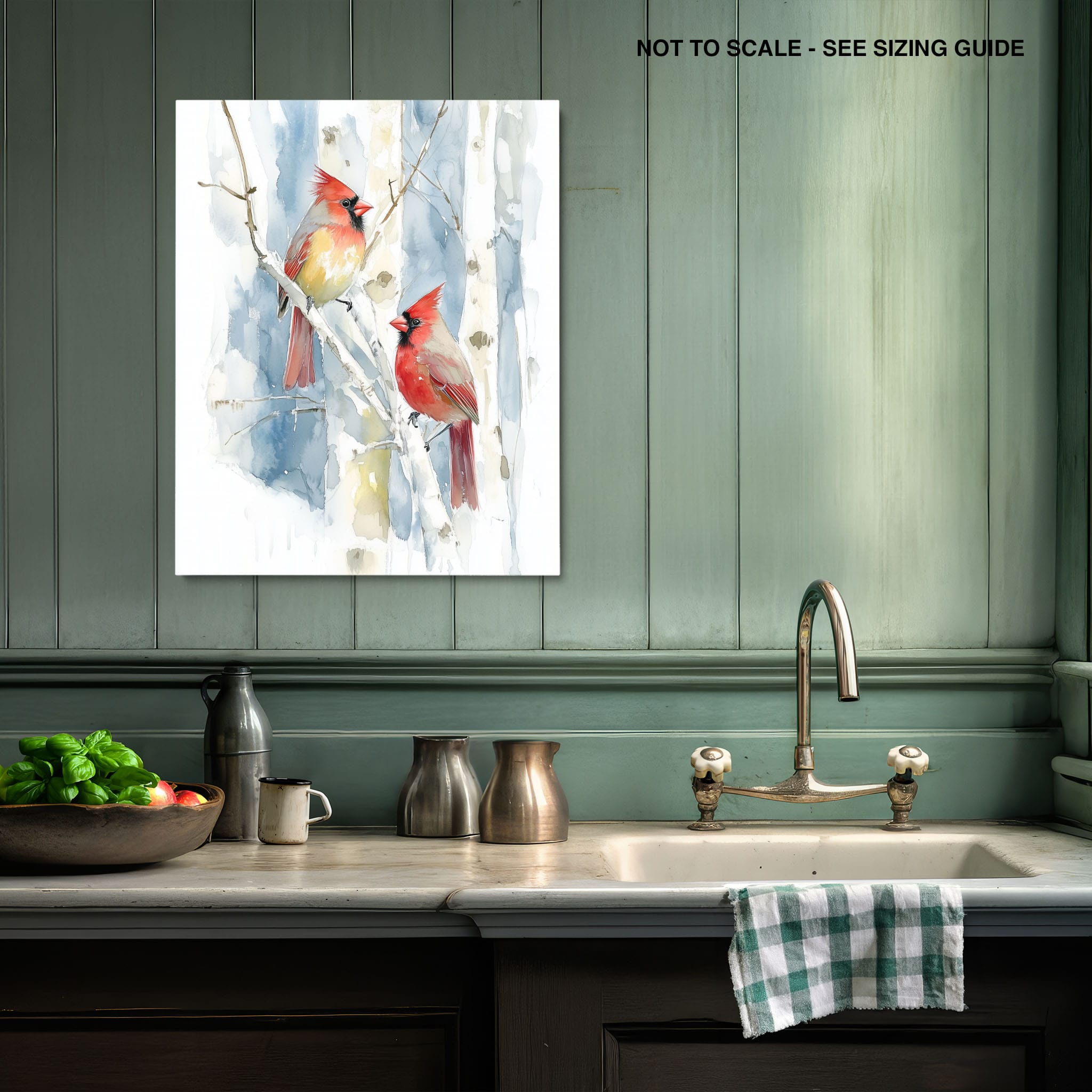 This stunning watercolor artwork captures the natural elegance of two cardinals perched delicately on winter branches. Their vibrant red plumage contrasts beautifully against the softly blended blues and neutrals of the background, invoking a serene yet playful impressionist vibe. Ideal for any bird lover or art aficionado, this piece brings a touch of whimsy and color to any room. Transform your space with this lovely depiction of nature's simplicity and beauty. Perfect for both modern and rustic decors, it is a must-have for those who appreciate art that combines realism with a touch of the fantastical.