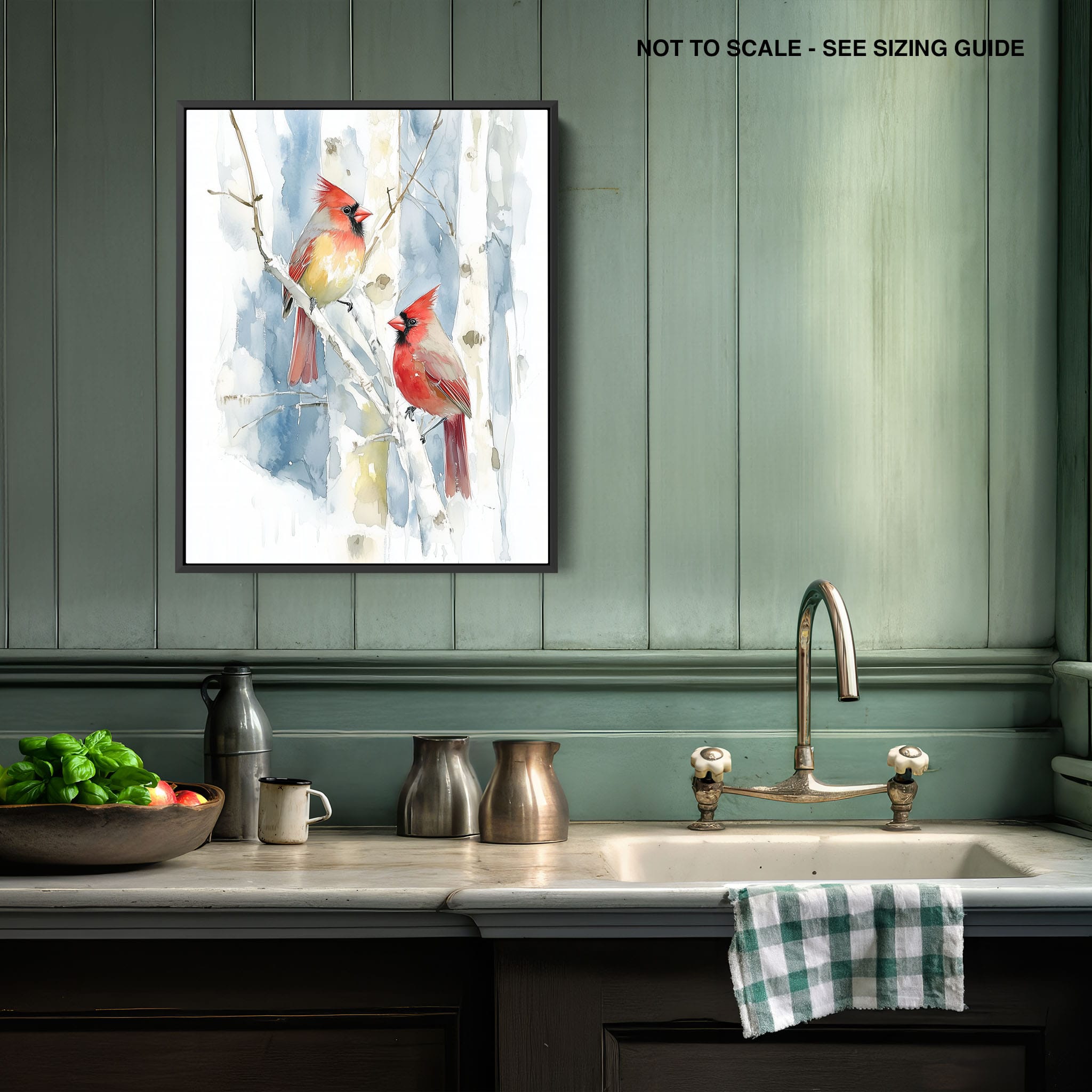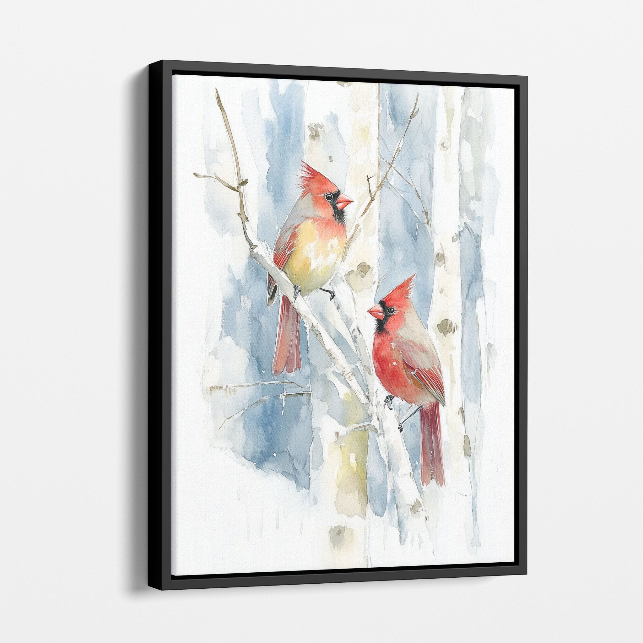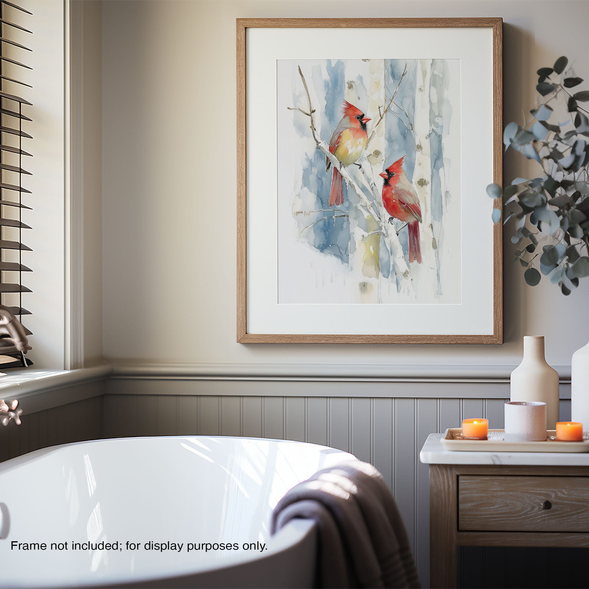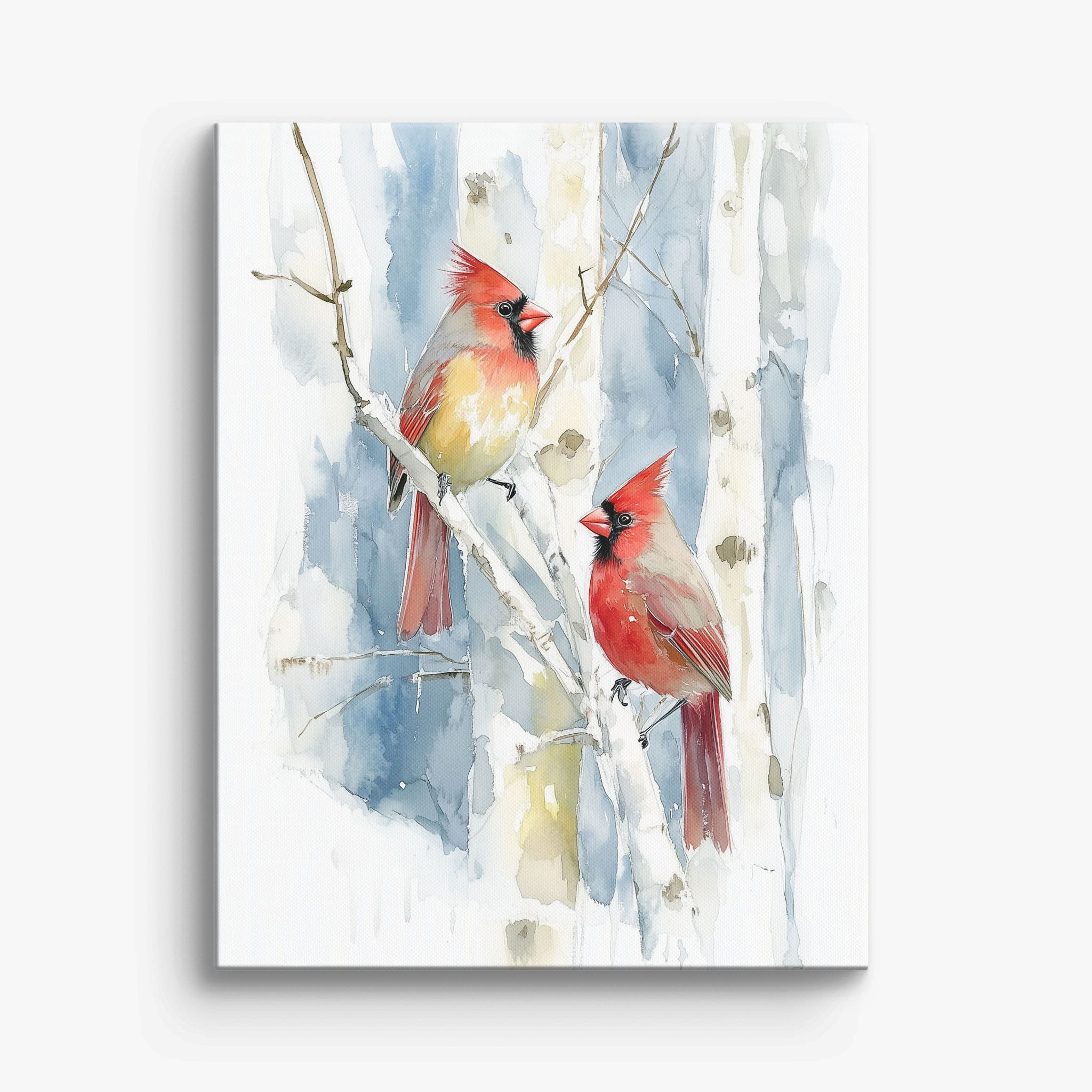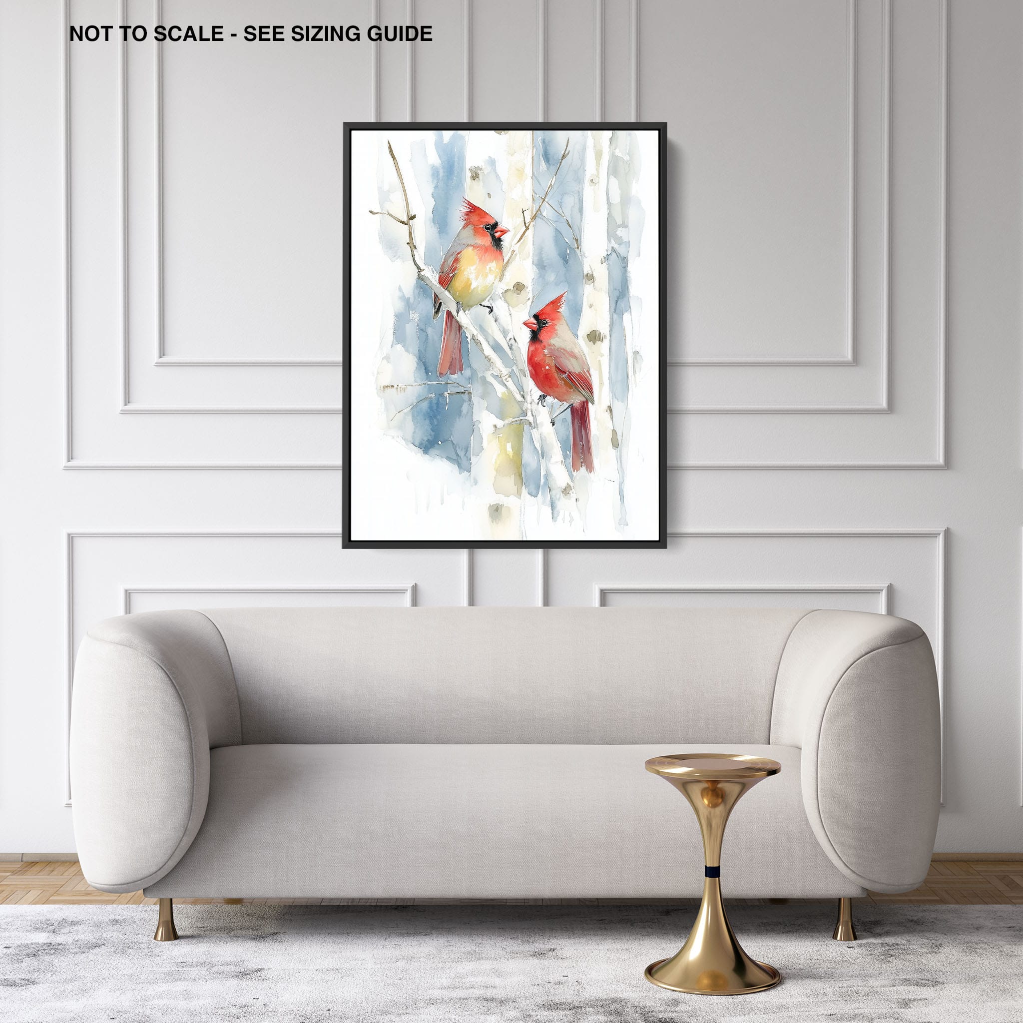 This stunning watercolor artwork captures the natural elegance of two cardinals perched delicately on winter branches. Their vibrant red plumage contrasts beautifully against the softly blended blues and neutrals of the background, invoking a serene yet playful impressionist vibe. Ideal for any bird lover or art aficionado, this piece brings a touch of whimsy and color to any room. Transform your space with this lovely depiction of nature's simplicity and beauty. Perfect for both modern and rustic decors, it is a must-have for those who appreciate art that combines realism with a touch of the fantastical.