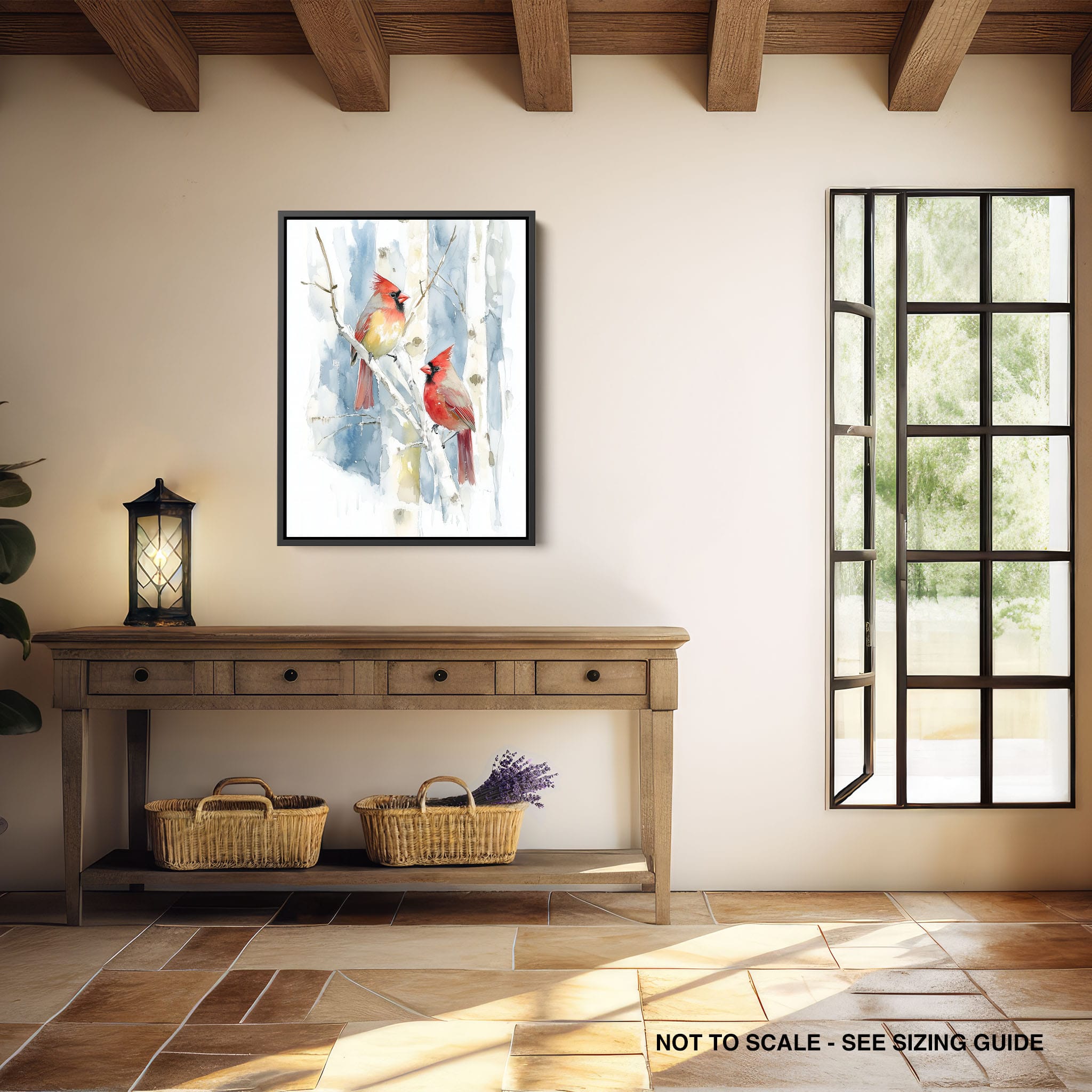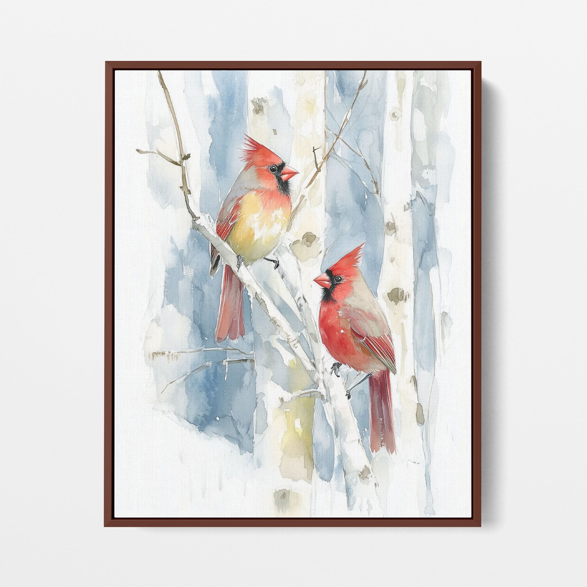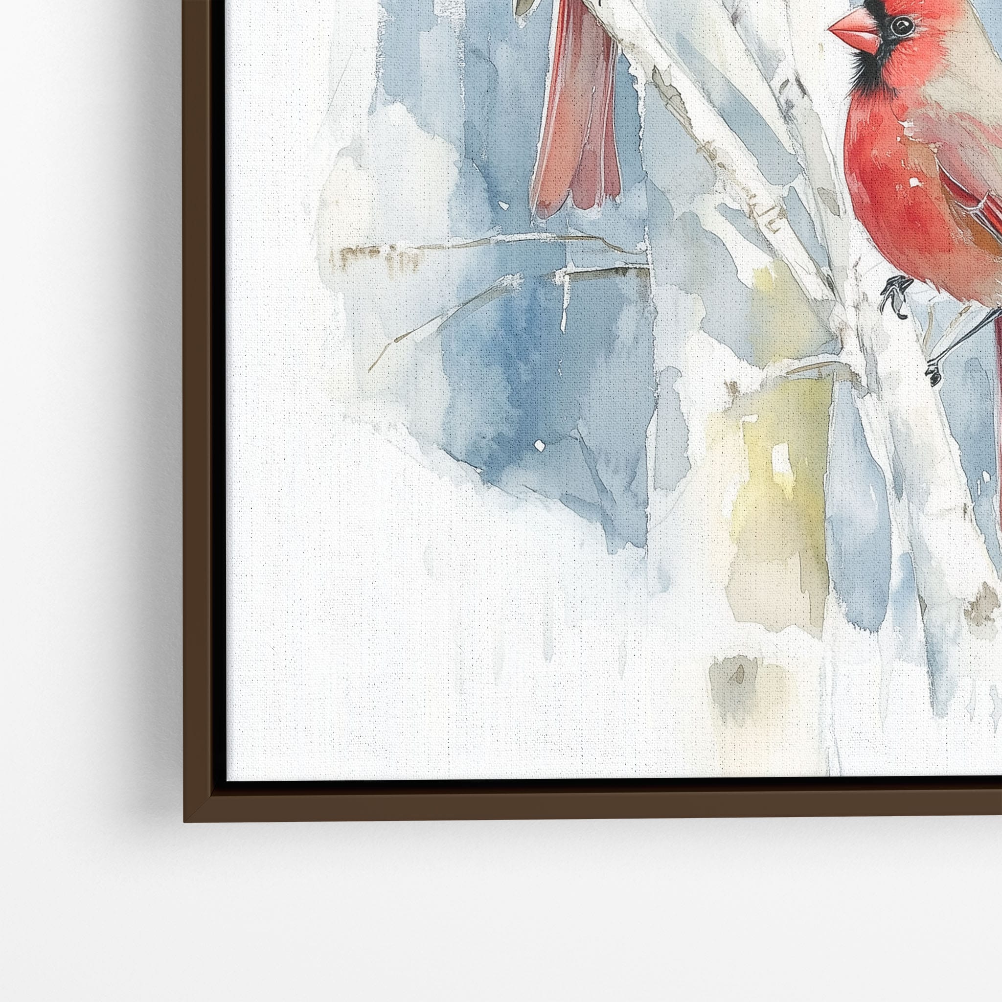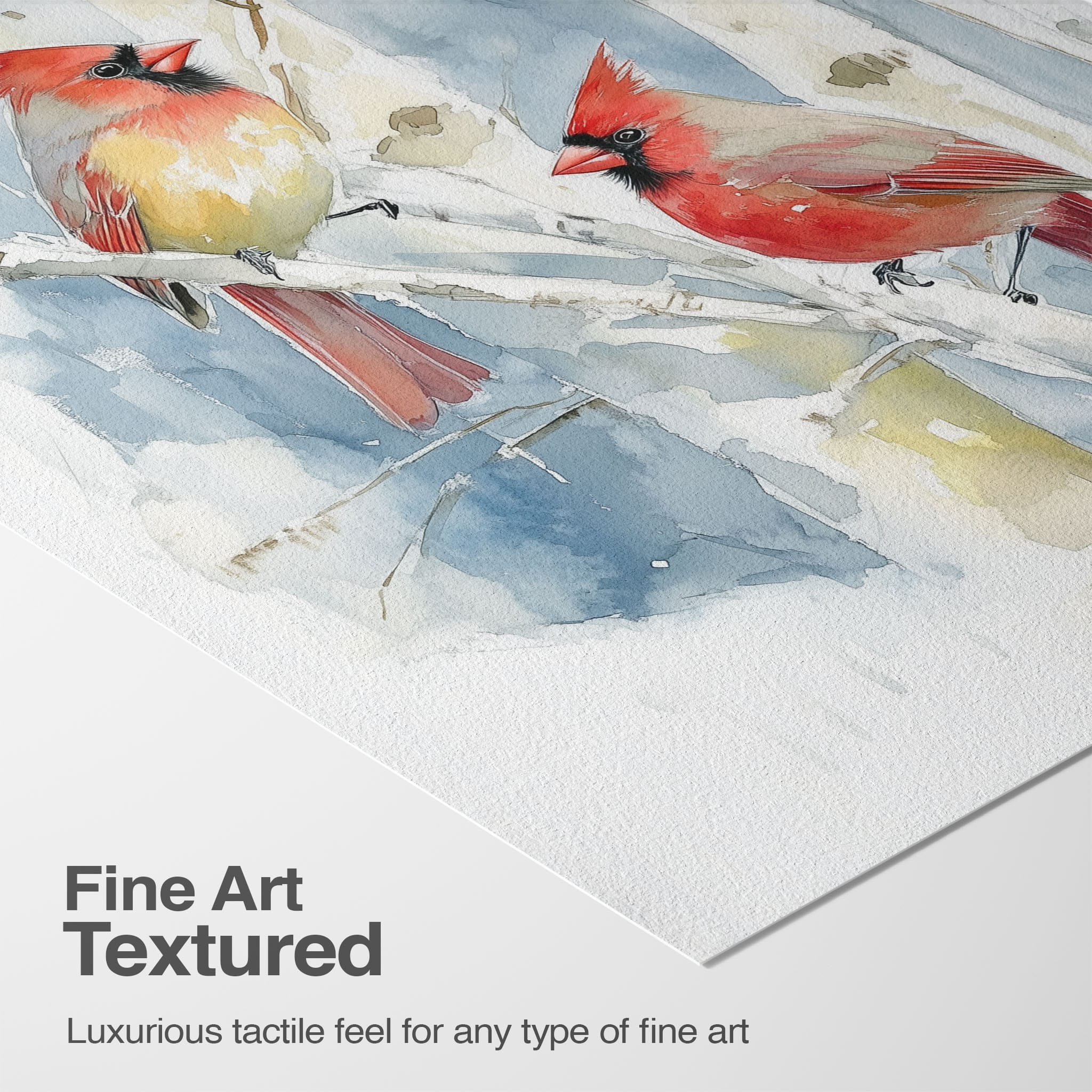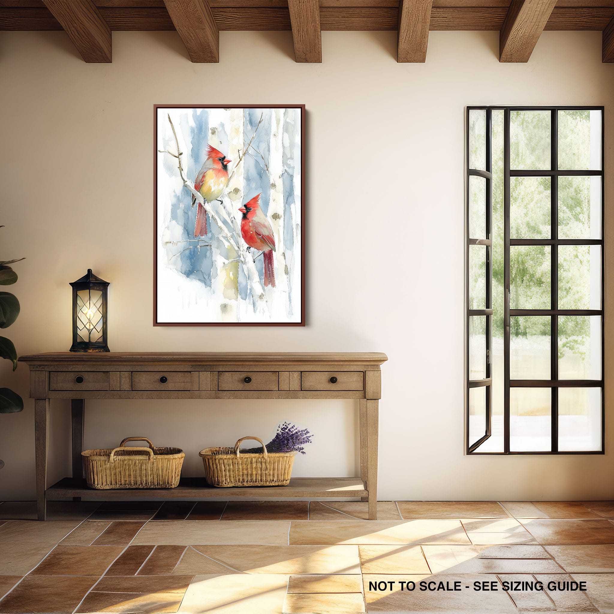 This stunning watercolor artwork captures the natural elegance of two cardinals perched delicately on winter branches. Their vibrant red plumage contrasts beautifully against the softly blended blues and neutrals of the background, invoking a serene yet playful impressionist vibe. Ideal for any bird lover or art aficionado, this piece brings a touch of whimsy and color to any room. Transform your space with this lovely depiction of nature's simplicity and beauty. Perfect for both modern and rustic decors, it is a must-have for those who appreciate art that combines realism with a touch of the fantastical.