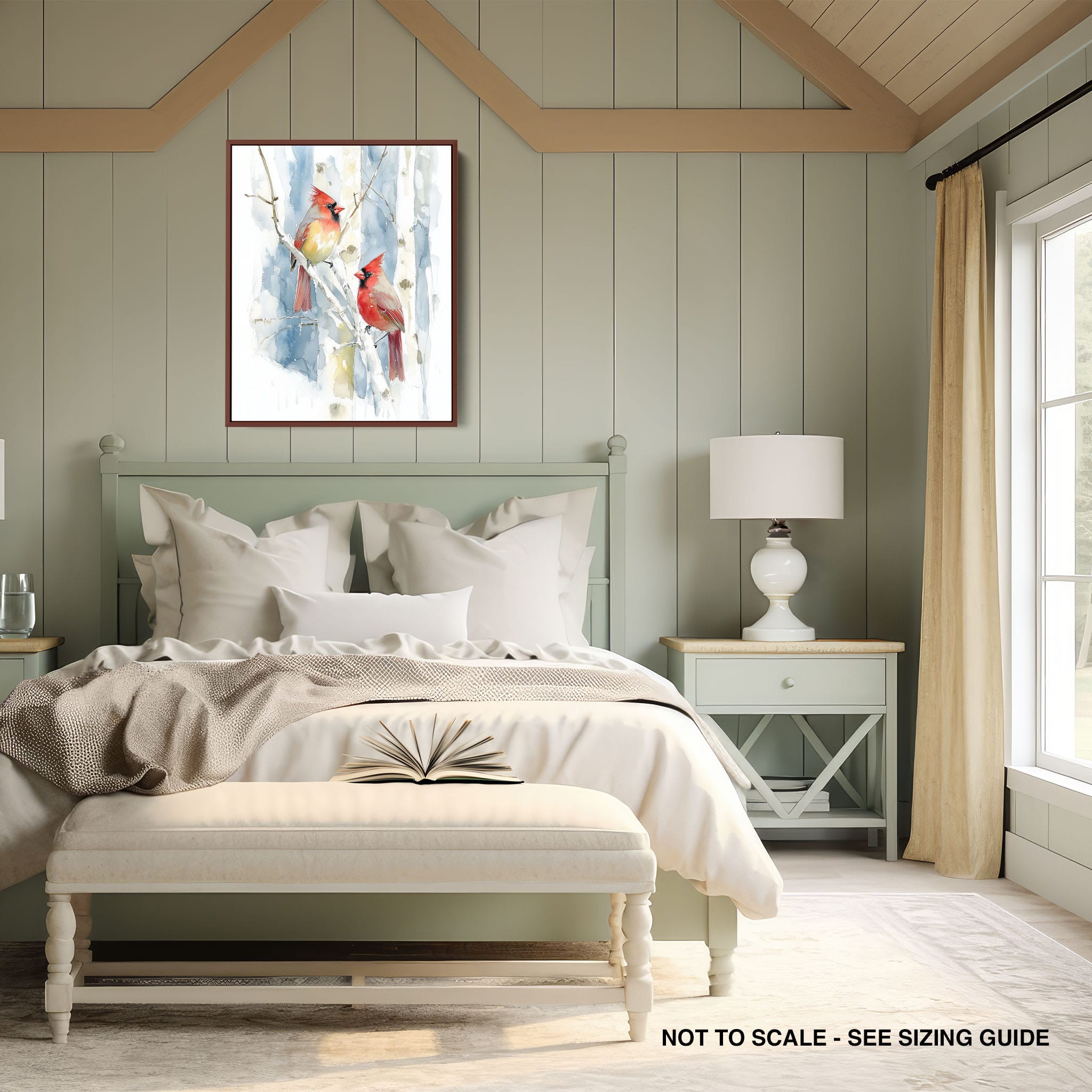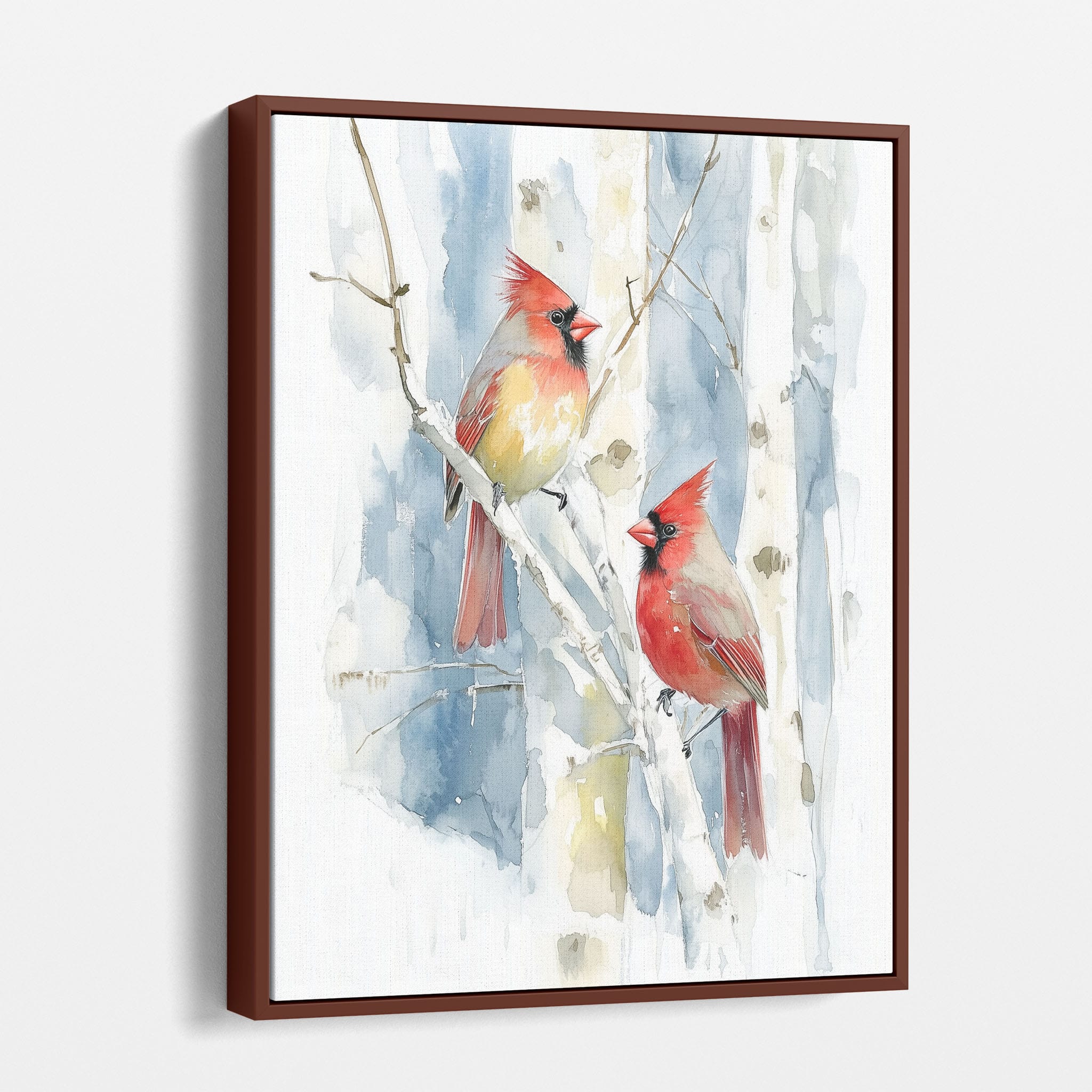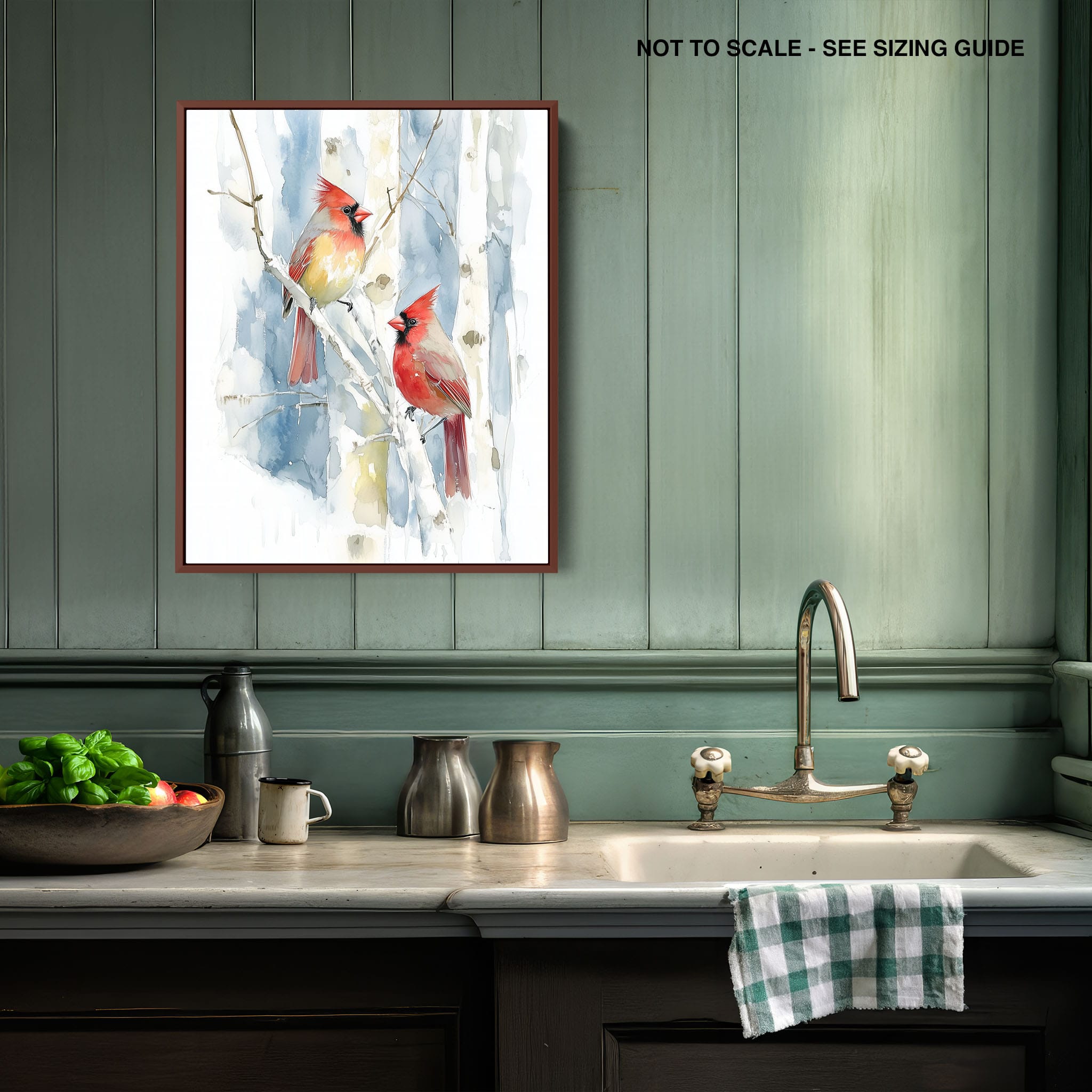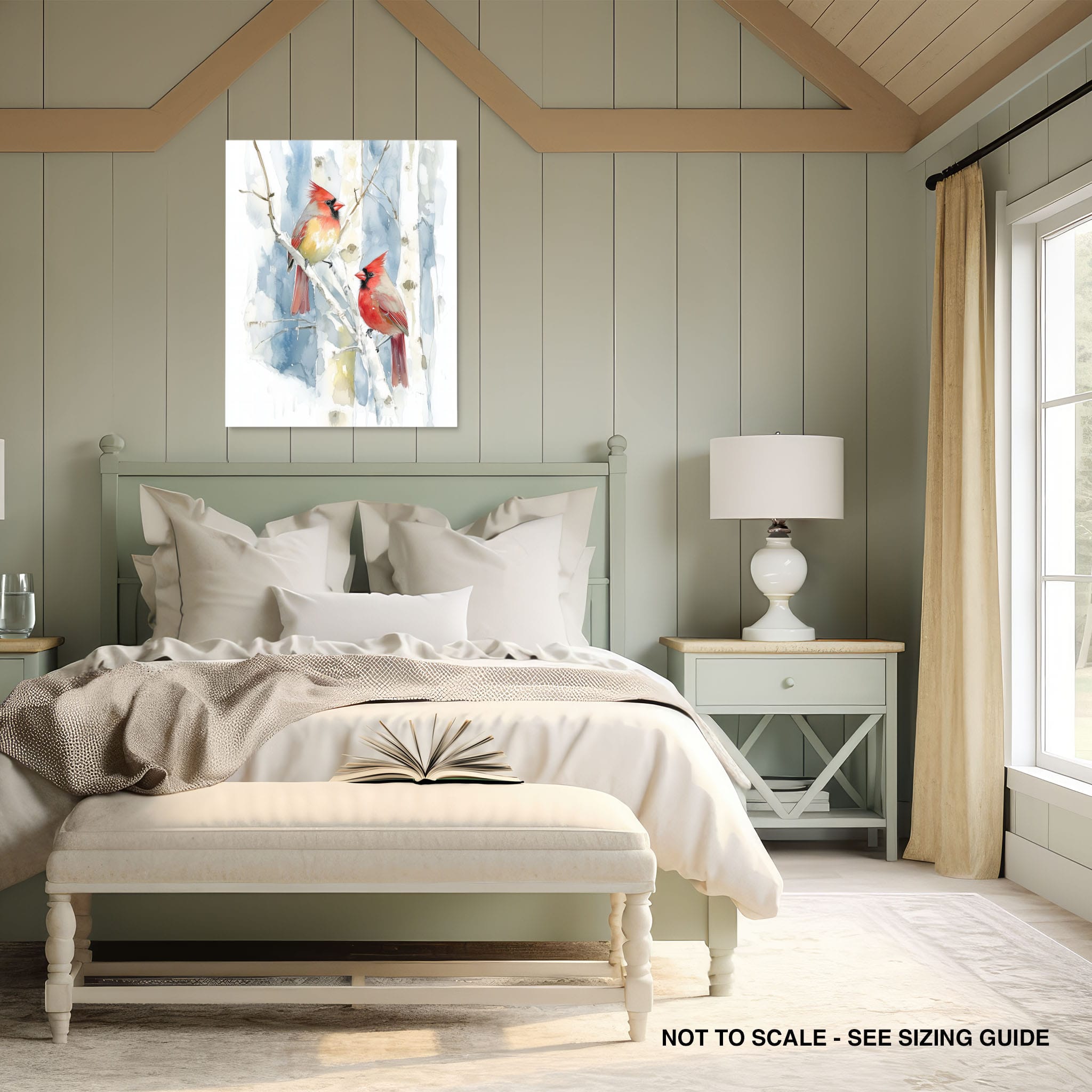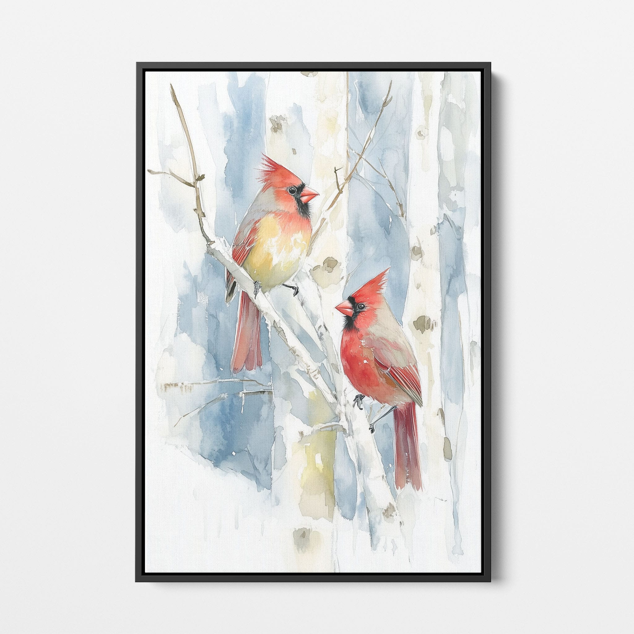 This stunning watercolor artwork captures the natural elegance of two cardinals perched delicately on winter branches. Their vibrant red plumage contrasts beautifully against the softly blended blues and neutrals of the background, invoking a serene yet playful impressionist vibe. Ideal for any bird lover or art aficionado, this piece brings a touch of whimsy and color to any room. Transform your space with this lovely depiction of nature's simplicity and beauty. Perfect for both modern and rustic decors, it is a must-have for those who appreciate art that combines realism with a touch of the fantastical.