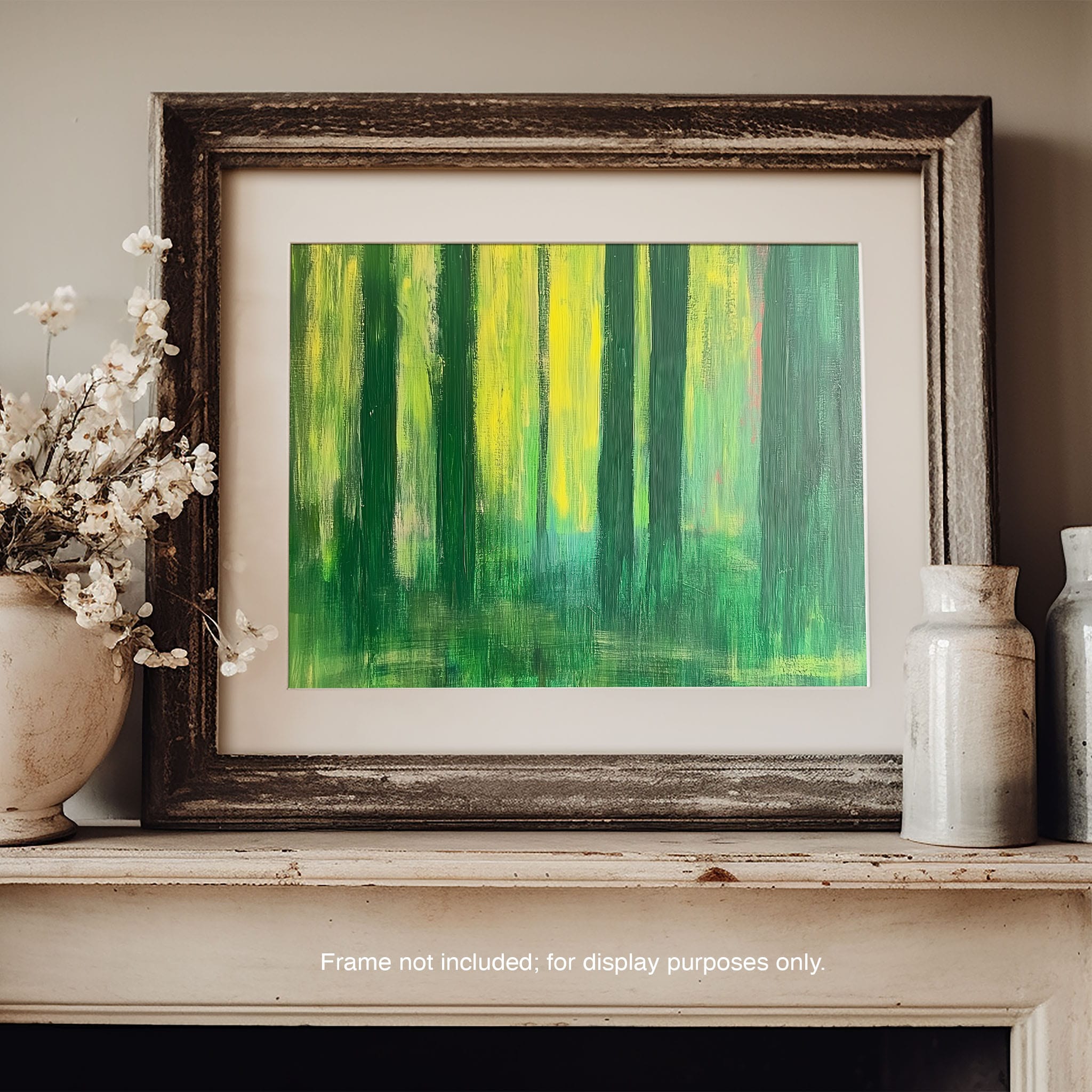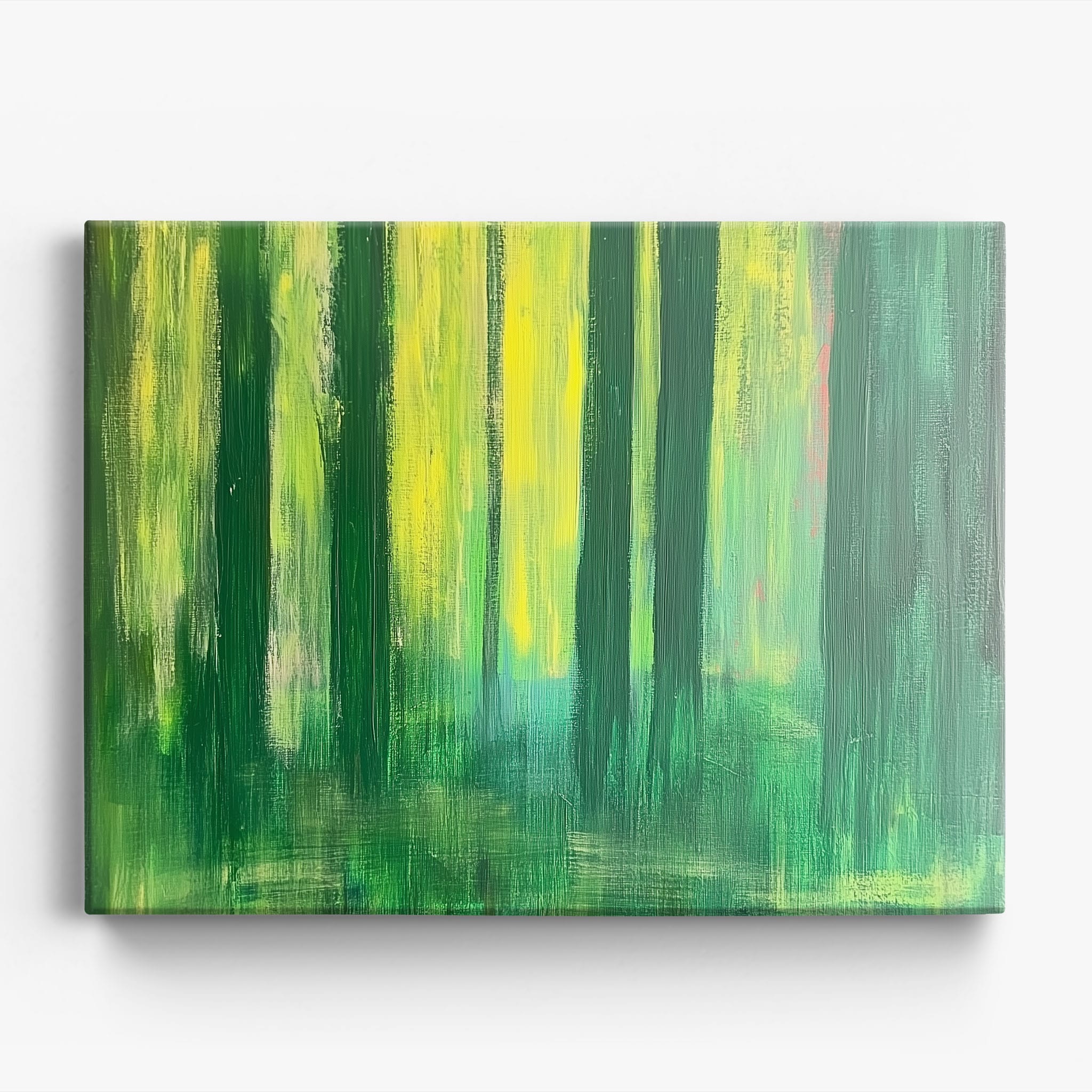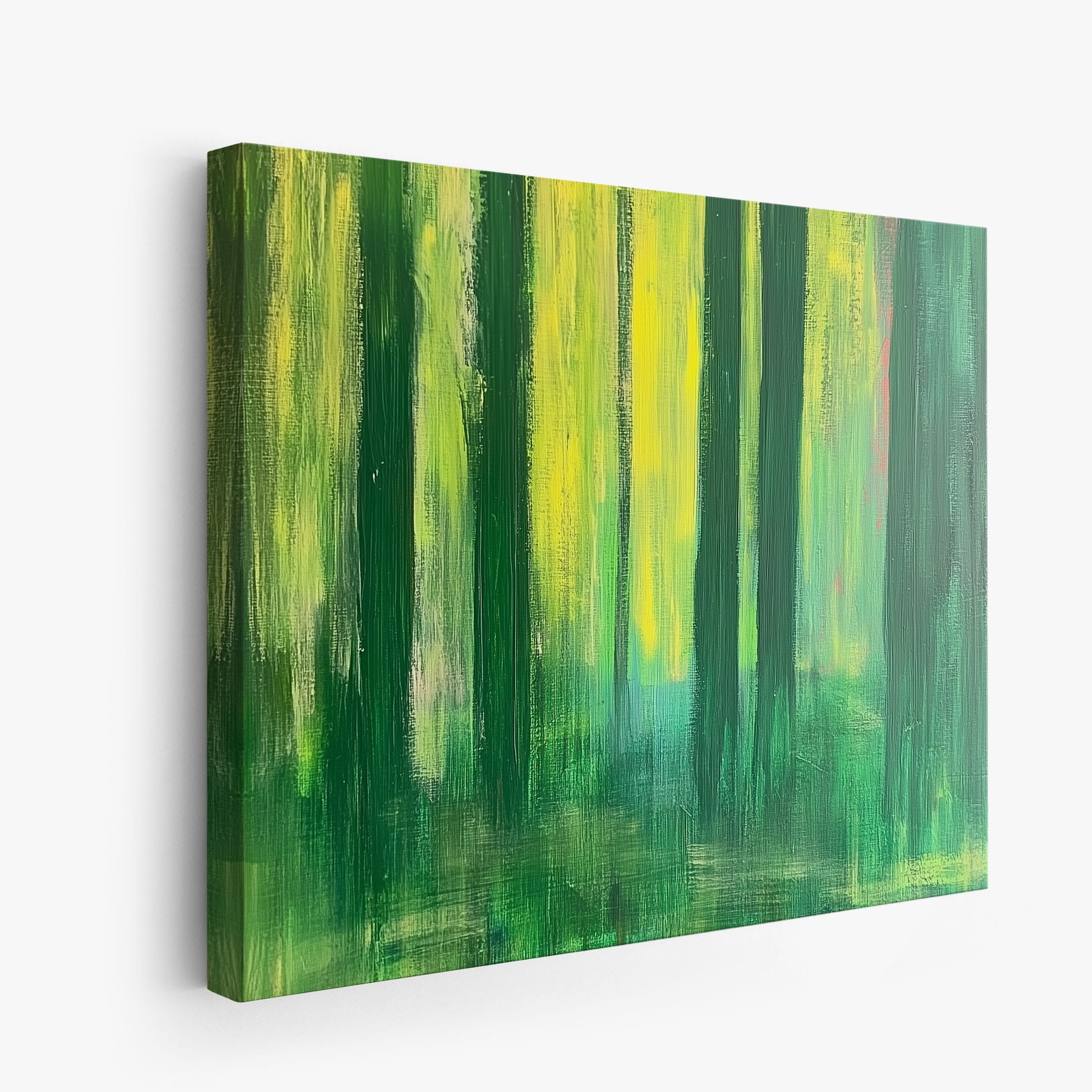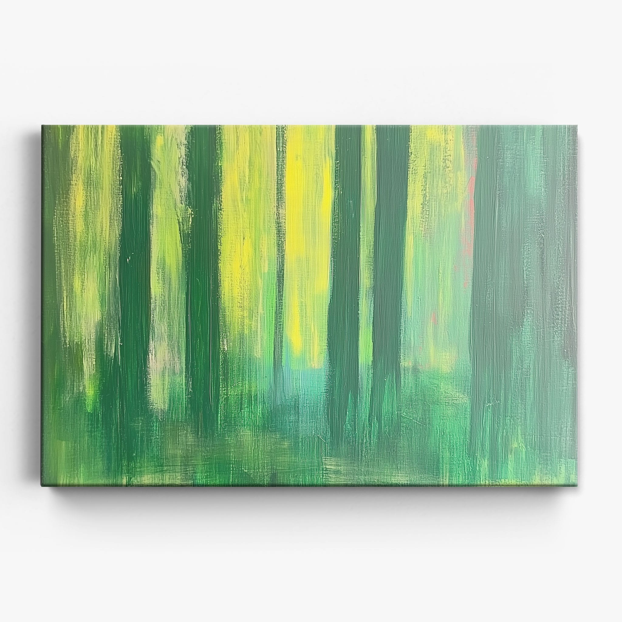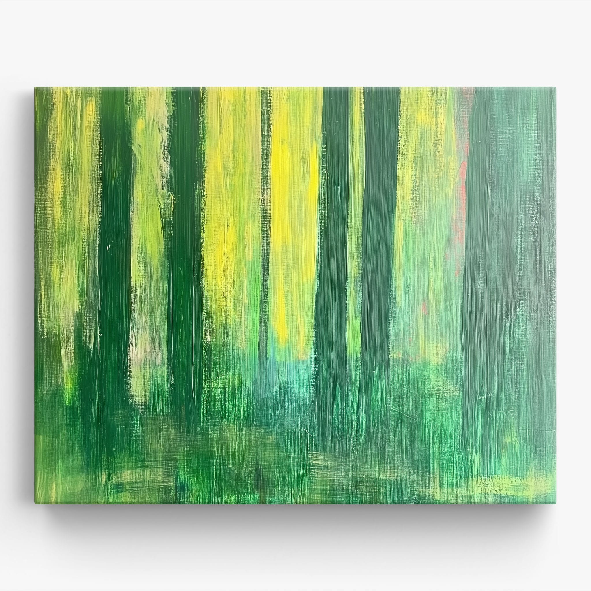 This painting captures the serene essence of a forest through bold strokes and vibrant shades of green. The abstract depiction uses impressionistic influences to evoke the varying light and shadows found within woodland realms. Its modern take on a natural landscape makes it ideal for any space that seeks a touch of tranquility paired with contemporary artistic flair. Add this piece to your décor to bring a fresh, lively energy to any room. Perfect for art lovers seeking a blend of environmental beauty and abstract artistry in their home or office.