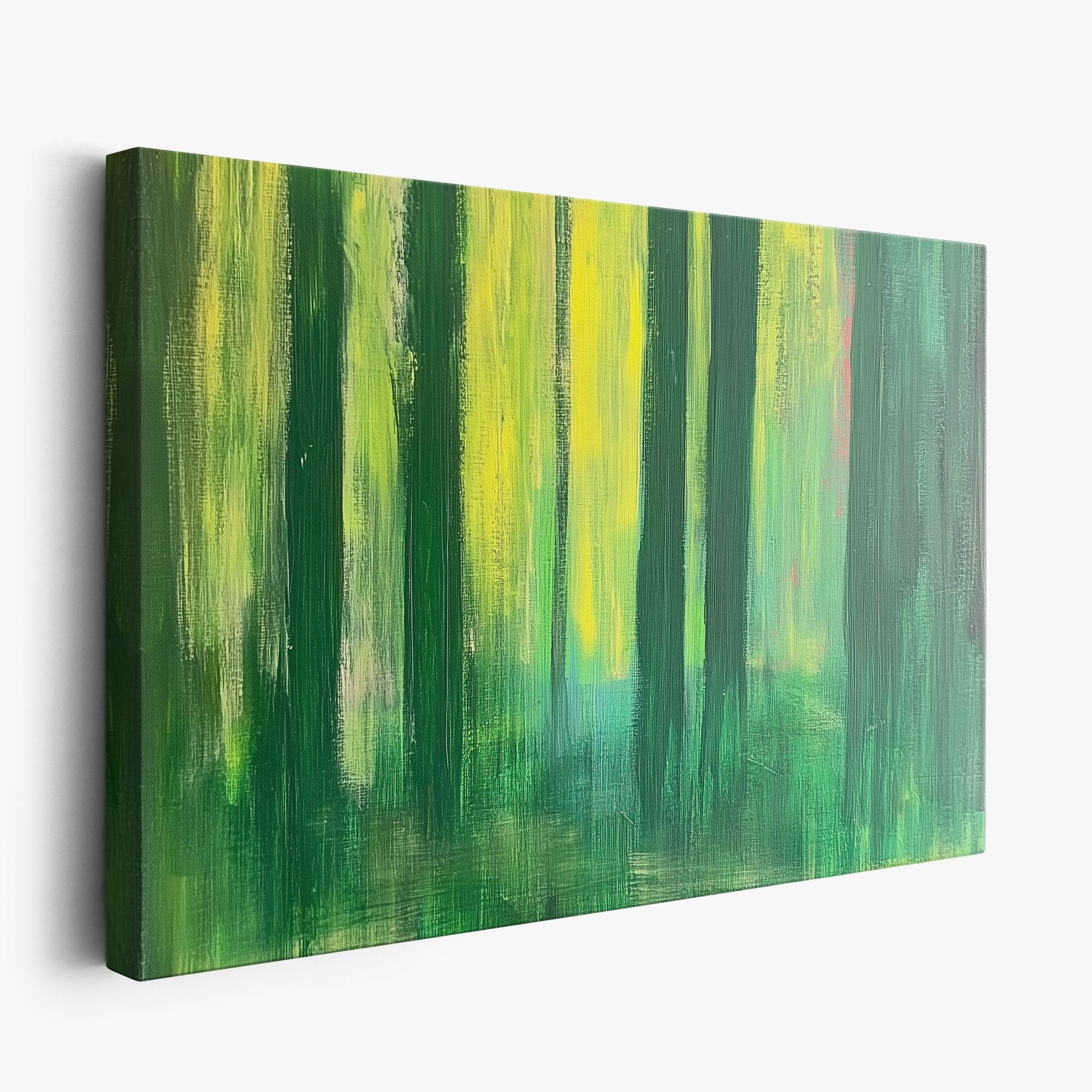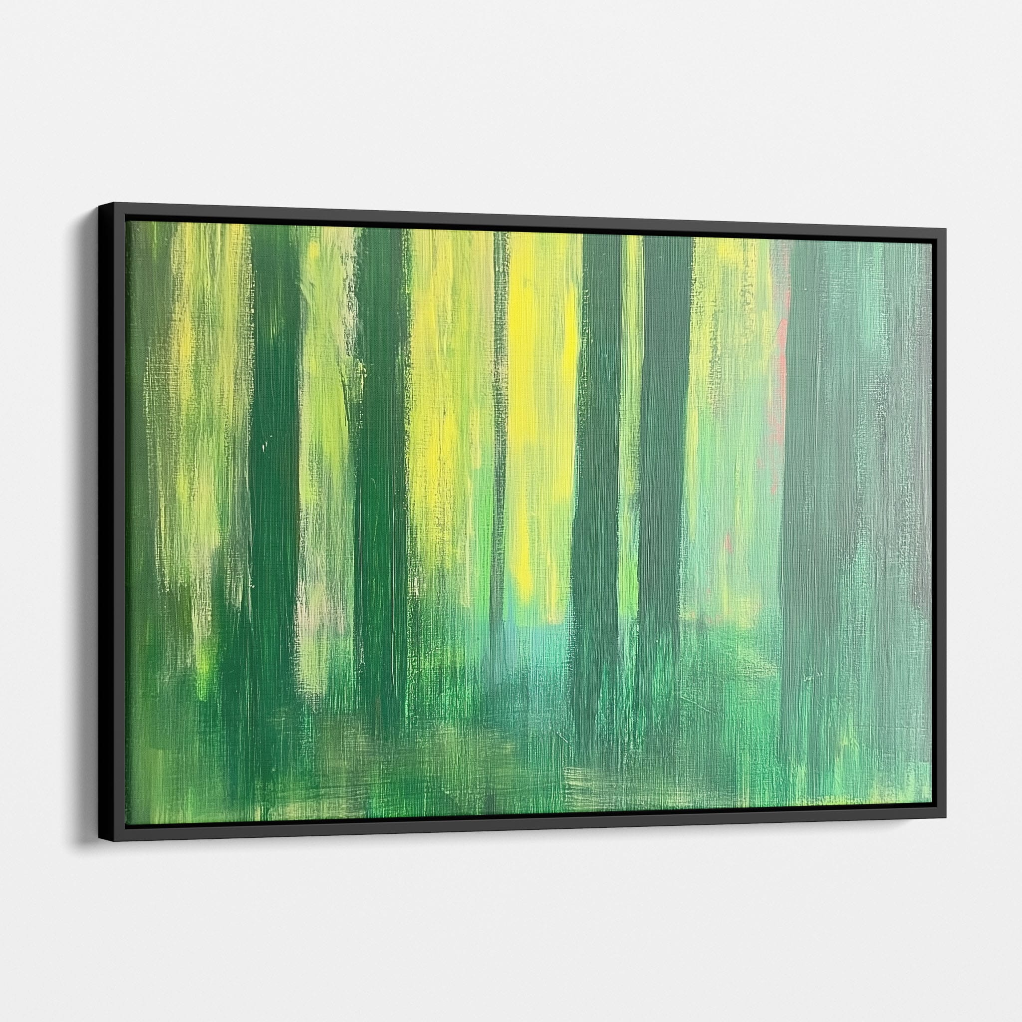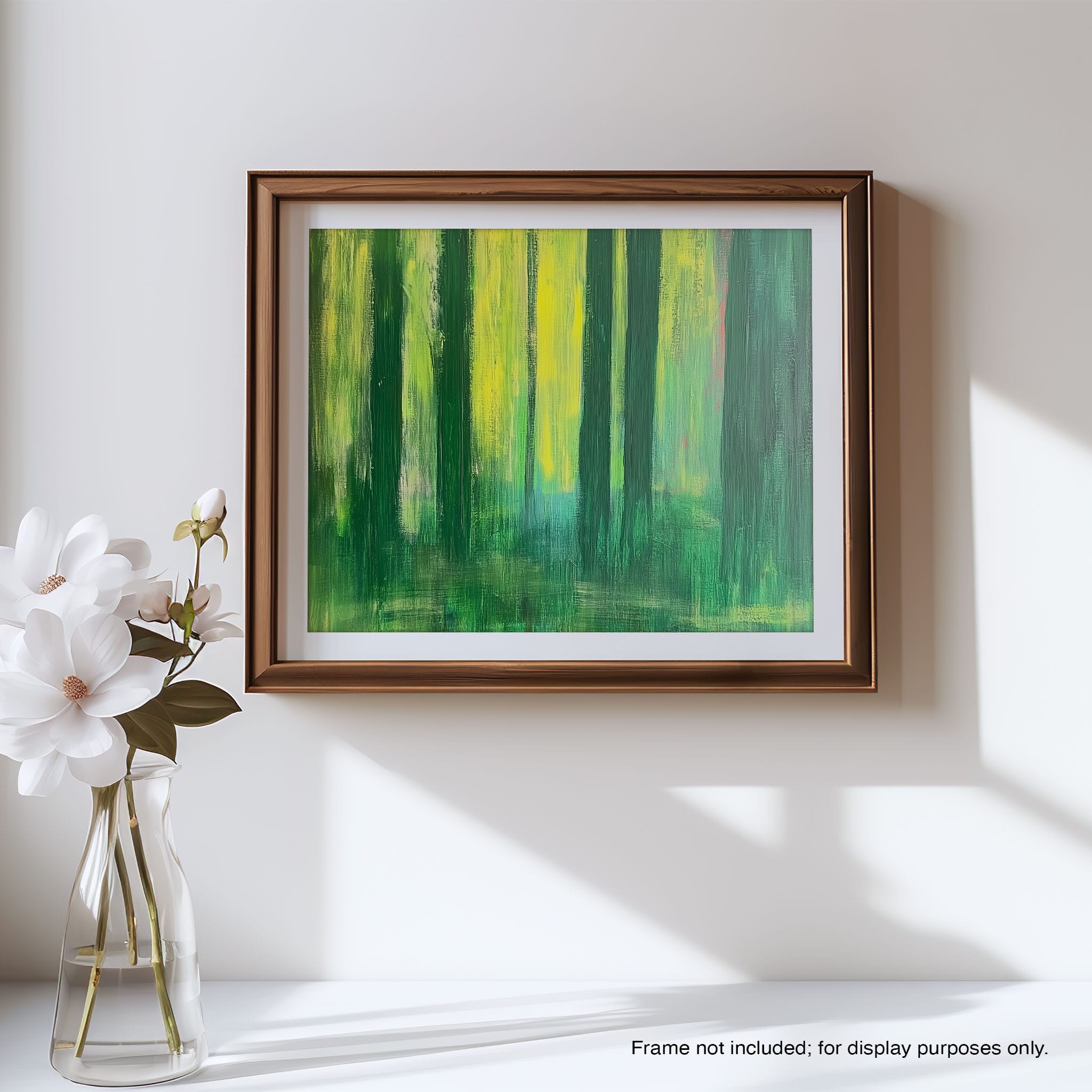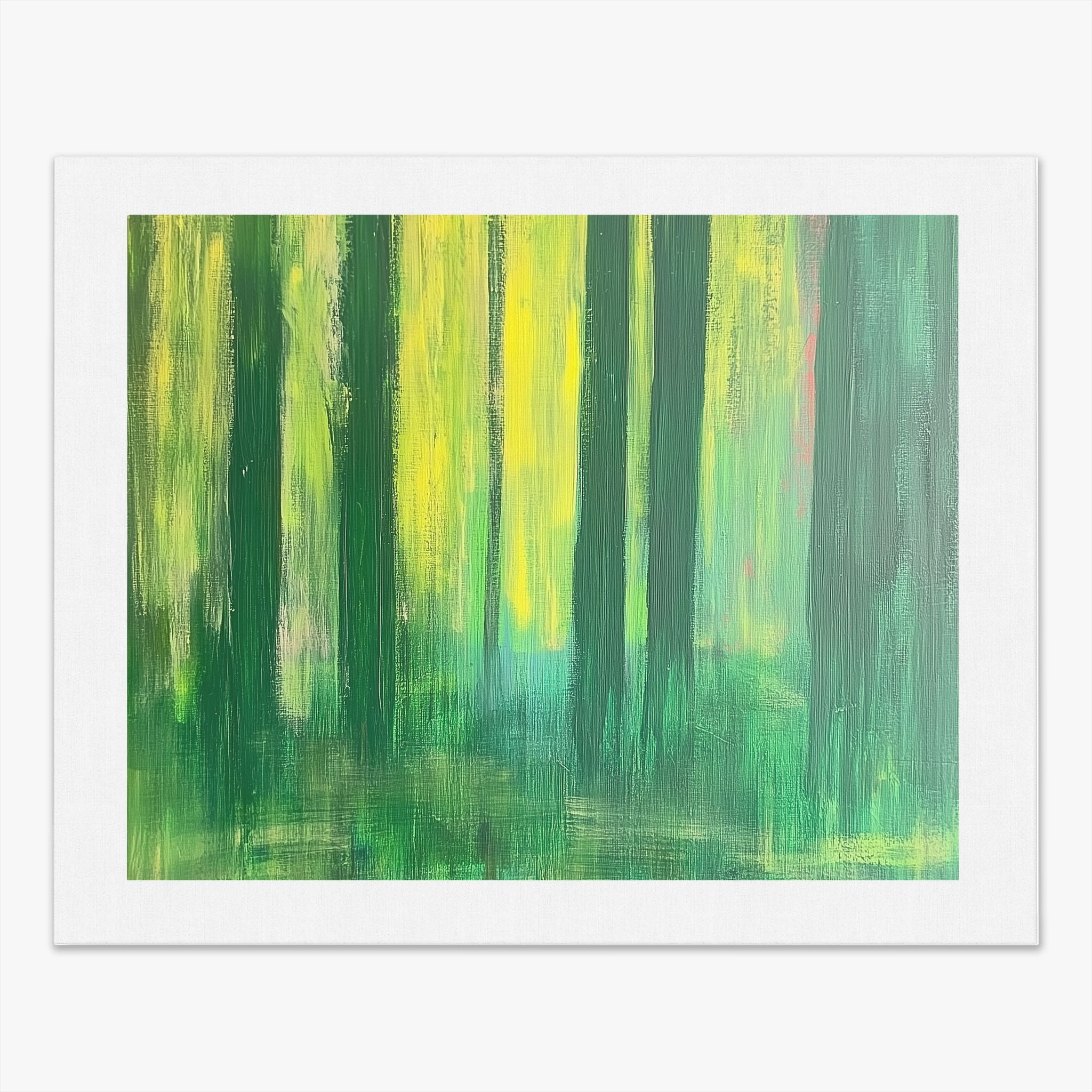 This painting captures the serene essence of a forest through bold strokes and vibrant shades of green. The abstract depiction uses impressionistic influences to evoke the varying light and shadows found within woodland realms. Its modern take on a natural landscape makes it ideal for any space that seeks a touch of tranquility paired with contemporary artistic flair. Add this piece to your décor to bring a fresh, lively energy to any room. Perfect for art lovers seeking a blend of environmental beauty and abstract artistry in their home or office.
