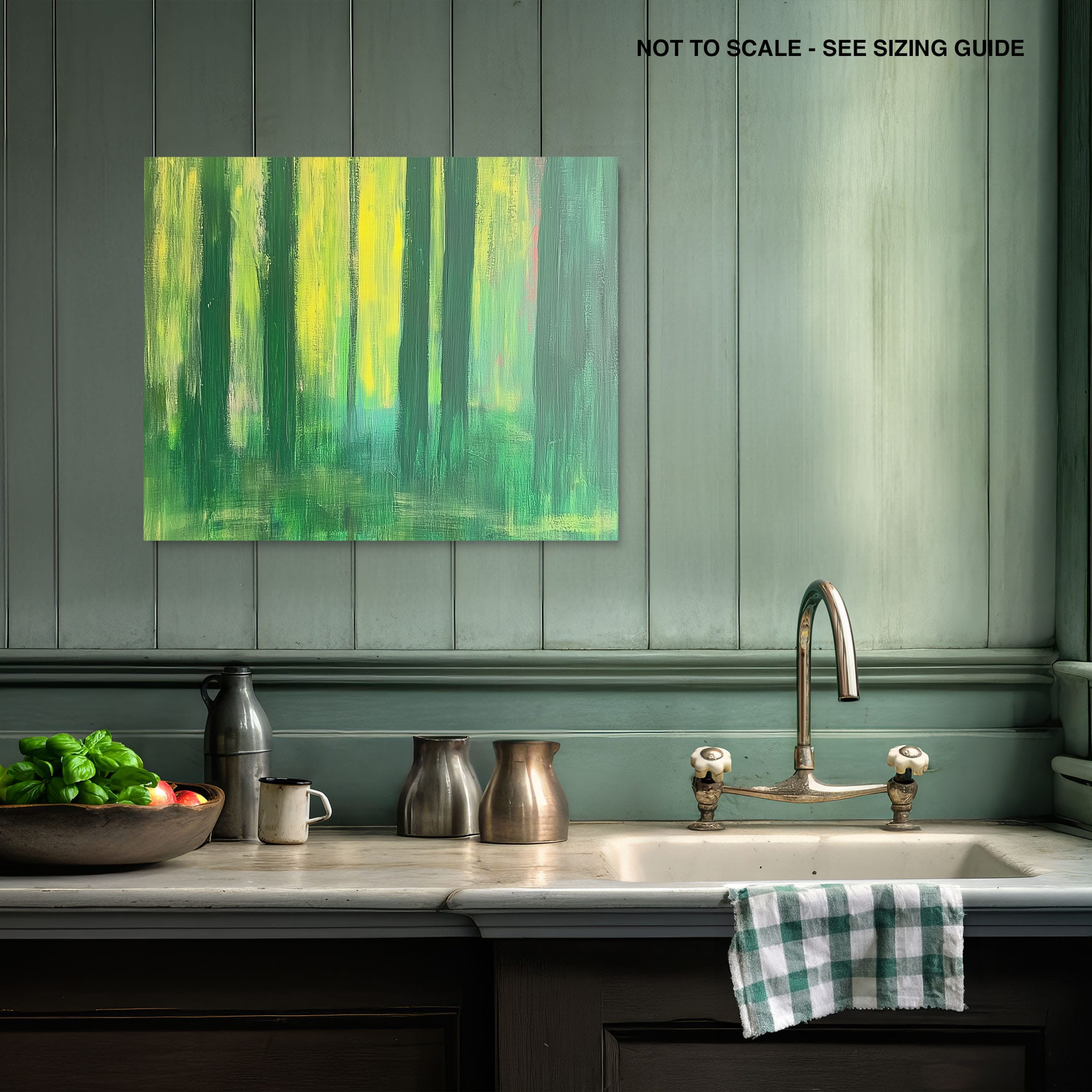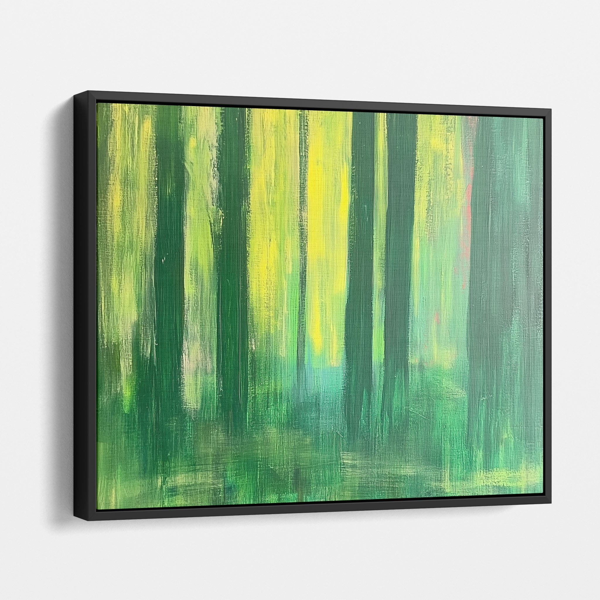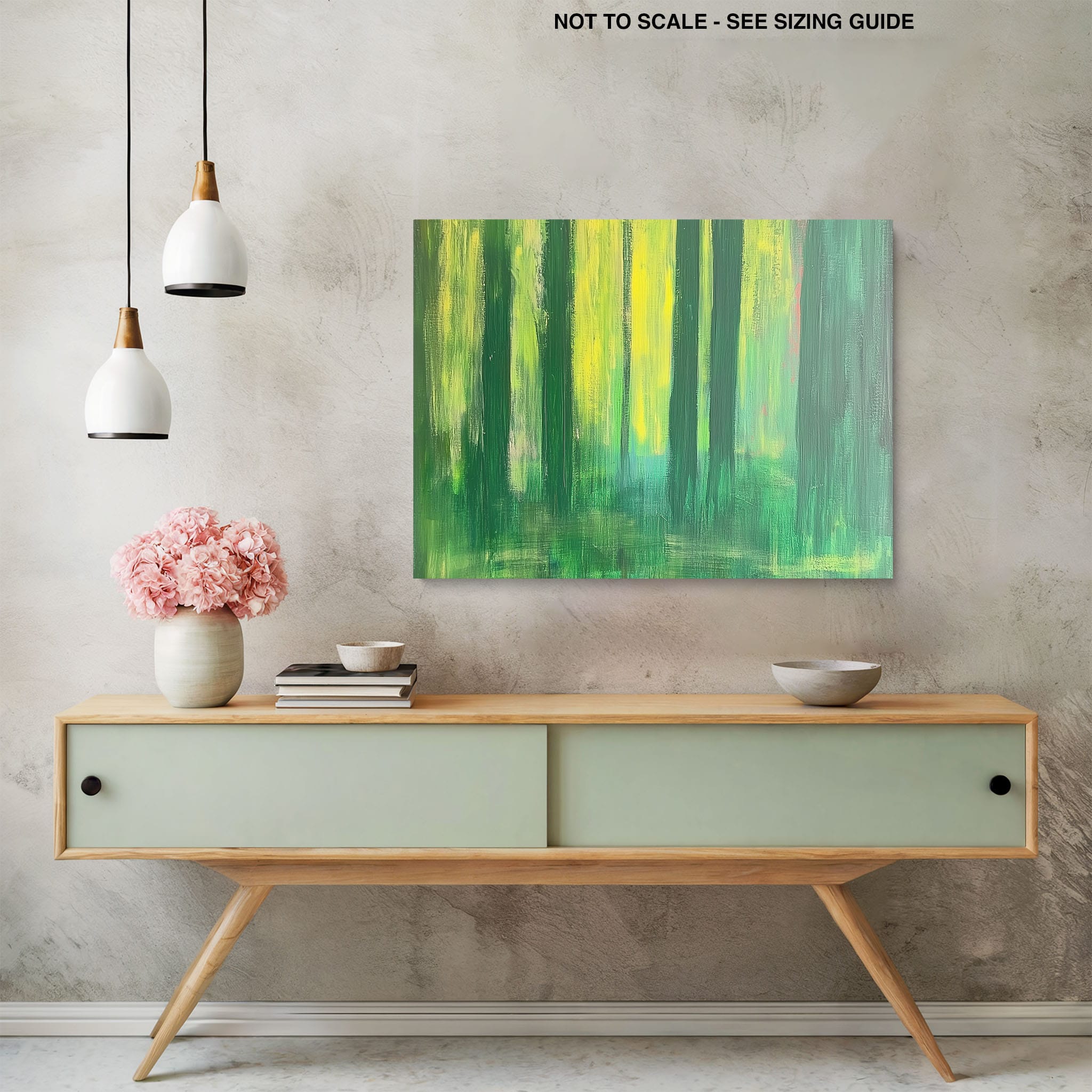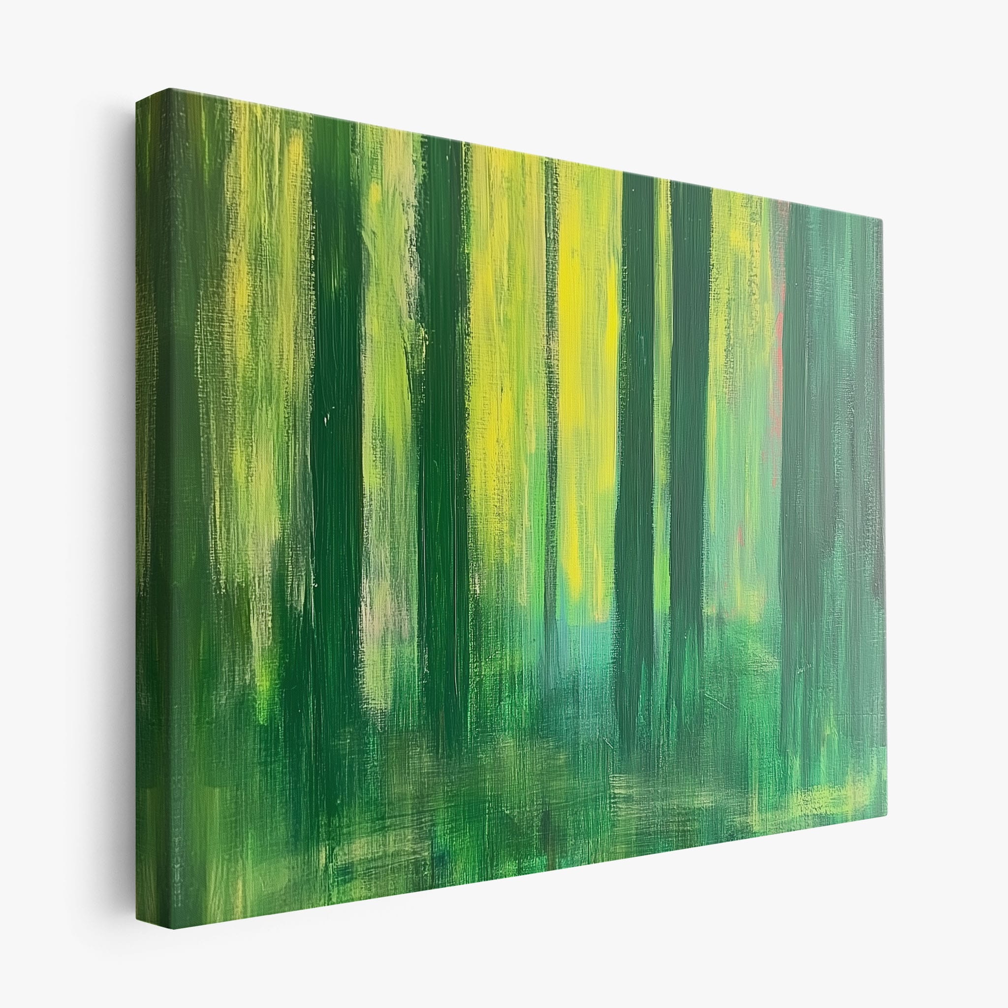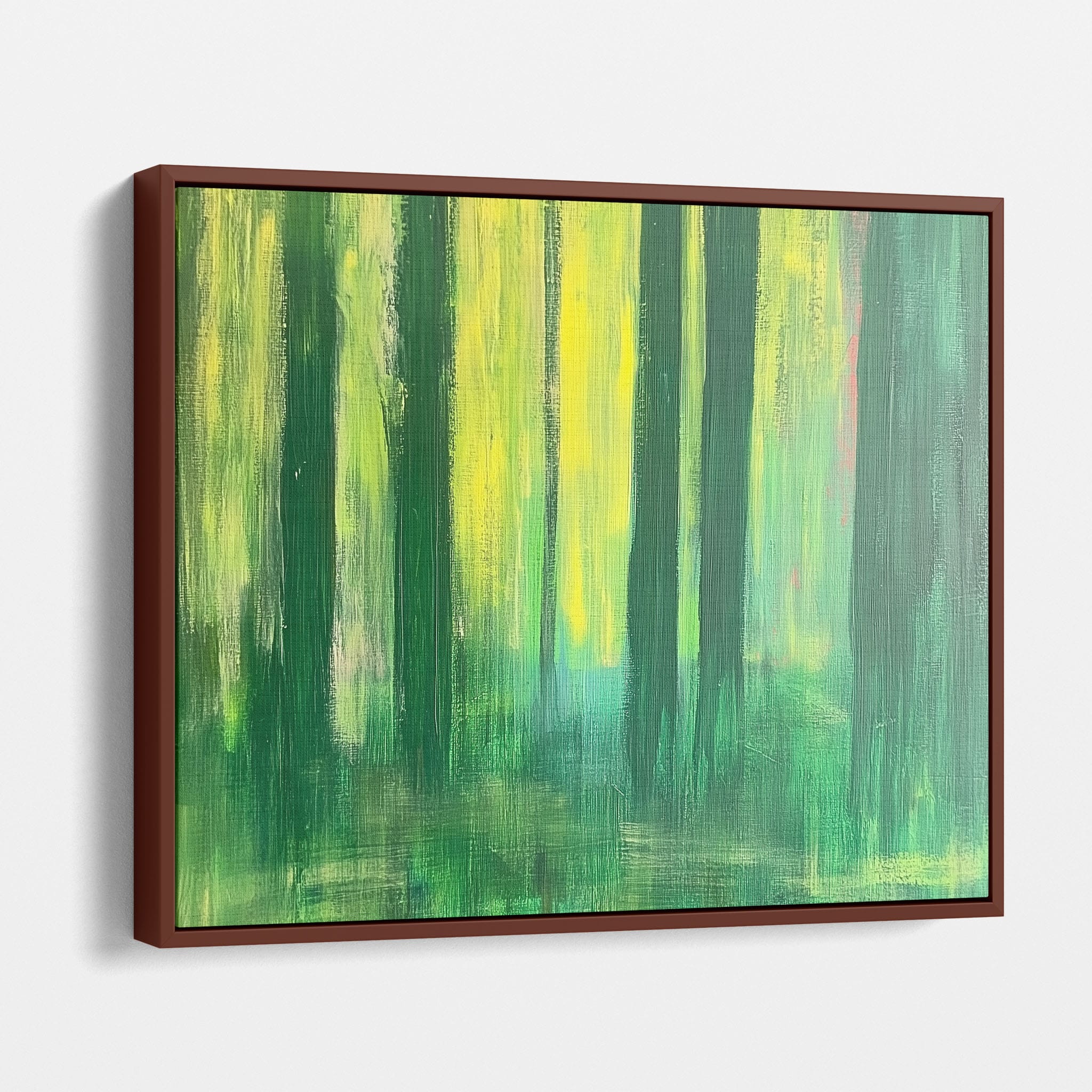 This painting captures the serene essence of a forest through bold strokes and vibrant shades of green. The abstract depiction uses impressionistic influences to evoke the varying light and shadows found within woodland realms. Its modern take on a natural landscape makes it ideal for any space that seeks a touch of tranquility paired with contemporary artistic flair. Add this piece to your décor to bring a fresh, lively energy to any room. Perfect for art lovers seeking a blend of environmental beauty and abstract artistry in their home or office.